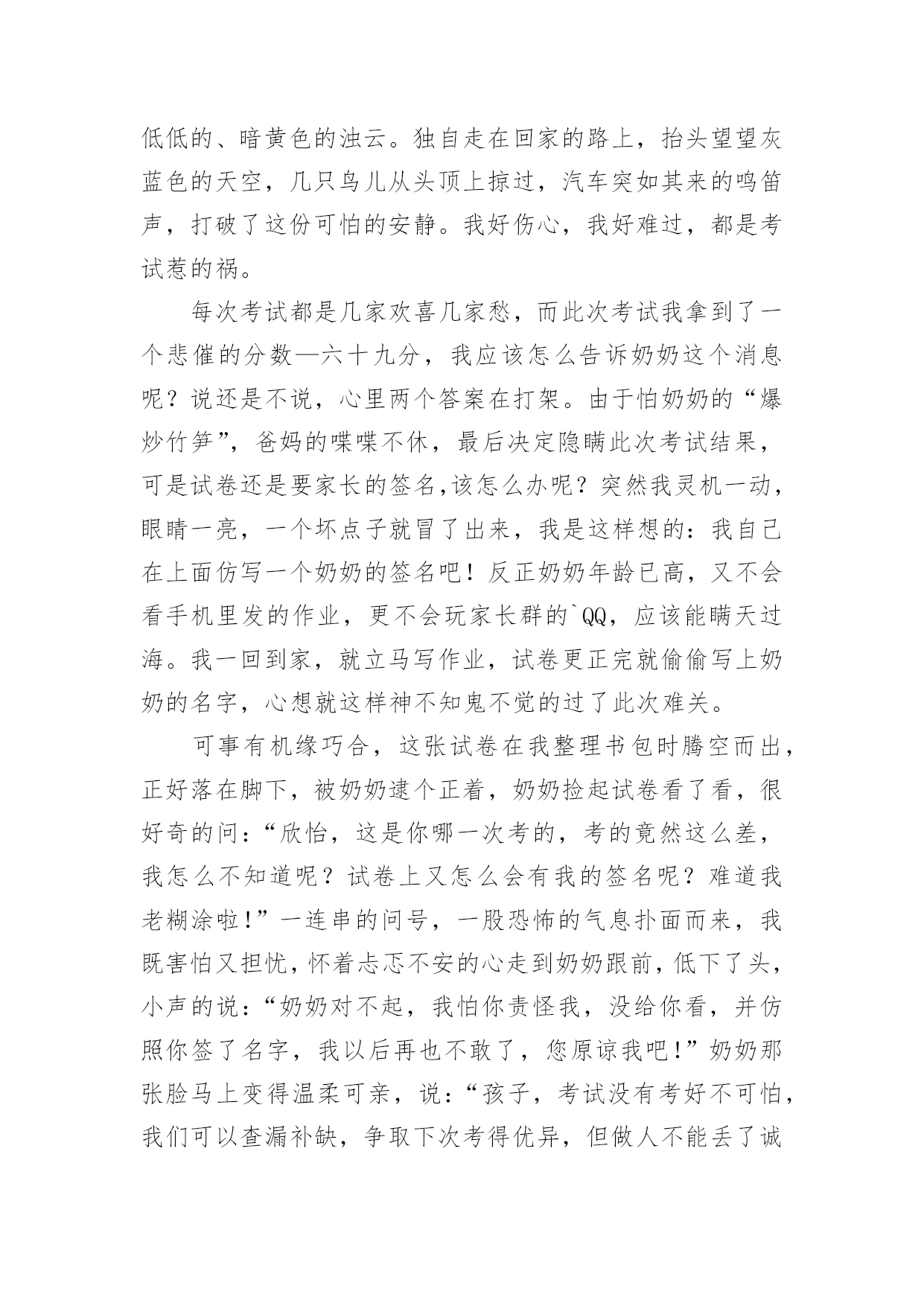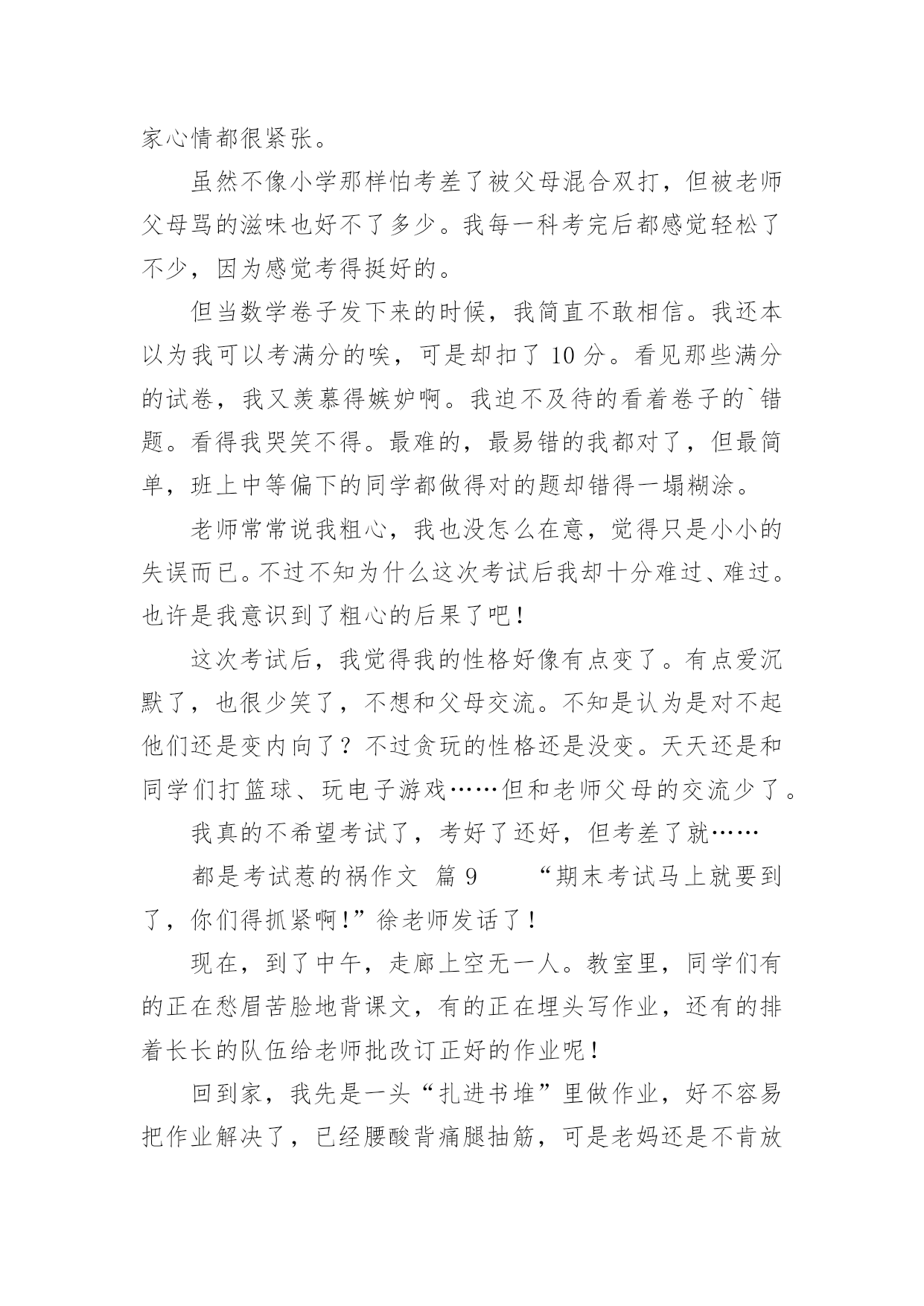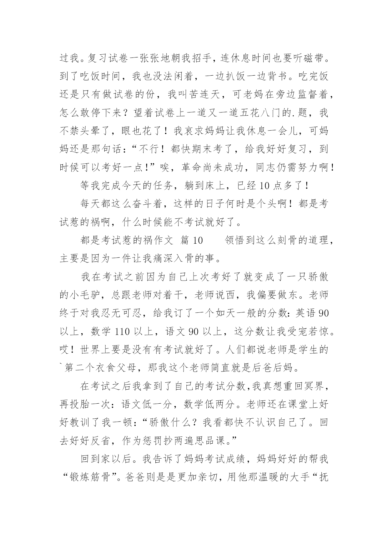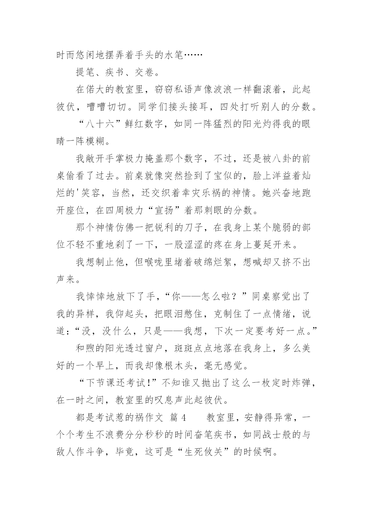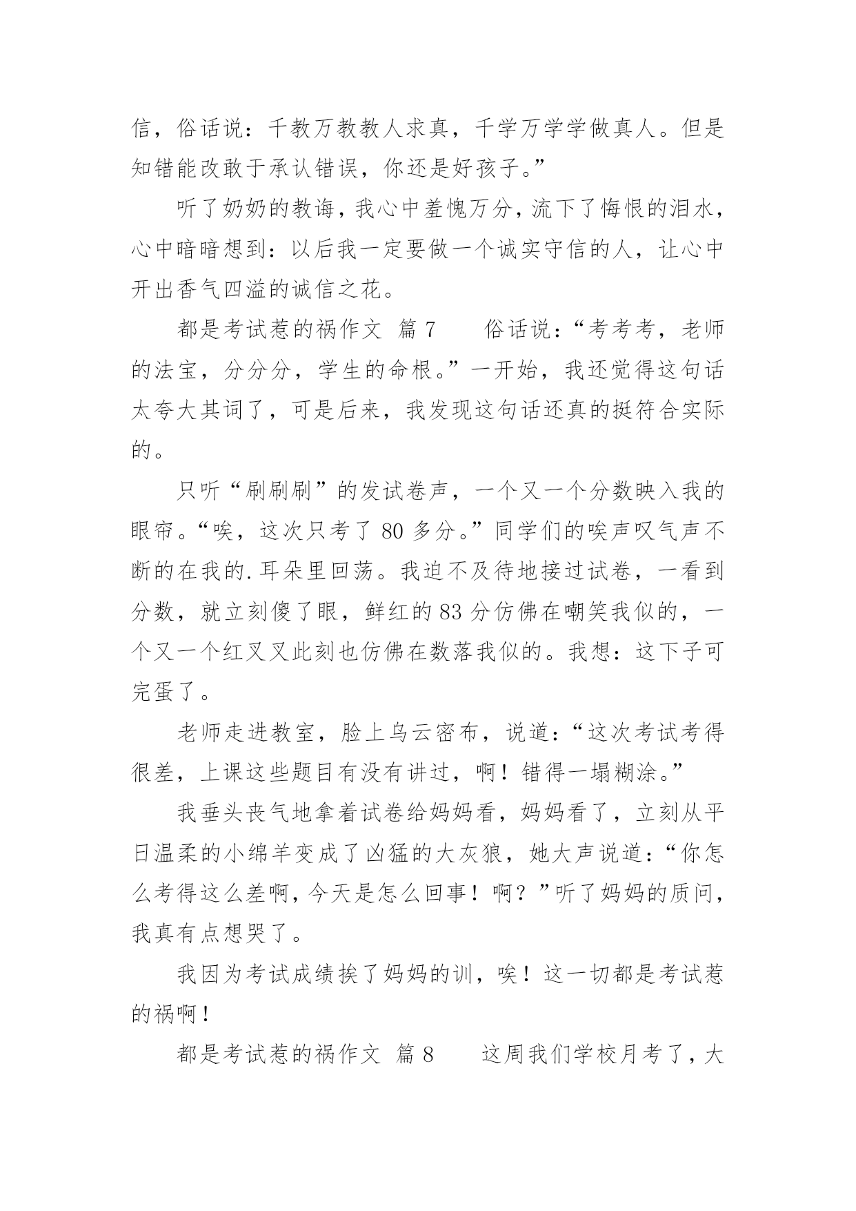 都是考试惹的祸作文都是考试惹的祸作文(通用15篇)在日常学习、工作抑或是生活中,大家或多或少都会接触过作文吧,作文是经过人的思想考虑和语言组织,通过文字来表达一个主题意义的记叙方法。怎么写作文才能避免踩雷呢?下面是小编为大家收集的都是考试惹的祸作文,欢迎大家分享。都是考试惹的祸作文篇1“考考考,老师的法宝;分分分,学生的命根。”这句话不知道是哪位人士说的,但在我看来,它却有一定的道理,因为前几天我就有了这样的遭遇。前几天数学测试结束后,我感觉不太好,所以直到第二天也是提心吊胆,早上就该报分数了,可听广播里说,今天广播操过后,三、四年级要去看电影。我松了一口气,心想早上应该不报成绩吧。可是,一回到教室,我就听见数学老师对语文老师说:“让我来报一下分数吧。”语文老师想都没想就答应了。我心想,完了,要报考试分数了。还没等我继续往下想,就看见数学老师捧着一堆试卷走上讲台,说:“这次考试你们考得很差,最高分才92分。”开始报分数了,我的心怦怦直跳。突然,数学老师报到我的成绩,我心里一惊:呀!不好,才考了80分。怎么办?数学老师还说回家试卷一定要签字。我的内心万分难过,时回家还要装出一副无忧无虑的`样子。回到家后,我坦白地告诉妈妈:“妈妈,我……我考得不好,才考了80分。”妈妈听了,火冒三丈,说:“你是怎么学的?才考了这么点!”“什么,考得这么差!”坐在一旁看报纸的爷爷也吼起来。同时,他扔下了报纸,从抽屉里拿了一把木尺,往上一扬,正准备打我。我见势不妙,就心平气和地对爷爷说:“爷爷,有句话说得好,君子动口不动手,有什么话用嘴说,何必用肢体语言呢?”爷爷听了,更火了,说:“你竟敢教训我?”说完,尺子在我手上“噼里啪啦”作响。也不知过了多久,爷爷打累了。我含着泪回到房间,查看我的“伤势”如何,只见我的手上出现了一道道血痕,已经红肿起来了,唉,我可怜的手呀!第二天一大早,我便看见爷爷正在给我做早饭,早饭做好了,就端来给我吃,并充满歉意地说:“昕昕,对不起,昨天是我不该打你打得那么重。”我心里一热,对爷爷说:“爷爷,都是我不好,不争气,没有考好,给你丢脸了,你就不要自责了。”爷爷拍拍我的肩膀说:“真是个好孩子,下次努力吧。”唉!都是考试惹的祸。都是考试惹的祸作文篇2又要考试了,小零男最讨厌的就是考试了!天知道这次考题有多难!“小零男,0分!”老师用三千分倍的声音叫道,弄得整座教学楼抖了三下。小零男恨不得挖个地缝钻进去。小零男无精打采地走在回家的路上。突然,他的脚踩到什么东西,拣起来一看,“呀!考试帽!这回可好了,考试不用愁了……”公布成绩!”小零男,一……一百分!“老师的眼睛睁得大大的,简直不敢相信自己的眼睛。一百分,谁知道他怎么得到的!老师一把起小零男扔了出去。小零男在空中划了一个完美的抛物线,只见一股黑色大漩涡,小零男被吸到了三十年代的中国。”咦?骂桶吐赛了!“原来小零男堵住了下水道。趁日本兵去拿马桶吸,小零男从马桶里钻了出来。他全身发臭,身上沾满了屎尿。全体日本兵尖叫起来,严重的`被熏得上吐下泻。唉!都是考试帽惹的祸,让他全身发臭,永远待在了三十年代的中国!都是考试惹的祸作文篇3刚跨进教室,便听见消息灵通人士播报:“今天考试,千真万确!”此时,我的心情跟天气一样,一下子由晴转阴。亳无征兆地得知要考试,这使得我的心骤然紧张起来。环顾四周——有的同学手抵着脑袋,表情凝重,堪比罗丹刀下的“沉思者”;有的同学仰头盯着天花板,似乎盼望着能掉下什么答案来;有的同学皱紧眉头,时不吋还苦笑着,似乎在感叹屋漏偏逢连夜雨——怕什么来什么。考试快接近尾声,有的同学着急地盯着试卷,偶尔抬头看看钟,似乎嫌时间不够用;有的同学不顾橡皮屑洒满一桌,正奋笔疾书;只有那些一百分专业户,时而自信地翻阅试卷,时而悠闲地摆弄着手头的水笔……提笔、疾书、交卷。在偌大的教室里,窃窃私语声像波浪一样翻滚着,此起彼伏,嘈嘈切切。同学们接头接耳,四处打听别人的分数。“八十六”鲜红数字,如同一阵猛烈的阳光灼得我的眼睛一阵模糊。我敞开手掌极力掩盖那个数字,不过,还是被八卦的前桌偷看了过去。前桌就像突然捡到了宝似的,脸上洋益着灿烂的'笑容,当然,还交织着幸灾乐祸的神情。她兴奋地跑开座位,在四周极力“宣扬”着那刺眼的分数。那个神情仿佛一把锐利的刀子,在我身上某个脆弱的部位不轻不重地剎了一下,一股涩涩的疼在身上蔓延开来。我想制止他,但喉咙里堵着破绵烂絮,想喊却又挤不出声来。我悻悻地放下了手,“你——怎么啦?”同桌察觉出了我的异样,我仰起头,把眼泪憋住,克制住了一点情绪,说道:“没,没什么,只是——我想,下次一定要考好一点。”和煦的阳光透过窗户,斑斑点点地落在我身上,多么美好的一个早上,而我却像根木头,毫无感觉。“下节课还考试!”不知谁又抛出了这么一枚定时炸弹,在一时之间,教室里的叹息声此起彼伏。