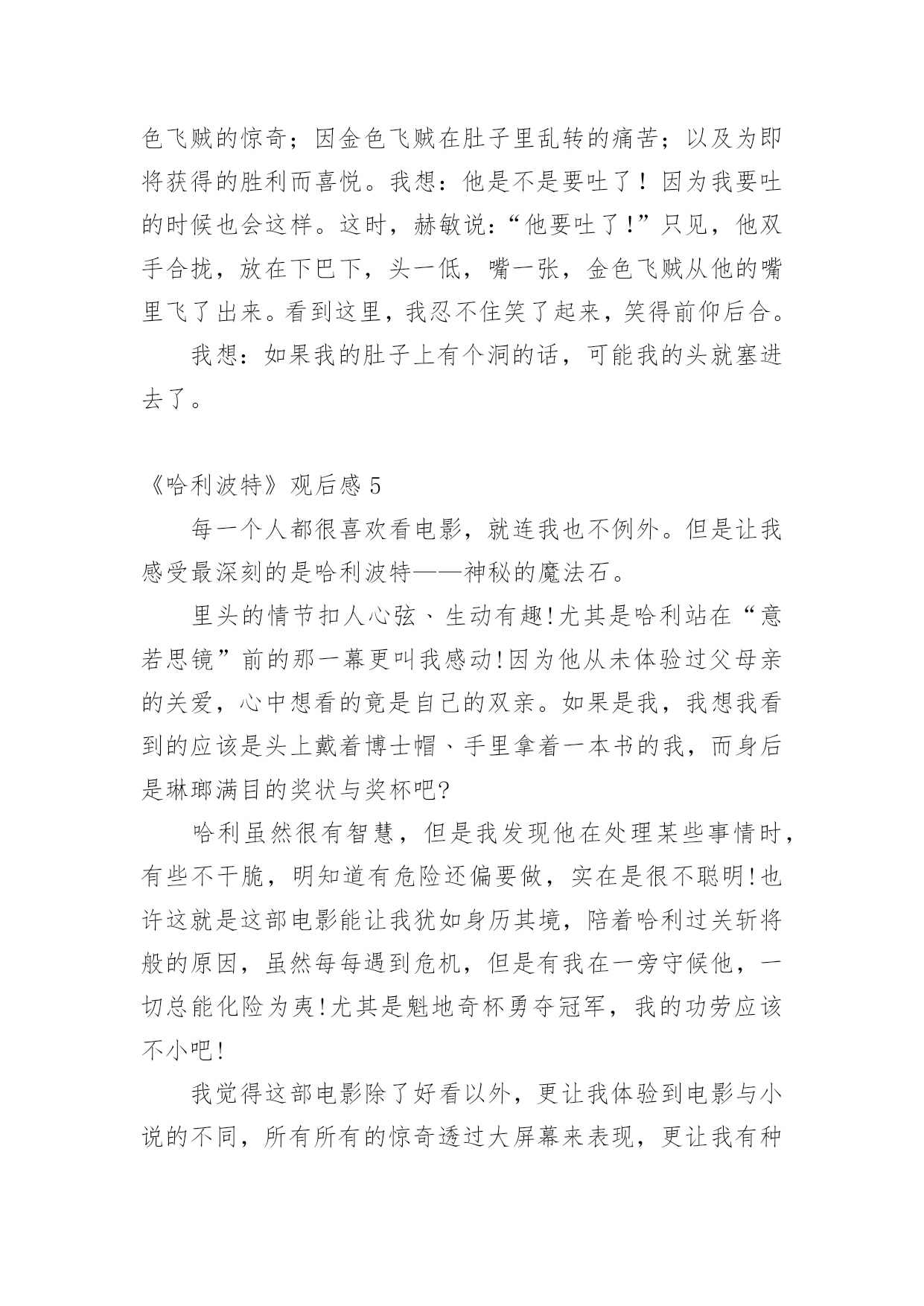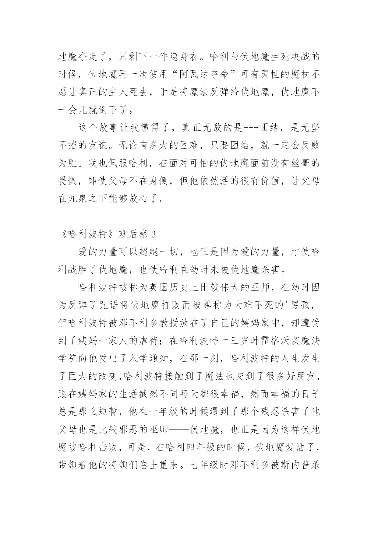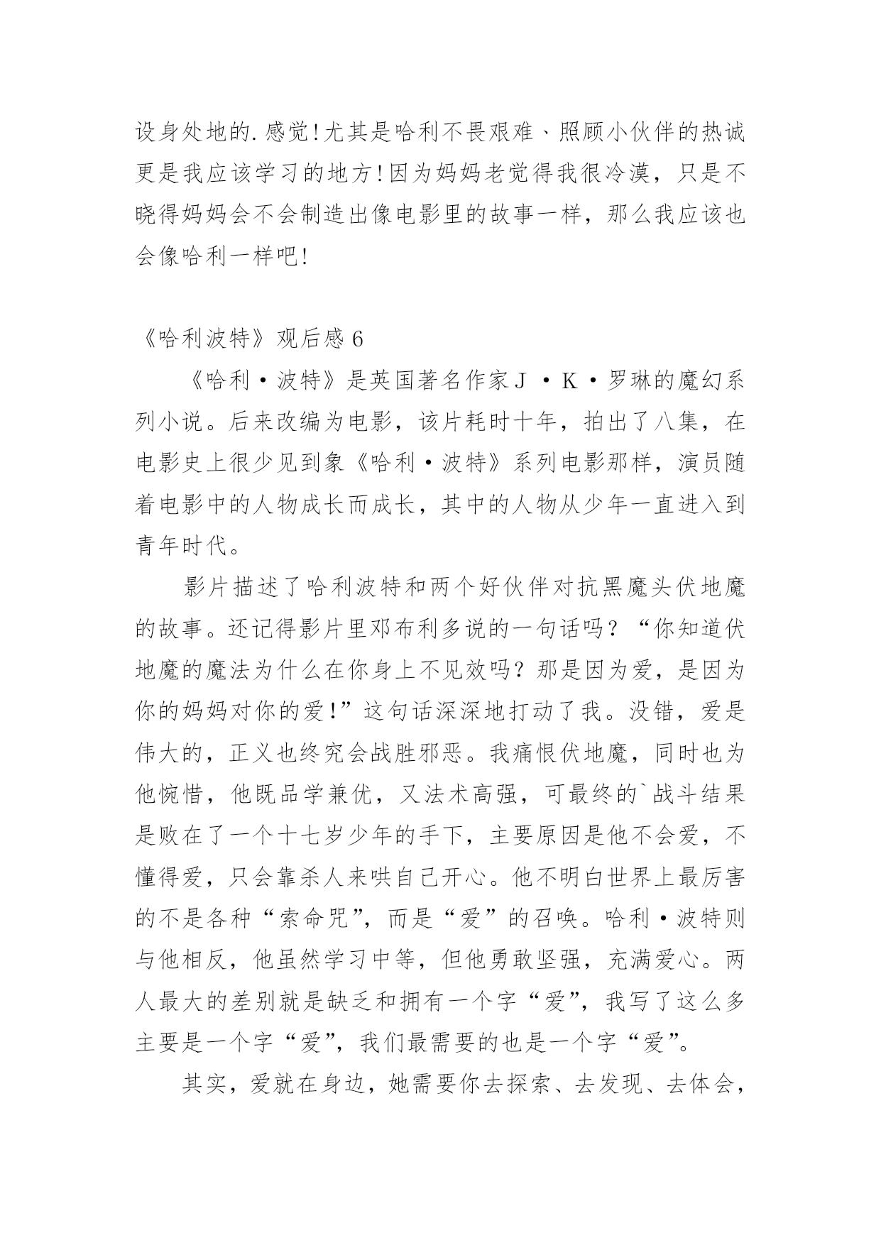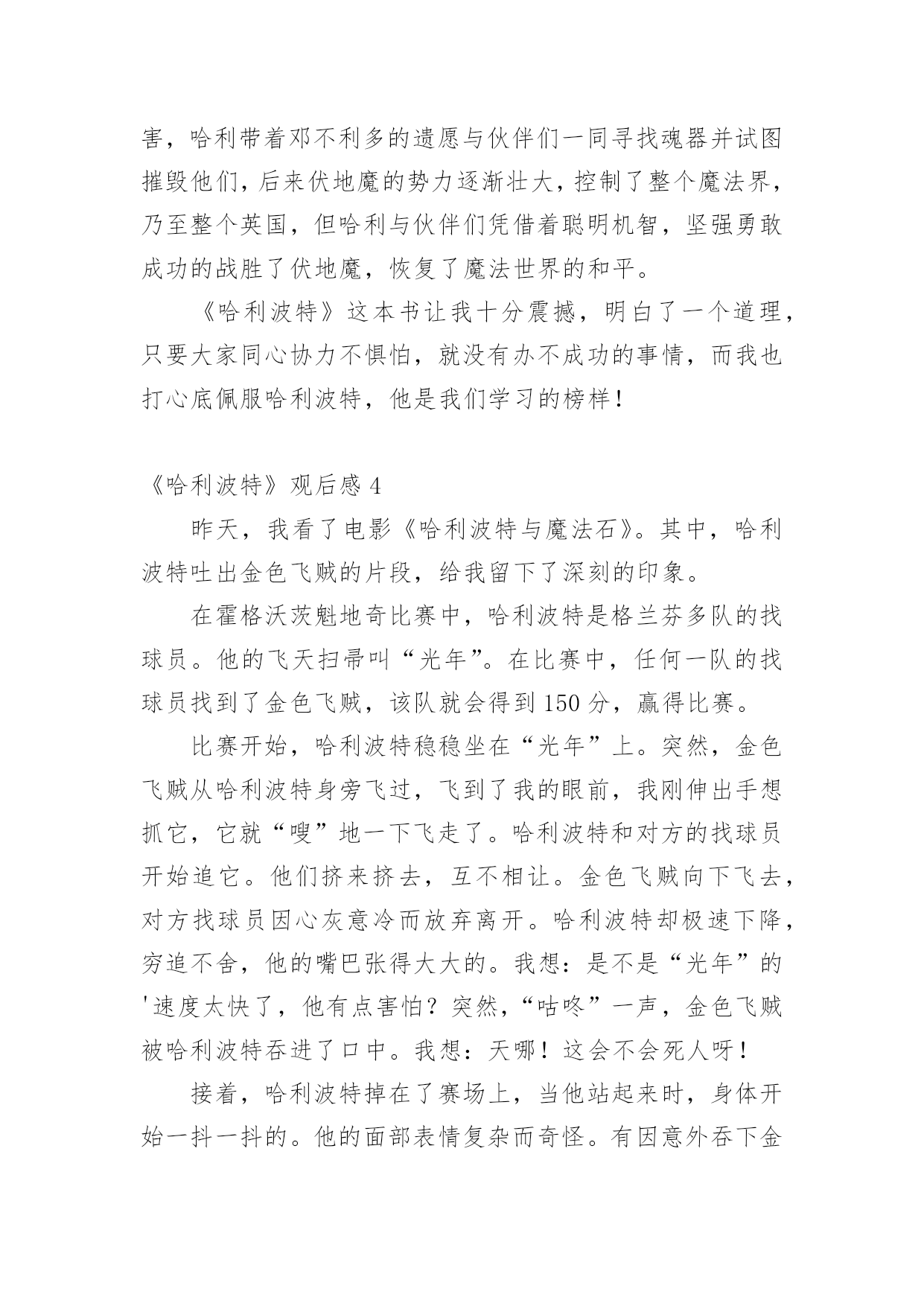 《哈利波特》观后感当观看完一部作品后,相信大家的视野一定开拓了不少吧,不妨坐下来好好写写观后感吧。那要怎么写好观后感呢?下面是小编收集整理的《哈利波特》观后感,仅供参考,希望能够帮助到大家。《哈利波特》观后感1在学校的推荐下,我观看了哈利波特系列。从此,哈利波特,一个长着乱蓬蓬的棕色头发,在鼻梁上架着一副宽边大眼镜的男孩就走进了我的生活。在哈利波特系列中,一切不可能的事物全都成了真,什么妖精呀﹑巨人啊﹑巫师啊……甚至连家养小精灵都存在,简直是妙不可言!而且,在哈利波特系列中我读懂了朋友之间真挚的友谊﹑浓厚的师生情谊,当然,还有莉莉伊万斯对哈利深深的母爱,莉莉的母爱是伟大的,它可以让强大的伏地魔瞬间失去全部力量,莉莉的母爱是充满力量的,它让小哈利坚强地,快乐地活了下来……在霍格沃茨这个神秘的地方,总会有让人惊讶的地方。送信找猫头鹰﹑国际象棋自己会走﹑画像上的人是活的',会微笑,会说话,还可以在相框里自由走动,而且有空还互相串门……哈利波特在这里不仅交到了赫敏格兰杰和罗恩韦斯莱这两个好朋友,还完成了一项项艰巨的任务:保护魔法石﹑找出密室,为海格洗刷冤情﹑发现谋害他父母的真凶﹑参加三强争霸赛﹑参与凤凰社﹑销毁魂器和找出死亡圣器……这一切的一切,都表现了哈利勇敢、正直﹑坚强﹑不向困难屈服的品质。哈利波特,给我的生活增添了无限乐趣,还给我插上了想象的翅膀,让我在幻想中成长,在幻想中自由翱翔。在这个虚拟的世界中,我学会了很多,我的生活因为哈利波特而快乐,因为书籍而精彩!《哈利波特》观后感2我最近在电影院里观看《哈利波特之死亡圣器》,《哈利波特》系列,讲了一个叫哈利波特的男孩刚刚出生,一家人就遭到伏地魔的袭击。伏地魔先杀了詹姆·波特,随后莉莉在试图保护儿子的过程中被杀害。伏地魔,这个一百年来最强大的巫师对哈利·波特施了一个咒语,那个咒语曾将许多巫师置于死地,但那个咒语却被反弹到伏地魔身上,他的身体撕裂了,他的魔力消失了,生命奄奄一息,随后狼狈不堪地逃走了。在阿不思邓布利多的帮助下,哈利在霍格沃斯学习了6年,在罗恩和郝敏的`帮助下,终于成为一名出色的巫师。可是邓布利多是伏地魔唯一害怕的巫师,只要邓布利多一死,伏地魔就会胡乱非为。就在邓布利多快与世长辞时,他将无敌的老魔杖赐给哈利。可是必须摧毁伏地魔的7件灵魂碎片,才能将伏地魔置于死地。但死亡圣器里的复活石已经被摧毁,老魔杖也被伏地魔夺走了,只剩下一件隐身衣。哈利与伏地魔生死决战的时候,伏地魔再一次使用“阿瓦达夺命”可有灵性的魔杖不愿让真正的主人死去,于是将魔法反弹给伏地魔,伏地魔不一会儿就倒下了。这个故事让我懂得了,真正无敌的是---团结,是无坚不摧的友谊。无论有多大的困难,只要团结,就一定会反败为胜。我也佩服哈利,在面对可怕的伏地魔面前没有丝毫的畏惧,即使父母不在身侧,但他依然活的很有价值,让父母在九泉之下能够放心了。《哈利波特》观后感3爱的力量可以超越一切,也正是因为爱的力量,才使哈利战胜了伏地魔,也使哈利在幼时未被伏地魔杀害。哈利波特被称为英国历史上比较伟大的巫师,在幼时因为反弹了咒语将伏地魔打败而被尊称为大难不死的'男孩,但哈利波特被邓不利多教授放在了自己的姨妈家中,却遭受到了姨妈一家人的虐待;在哈利波特十三岁时霍格沃茨魔法学院向他发出了入学通知,在那一刻,哈利波特的人生发生了巨大的改变,哈利波特接触到了魔法也交到了很多好朋友,跟在姨妈家的生活截然不同每天都很幸福,然而幸福的日子总是那么短暂,他在一年级的时候遇到了那个残忍杀害了他父母也是比较邪恶的巫师——伏地魔,也正是因为这样伏地魔被哈利击败,可是,在哈利四年级的时候,伏地魔复活了,带领着他的将领们卷土重来。七年级时邓不利多被斯内普杀害,哈利带着邓不利多的遗愿与伙伴们一同寻找魂器并试图摧毁他们,后来伏地魔的势力逐渐壮大,控制了整个魔法界,乃至整个英国,但哈利与伙伴们凭借着聪明机智,坚强勇敢成功的战胜了伏地魔,恢复了魔法世界的和平。《哈利波特》这本书让我十分震撼,明白了一个道理,只要大家同心协力不惧怕,就没有办不成功的事情,而我也打心底佩服哈利波特,他是我们学习的榜样!《哈利波特》观后感4昨天,我看了电影《哈利波特与魔法石》。其中,哈利波特吐出金色飞贼的片段,给我留下了深刻的印象。在霍格沃茨魁地奇比赛中,哈利波特是格兰芬多队的找球员。他的飞天扫帚叫“光年”。在比赛中,任何一队的找球员找到了金色飞贼,该队就会得到150分,赢得比赛。比赛开始,哈利波特稳稳坐在“光年”上。突然,金色飞贼从哈利波特身旁飞过,飞到了我的眼前,我刚伸出手想抓它,它就“嗖”地一下飞走了。哈利波特和对方的找球员开始追它。他们挤来挤去,互不相让。金色飞贼向下飞去,对方找球员因心灰意冷而放弃离开。哈利波特却极速下降,穷追不舍,他的嘴巴张得大大的。我想:是不是“光年”的