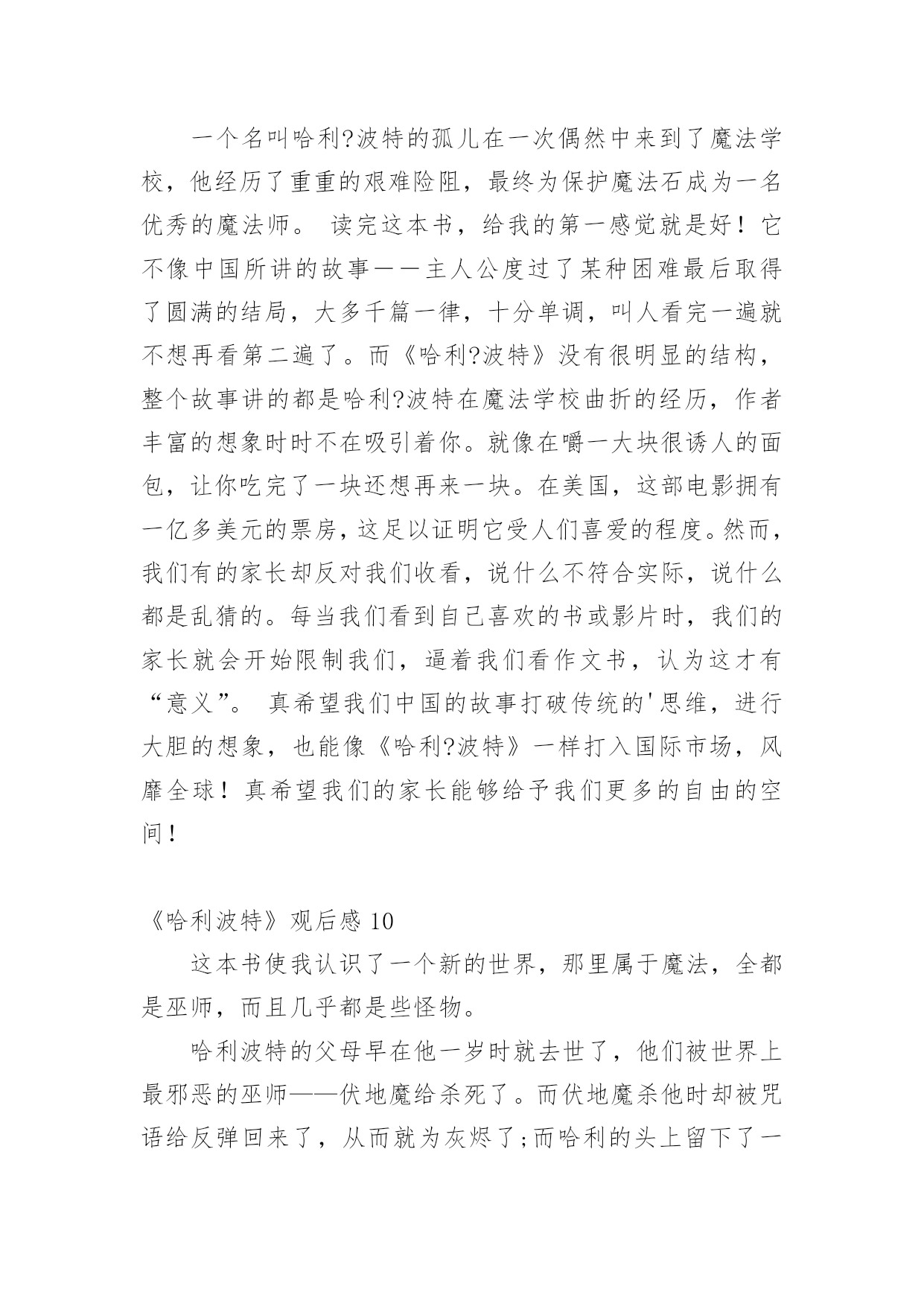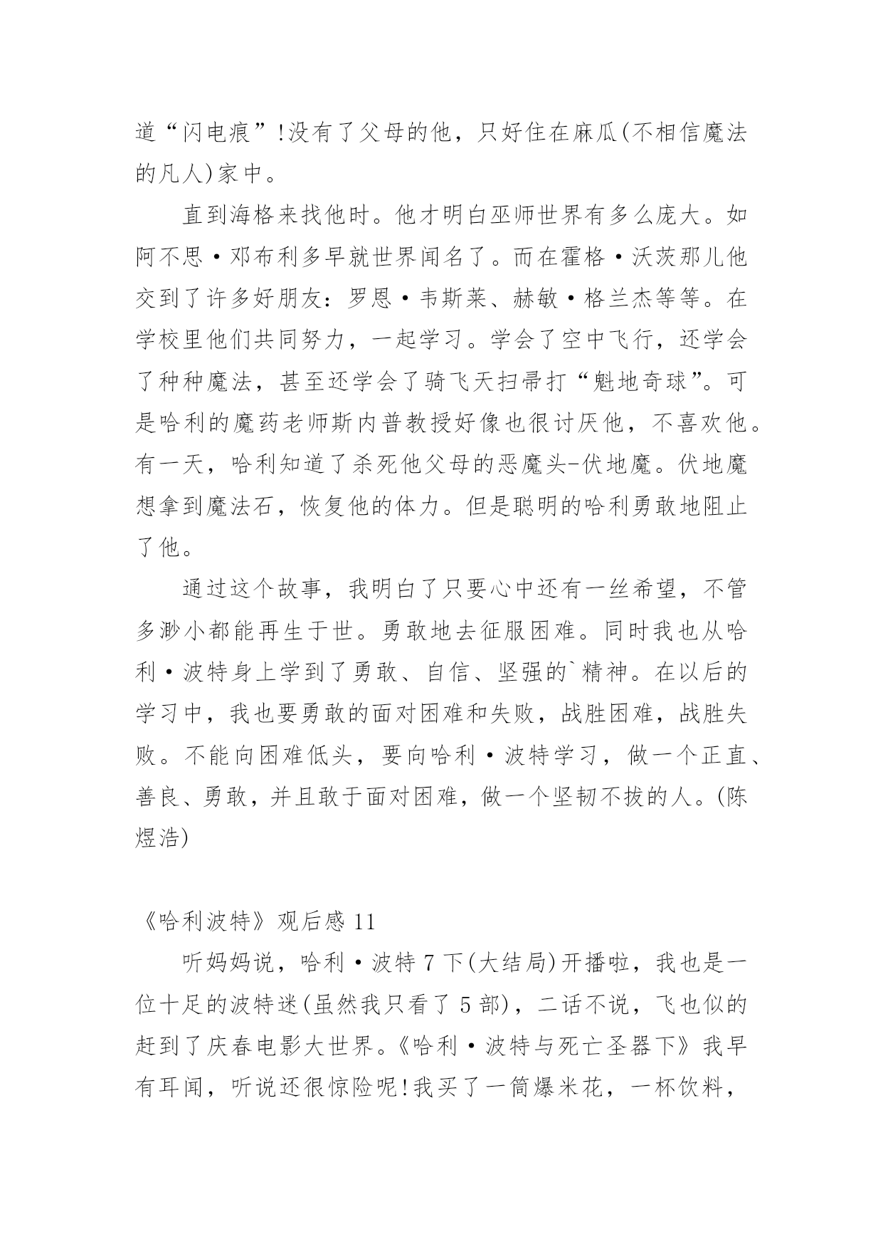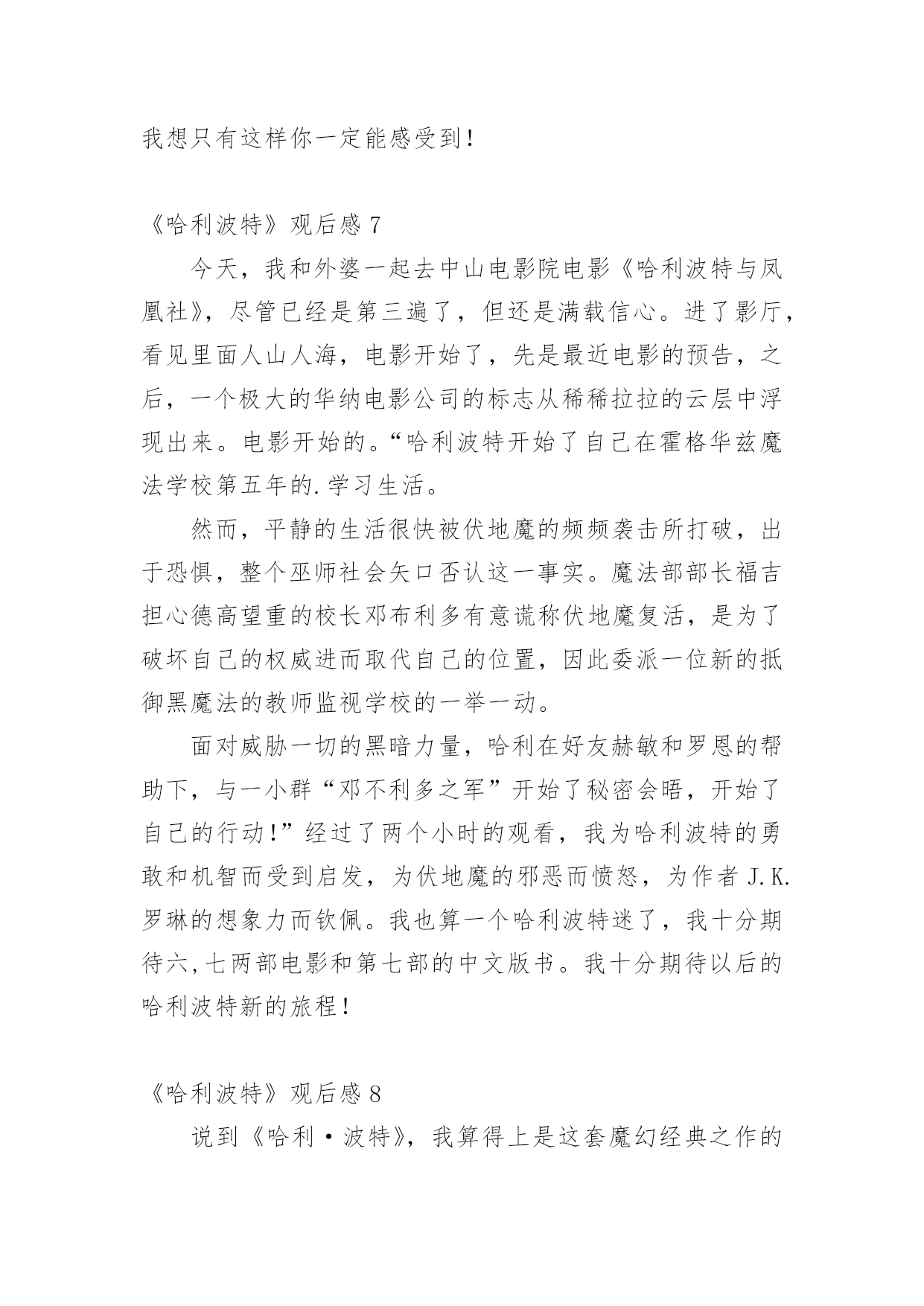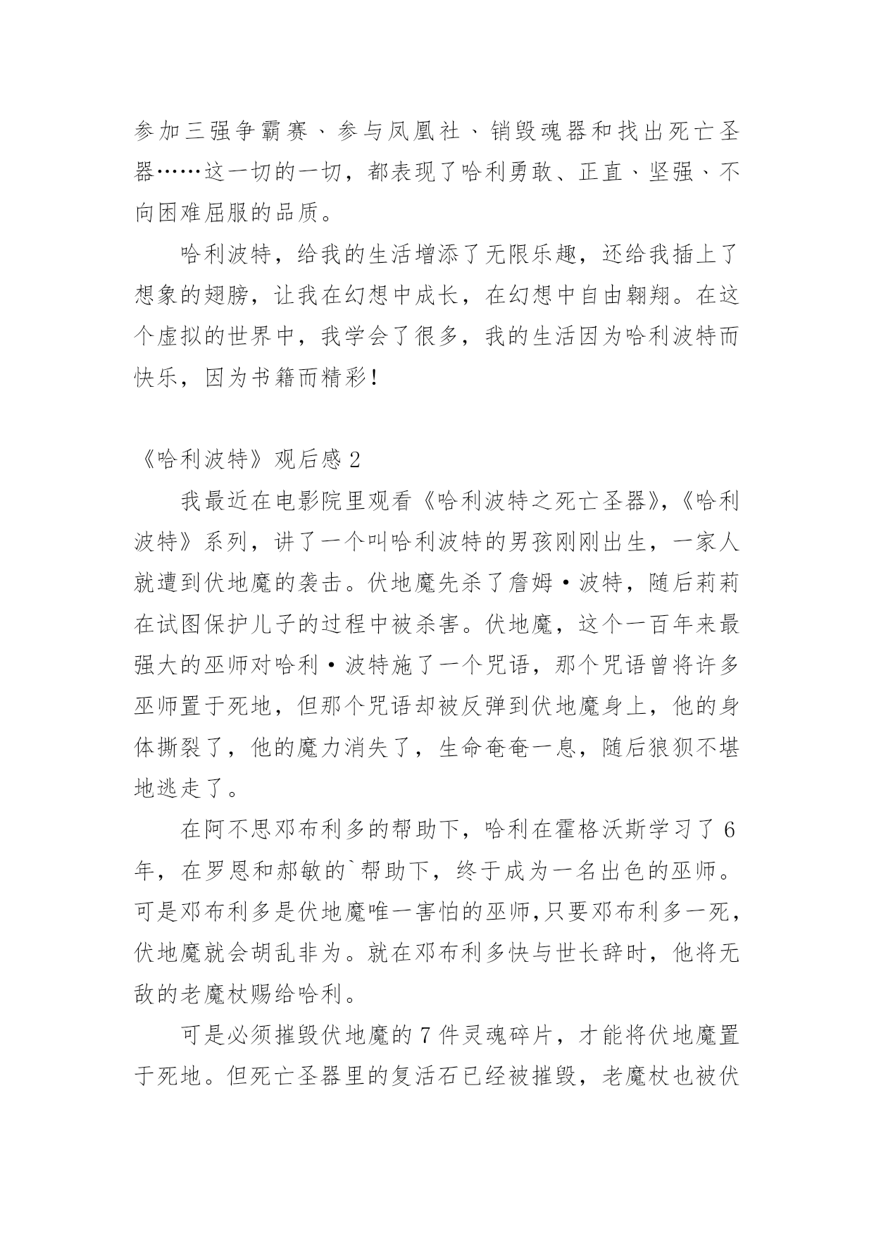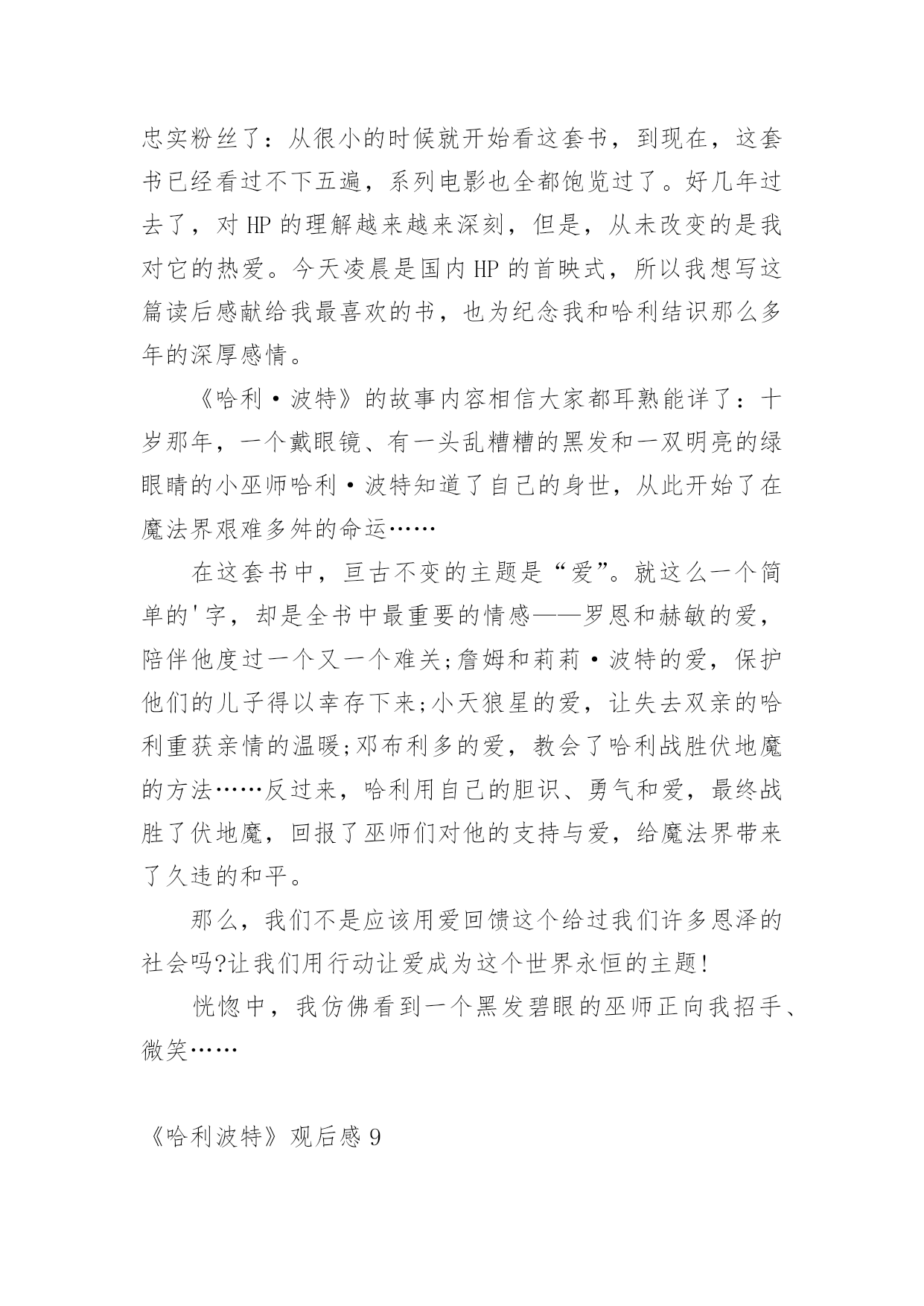 《哈利波特》观后感当观看完一部作品后,相信大家的视野一定开拓了不少吧,不妨坐下来好好写写观后感吧。那要怎么写好观后感呢?下面是小编收集整理的《哈利波特》观后感,仅供参考,希望能够帮助到大家。《哈利波特》观后感1在学校的推荐下,我观看了哈利波特系列。从此,哈利波特,一个长着乱蓬蓬的棕色头发,在鼻梁上架着一副宽边大眼镜的男孩就走进了我的生活。在哈利波特系列中,一切不可能的事物全都成了真,什么妖精呀﹑巨人啊﹑巫师啊……甚至连家养小精灵都存在,简直是妙不可言!而且,在哈利波特系列中我读懂了朋友之间真挚的友谊﹑浓厚的师生情谊,当然,还有莉莉伊万斯对哈利深深的母爱,莉莉的母爱是伟大的,它可以让强大的伏地魔瞬间失去全部力量,莉莉的母爱是充满力量的,它让小哈利坚强地,快乐地活了下来……在霍格沃茨这个神秘的地方,总会有让人惊讶的地方。送信找猫头鹰﹑国际象棋自己会走﹑画像上的人是活的',会微笑,会说话,还可以在相框里自由走动,而且有空还互相串门……哈利波特在这里不仅交到了赫敏格兰杰和罗恩韦斯莱这两个好朋友,还完成了一项项艰巨的任务:保护魔法石﹑找出密室,为海格洗刷冤情﹑发现谋害他父母的真凶﹑参加三强争霸赛﹑参与凤凰社﹑销毁魂器和找出死亡圣器……这一切的一切,都表现了哈利勇敢、正直﹑坚强﹑不向困难屈服的品质。哈利波特,给我的生活增添了无限乐趣,还给我插上了想象的翅膀,让我在幻想中成长,在幻想中自由翱翔。在这个虚拟的世界中,我学会了很多,我的生活因为哈利波特而快乐,因为书籍而精彩!《哈利波特》观后感2我最近在电影院里观看《哈利波特之死亡圣器》,《哈利波特》系列,讲了一个叫哈利波特的男孩刚刚出生,一家人就遭到伏地魔的袭击。伏地魔先杀了詹姆·波特,随后莉莉在试图保护儿子的过程中被杀害。伏地魔,这个一百年来最强大的巫师对哈利·波特施了一个咒语,那个咒语曾将许多巫师置于死地,但那个咒语却被反弹到伏地魔身上,他的身体撕裂了,他的魔力消失了,生命奄奄一息,随后狼狈不堪地逃走了。在阿不思邓布利多的帮助下,哈利在霍格沃斯学习了6年,在罗恩和郝敏的`帮助下,终于成为一名出色的巫师。可是邓布利多是伏地魔唯一害怕的巫师,只要邓布利多一死,伏地魔就会胡乱非为。就在邓布利多快与世长辞时,他将无敌的老魔杖赐给哈利。可是必须摧毁伏地魔的7件灵魂碎片,才能将伏地魔置于死地。但死亡圣器里的复活石已经被摧毁,老魔杖也被伏地魔夺走了,只剩下一件隐身衣。哈利与伏地魔生死决战的时候,伏地魔再一次使用“阿瓦达夺命”可有灵性的魔杖不愿让真正的主人死去,于是将魔法反弹给伏地魔,伏地魔不一会儿就倒下了。这个故事让我懂得了,真正无敌的是---团结,是无坚不摧的友谊。无论有多大的困难,只要团结,就一定会反败为胜。我也佩服哈利,在面对可怕的伏地魔面前没有丝毫的畏惧,即使父母不在身侧,但他依然活的很有价值,让父母在九泉之下能够放心了。《哈利波特》观后感3爱的力量可以超越一切,也正是因为爱的力量,才使哈利战胜了伏地魔,也使哈利在幼时未被伏地魔杀害。哈利波特被称为英国历史上比较伟大的巫师,在幼时因为反弹了咒语将伏地魔打败而被尊称为大难不死的'男孩,但哈利波特被邓不利多教授放在了自己的姨妈家中,却遭受到了姨妈一家人的虐待;在哈利波特十三岁时霍格沃茨魔法学院向他发出了入学通知,在那一刻,哈利波特的人生发生了巨大的改变,哈利波特接触到了魔法也交到了很多好朋友,跟在姨妈家的生活截然不同每天都很幸福,然而幸福的日子总是那么短暂,他在一年级的时候遇到了那个残忍杀害了他父母也是比较邪恶的巫师——伏地魔,也正是因为这样伏地魔被哈利击败,可是,在哈利四年级的时候,伏地魔复活了,带领着他的将领们卷土重来。七年级时邓不利多被斯内普杀害,哈利带着邓不利多的遗愿与伙伴们一同寻找魂器并试图摧毁他们,后来伏地魔的势力逐渐壮大,控制了整个魔法界,乃至整个英国,但哈利与伙伴们凭借着聪明机智,坚强勇敢成功的战胜了伏地魔,恢复了魔法世界的和平。《哈利波特》这本书让我十分震撼,明白了一个道理,只要大家同心协力不惧怕,就没有办不成功的事情,而我也打心底佩服哈利波特,他是我们学习的榜样!《哈利波特》观后感4昨天,我看了电影《哈利波特与魔法石》。其中,哈利波特吐出金色飞贼的片段,给我留下了深刻的印象。在霍格沃茨魁地奇比赛中,哈利波特是格兰芬多队的找球员。他的飞天扫帚叫“光年”。在比赛中,任何一队的找球员找到了金色飞贼,该队就会得到150分,赢得比赛。比赛开始,哈利波特稳稳坐在“光年”上。突然,金色飞贼从哈利波特身旁飞过,飞到了我的眼前,我刚伸出手想抓它,它就“嗖”地一下飞走了。哈利波特和对方的找球员开始追它。他们挤来挤去,互不相让。金色飞贼向下飞去,对方找球员因心灰意冷而放弃离开。哈利波特却极速下降,穷追不舍,他的嘴巴张得大大的。我想:是不是“光年”的