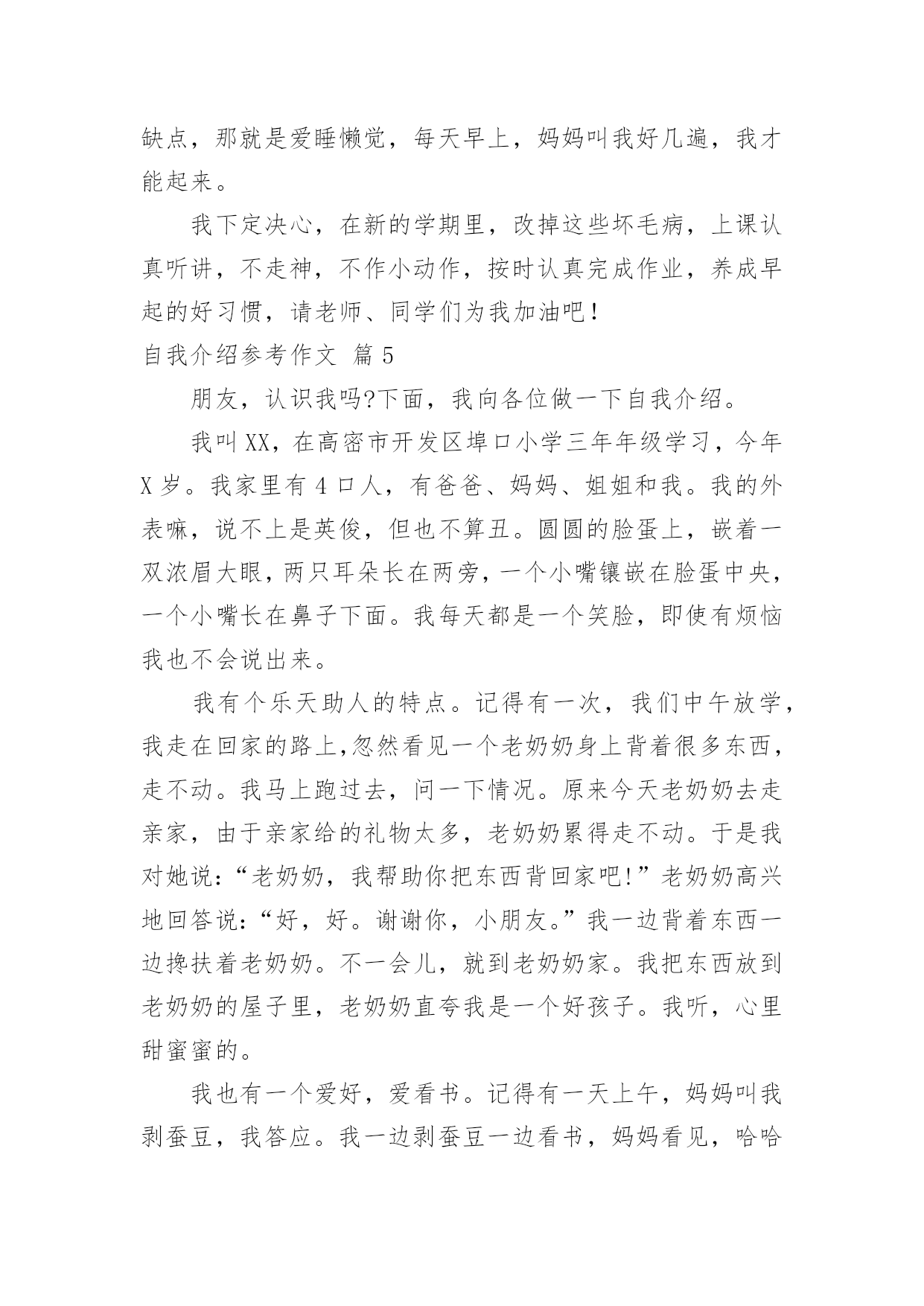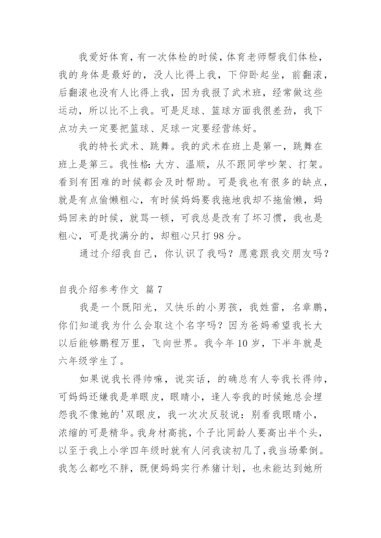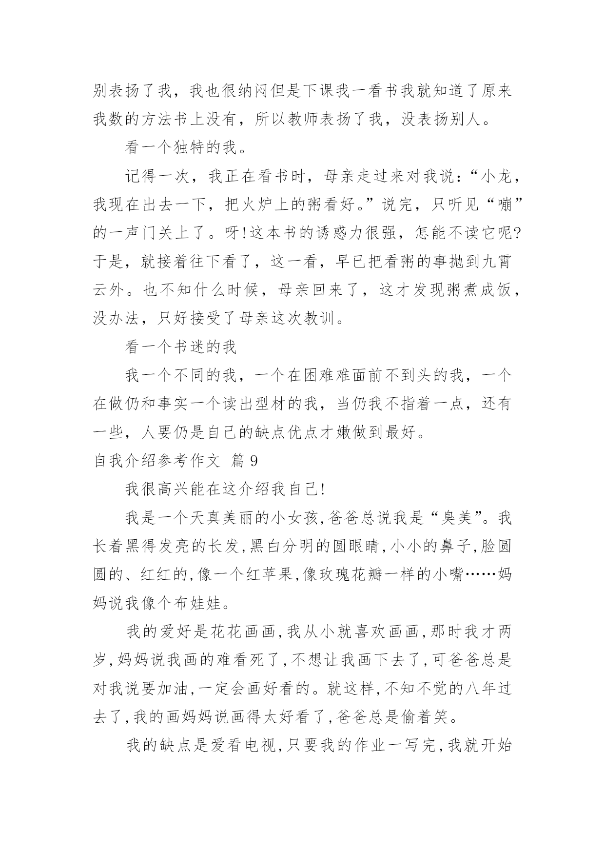 自我介绍参考作文关于自我介绍参考作文汇编九篇当到达一个陌生的环境后,通常需要我们进行自我介绍,用自我介绍往往可以来展示自己。那么自我介绍有什么格式呢?下面是小编为大家收集的自我介绍参考作文10篇,欢迎大家借鉴与参考,希望对大家有所帮助。自我介绍参考作文篇1我名叫韦乐天,出生于99年月日。我今年9岁了,身高。米,是宜州市第一小学三(X)班学生。我的爱好是看书、画画、玩玩具、玩电脑、学习网上作文等。我最主要的优点是喜欢看书,我已经啃了《三国演义》、《水浒传》、《西游记》、《封神演义》,现在正在看《鲁滨逊漂流记》。我还喜欢看有关写作的书籍,长大还想当作家呢!我喜欢看的电视节目是《少儿频道》、《动画片》、《开心辞典》、《幸运》。我喜欢养的小动物是小白兔、小鹦鹉、小金鱼、小狗和小猫。我喜欢吃各种各样的水果,其中,比较爱吃的是西瓜、雪梨、芒果、葡萄和柑子。我喜欢吃的食物是饺子、酸甜排骨、油条和豆浆。我主要的缺点是上课爱讲小话,不遵守课堂纪律;有时做作业太慢;考试时不细心检查,有很多次都是由于不细心挨扣分。不过,人有长处也有短处,我要发扬长处,克服短处,努力使自己越来越进步。作文自我介绍参考作文篇2我的名字是XX,性别男,民族汉,出生日期:20xx年3月14日,双鱼座。性格特点:阳光、健康、善良、勤劳、认真、果断,谦让,喜欢交友,有时急躁、粗心,紧张时刻有些不沉着。个人喜好:和同学打实战户外CS,阅读书籍,跑步,打羽毛球,喜欢研究枪械,对自然和生物还有化学有浓厚兴趣,画各种图画,对钢琴较有兴趣。个人厌恶:爱吹牛、打人、抄题、不懂装懂的人。在一到三年级时,兼任过数、语组长,三年级竞选成班长。每届三好学生或四好少年。现在,兼任数学组长。我希望在今后的校园生活,能够与老师、同学愉快地渡过每一天。自我介绍参考作文篇3我是一个帅气的男孩。一头乌黑光亮的头发,两条浓浓的眉毛,一双大大的眼睛炯炯有神,它们总能发现很多新奇的东西。我是一个调皮的男孩。村里李阿姨家有个可爱的小宝宝,他眉清目秀,活泼可爱,到了学说话的年龄。他整天跟着我“小多多(小哥哥)”地叫。一天,他又跟在我后面了,我脑子一转,想出了一个鬼主意。我说:“李龙是好人。”他学着说:“李龙是好人。”我又说:“李龙是坏人。”他果真也说:“李龙寺坏人。”我暗暗地笑了一下,他根本不知道我在调戏他。我还是一个爱冒险的男孩。我有一次去滑冰,可那地方人太多,太拥挤,我根本施展不开手脚。我就东瞅瞅西看看,看见一个结冰的湖,我就到那里去滑了。滑了一会儿,我来了个急刹车,把薄薄的冰捅破了,我一下子掉了下去。幸好水不深,旁边有人,我才保住小命。当我穿着湿漉漉的衣服回家时,挨了爸妈的打骂。现在想想我那时胆子可是太大了。这就我,调皮可爱的男孩。自我介绍参考作文篇4你们好!老师同学们你们认识我吗?下面就让我来介绍一下自己吧!我的名字叫叶峻林,今年12岁,上五年级了,在实验小学上学,我的头发黑黑的,长着一双水汪汪的眼睛,圆圆的脸,鼻梁上架着幅近视眼镜。我们家三口人,爸爸、妈妈和我。我是一个性格活泼、爱帮助人的人,有一次,同位的橡皮找不到了,她着急地哭起来了,我就去帮她找,我四处找都没找到,最后一看居然在她自己书包里,同位终于露出了笑容。我的另一个优点就是热爱劳动,在学校我帮老爷爷关门、关窗;在家里,我帮妈妈扫地、拖地、擦门、擦窗。我是一个聪明的孩子,喜欢读书、玩电脑,画画、练武都是我的特长。当然我也有缺点,那就是上课听讲不够认真,有一次,老师在给我们布置作业,而我却在玩,并没有听到老师布置的作业,等到回家,一想,作业不知道。还有一个缺点,那就是爱睡懒觉,每天早上,妈妈叫我好几遍,我才能起来。我下定决心,在新的学期里,改掉这些坏毛病,上课认真听讲,不走神,不作小动作,按时认真完成作业,养成早起的好习惯,请老师、同学们为我加油吧!自我介绍参考作文篇5朋友,认识我吗?下面,我向各位做一下自我介绍。我叫XX,在高密市开发区埠口小学三年年级学习,今年X岁。我家里有4口人,有爸爸、妈妈、姐姐和我。我的外表嘛,说不上是英俊,但也不算丑。圆圆的脸蛋上,嵌着一双浓眉大眼,两只耳朵长在两旁,一个小嘴镶嵌在脸蛋中央,一个小嘴长在鼻子下面。我每天都是一个笑脸,即使有烦恼我也不会说出来。我有个乐天助人的特点。记得有一次,我们中午放学,我走在回家的路上,忽然看见一个老奶奶身上背着很多东西,走不动。我马上跑过去,问一下情况。原来今天老奶奶去走亲家,由于亲家给的礼物太多,老奶奶累得走不动。于是我对她说:“老奶奶,我帮助你把东西背回家吧!”老奶奶高兴地回答说:“好,好。谢谢你,小朋友。”我一边背着东西一边搀扶着老奶奶。不一会儿,就到老奶奶家。我把东西放到老奶奶的屋子里,老奶奶直夸我是一个好孩子。我听,心里甜蜜蜜的。我也有一个爱好,爱看书。记得有一天上午,妈