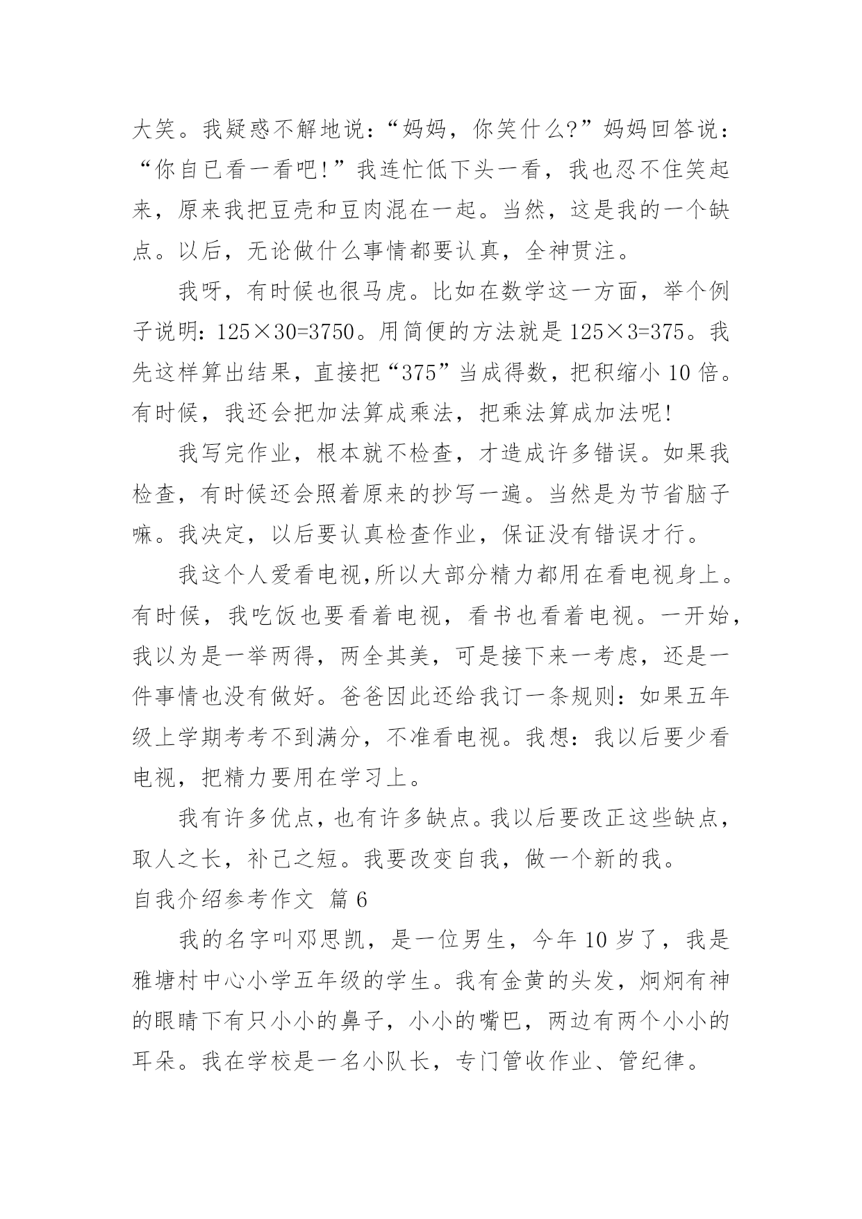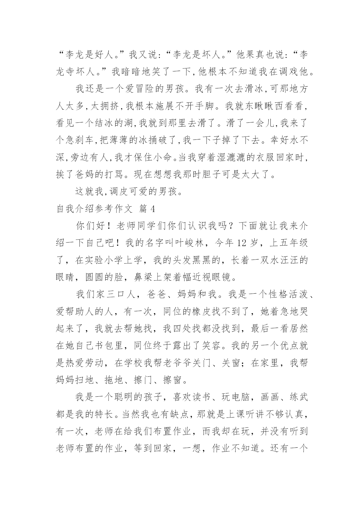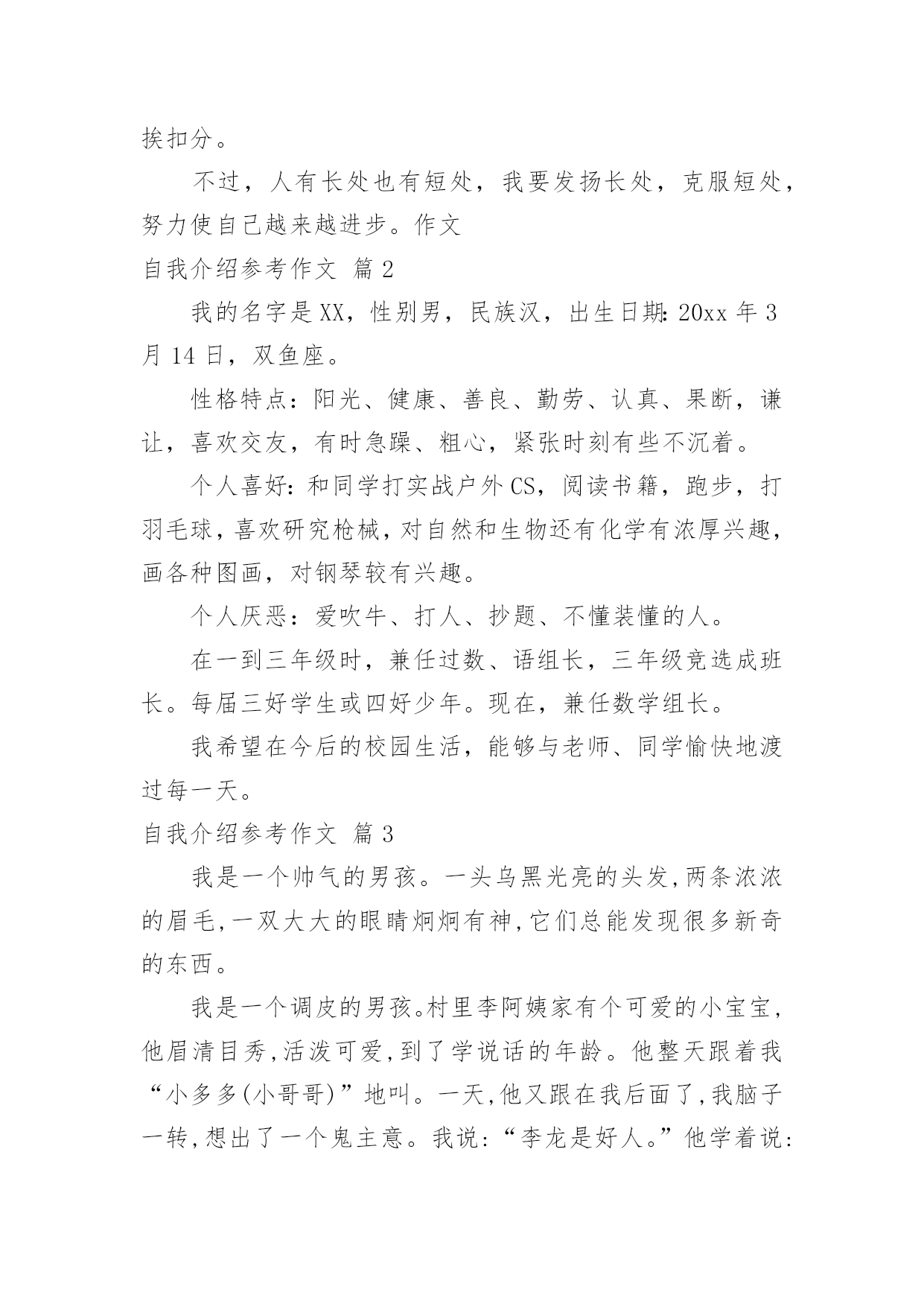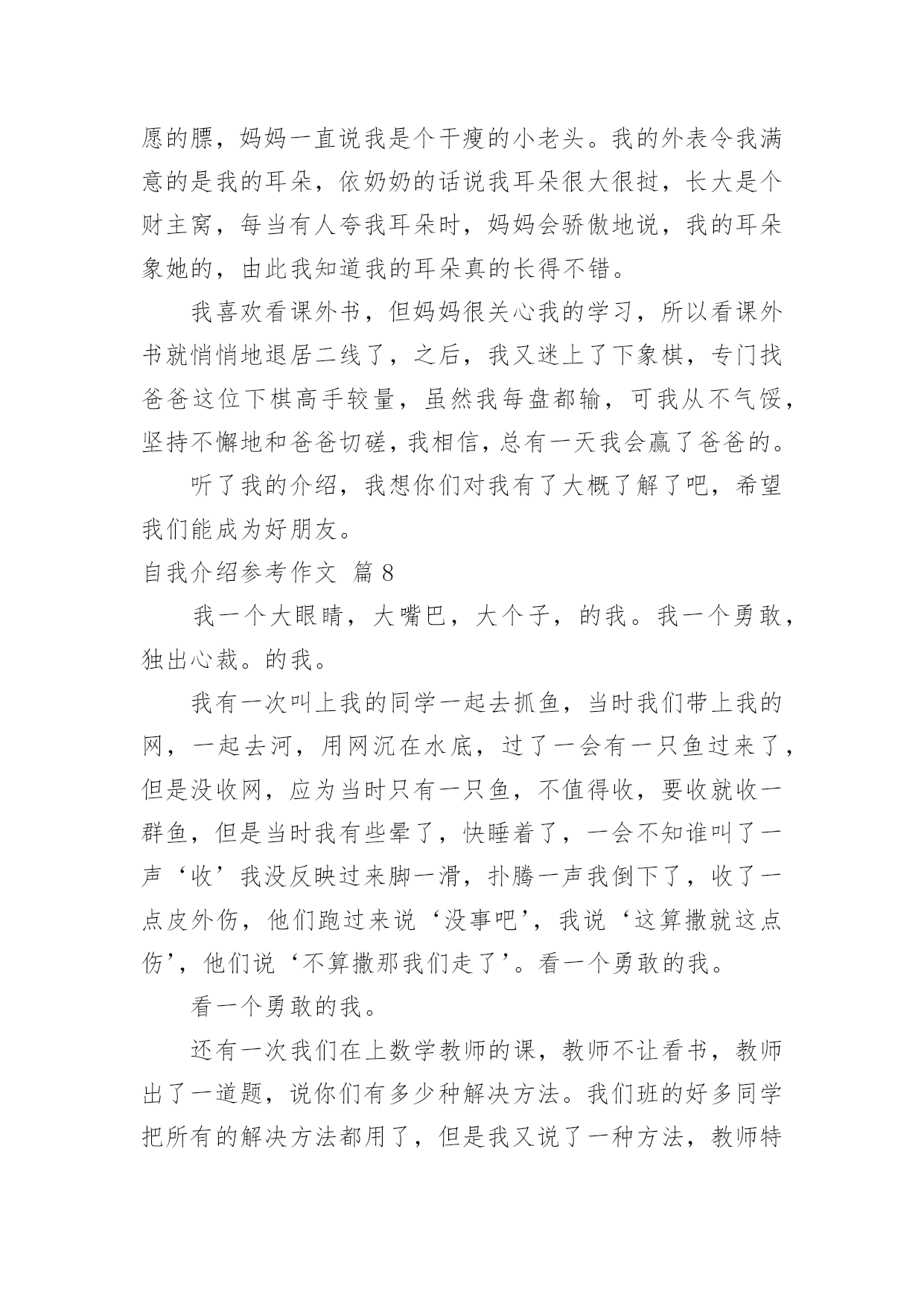 自我介绍参考作文关于自我介绍参考作文汇编九篇当到达一个陌生的环境后,通常需要我们进行自我介绍,用自我介绍往往可以来展示自己。那么自我介绍有什么格式呢?下面是小编为大家收集的自我介绍参考作文10篇,欢迎大家借鉴与参考,希望对大家有所帮助。自我介绍参考作文篇1我名叫韦乐天,出生于99年月日。我今年9岁了,身高。米,是宜州市第一小学三(X)班学生。我的爱好是看书、画画、玩玩具、玩电脑、学习网上作文等。我最主要的优点是喜欢看书,我已经啃了《三国演义》、《水浒传》、《西游记》、《封神演义》,现在正在看《鲁滨逊漂流记》。我还喜欢看有关写作的书籍,长大还想当作家呢!我喜欢看的电视节目是《少儿频道》、《动画片》、《开心辞典》、《幸运》。我喜欢养的小动物是小白兔、小鹦鹉、小金鱼、小狗和小猫。我喜欢吃各种各样的水果,其中,比较爱吃的是西瓜、雪梨、芒果、葡萄和柑子。我喜欢吃的食物是饺子、酸甜排骨、油条和豆浆。我主要的缺点是上课爱讲小话,不遵守课堂纪律;有时做作业太慢;考试时不细心检查,有很多次都是由于不细心挨扣分。不过,人有长处也有短处,我要发扬长处,克服短处,努力使自己越来越进步。作文自我介绍参考作文篇2我的名字是XX,性别男,民族汉,出生日期:20xx年3月14日,双鱼座。性格特点:阳光、健康、善良、勤劳、认真、果断,谦让,喜欢交友,有时急躁、粗心,紧张时刻有些不沉着。个人喜好:和同学打实战户外CS,阅读书籍,跑步,打羽毛球,喜欢研究枪械,对自然和生物还有化学有浓厚兴趣,画各种图画,对钢琴较有兴趣。个人厌恶:爱吹牛、打人、抄题、不懂装懂的人。在一到三年级时,兼任过数、语组长,三年级竞选成班长。每届三好学生或四好少年。现在,兼任数学组长。我希望在今后的校园生活,能够与老师、同学愉快地渡过每一天。自我介绍参考作文篇3我是一个帅气的男孩。一头乌黑光亮的头发,两条浓浓的眉毛,一双大大的眼睛炯炯有神,它们总能发现很多新奇的东西。我是一个调皮的男孩。村里李阿姨家有个可爱的小宝宝,他眉清目秀,活泼可爱,到了学说话的年龄。他整天跟着我“小多多(小哥哥)”地叫。一天,他又跟在我后面了,我脑子一转,想出了一个鬼主意。我说:“李龙是好人。”他学着说:“李龙是好人。”我又说:“李龙是坏人。”他果真也说:“李龙寺坏人。”我暗暗地笑了一下,他根本不知道我在调戏他。我还是一个爱冒险的男孩。我有一次去滑冰,可那地方人太多,太拥挤,我根本施展不开手脚。我就东瞅瞅西看看,看见一个结冰的湖,我就到那里去滑了。滑了一会儿,我来了个急刹车,把薄薄的冰捅破了,我一下子掉了下去。幸好水不深,旁边有人,我才保住小命。当我穿着湿漉漉的衣服回家时,挨了爸妈的打骂。现在想想我那时胆子可是太大了。这就我,调皮可爱的男孩。自我介绍参考作文篇4你们好!老师同学们你们认识我吗?下面就让我来介绍一下自己吧!我的名字叫叶峻林,今年12岁,上五年级了,在实验小学上学,我的头发黑黑的,长着一双水汪汪的眼睛,圆圆的脸,鼻梁上架着幅近视眼镜。我们家三口人,爸爸、妈妈和我。我是一个性格活泼、爱帮助人的人,有一次,同位的橡皮找不到了,她着急地哭起来了,我就去帮她找,我四处找都没找到,最后一看居然在她自己书包里,同位终于露出了笑容。我的另一个优点就是热爱劳动,在学校我帮老爷爷关门、关窗;在家里,我帮妈妈扫地、拖地、擦门、擦窗。我是一个聪明的孩子,喜欢读书、玩电脑,画画、练武都是我的特长。当然我也有缺点,那就是上课听讲不够认真,有一次,老师在给我们布置作业,而我却在玩,并没有听到老师布置的作业,等到回家,一想,作业不知道。还有一个缺点,那就是爱睡懒觉,每天早上,妈妈叫我好几遍,我才能起来。我下定决心,在新的学期里,改掉这些坏毛病,上课认真听讲,不走神,不作小动作,按时认真完成作业,养成早起的好习惯,请老师、同学们为我加油吧!自我介绍参考作文篇5朋友,认识我吗?下面,我向各位做一下自我介绍。我叫XX,在高密市开发区埠口小学三年年级学习,今年X岁。我家里有4口人,有爸爸、妈妈、姐姐和我。我的外表嘛,说不上是英俊,但也不算丑。圆圆的脸蛋上,嵌着一双浓眉大眼,两只耳朵长在两旁,一个小嘴镶嵌在脸蛋中央,一个小嘴长在鼻子下面。我每天都是一个笑脸,即使有烦恼我也不会说出来。我有个乐天助人的特点。记得有一次,我们中午放学,我走在回家的路上,忽然看见一个老奶奶身上背着很多东西,走不动。我马上跑过去,问一下情况。原来今天老奶奶去走亲家,由于亲家给的礼物太多,老奶奶累得走不动。于是我对她说:“老奶奶,我帮助你把东西背回家吧!”老奶奶高兴地回答说:“好,好。谢谢你,小朋友。”我一边背着东西一边搀扶着老奶奶。不一会儿,就到老奶奶家。我把东西放到老奶奶的屋子里,老奶奶直夸我是一个好孩子。我听,心里甜蜜蜜的。我也有一个爱好,爱看书。记得有一天上午,妈
