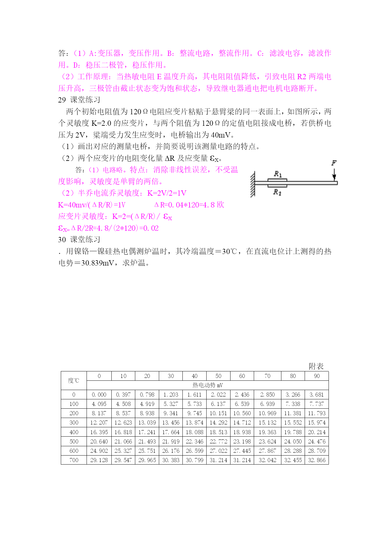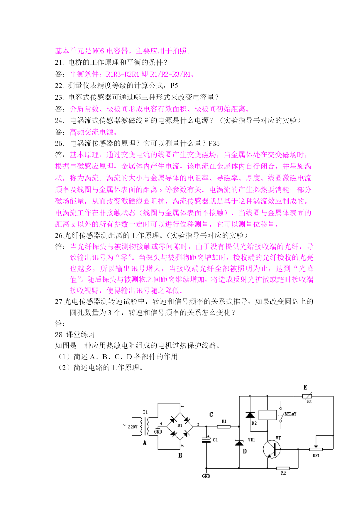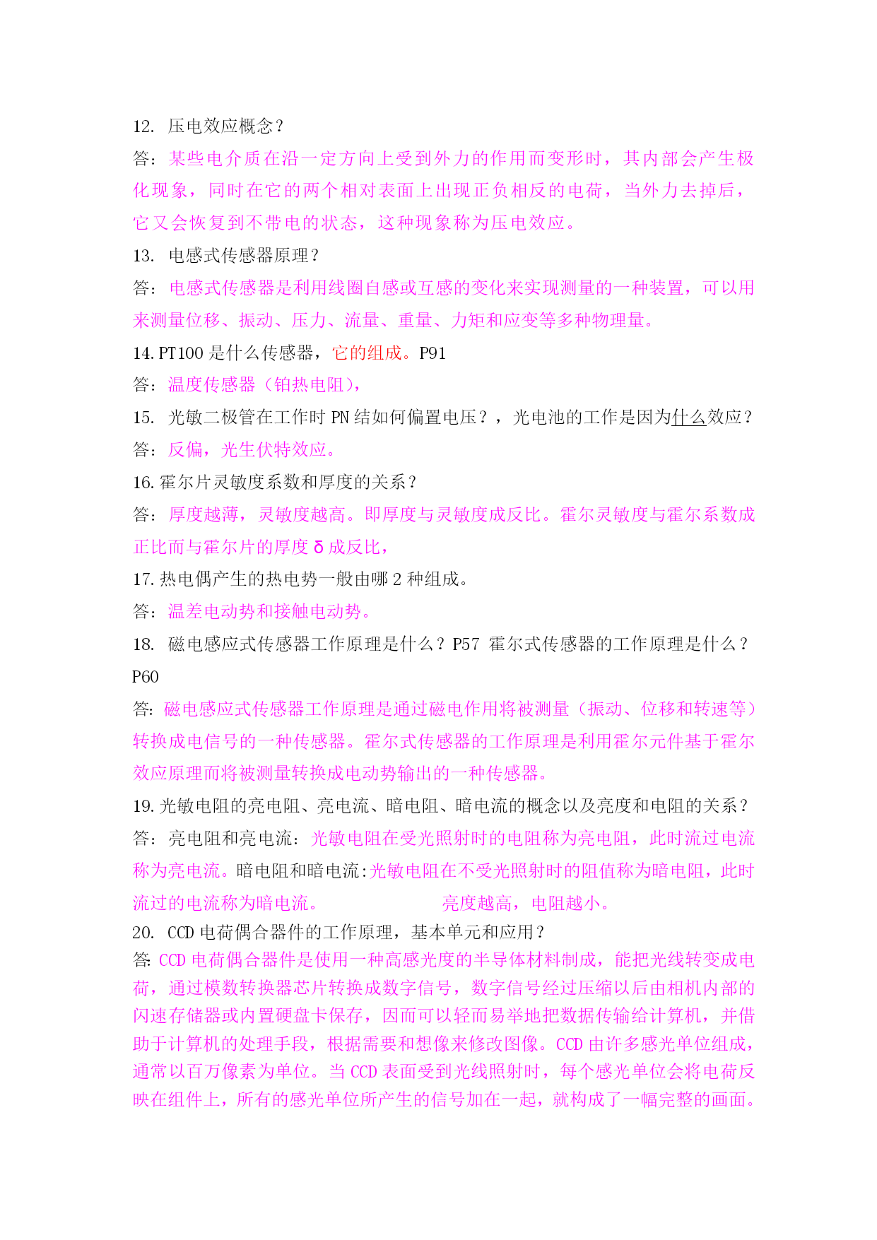 1.完整的测量结果如何表示,应包含什么?答:数值+单位,应包含测量值和所选测量单位两部分内容。2.约定真值一般如何确定?答:用精度高一级的仪表测得的测量值可视为低一级仪表的约定真值。3.系统误差概念?答:在相同测量条件下多次测量同一物理量,其误差大小和符号保持恒定或按某一确定规律变化,此类误差称作系统误差。4.随机误差概念和分布方式?答:在相同测量条件下多次测量同一物理量,其误差没有固定的大小和符号,呈无规律的随机性,此类误差称为随机误差。随机误差呈正态分布。5.有效数字位数的判断,保留有效数字位数的修约方法?例:保留3位有效数字,254550可记为多少?254400呢?255500呢?答:2.55*10^5,2.54*10^5,2.56*10^5总之一句话,小于5舍,大于5入,等于5取偶数。6.传感器定义?答:广义地说,传感器是一种能把物理量或化学量转变成便于利用的电信号的器件。国际电工委员会的定义为:“传感器是测量系统中的一种前置部件,它将输入变量转换成可供测量的信号”,Gopel等的说法是:“传感器是包括承载体和电路连接的敏感元件”,而“传感器系统则是组合有某种信息处理能力的传感器”。7.传感器由哪三部分组成?答:敏感元件和转换元件及测量电路。8.传感器线性度概念,又称什么?答:测试系统的输出与输入系统能否像理想系统那样保持正常值比例关系(线性关系)的一种度量。又称非线性误差。9.传感器的灵敏度概念?答:传感器在稳态标准条件下,输出变化对输入变化的比值称灵敏度10.量程的概念.例:如某热电阻测量范围为-20~+20℃,则其量程为40℃答:量程是对测量工具说的.是指某一工具能测定的范围。11.电阻应变片的工作原理,当应变片受拉时,它的电阻如何变化。答:金属电阻应变片的工作原理是吸附在基体材料上应变电阻随机械形变而产生阻值变化的现象,俗称为电阻应变效应。变大。12.压电效应概念?答:某些电介质在沿一定方向上受到外力的作用而变形时,其内部会产生极化现象,同时在它的两个相对表面上出现正负相反的电荷,当外力去掉后,它又会恢复到不带电的状态,这种现象称为压电效应。13.电感式传感器原理?答:电感式传感器是利用线圈自感或互感的变化来实现测量的一种装置,可以用来测量位移、振动、压力、流量、重量、力矩和应变等多种物理量。14.PT100是什么传感器,它的组成。P91答:温度传感器(铂热电阻),15.光敏二极管在工作时PN结如何偏置电压?,光电池的工作是因为什么效应?答:反偏,光生伏特效应。16.霍尔片灵敏度系数和厚度的关系?答:厚度越薄,灵敏度越高。即厚度与灵敏度成反比。霍尔灵敏度与霍尔系数成正比而与霍尔片的厚度δ成反比,17.热电偶产生的热电势一般由哪2种组成。答:温差电动势和接触电动势。18.磁电感应式传感器工作原理是什么?P57霍尔式传感器的工作原理是什么?P60答:磁电感应式传感器工作原理是通过磁电作用将被测量(振动、位移和转速等)转换成电信号的一种传感器。霍尔式传感器的工作原理是利用霍尔元件基于霍尔效应原理而将被测量转换成电动势输出的一种传感器。19.光敏电阻的亮电阻、亮电流、暗电阻、暗电流的概念以及亮度和电阻的关系?答:亮电阻和亮电流:光敏电阻在受光照射时的电阻称为亮电阻,此时流过电流称为亮电流。暗电阻和暗电流:光敏电阻在不受光照射时的阻值称为暗电阻,此时流过的电流称为暗电流。亮度越高,电阻越小。20.CCD电荷偶合器件的工作原理,基本单元和应用?答:CCD电荷偶合器件是使用一种高感光度的半导体材料制成,能把光线转变成电荷,通过模数转换器芯片转换成数字信号,数字信号经过压缩以后由相机内部的闪速存储器或内置硬盘卡保存,因而可以轻而易举地把数据传输给计算机,并借助于计算机的处理手段,根据需要和想像来修改图像。CCD由许多感光单位组成,通常以百万像素为单位。当CCD表面受到光线照射时,每个感光单位会将电荷反映在组件上,所有的感光单位所产生的信号加在一起,就构成了一幅完整的画面。基本单元是MOS电容器。主要应用于拍照。21.电桥的工作原理和平衡的条件?答:平衡条件:R1R3=R2R4即R1/R2=R3/R4。22.测量仪表精度等级的计算公式,P523.电容式传感器可通过哪三种形式来改变电容量?答:介质常数、极板间形成电容有效面积、极板间初始距离。24.电涡流式传感器激磁线圈的电源是什么电源?(实验指导书对应的实验)答:高频交流电源。25.电涡流传感器的原理?它可以测量什么量?P35答:基本原理:通过交变电流的线圈产生交变磁场,当金属体处在交变磁场时,根据电磁感应原理,金属体内产生电流,该电流在金属体内自行闭合,并星旋涡状,称