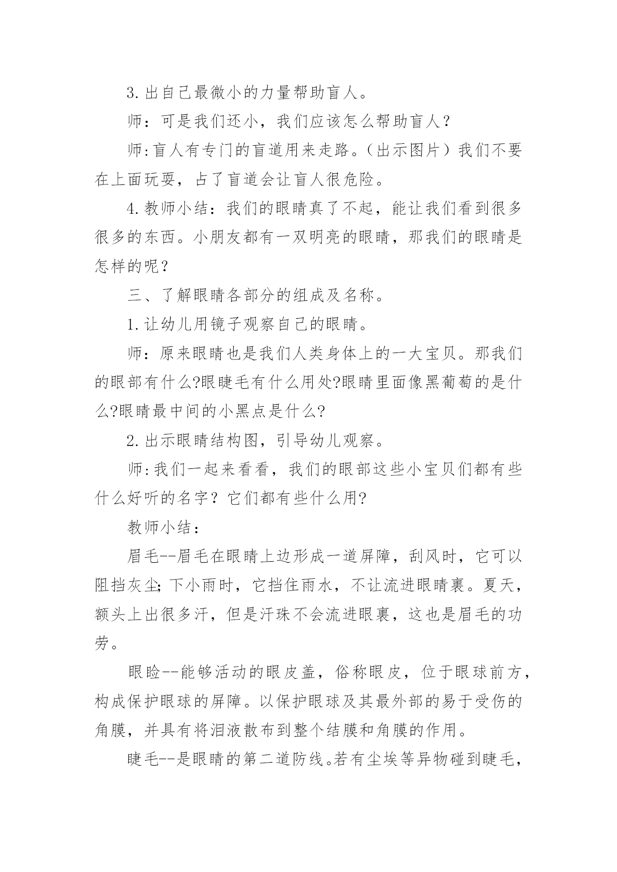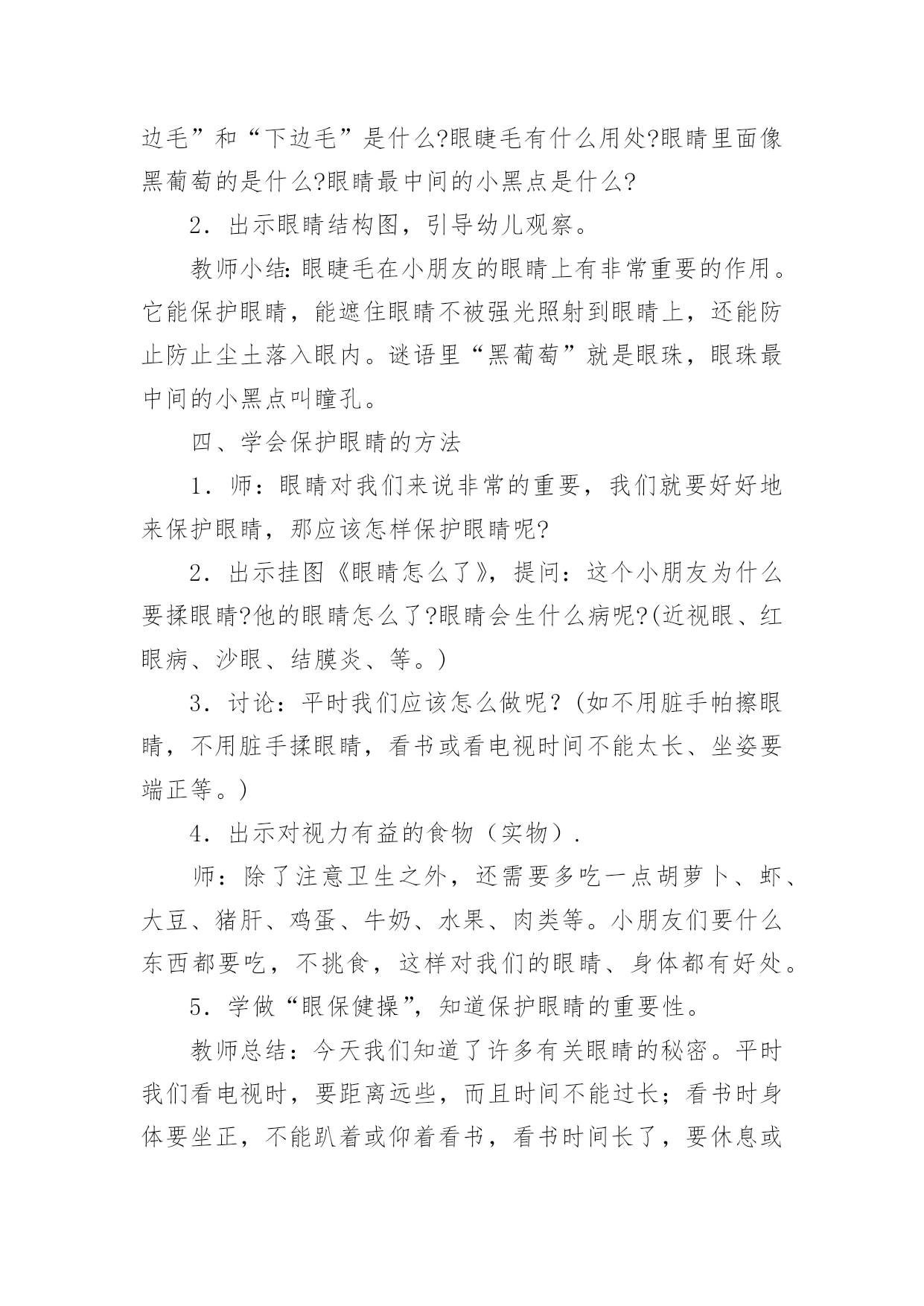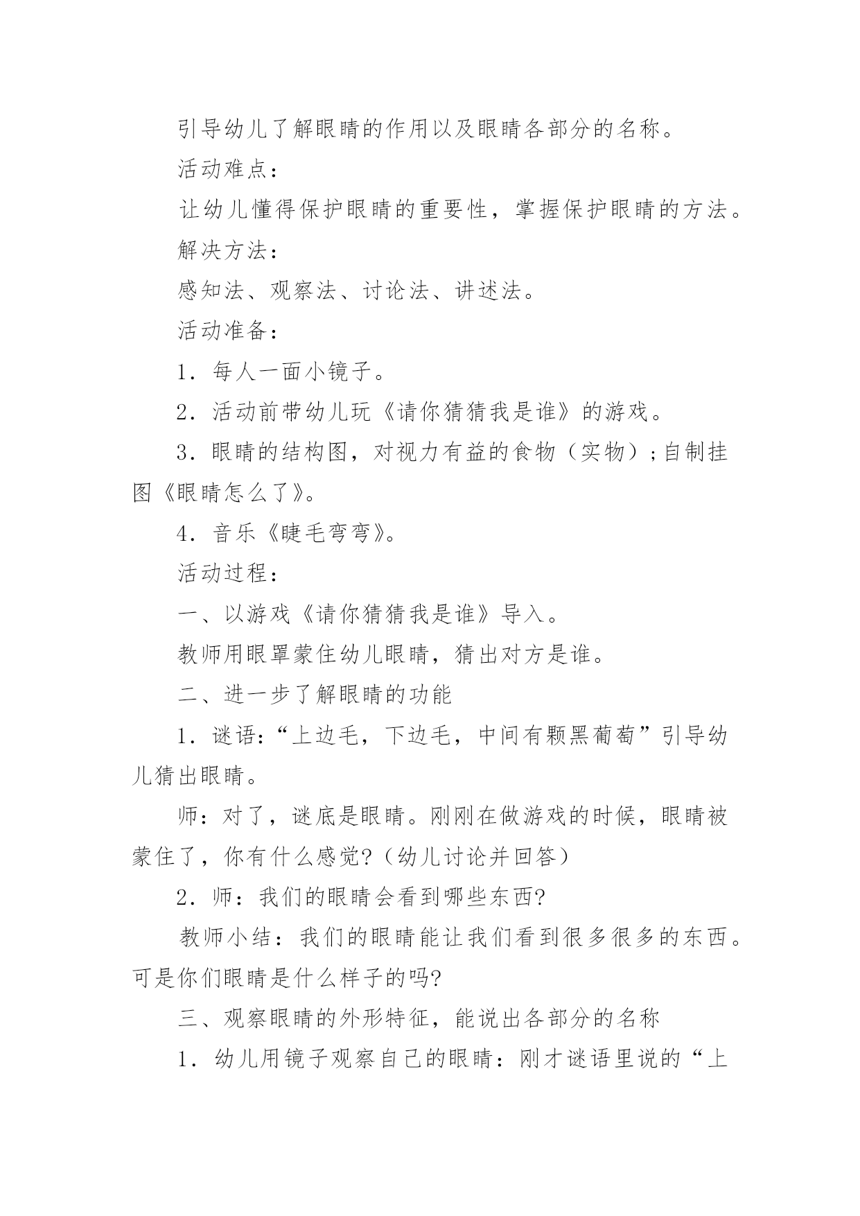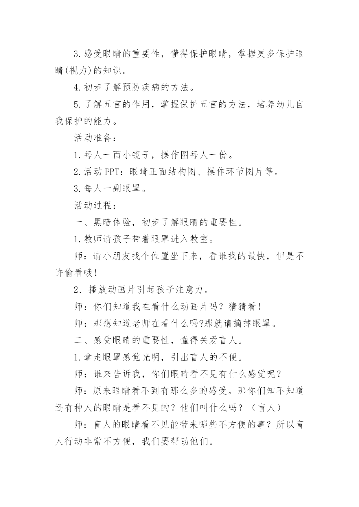 大班健康我的眼睛教案作为一名辛苦耕耘的教育工作者,就有可能用到教案,教案是实施教学的主要依据,有着至关重要的作用。来参考自己需要的教案吧!下面是小编精心整理的大班健康我的眼睛教案,欢迎大家分享。大班健康我的眼睛教案1设计意图:秋冬是许多流行疾病高发季节,手足口病、流感等等容易传播。其中眼部疾病也容易在幼儿群体中流行。最近我就发现我们班有一些小朋友喜欢自己揉眼睛,甚至有的家长让我们帮助孩子控制、纠正孩子眨眼的现象。为此让幼儿了解眼睛的作用以及眼睛各部分的名称,懂得保护眼睛的重要性,掌握更多保护眼睛的知识;我设计了这节健康活动《我的眼睛》。活动目标:1.了解眼睛的作用以及眼睛各部分的名称。2.学习“眼保健操”,引导幼儿每天坚持做眼保健操。3.懂得保护眼睛的重要性,掌握更多保护眼睛的知识。4.初步了解健康的小常识。5.初步了解预防疾病的方法。活动重点难点:活动重点:引导幼儿了解眼睛的作用以及眼睛各部分的名称。活动难点:让幼儿懂得保护眼睛的重要性,掌握保护眼睛的方法。解决方法:感知法、观察法、讨论法、讲述法。活动准备:1.每人一面小镜子。2.活动前带幼儿玩《请你猜猜我是谁》的游戏。3.眼睛的结构图,对视力有益的食物(实物);自制挂图《眼睛怎么了》。4.音乐《睫毛弯弯》。活动过程:一、以游戏《请你猜猜我是谁》导入。教师用眼罩蒙住幼儿眼睛,猜出对方是谁。二、进一步了解眼睛的功能1.谜语:“上边毛,下边毛,中间有颗黑葡萄”引导幼儿猜出眼睛。师:对了,谜底是眼睛。刚刚在做游戏的时候,眼睛被蒙住了,你有什么感觉?(幼儿讨论并回答)2.师:我们的眼睛会看到哪些东西?教师小结:我们的眼睛能让我们看到很多很多的东西。可是你们眼睛是什么样子的吗?三、观察眼睛的外形特征,能说出各部分的名称1.幼儿用镜子观察自己的眼睛:刚才谜语里说的“上边毛”和“下边毛”是什么?眼睫毛有什么用处?眼睛里面像黑葡萄的是什么?眼睛最中间的小黑点是什么?2.出示眼睛结构图,引导幼儿观察。教师小结:眼睫毛在小朋友的眼睛上有非常重要的作用。它能保护眼睛,能遮住眼睛不被强光照射到眼睛上,还能防止防止尘土落入眼内。谜语里“黑葡萄”就是眼珠,眼珠最中间的小黑点叫瞳孔。四、学会保护眼睛的方法1.师:眼睛对我们来说非常的重要,我们就要好好地来保护眼睛,那应该怎样保护眼睛呢?2.出示挂图《眼睛怎么了》,提问:这个小朋友为什么要揉眼睛?他的眼睛怎么了?眼睛会生什么病呢?(近视眼、红眼病、沙眼、结膜炎、等。)3.讨论:平时我们应该怎么做呢?(如不用脏手帕擦眼睛,不用脏手揉眼睛,看书或看电视时间不能太长、坐姿要端正等。)4.出示对视力有益的食物(实物).师:除了注意卫生之外,还需要多吃一点胡萝卜、虾、大豆、猪肝、鸡蛋、牛奶、水果、肉类等。小朋友们要什么东西都要吃,不挑食,这样对我们的眼睛、身体都有好处。5.学做“眼保健操”,知道保护眼睛的重要性。教师总结:今天我们知道了许多有关眼睛的秘密。平时我们看电视时,要距离远些,而且时间不能过长;看书时身体要坐正,不能趴着或仰着看书,看书时间长了,要休息或向远处看或看绿颜色的植物:不能在太强或太弱的光线下看书、画画和写字;平时每个人要有自己的毛巾、脸盆,防止相互传染;眼睛生病了赶紧让爸爸妈妈带小朋友们去医院进行治疗。老师希望每个小朋友都有一双明亮的眼睛,从现在起,改掉那些不好的习惯,好好地保护我们的眼睛。五、音乐律动《睫毛弯弯》。教师带领幼儿按节奏做律动,让幼儿进一步体验音乐律动的.快乐。大班健康我的眼睛教案2设计意图:《纲要》中指出:孩子要有初步的安全和健康知识,知道关心和保护自己。眼睛是我们人体重要的感觉器官,对于我们的生活、工作、学习都非常重要。随着现在的科技发达,由于幼儿在日常生活中玩手机玩电脑成为了家常便饭,导致眼睛健康的严重受损。同时看书、画画、看电视等一些姿势的不正确,严重影响了眼睛的健康。为了让幼儿能了解眼睛,并在此基础上树立正确保护眼睛的意识和方法,我设计了《我的眼睛》教学活动。活动目标:1.通过对盲人的初步了解,懂得尊重盲人,乐意帮助盲人。2.初步认识眼睛的正面结构图,了解眼睛各部位的名称及作用。3.感受眼睛的重要性,懂得保护眼睛,掌握更多保护眼睛(视力)的知识。4.初步了解预防疾病的方法。5.了解五官的作用,掌握保护五官的方法,培养幼儿自我保护的能力。活动准备:1.每人一面小镜子,操作图每人一份。2.活动PPT:眼睛正面结构图、操作环节图片等。3.每人一副眼罩。活动过程:一、黑暗体验,初步了解眼睛的重要性。1.教师请孩子带着眼罩进入教室。师:请小朋友找个位置坐下来,看谁找的最快,但是不许偷看哦!2.播放动画片引起孩子注意力。师:你们知道我在看什么动画片吗?猜猜看!师:那想知道老师在看什么吗?那就请摘掉眼罩。二、感受眼睛的重要性,懂得关