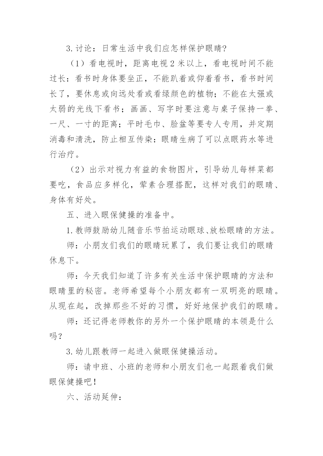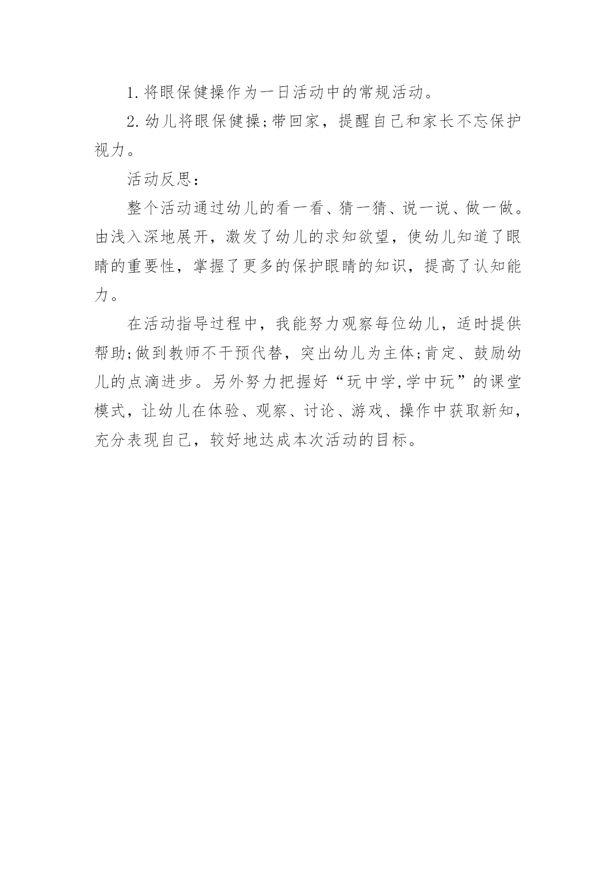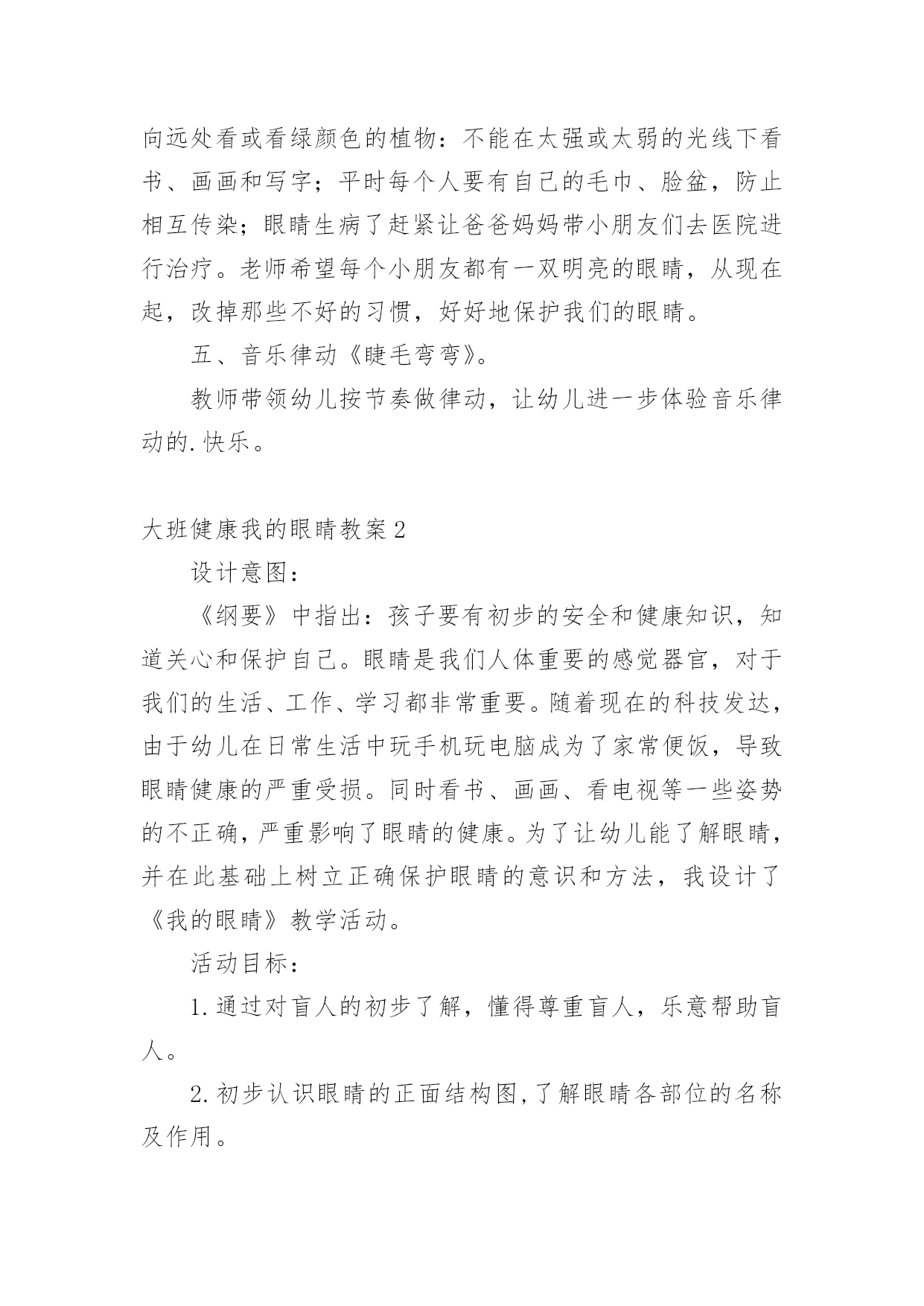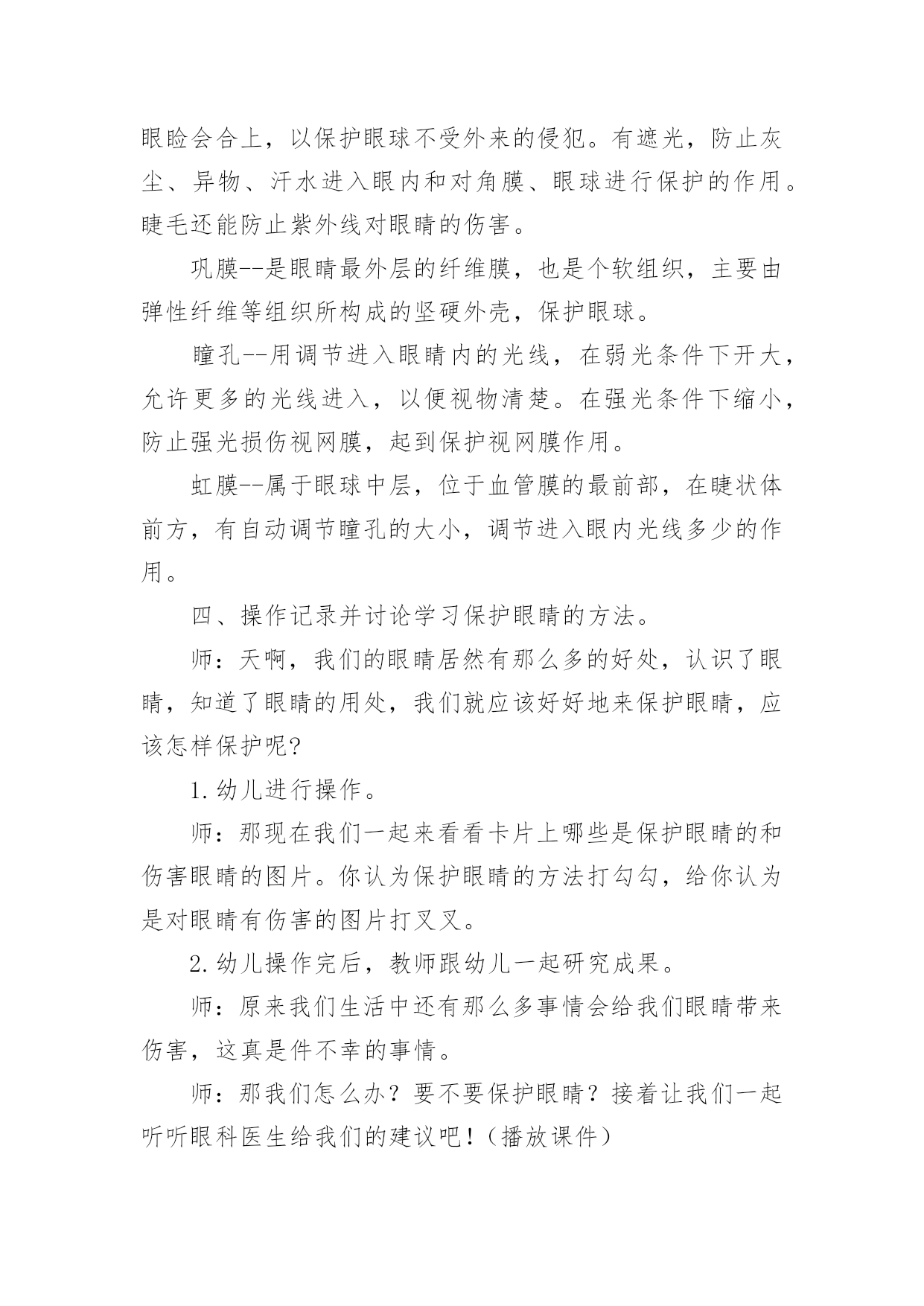 大班健康我的眼睛教案作为一名辛苦耕耘的教育工作者,就有可能用到教案,教案是实施教学的主要依据,有着至关重要的作用。来参考自己需要的教案吧!下面是小编精心整理的大班健康我的眼睛教案,欢迎大家分享。大班健康我的眼睛教案1设计意图:秋冬是许多流行疾病高发季节,手足口病、流感等等容易传播。其中眼部疾病也容易在幼儿群体中流行。最近我就发现我们班有一些小朋友喜欢自己揉眼睛,甚至有的家长让我们帮助孩子控制、纠正孩子眨眼的现象。为此让幼儿了解眼睛的作用以及眼睛各部分的名称,懂得保护眼睛的重要性,掌握更多保护眼睛的知识;我设计了这节健康活动《我的眼睛》。活动目标:1.了解眼睛的作用以及眼睛各部分的名称。2.学习“眼保健操”,引导幼儿每天坚持做眼保健操。3.懂得保护眼睛的重要性,掌握更多保护眼睛的知识。4.初步了解健康的小常识。5.初步了解预防疾病的方法。活动重点难点:活动重点:引导幼儿了解眼睛的作用以及眼睛各部分的名称。活动难点:让幼儿懂得保护眼睛的重要性,掌握保护眼睛的方法。解决方法:感知法、观察法、讨论法、讲述法。活动准备:1.每人一面小镜子。2.活动前带幼儿玩《请你猜猜我是谁》的游戏。3.眼睛的结构图,对视力有益的食物(实物);自制挂图《眼睛怎么了》。4.音乐《睫毛弯弯》。活动过程:一、以游戏《请你猜猜我是谁》导入。教师用眼罩蒙住幼儿眼睛,猜出对方是谁。二、进一步了解眼睛的功能1.谜语:“上边毛,下边毛,中间有颗黑葡萄”引导幼儿猜出眼睛。师:对了,谜底是眼睛。刚刚在做游戏的时候,眼睛被蒙住了,你有什么感觉?(幼儿讨论并回答)2.师:我们的眼睛会看到哪些东西?教师小结:我们的眼睛能让我们看到很多很多的东西。可是你们眼睛是什么样子的吗?三、观察眼睛的外形特征,能说出各部分的名称1.幼儿用镜子观察自己的眼睛:刚才谜语里说的“上边毛”和“下边毛”是什么?眼睫毛有什么用处?眼睛里面像黑葡萄的是什么?眼睛最中间的小黑点是什么?2.出示眼睛结构图,引导幼儿观察。教师小结:眼睫毛在小朋友的眼睛上有非常重要的作用。它能保护眼睛,能遮住眼睛不被强光照射到眼睛上,还能防止防止尘土落入眼内。谜语里“黑葡萄”就是眼珠,眼珠最中间的小黑点叫瞳孔。四、学会保护眼睛的方法1.师:眼睛对我们来说非常的重要,我们就要好好地来保护眼睛,那应该怎样保护眼睛呢?2.出示挂图《眼睛怎么了》,提问:这个小朋友为什么要揉眼睛?他的眼睛怎么了?眼睛会生什么病呢?(近视眼、红眼病、沙眼、结膜炎、等。)3.讨论:平时我们应该怎么做呢?(如不用脏手帕擦眼睛,不用脏手揉眼睛,看书或看电视时间不能太长、坐姿要端正等。)4.出示对视力有益的食物(实物).师:除了注意卫生之外,还需要多吃一点胡萝卜、虾、大豆、猪肝、鸡蛋、牛奶、水果、肉类等。小朋友们要什么东西都要吃,不挑食,这样对我们的眼睛、身体都有好处。5.学做“眼保健操”,知道保护眼睛的重要性。教师总结:今天我们知道了许多有关眼睛的秘密。平时我们看电视时,要距离远些,而且时间不能过长;看书时身体要坐正,不能趴着或仰着看书,看书时间长了,要休息或向远处看或看绿颜色的植物:不能在太强或太弱的光线下看书、画画和写字;平时每个人要有自己的毛巾、脸盆,防止相互传染;眼睛生病了赶紧让爸爸妈妈带小朋友们去医院进行治疗。老师希望每个小朋友都有一双明亮的眼睛,从现在起,改掉那些不好的习惯,好好地保护我们的眼睛。五、音乐律动《睫毛弯弯》。教师带领幼儿按节奏做律动,让幼儿进一步体验音乐律动的.快乐。大班健康我的眼睛教案2设计意图:《纲要》中指出:孩子要有初步的安全和健康知识,知道关心和保护自己。眼睛是我们人体重要的感觉器官,对于我们的生活、工作、学习都非常重要。随着现在的科技发达,由于幼儿在日常生活中玩手机玩电脑成为了家常便饭,导致眼睛健康的严重受损。同时看书、画画、看电视等一些姿势的不正确,严重影响了眼睛的健康。为了让幼儿能了解眼睛,并在此基础上树立正确保护眼睛的意识和方法,我设计了《我的眼睛》教学活动。活动目标:1.通过对盲人的初步了解,懂得尊重盲人,乐意帮助盲人。2.初步认识眼睛的正面结构图,了解眼睛各部位的名称及作用。3.感受眼睛的重要性,懂得保护眼睛,掌握更多保护眼睛(视力)的知识。4.初步了解预防疾病的方法。5.了解五官的作用,掌握保护五官的方法,培养幼儿自我保护的能力。活动准备:1.每人一面小镜子,操作图每人一份。2.活动PPT:眼睛正面结构图、操作环节图片等。3.每人一副眼罩。活动过程:一、黑暗体验,初步了解眼睛的重要性。1.教师请孩子带着眼罩进入教室。师:请小朋友找个位置坐下来,看谁找的最快,但是不许偷看哦!2.播放动画片引起孩子注意力。师:你们知道我在看什么动画片吗?猜猜看!师:那想知道老师在看什么吗?那就请摘掉眼罩。二、感受眼睛的重要性,懂得关