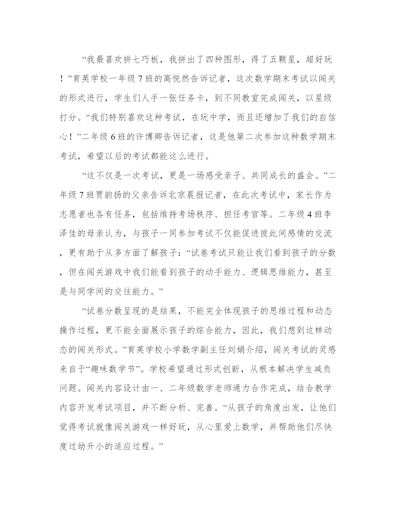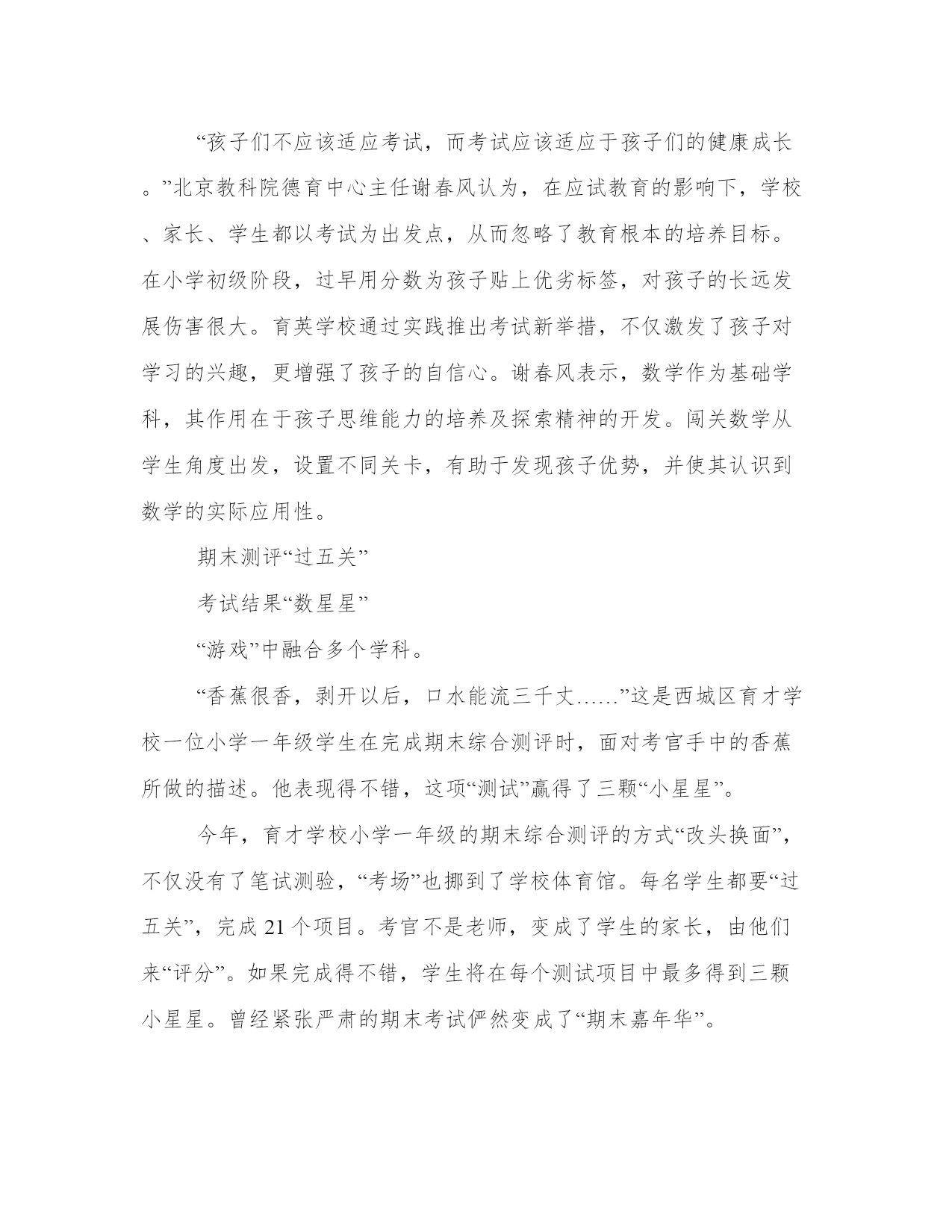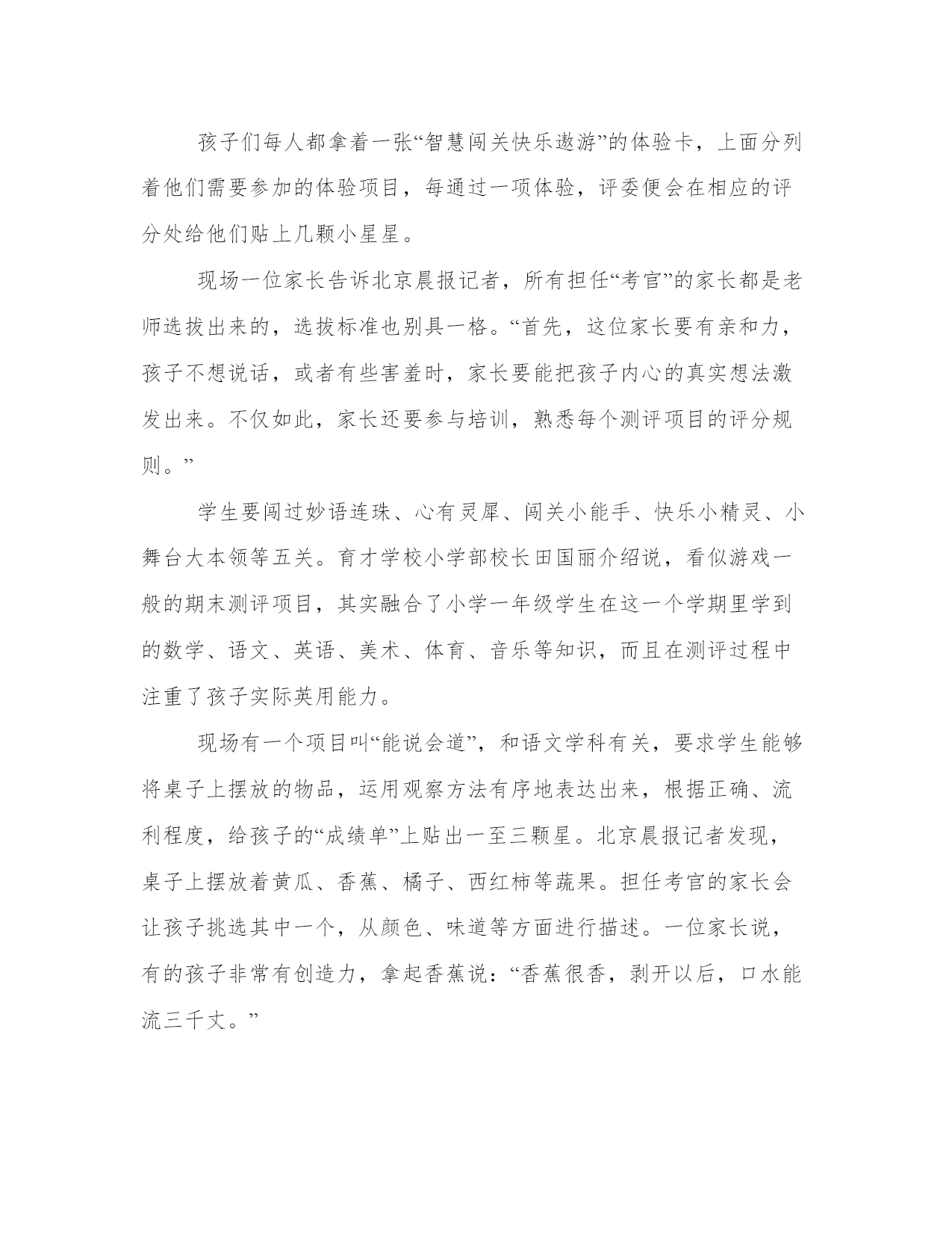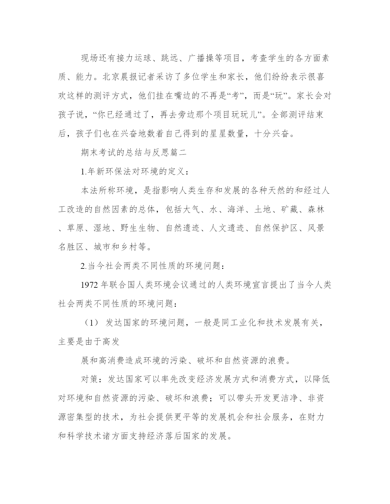 期末考试的总结与反思期末考试总结(优质10篇)总结是对过去一定时期的工作、学习或思想情况进行回顾、分析,并做出客观评价的书面材料,它可使零星的、肤浅的、表面的感性认知上升到全面的、系统的、本质的理性认识上来,让我们一起认真地写一份总结吧。总结怎么写才能发挥它最大的作用呢?下面是我给大家整理的总结范文,欢迎大家阅读分享借鉴,希望对大家能够有所帮助。期末考试的总结与反思篇一本周起,全市中小学陆续进入考试周。去年,北京市出台8条措施落实学生“减负”,其中规定小学除语文、数学、英语每学期期末可以举行一次全校或全年级学科考试外,其他课程不得组织考试。随着“减负”工作的深入,各校纷纷在考试上花费了不少心思。据了解,自20xx年起,东城区崇文小学就实施了没有试卷、不计分数的“快乐期末考试”,据悉今年该校还将延续这一做法。而北京晨报(微博)记者也从部分学校了解到,为了让考试更能体现考查学生能力的作用而又不增加学生的负担,学校纷纷推出特色考试,让学生们“玩着考”。在纸质的表盘上拨出时间、用印有面额的纸币购买商品……日前,育英学校一、二年级的孩子们参加了一次与众不同的数学期末考试。“我最喜欢拼七巧板,我拼出了四种图形,得了五颗星,超好玩!”育英学校一年级7班的高悦然告诉记者,这次数学期末考试以闯关的形式进行,学生们人手一张任务卡,到不同教室完成闯关,以星级打分。“我们特别喜欢这种考试,在玩中学,而且还增加了我们的自信心!”二年级6班的许博卿告诉记者,这是他第二次参加这种数学期末考试,希望以后的考试都能这么进行。“这不仅是一次考试,更是一场感受亲子、共同成长的盛会。”二年级7班贾韵扬的父亲告诉北京晨报记者,在此次考试中,家长作为志愿者也各有任务,包括维持考场秩序、担任考官等。二年级4班李泽佳的母亲认为,与孩子一同参加考试不仅能促进彼此间感情的交流,更有助于从多方面了解孩子:“试卷考试只能让我们看到孩子的分数,但在闯关游戏中我们能看到孩子的动手能力、逻辑思维能力,甚至是与同学间的交往能力。”“试卷分数呈现的是结果,不能完全体现孩子的思维过程和动态操作过程,更不能全面展示孩子的综合能力,因此,我们想到这样动态的闯关形式。”育英学校小学数学副主任刘娟介绍,闯关考试的灵感来自于“趣味数学节”。学校希望通过形式创新,从根本解决学生减负问题。闯关内容设计由一、二年级数学老师通力合作完成,结合教学内容开发考试项目,并不断分析、完善。“从孩子的角度出发,让他们觉得考试就像闯关游戏一样好玩,从心里爱上数学,并帮助他们尽快度过幼升小的适应过程。”“孩子们不应该适应考试,而考试应该适应于孩子们的健康成长。”北京教科院德育中心主任谢春风认为,在应试教育的影响下,学校、家长、学生都以考试为出发点,从而忽略了教育根本的培养目标。在小学初级阶段,过早用分数为孩子贴上优劣标签,对孩子的长远发展伤害很大。育英学校通过实践推出考试新举措,不仅激发了孩子对学习的兴趣,更增强了孩子的自信心。谢春风表示,数学作为基础学科,其作用在于孩子思维能力的培养及探索精神的开发。闯关数学从学生角度出发,设置不同关卡,有助于发现孩子优势,并使其认识到数学的实际应用性。期末测评“过五关”考试结果“数星星”“游戏”中融合多个学科。“香蕉很香,剥开以后,口水能流三千丈……”这是西城区育才学校一位小学一年级学生在完成期末综合测评时,面对考官手中的香蕉所做的描述。他表现得不错,这项“测试”赢得了三颗“小星星”。今年,育才学校小学一年级的期末综合测评的方式“改头换面”,不仅没有了笔试测验,“考场”也挪到了学校体育馆。每名学生都要“过五关”,完成21个项目。考官不是老师,变成了学生的家长,由他们来“评分”。如果完成得不错,学生将在每个测试项目中最多得到三颗小星星。曾经紧张严肃的期末考试俨然变成了“期末嘉年华”。孩子们每人都拿着一张“智慧闯关快乐遨游”的体验卡,上面分列着他们需要参加的体验项目,每通过一项体验,评委便会在相应的评分处给他们贴上几颗小星星。现场一位家长告诉北京晨报记者,所有担任“考官”的家长都是老师选拔出来的,选拔标准也别具一格。“首先,这位家长要有亲和力,孩子不想说话,或者有些害羞时,家长要能把孩子内心的真实想法激发出来。不仅如此,家长还要参与培训,熟悉每个测评项目的评分规则。”学生要闯过妙语连珠、心有灵犀、闯关小能手、快乐小精灵、小舞台大本领等五关。育才学校小学部校长田国丽介绍说,看似游戏一般的期末测评项目,其实融合了小学一年级学生在这一个学期里学到的数学、语文、英语、美术、体育、音乐等知识,而且在测评过程中注重了孩子实际英用能力。现场有一个项目叫“能说会道”,和语文学科有关,要求学生能够将桌子上摆放的物品,运用观察方法有序地表达出来,根据正确、流利程度,给孩子的“