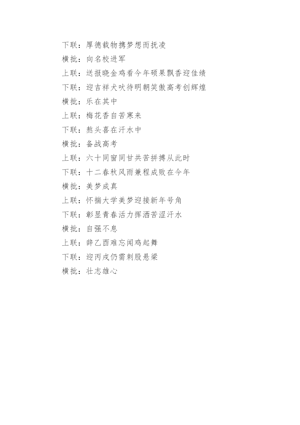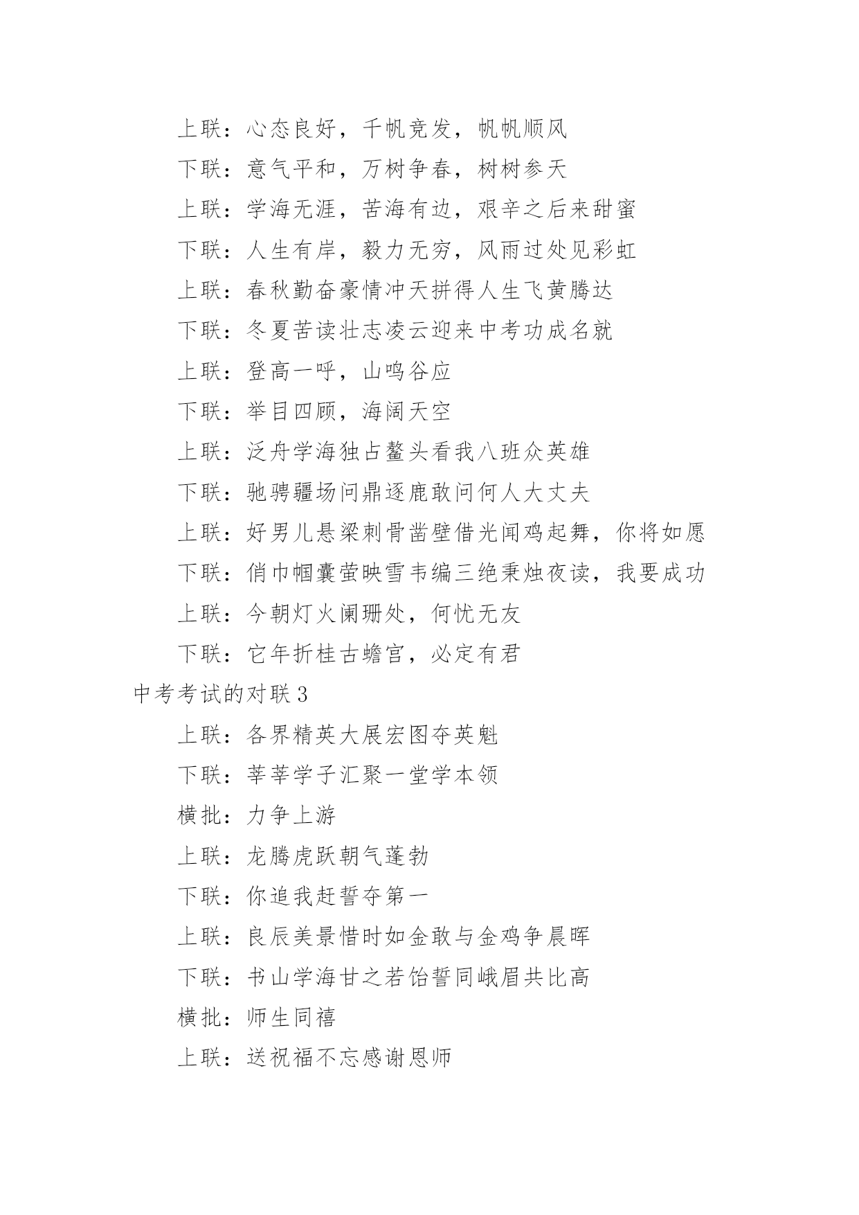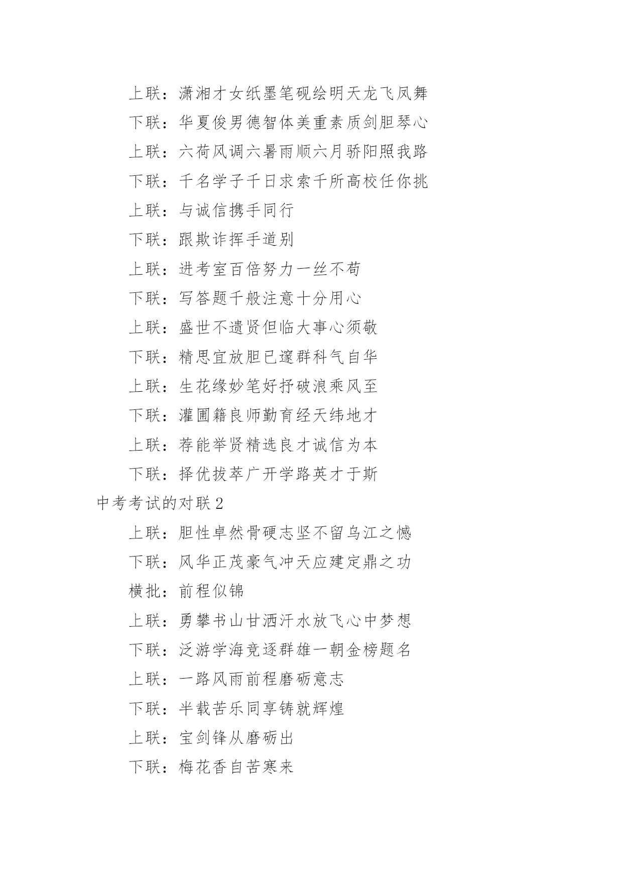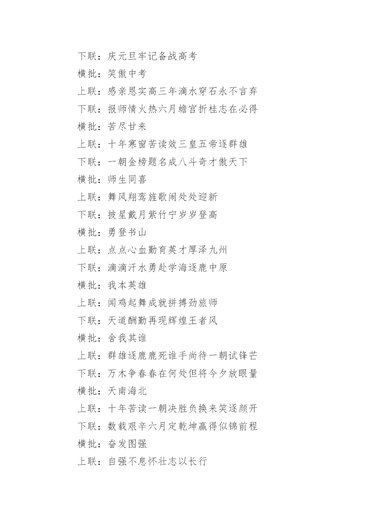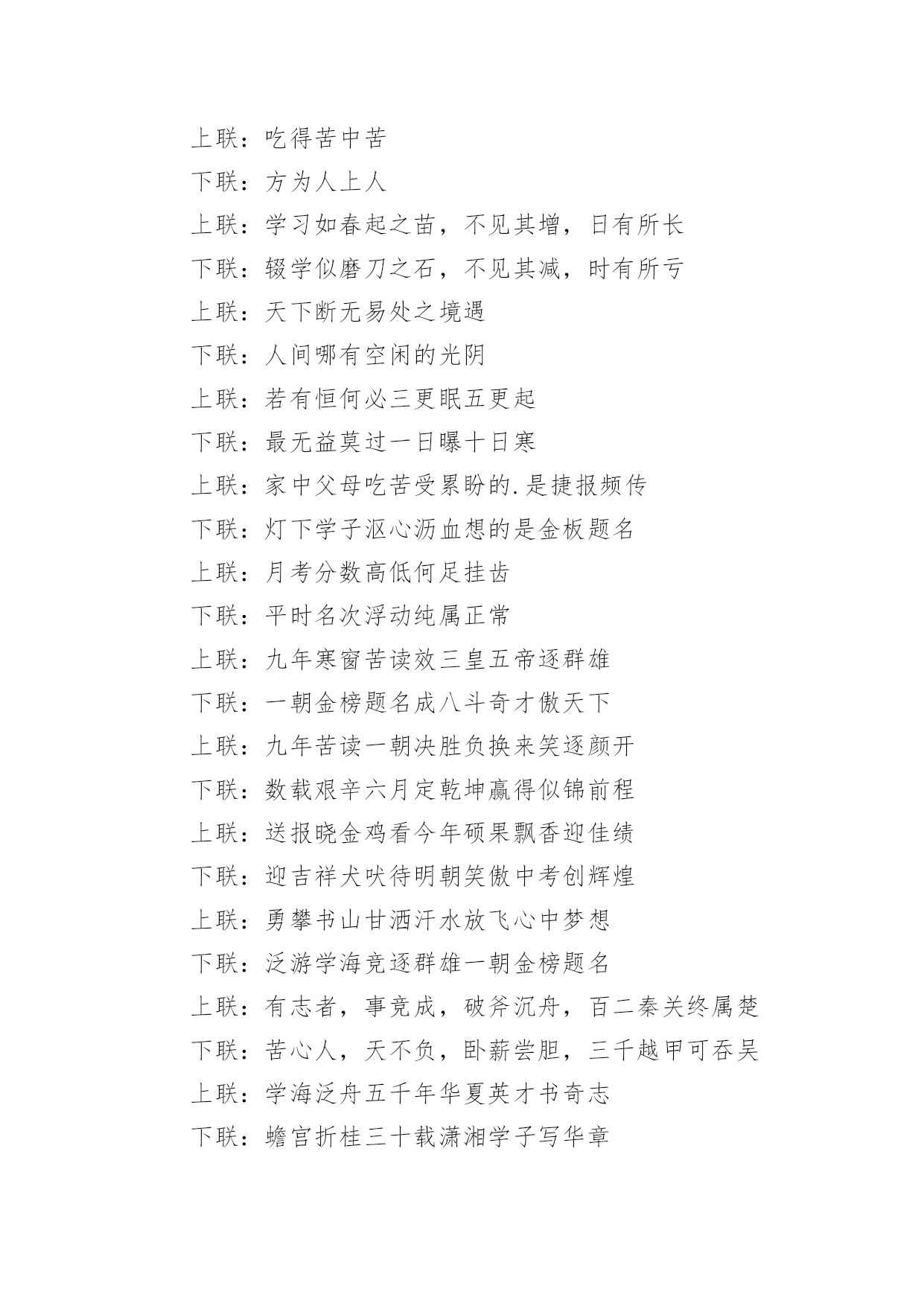 中考考试的对联中考考试的对联(3篇)在学习、工作、生活中,大家总少不了接触一些耳熟能详的对联吧,对联是一种对偶文学,起源于桃符。你所见过的对联是什么样的呢?下面是小编整理的中考考试的对联,欢迎阅读,希望大家能够喜欢。中考考试的对联1上联:九万里云程登梯得路兹门入下联:十二年夙梦彰榜题名此地圆上联:昨日辛苦谁能识,父识、母识、老师识下联:今朝甘甜我自知,笔知、卷知、分数知上联:胸怀万卷登峰须有凌云志下联:落笔千钧折桂终是面壁人上联:重道德、强素质、教育创新果满园下联:新思维、新理念、深化改革花千树上联:笔杆当枪杆敢云世间俊杰我是精英下联:考场作战场试问天下学子谁为好汉上联:今日挥如椽巨笔语数英综点点滴滴任挥洒下联:明朝展鲲鹏之翅政经军文门门行行凭翱翔上联:学贵有恒一鼓作气信心百倍迎大考下联:自强不息二日拼搏敢凭实力上青云上联:潇湘才女纸墨笔砚绘明天龙飞凤舞下联:华夏俊男德智体美重素质剑胆琴心上联:六荷风调六暑雨顺六月骄阳照我路下联:千名学子千日求索千所高校任你挑上联:与诚信携手同行下联:跟欺诈挥手道别上联:进考室百倍努力一丝不苟下联:写答题千般注意十分用心上联:盛世不遗贤但临大事心须敬下联:精思宜放胆已邃群科气自华上联:生花缘妙笔好抒破浪乘风至下联:灌圃籍良师勤育经天纬地才上联:荐能举贤精选良才诚信为本下联:择优拔萃广开学路英才于斯中考考试的对联2上联:胆性卓然骨硬志坚不留乌江之憾下联:风华正茂豪气冲天应建定鼎之功横批:前程似锦上联:勇攀书山甘洒汗水放飞心中梦想下联:泛游学海竞逐群雄一朝金榜题名上联:一路风雨前程磨砺意志下联:半载苦乐同享铸就辉煌上联:宝剑锋从磨砺出下联:梅花香自苦寒来上联:吃得苦中苦下联:方为人上人上联:学习如春起之苗,不见其增,日有所长下联:辍学似磨刀之石,不见其减,时有所亏上联:天下断无易处之境遇下联:人间哪有空闲的光阴上联:若有恒何必三更眠五更起下联:最无益莫过一日曝十日寒上联:家中父母吃苦受累盼的.是捷报频传下联:灯下学子沤心沥血想的是金板题名上联:月考分数高低何足挂齿下联:平时名次浮动纯属正常上联:九年寒窗苦读效三皇五帝逐群雄下联:一朝金榜题名成八斗奇才傲天下上联:九年苦读一朝决胜负换来笑逐颜开下联:数载艰辛六月定乾坤赢得似锦前程上联:送报晓金鸡看今年硕果飘香迎佳绩下联:迎吉祥犬吠待明朝笑傲中考创辉煌上联:勇攀书山甘洒汗水放飞心中梦想下联:泛游学海竞逐群雄一朝金榜题名上联:有志者,事竞成,破斧沉舟,百二秦关终属楚下联:苦心人,天不负,卧薪尝胆,三千越甲可吞吴上联:学海泛舟五千年华夏英才书奇志下联:蟾宫折桂三十载潇湘学子写华章上联:心态良好,千帆竞发,帆帆顺风下联:意气平和,万树争春,树树参天上联:学海无涯,苦海有边,艰辛之后来甜蜜下联:人生有岸,毅力无穷,风雨过处见彩虹上联:春秋勤奋豪情冲天拼得人生飞黄腾达下联:冬夏苦读壮志凌云迎来中考功成名就上联:登高一呼,山鸣谷应下联:举目四顾,海阔天空上联:泛舟学海独占鳌头看我八班众英雄下联:驰骋疆场问鼎逐鹿敢问何人大丈夫上联:好男儿悬梁刺骨凿壁借光闻鸡起舞,你将如愿下联:俏巾帼囊萤映雪韦编三绝秉烛夜读,我要成功上联:今朝灯火阑珊处,何忧无友下联:它年折桂古蟾宫,必定有君中考考试的对联3上联:各界精英大展宏图夺英魁下联:莘莘学子汇聚一堂学本领横批:力争上游上联:龙腾虎跃朝气蓬勃下联:你追我赶誓夺第一上联:良辰美景惜时如金敢与金鸡争晨晖下联:书山学海甘之若饴誓同峨眉共比高横批:师生同禧上联:送祝福不忘感谢恩师下联:庆元旦牢记备战高考横批:笑傲中考上联:感亲恩实高三年滴水穿石永不言弃下联:报师情火热六月蟾宫折桂志在必得横批:苦尽甘来上联:十年寒窗苦读效三皇五帝逐群雄下联:一朝金榜题名成八斗奇才傲天下横批:师生同喜上联:舞风翔鸾旌歌闹处处迎新下联:披星戴月紫竹宁岁岁登高横批:勇登书山上联:点点心血勤育英才厚泽九州下联:滴滴汗水勇赴学海逐鹿中原横批:我本英雄上联:闻鸡起舞成就拼搏劲旅师下联:天道酬勤再现辉煌王者风横批:舍我其谁上联:群雄逐鹿鹿死谁手尚待一朝试锋芒下联:万木争春春在何处但将今夕放眼量横批:天南海北上联:十年苦读一朝决胜负换来笑逐颜开下联:数载艰辛六月定乾坤赢得似锦前程横批:奋发图强上联:自强不息怀壮志以长行下联:厚德载物携梦想而抚凌横批:向名校进军上联:送报晓金鸡看今年硕果飘香迎佳绩下联:迎吉祥犬吠待明朝笑傲高考创辉煌横批:乐在其中上联:梅花香自苦寒来下联:熬头喜在汗水中横批:备战高考上联:六十同窗同甘共苦拼搏从此时下联:十二春秋风雨兼程成败在今年横批:美梦成真上联:怀揣大学美梦迎接新年号角下联:彰显青春活力挥洒苦涩汗水横批:自强不息上联:辞乙酉难忘闻鸡起舞下联:迎丙戌仍需刺股悬梁横批:壮志雄心