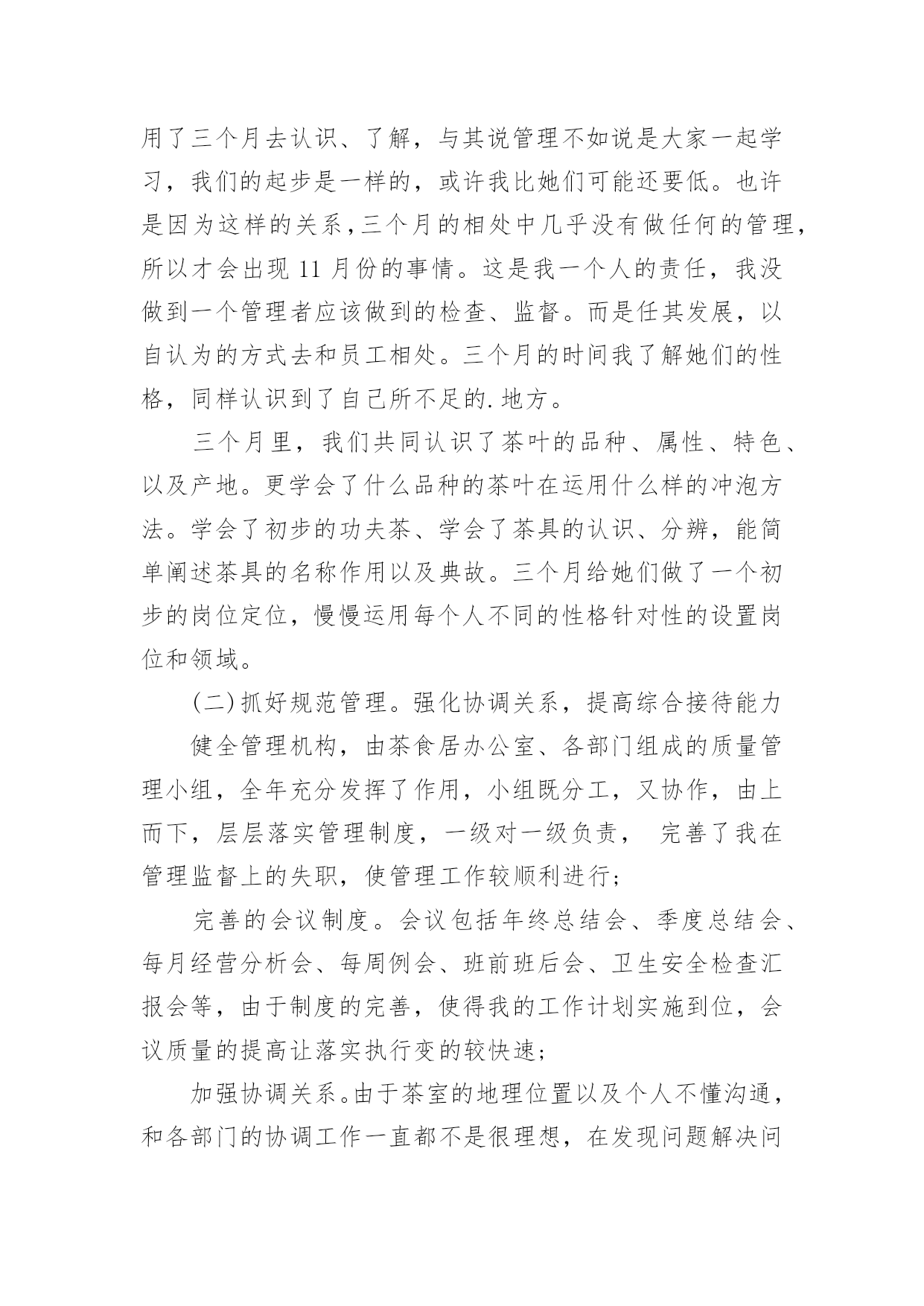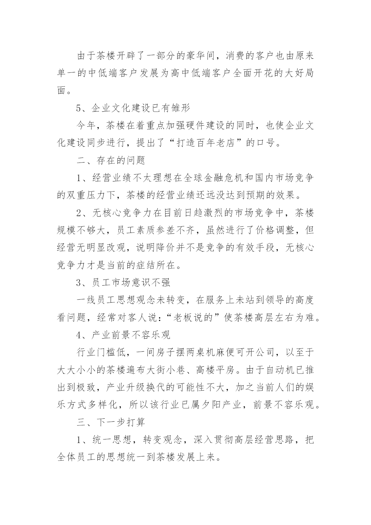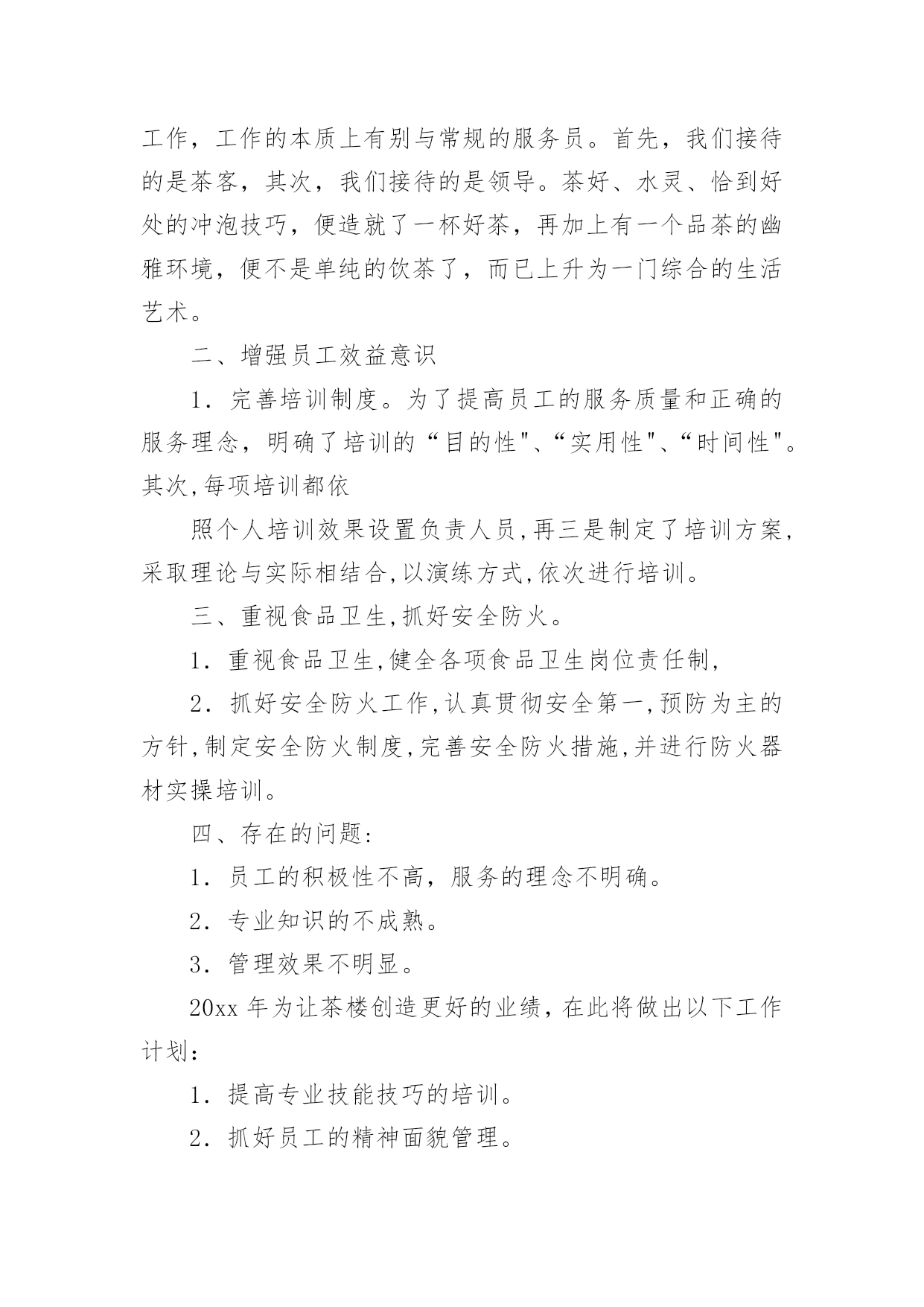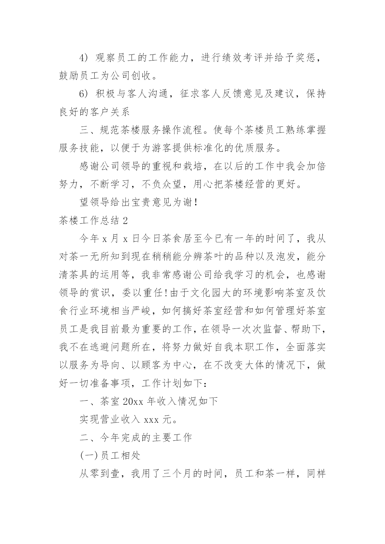 茶楼工作总结茶楼工作总结总结是在某一特定时间段对学习和工作生活或其完成情况,包括取得的成绩、存在的问题及得到的经验和教训加以回顾和分析的书面材料,通过它可以全面地、系统地了解以往的学习和工作情况,因此我们需要回头归纳,写一份总结了。我们该怎么去写总结呢?以下是小编精心整理的茶楼工作总结,欢迎阅读,希望大家能够喜欢。茶楼工作总结1一、抓好规范管理,提高综合接待能力。1.健全管理机构,公司各部门组成的质量管理小组,全年充分发挥了作用,小组既分工,又协作,由上而下,层层落实管理制度,一级对一级负责,完善了我在管理监督上的失职,使管理工作较顺利进行。2.加强协调关系。由于茶室的地理位置以及个人不懂沟通,和各部门的协调工作一直都不是很理想,在发现问题,解决问题上一直得不到更好的完善。每项工作的完成,有赖于各部门之间的协调合作;每周例会上反复强调,出现问题,部门之间不得相互责怪、推搪,要敢于承认错误,多发现对方的优点,搞好协调。3.提高综合接待能力。个人认为茶室主要做的是接待工作,工作的本质上有别与常规的服务员。首先,我们接待的是茶客,其次,我们接待的是领导。茶好、水灵、恰到好处的冲泡技巧,便造就了一杯好茶,再加上有一个品茶的幽雅环境,便不是单纯的饮茶了,而已上升为一门综合的生活艺术。二、增强员工效益意识1.完善培训制度。为了提高员工的服务质量和正确的服务理念,明确了培训的“目的性"、“实用性"、“时间性"。其次,每项培训都依照个人培训效果设置负责人员,再三是制定了培训方案,采取理论与实际相结合,以演练方式,依次进行培训。三、重视食品卫生,抓好安全防火。1.重视食品卫生,健全各项食品卫生岗位责任制,2.抓好安全防火工作,认真贯彻安全第一,预防为主的方针,制定安全防火制度,完善安全防火措施,并进行防火器材实操培训。四、存在的问题:1.员工的积极性不高,服务的理念不明确。2.专业知识的不成熟。3.管理效果不明显。20xx年为让茶楼创造更好的业绩,在此将做出以下工作计划:1.提高专业技能技巧的培训。2.抓好员工的精神面貌管理。3.加强规范管理,提高茶室的卫生监督管理水平和服务质量。4.多开展员工技能考核活动,增加员工积极性。5.规划一个小区域,让喜欢自己泡茶,享受泡茶乐趣的人DIY,同时有服务员在场,在茶楼放几个书架,书架上有各种各样关于茶和有关于老峨山的文化书籍,如何泡茶,茶的功效等等,还有一些其他的书,杂志,让来这里喝茶的人不仅喝茶,还可以休闲娱乐,放松心情。一、提升个人素质。我将吸取遗憾的教训、收获的经验,脚踏实地,不断学习。在思想上,始终如一的热爱本职工作,关心公司的前途,以公司的利益放在首位。在与同事的相处中,注意加强团结,与同事相处融洽,合作愉快,组成一个团结协作的大家庭。在实际行动中,培养主动意识。勇于承担责任,主动为自己设定工作目标,并不断改进方式和方法。势必在20xx年让茶楼的生意有个新的突破!二、加强管理。1)监督员工的`服务标准、个人的仪容仪表、茶楼的清洁卫生、工作中的纪律。2)熟悉每位服务员,掌握它们的性格特征,关心员工生活。工作上加强管理,培养出精明能干、落落大方的服务员。3)加强对茶楼服务用品,消耗用品及固定资产进行控制和管理4)观察员工的工作能力,进行绩效考评并给予奖惩,鼓励员工为公司创收。6)积极与客人沟通,征求客人反馈意见及建议,保持良好的客户关系三、规范茶楼服务操作流程。使每个茶楼员工熟练掌握服务技能,以便于为游客提供标准化的优质服务。感谢公司领导的重视和栽培,在以后的工作中我会加倍努力,不断学习,不负众望,用心把茶楼经营的更好。望领导给出宝贵意见为谢!茶楼工作总结2今年x月x日今日茶食居至今已有一年的时间了,我从对茶一无所知到现在稍稍能分辨茶叶的品种以及泡发,能分清茶具的运用等,我非常感谢公司给我学习的机会,也感谢领导的赏识,委以重任!由于文化园大的环境影响茶室及饮食行业环境相当严峻,如何搞好茶室经营和如何管理好茶室员工是我目前最为重要的工作,在领导一次次监督、帮助下,我不在逃避问题所在,将努力做好自我本职工作,全面落实以服务为导向、以顾客为中心,在不改变大体的情况下,做好一切准备事项,工作计划如下:一、茶室20xx年收入情况如下实现营业收入xxx元。二、今年完成的主要工作(一)员工相处从零到壹,我用了三个月的时间,员工和茶一样,同样用了三个月去认识、了解,与其说管理不如说是大家一起学习,我们的起步是一样的,或许我比她们可能还要低。也许是因为这样的关系,三个月的相处中几乎没有做任何的管理,所以才会出现11月份的事情。这是我一个人的责任,我没做到一个管理者应该做到的检查、监督。而是任其发展,以自认为的方式去和员工相处。三个月的时间我了解她们的性格,同样认识到了自己所不足的.地方。三个月里,我们共同认识了茶