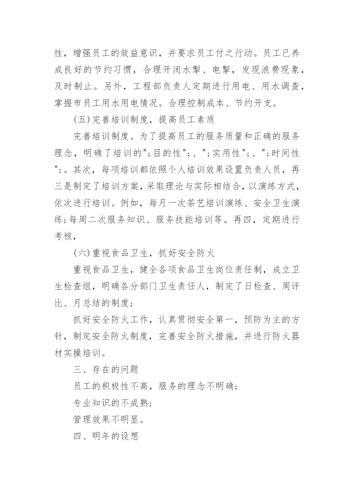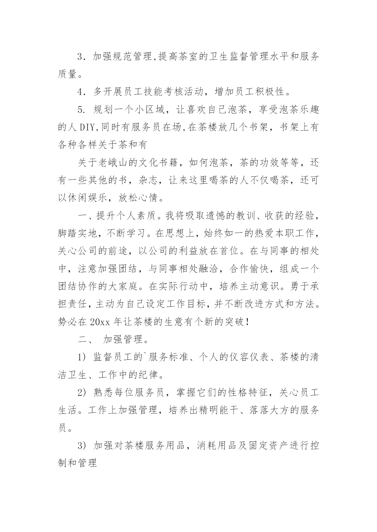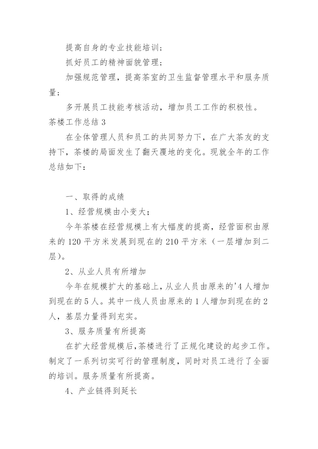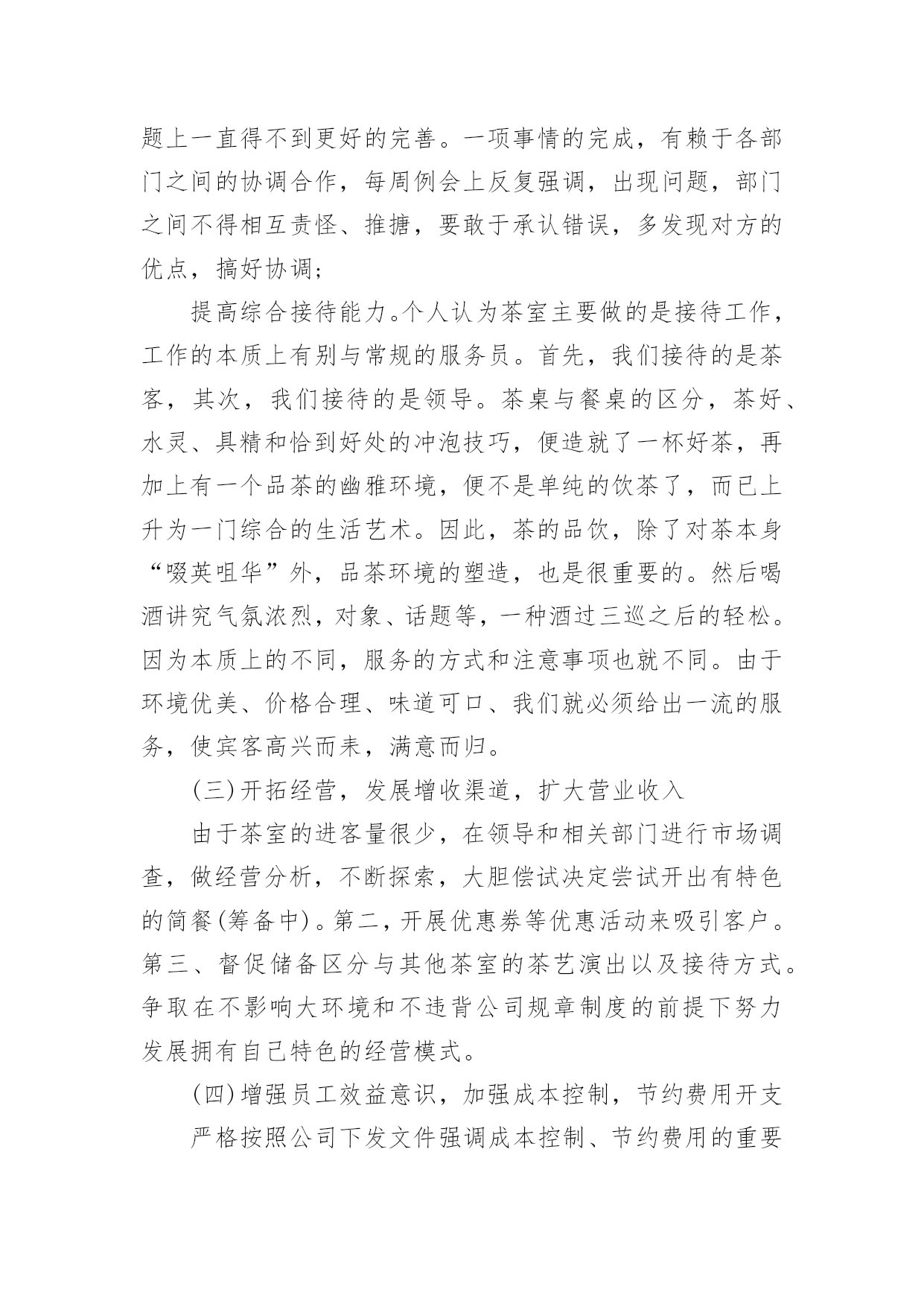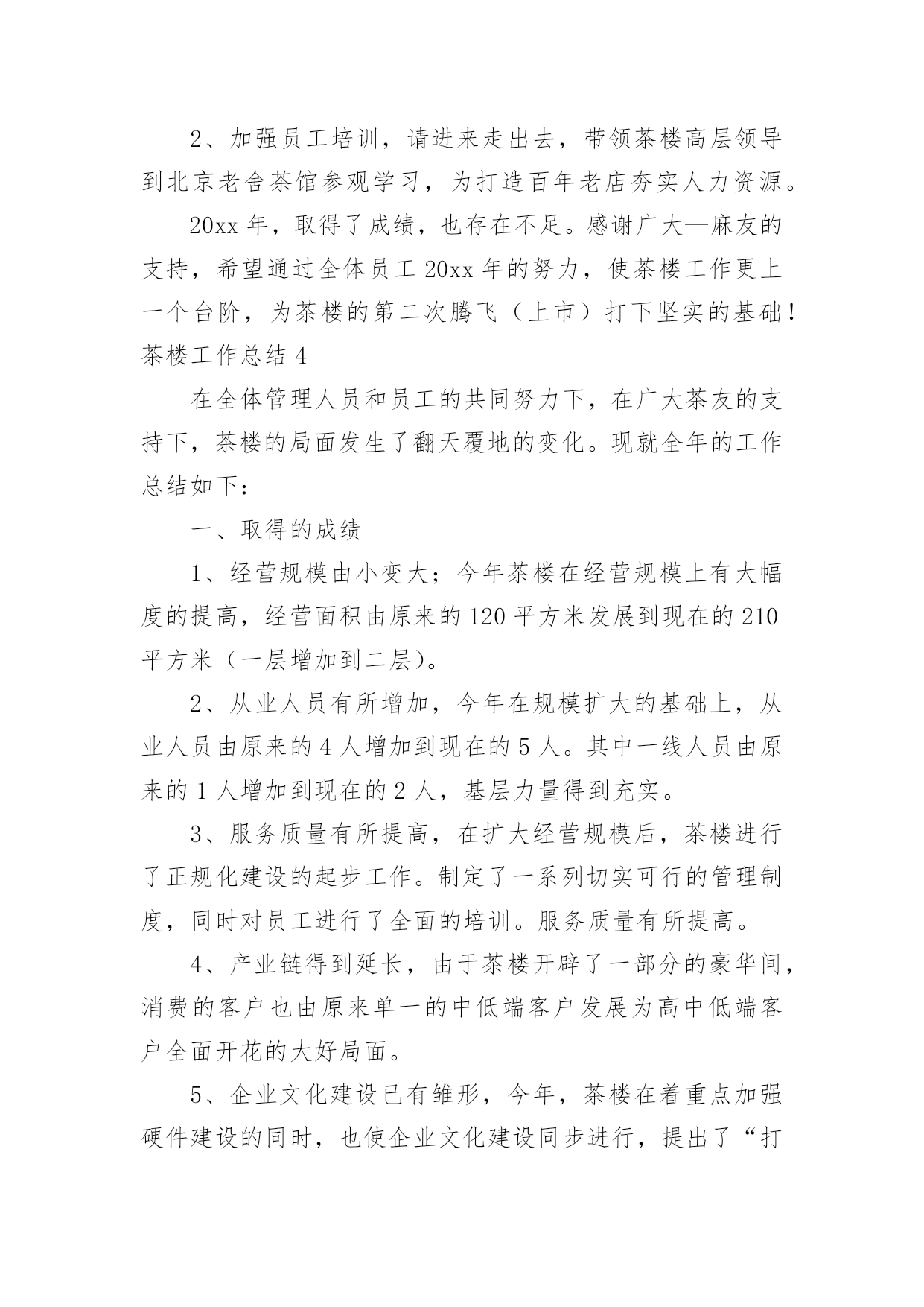 茶楼工作总结茶楼工作总结总结是在某一特定时间段对学习和工作生活或其完成情况,包括取得的成绩、存在的问题及得到的经验和教训加以回顾和分析的书面材料,通过它可以全面地、系统地了解以往的学习和工作情况,因此我们需要回头归纳,写一份总结了。我们该怎么去写总结呢?以下是小编精心整理的茶楼工作总结,欢迎阅读,希望大家能够喜欢。茶楼工作总结1一、抓好规范管理,提高综合接待能力。1.健全管理机构,公司各部门组成的质量管理小组,全年充分发挥了作用,小组既分工,又协作,由上而下,层层落实管理制度,一级对一级负责,完善了我在管理监督上的失职,使管理工作较顺利进行。2.加强协调关系。由于茶室的地理位置以及个人不懂沟通,和各部门的协调工作一直都不是很理想,在发现问题,解决问题上一直得不到更好的完善。每项工作的完成,有赖于各部门之间的协调合作;每周例会上反复强调,出现问题,部门之间不得相互责怪、推搪,要敢于承认错误,多发现对方的优点,搞好协调。3.提高综合接待能力。个人认为茶室主要做的是接待工作,工作的本质上有别与常规的服务员。首先,我们接待的是茶客,其次,我们接待的是领导。茶好、水灵、恰到好处的冲泡技巧,便造就了一杯好茶,再加上有一个品茶的幽雅环境,便不是单纯的饮茶了,而已上升为一门综合的生活艺术。二、增强员工效益意识1.完善培训制度。为了提高员工的服务质量和正确的服务理念,明确了培训的“目的性"、“实用性"、“时间性"。其次,每项培训都依照个人培训效果设置负责人员,再三是制定了培训方案,采取理论与实际相结合,以演练方式,依次进行培训。三、重视食品卫生,抓好安全防火。1.重视食品卫生,健全各项食品卫生岗位责任制,2.抓好安全防火工作,认真贯彻安全第一,预防为主的方针,制定安全防火制度,完善安全防火措施,并进行防火器材实操培训。四、存在的问题:1.员工的积极性不高,服务的理念不明确。2.专业知识的不成熟。3.管理效果不明显。20xx年为让茶楼创造更好的业绩,在此将做出以下工作计划:1.提高专业技能技巧的培训。2.抓好员工的精神面貌管理。3.加强规范管理,提高茶室的卫生监督管理水平和服务质量。4.多开展员工技能考核活动,增加员工积极性。5.规划一个小区域,让喜欢自己泡茶,享受泡茶乐趣的人DIY,同时有服务员在场,在茶楼放几个书架,书架上有各种各样关于茶和有关于老峨山的文化书籍,如何泡茶,茶的功效等等,还有一些其他的书,杂志,让来这里喝茶的人不仅喝茶,还可以休闲娱乐,放松心情。一、提升个人素质。我将吸取遗憾的教训、收获的经验,脚踏实地,不断学习。在思想上,始终如一的热爱本职工作,关心公司的前途,以公司的利益放在首位。在与同事的相处中,注意加强团结,与同事相处融洽,合作愉快,组成一个团结协作的大家庭。在实际行动中,培养主动意识。勇于承担责任,主动为自己设定工作目标,并不断改进方式和方法。势必在20xx年让茶楼的生意有个新的突破!二、加强管理。1)监督员工的`服务标准、个人的仪容仪表、茶楼的清洁卫生、工作中的纪律。2)熟悉每位服务员,掌握它们的性格特征,关心员工生活。工作上加强管理,培养出精明能干、落落大方的服务员。3)加强对茶楼服务用品,消耗用品及固定资产进行控制和管理4)观察员工的工作能力,进行绩效考评并给予奖惩,鼓励员工为公司创收。6)积极与客人沟通,征求客人反馈意见及建议,保持良好的客户关系三、规范茶楼服务操作流程。使每个茶楼员工熟练掌握服务技能,以便于为游客提供标准化的优质服务。感谢公司领导的重视和栽培,在以后的工作中我会加倍努力,不断学习,不负众望,用心把茶楼经营的更好。望领导给出宝贵意见为谢!茶楼工作总结2今年x月x日今日茶食居至今已有一年的时间了,我从对茶一无所知到现在稍稍能分辨茶叶的品种以及泡发,能分清茶具的运用等,我非常感谢公司给我学习的机会,也感谢领导的赏识,委以重任!由于文化园大的环境影响茶室及饮食行业环境相当严峻,如何搞好茶室经营和如何管理好茶室员工是我目前最为重要的工作,在领导一次次监督、帮助下,我不在逃避问题所在,将努力做好自我本职工作,全面落实以服务为导向、以顾客为中心,在不改变大体的情况下,做好一切准备事项,工作计划如下:一、茶室20xx年收入情况如下实现营业收入xxx元。二、今年完成的主要工作(一)员工相处从零到壹,我用了三个月的时间,员工和茶一样,同样用了三个月去认识、了解,与其说管理不如说是大家一起学习,我们的起步是一样的,或许我比她们可能还要低。也许是因为这样的关系,三个月的相处中几乎没有做任何的管理,所以才会出现11月份的事情。这是我一个人的责任,我没做到一个管理者应该做到的检查、监督。而是任其发展,以自认为的方式去和员工相处。三个月的时间我了解她们的性格,同样认识到了自己所不足的.地方。三个月里,我们共同认识了茶
