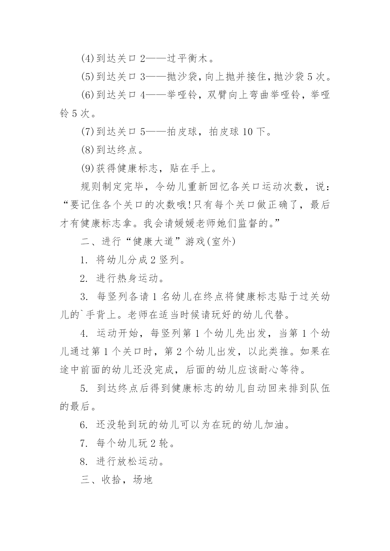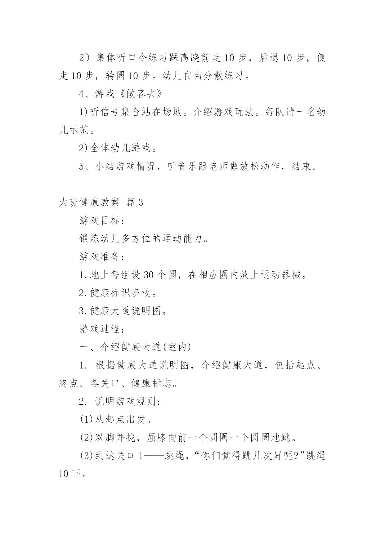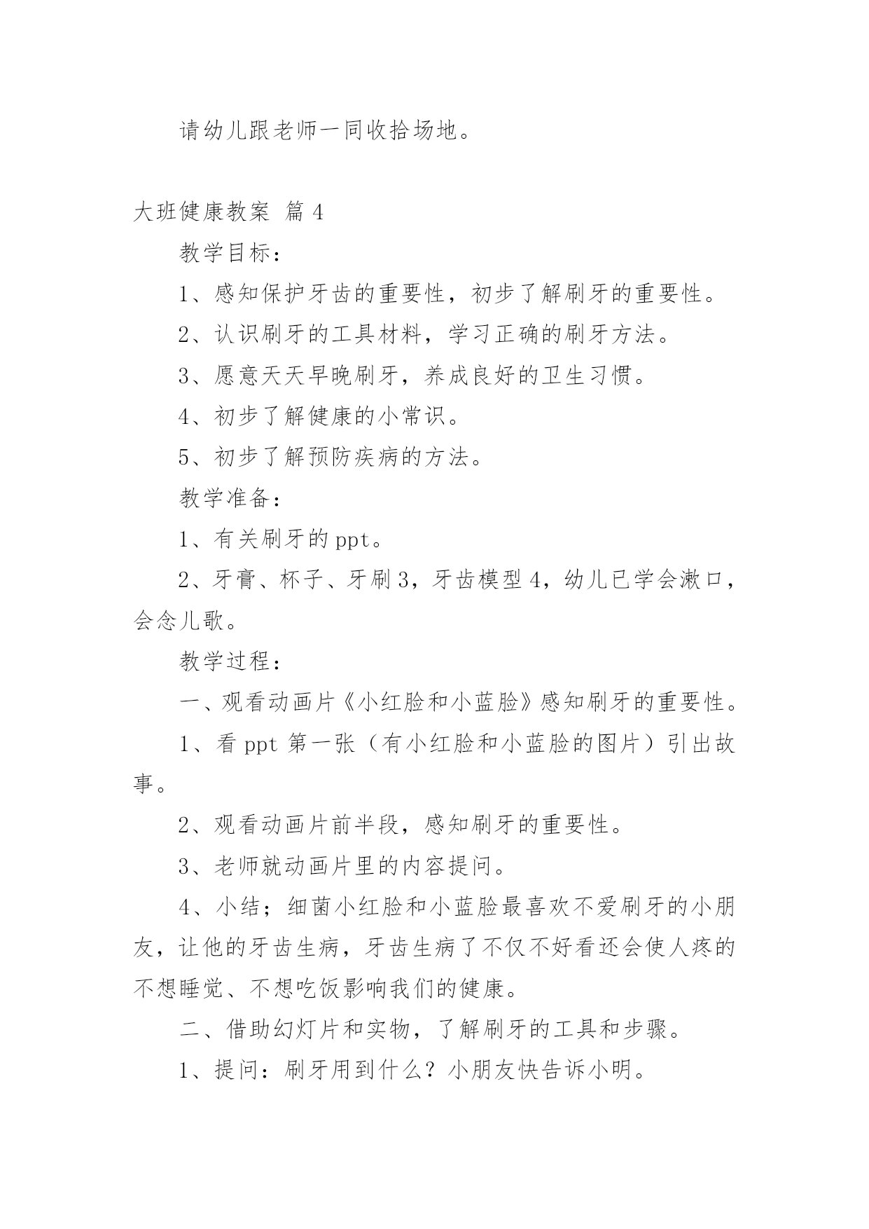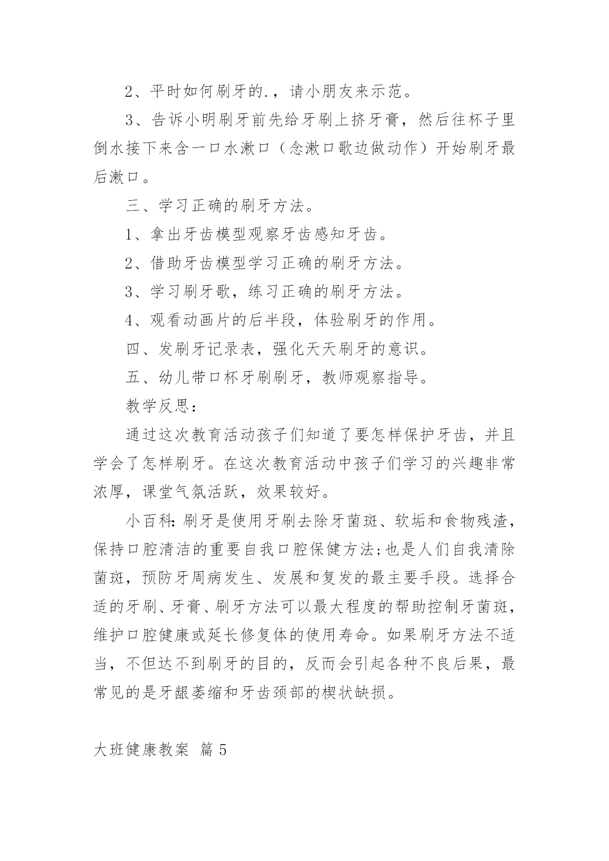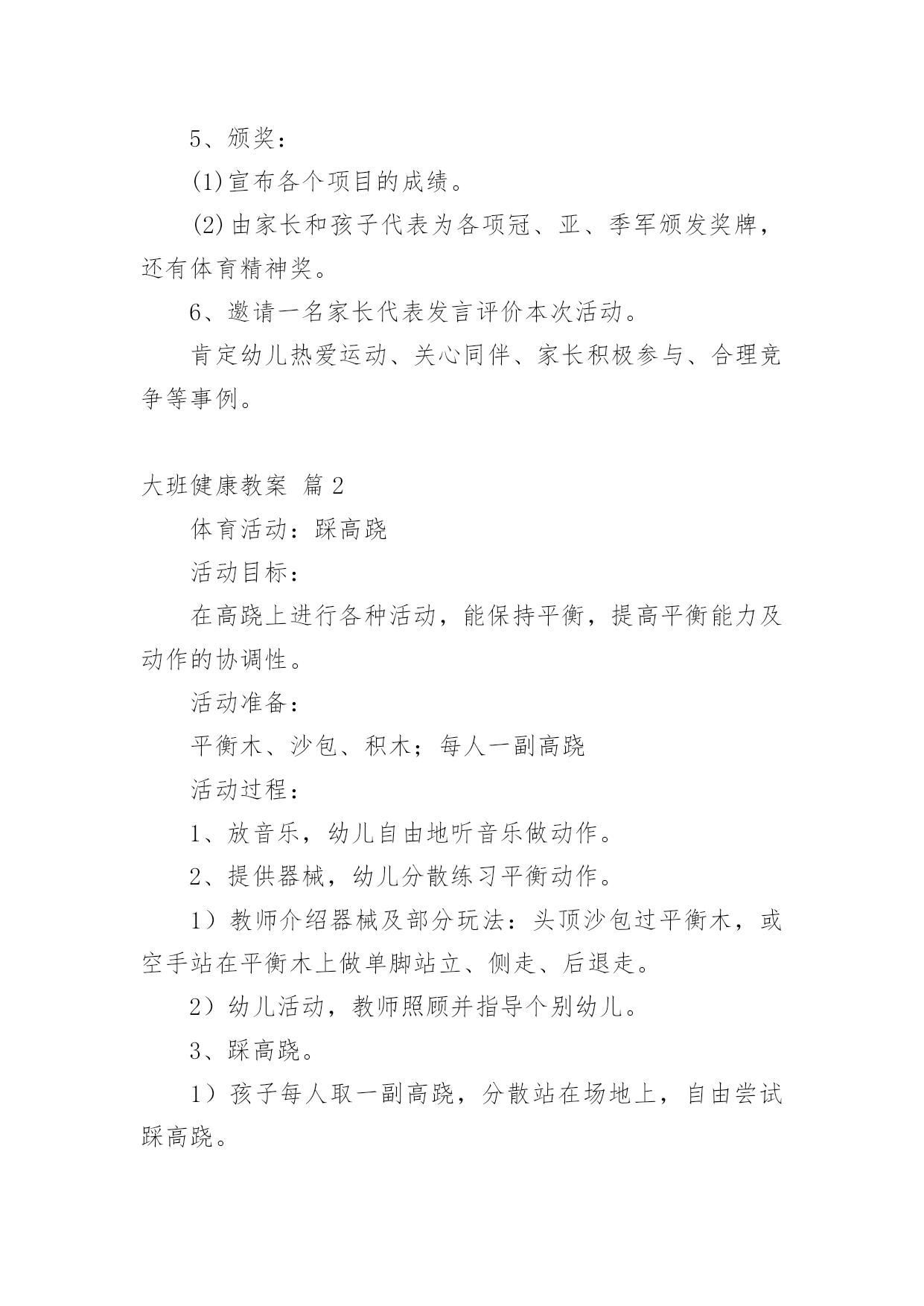 大班健康教案【必备】大班健康教案模板集锦5篇作为一名辛苦耕耘的教育工作者,常常要写一份优秀的教案,借助教案可以恰当地选择和运用教学方法,调动学生学习的积极性。那么大家知道正规的教案是怎么写的吗?下面是小编为大家收集的大班健康教案5篇,欢迎阅读,希望大家能够喜欢。大班健康教案篇1活动目标:1、和爸爸妈妈共同参与运动会,享受亲子活动的快乐。2、能控制自己的情绪,遵守运动规则。活动准备:布置运动场地活动过程:1、幼儿和家长根据项目需要穿上服装,并简单化妆。2、随着运动员进行曲,幼儿和父母一起分组入场。3、支持人宣布运动会开始,并解释比赛规则。鼓励幼儿和家长发扬友谊第一,比赛第二的精神。4、开展各种体育运动项目。(1)为增加活动气氛,可采用新颖的`比赛方式。(2)鼓励幼儿为家长、同伴呐喊助威。5、颁奖:(1)宣布各个项目的成绩。(2)由家长和孩子代表为各项冠、亚、季军颁发奖牌,还有体育精神奖。6、邀请一名家长代表发言评价本次活动。肯定幼儿热爱运动、关心同伴、家长积极参与、合理竞争等事例。大班健康教案篇2体育活动:踩高跷活动目标:在高跷上进行各种活动,能保持平衡,提高平衡能力及动作的协调性。活动准备:平衡木、沙包、积木;每人一副高跷活动过程:1、放音乐,幼儿自由地听音乐做动作。2、提供器械,幼儿分散练习平衡动作。1)教师介绍器械及部分玩法:头顶沙包过平衡木,或空手站在平衡木上做单脚站立、侧走、后退走。2)幼儿活动,教师照顾并指导个别幼儿。3、踩高跷。1)孩子每人取一副高跷,分散站在场地上,自由尝试踩高跷。2)集体听口令练习踩高跷前走10步,后退10步,侧走10步,转圈10步。幼儿自由分散练习。4、游戏《做客去》1)听信号集合站在场地。介绍游戏玩法。每队请一名幼儿示范。2)全体幼儿游戏。5、小结游戏情况,听音乐跟老师做放松动作,结束。大班健康教案篇3游戏目标:锻炼幼儿多方位的运动能力。游戏准备:1.地上每组设30个圈,在相应圈内放上运动器械。2.健康标识多枚。3.健康大道说明图。游戏过程:一、介绍健康大道(室内)1.根据健康大道说明图,介绍健康大道,包括起点、终点、各关口、健康标志。2.说明游戏规则:(1)从起点出发。(2)双脚并拢,屈膝向前一个圆圈一个圆圈地跳。(3)到达关口1——跳绳,“你们觉得跳几次好呢?”跳绳10下。(4)到达关口2——过平衡木。(5)到达关口3——抛沙袋,向上抛并接住,抛沙袋5次。(6)到达关口4——举哑铃,双臂向上弯曲举哑铃,举哑铃5次。(7)到达关口5——拍皮球,拍皮球10下。(8)到达终点。(9)获得健康标志,贴在手上。规则制定完毕,令幼儿重新回忆各关口运动次数,说:“要记住各个关口的次数哦!只有每个关口做正确了,最后才有健康标志拿。我会请媛媛老师她们监督的。”二、进行“健康大道”游戏(室外)1.将幼儿分成2竖列。2.进行热身运动。3.每竖列各请1名幼儿在终点将健康标志贴于过关幼儿的`手背上。老师在适当时候请玩好的幼儿代替。4.运动开始,每竖列第1个幼儿先出发,当第1个幼儿通过第1个关口时,第2个幼儿出发,以此类推。如果在途中前面的幼儿还没完成,后面的幼儿应该耐心等待。5.到达终点后得到健康标志的幼儿自动回来排到队伍的最后。6.还没轮到玩的幼儿可以为在玩的幼儿加油。7.每个幼儿玩2轮。8.进行放松运动。三、收拾,场地请幼儿跟老师一同收拾场地。大班健康教案篇4教学目标:1、感知保护牙齿的重要性,初步了解刷牙的重要性。2、认识刷牙的工具材料,学习正确的刷牙方法。3、愿意天天早晚刷牙,养成良好的卫生习惯。4、初步了解健康的小常识。5、初步了解预防疾病的方法。教学准备:1、有关刷牙的ppt。2、牙膏、杯子、牙刷3,牙齿模型4,幼儿已学会漱口,会念儿歌。教学过程:一、观看动画片《小红脸和小蓝脸》感知刷牙的重要性。1、看ppt第一张(有小红脸和小蓝脸的图片)引出故事。2、观看动画片前半段,感知刷牙的重要性。3、老师就动画片里的内容提问。4、小结;细菌小红脸和小蓝脸最喜欢不爱刷牙的小朋友,让他的牙齿生病,牙齿生病了不仅不好看还会使人疼的不想睡觉、不想吃饭影响我们的健康。二、借助幻灯片和实物,了解刷牙的工具和步骤。1、提问:刷牙用到什么?小朋友快告诉小明。2、平时如何刷牙的.,请小朋友来示范。3、告诉小明刷牙前先给牙刷上挤牙膏,然后往杯子里倒水接下来含一口水漱口(念漱口歌边做动作)开始刷牙最后漱口。三、学习正确的刷牙方法。1、拿出牙齿模型观察牙齿感知牙齿。2、借助牙齿模型学习正确的刷牙方法。3、学习刷牙歌,练习正确的刷牙方法。4、观看动画片的后半段,体验刷牙的作用。四、发刷牙记录表,强化天天刷牙的意识。五、幼儿带口杯牙刷刷牙,教师观察指导。教学反思:通过这次教育活动孩子们知道了要怎样保护牙齿,并且学会了怎样刷牙。在这次