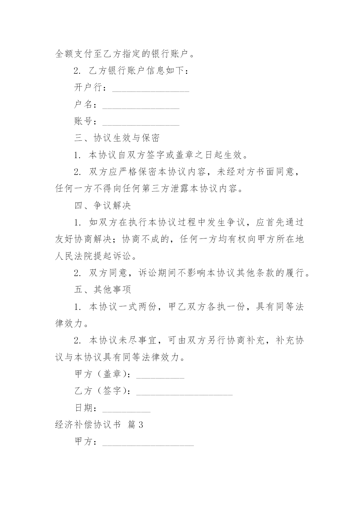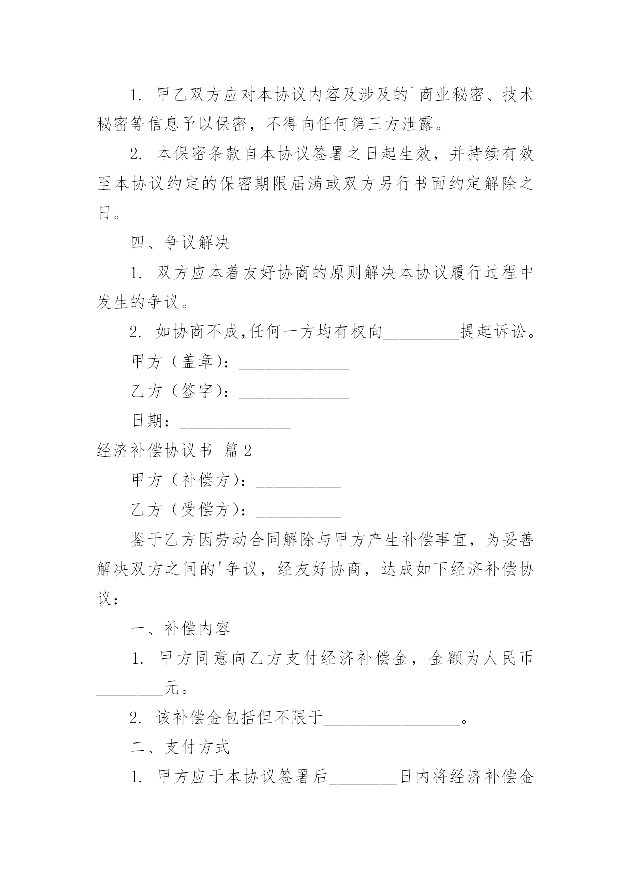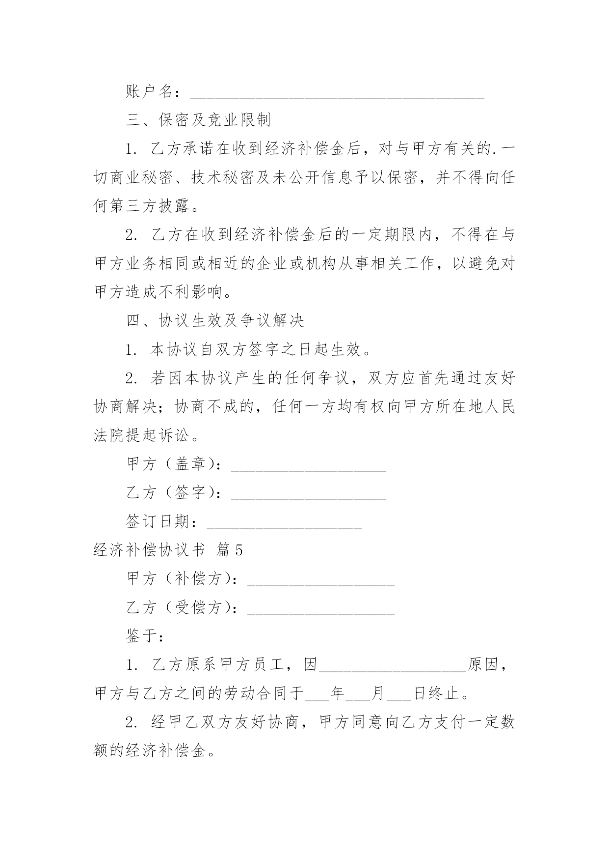 经济补偿协议书[精选]经济补偿协议书在生活中,协议使用的情况越来越多,签订了协议就有了法律依靠。写协议需要注意哪些问题呢?下面是小编精心整理的经济补偿协议书,欢迎阅读,希望大家能够喜欢。经济补偿协议书篇1甲方(补偿方):_____________乙方(受偿方):_____________鉴于:1.甲乙双方之间存在合作关系的终止或解除。2.甲方愿意根据相关法律法规及双方约定,对乙方进行经济补偿。现甲乙双方经友好协商,就经济补偿事宜达成如下协议:一、补偿金额及支付方式1.甲方同意向乙方支付经济补偿金共计人民币_________元。2.支付方式:__________________。3.支付时间:本协议签署后_________日内支付。二、双方权利义务1.甲方应按时足额支付经济补偿金给乙方。2.乙方收到经济补偿金后,应妥善保管并不得向第三方泄露。三、保密条款1.甲乙双方应对本协议内容及涉及的`商业秘密、技术秘密等信息予以保密,不得向任何第三方泄露。2.本保密条款自本协议签署之日起生效,并持续有效至本协议约定的保密期限届满或双方另行书面约定解除之日。四、争议解决1.双方应本着友好协商的原则解决本协议履行过程中发生的争议。2.如协商不成,任何一方均有权向_________提起诉讼。甲方(盖章):_____________乙方(签字):_____________日期:_____________经济补偿协议书篇2甲方(补偿方):__________乙方(受偿方):__________鉴于乙方因劳动合同解除与甲方产生补偿事宜,为妥善解决双方之间的'争议,经友好协商,达成如下经济补偿协议:一、补偿内容1.甲方同意向乙方支付经济补偿金,金额为人民币________元。2.该补偿金包括但不限于________________。二、支付方式1.甲方应于本协议签署后________日内将经济补偿金全额支付至乙方指定的银行账户。2.乙方银行账户信息如下:开户行:________________户名:________________账号:________________三、协议生效与保密1.本协议自双方签字或盖章之日起生效。2.双方应严格保密本协议内容,未经对方书面同意,任何一方不得向任何第三方泄露本协议内容。四、争议解决1.如双方在执行本协议过程中发生争议,应首先通过友好协商解决;协商不成的,任何一方均有权向甲方所在地人民法院提起诉讼。2.双方同意,诉讼期间不影响本协议其他条款的履行。五、其他事项1.本协议一式两份,甲乙双方各执一份,具有同等法律效力。2.本协议未尽事宜,可由双方另行协商补充,补充协议与本协议具有同等法律效力。甲方(盖章):__________乙方(签字):____________________日期:__________经济补偿协议书篇3甲方:___________________乙方:___________________鉴于甲乙双方因劳动合同解除原因,经友好协商,达成如下经济补偿协议:一、补偿金额甲方同意向乙方支付经济补偿金共计人民币__________元。该补偿金包括但不限于乙方在甲方工作期间的工资、奖金、福利、社保等所有应得而未得的各项待遇。二、支付方式甲方应于本协议签署之日起__________日内,将上述补偿金全额支付至乙方指定的银行账户,账户信息如下:户名:____________________账号:____________________开户行:____________________三、保密义务双方同意,对于本协议的内容及其执行过程中所涉及的一切信息、数据、资料等,均负有严格的`保密义务,未经对方书面同意,任何一方不得向任何第三方披露或泄露。四、违约责任如甲方未按本协议约定的时间、金额支付补偿金,乙方有权要求甲方支付逾期付款利息,并有权采取其他合法手段维护自身权益。五、争议解决如因本协议的签订、履行等发生争议,双方应首先通过友好协商解决;协商不成的,任何一方均有权向有管辖权的人民法院提起诉讼。甲方(盖章):___________________乙方(签字):___________________签订日期:___________________经济补偿协议书篇4甲方(补偿方):___________________乙方(受偿方):___________________鉴于:1.甲方与乙方曾存在劳动合同关系,现因__________________原因导致双方关系终止。2.根据相关法律法规,以及双方友好协商,甲方同意向乙方支付一定的经济补偿。现甲、乙双方经协商一致,就经济补偿事宜达成如下协议:一、经济补偿内容及金额1.甲方同意向乙方支付经济补偿金共计_____元。2.上述经济补偿金包括但不限于____________