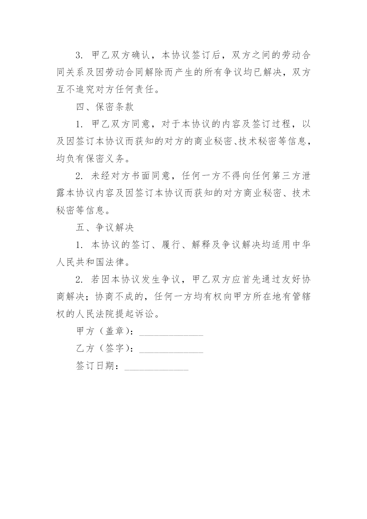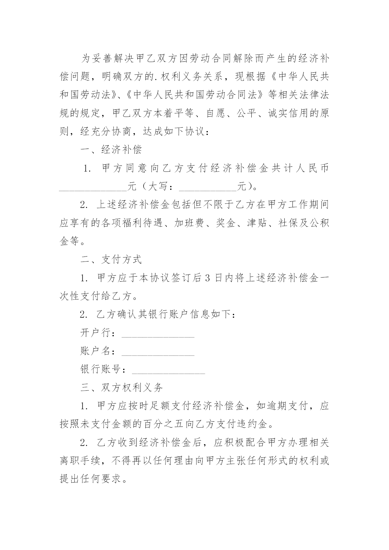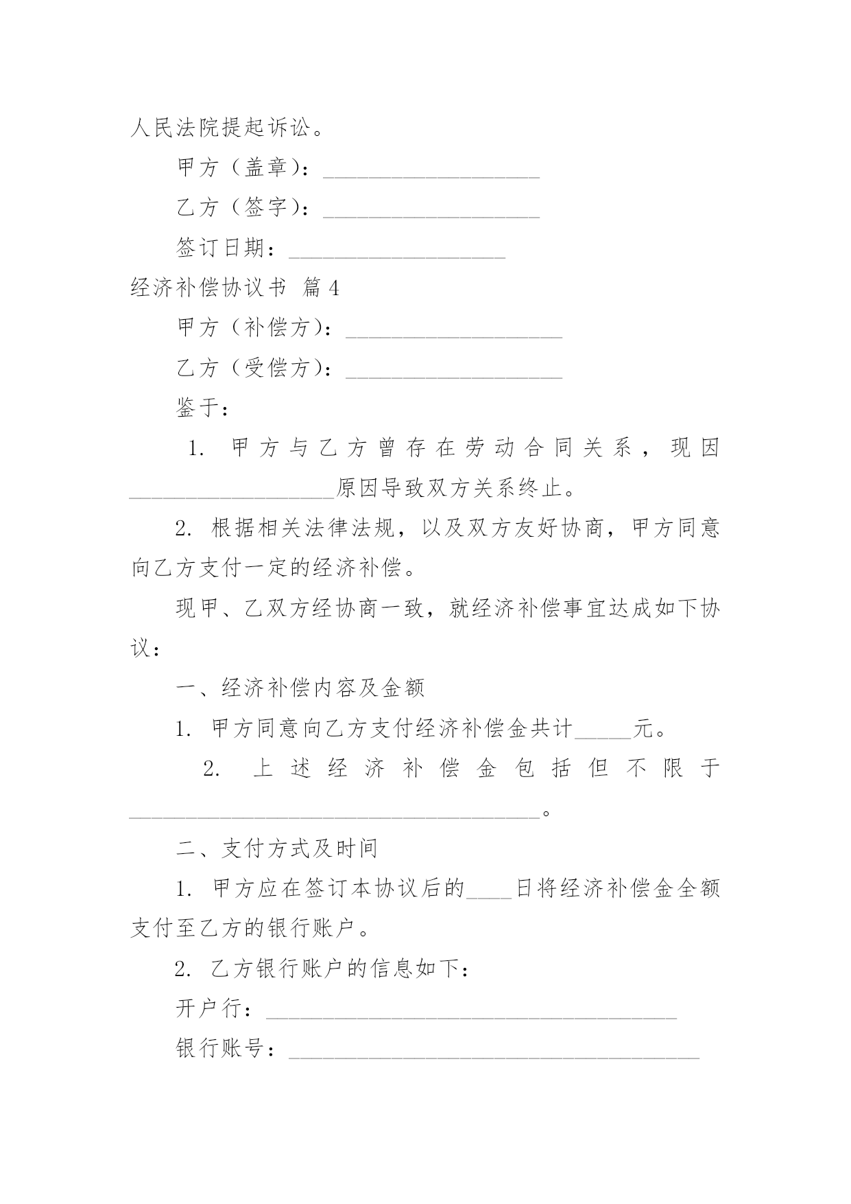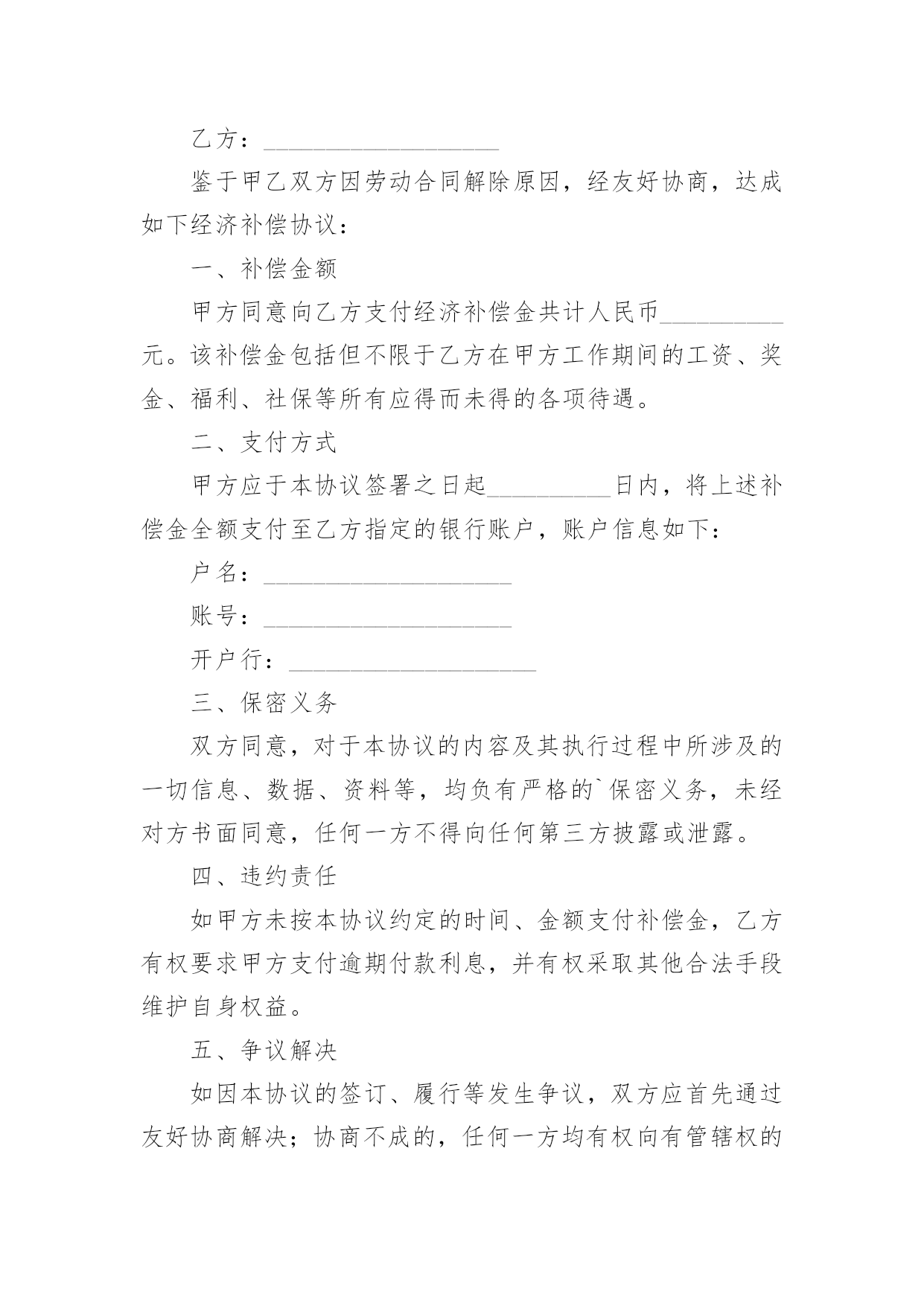 经济补偿协议书[精选]经济补偿协议书在生活中,协议使用的情况越来越多,签订了协议就有了法律依靠。写协议需要注意哪些问题呢?下面是小编精心整理的经济补偿协议书,欢迎阅读,希望大家能够喜欢。经济补偿协议书篇1甲方(补偿方):_____________乙方(受偿方):_____________鉴于:1.甲乙双方之间存在合作关系的终止或解除。2.甲方愿意根据相关法律法规及双方约定,对乙方进行经济补偿。现甲乙双方经友好协商,就经济补偿事宜达成如下协议:一、补偿金额及支付方式1.甲方同意向乙方支付经济补偿金共计人民币_________元。2.支付方式:__________________。3.支付时间:本协议签署后_________日内支付。二、双方权利义务1.甲方应按时足额支付经济补偿金给乙方。2.乙方收到经济补偿金后,应妥善保管并不得向第三方泄露。三、保密条款1.甲乙双方应对本协议内容及涉及的`商业秘密、技术秘密等信息予以保密,不得向任何第三方泄露。2.本保密条款自本协议签署之日起生效,并持续有效至本协议约定的保密期限届满或双方另行书面约定解除之日。四、争议解决1.双方应本着友好协商的原则解决本协议履行过程中发生的争议。2.如协商不成,任何一方均有权向_________提起诉讼。甲方(盖章):_____________乙方(签字):_____________日期:_____________经济补偿协议书篇2甲方(补偿方):__________乙方(受偿方):__________鉴于乙方因劳动合同解除与甲方产生补偿事宜,为妥善解决双方之间的'争议,经友好协商,达成如下经济补偿协议:一、补偿内容1.甲方同意向乙方支付经济补偿金,金额为人民币________元。2.该补偿金包括但不限于________________。二、支付方式1.甲方应于本协议签署后________日内将经济补偿金全额支付至乙方指定的银行账户。2.乙方银行账户信息如下:开户行:________________户名:________________账号:________________三、协议生效与保密1.本协议自双方签字或盖章之日起生效。2.双方应严格保密本协议内容,未经对方书面同意,任何一方不得向任何第三方泄露本协议内容。四、争议解决1.如双方在执行本协议过程中发生争议,应首先通过友好协商解决;协商不成的,任何一方均有权向甲方所在地人民法院提起诉讼。2.双方同意,诉讼期间不影响本协议其他条款的履行。五、其他事项1.本协议一式两份,甲乙双方各执一份,具有同等法律效力。2.本协议未尽事宜,可由双方另行协商补充,补充协议与本协议具有同等法律效力。甲方(盖章):__________乙方(签字):____________________日期:__________经济补偿协议书篇3甲方:___________________乙方:___________________鉴于甲乙双方因劳动合同解除原因,经友好协商,达成如下经济补偿协议:一、补偿金额甲方同意向乙方支付经济补偿金共计人民币__________元。该补偿金包括但不限于乙方在甲方工作期间的工资、奖金、福利、社保等所有应得而未得的各项待遇。二、支付方式甲方应于本协议签署之日起__________日内,将上述补偿金全额支付至乙方指定的银行账户,账户信息如下:户名:____________________账号:____________________开户行:____________________三、保密义务双方同意,对于本协议的内容及其执行过程中所涉及的一切信息、数据、资料等,均负有严格的`保密义务,未经对方书面同意,任何一方不得向任何第三方披露或泄露。四、违约责任如甲方未按本协议约定的时间、金额支付补偿金,乙方有权要求甲方支付逾期付款利息,并有权采取其他合法手段维护自身权益。五、争议解决如因本协议的签订、履行等发生争议,双方应首先通过友好协商解决;协商不成的,任何一方均有权向有管辖权的人民法院提起诉讼。甲方(盖章):___________________乙方(签字):___________________签订日期:___________________经济补偿协议书篇4甲方(补偿方):___________________乙方(受偿方):___________________鉴于:1.甲方与乙方曾存在劳动合同关系,现因__________________原因导致双方关系终止。2.根据相关法律法规,以及双方友好协商,甲方同意向乙方支付一定的经济补偿。现甲、乙双方经协商一致,就经济补偿事宜达成如下协议:一、经济补偿内容及金额1.甲方同意向乙方支付经济补偿金共计_____元。2.上述经济补偿金包括但不限于____________