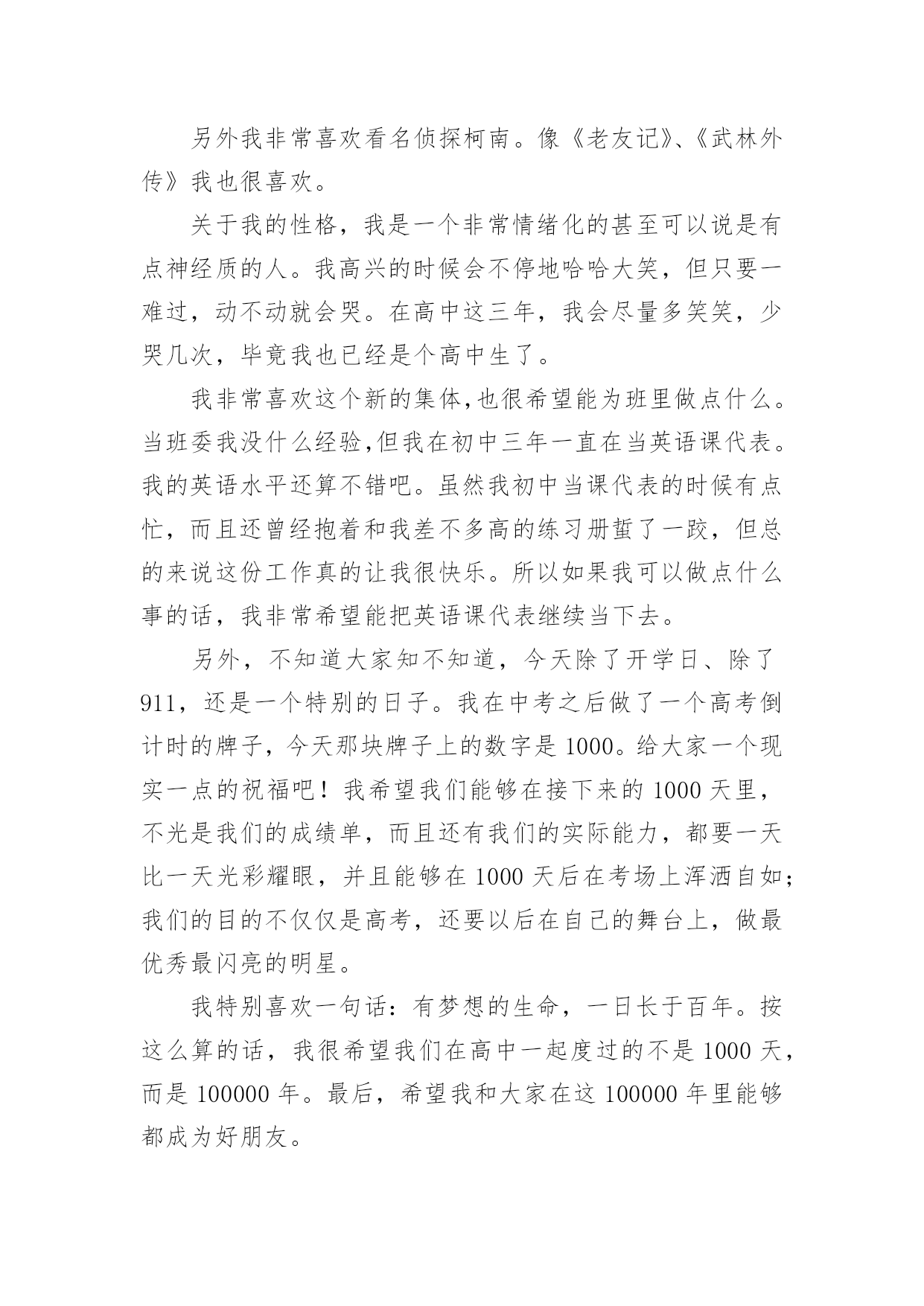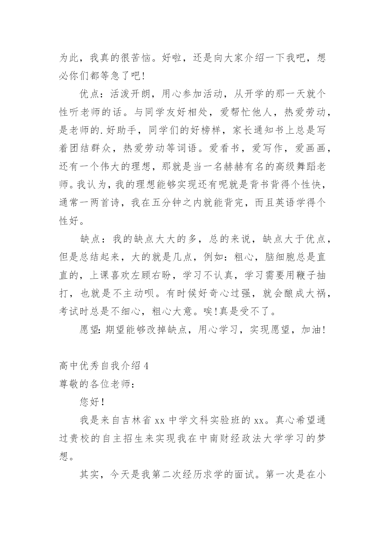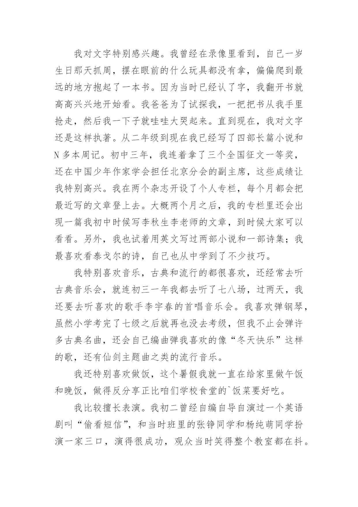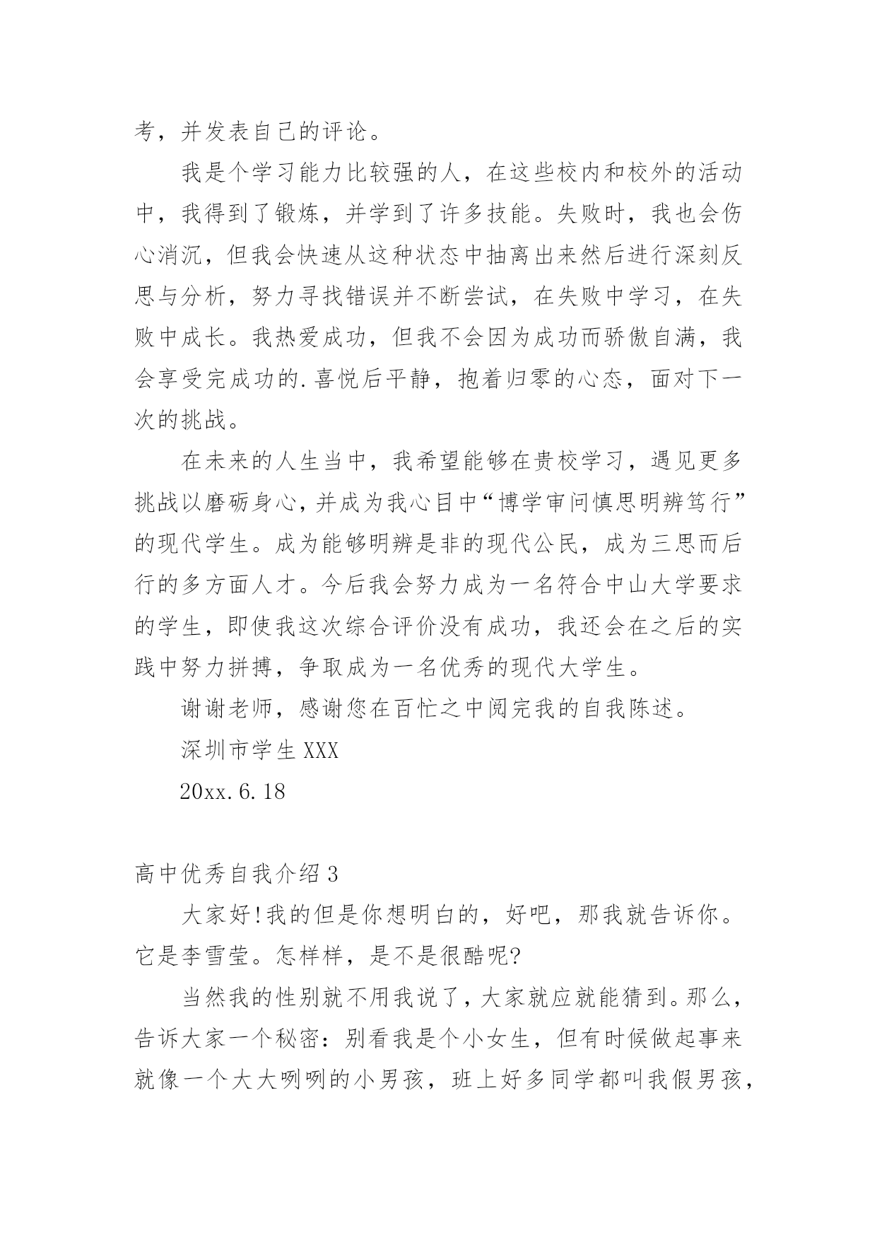 高中优秀自我介绍来到一个新的地方后,我们不得不需要向他人介绍自己,自我介绍有助于自我宣传、自我展示。如何编写一段个性的自我介绍?下面是小编收集整理的高中优秀自我介绍,希望能够帮助到大家。高中优秀自我介绍1我是姜靖宇,是富阳中学20xx届高三毕业生。我为(zhang)人(de)比(hen)较(han)善(suan)良(er)而(qie)且(hai)热(hen)心(hei)。我喜欢交朋友,喜欢帮助别人。我爱好摄影,虽然一点都不懂。我喜欢钢琴,即使只会听曲不会弹。这次志愿活动,虽然没能和学长学姐一起去青海支教,但自己在这边的工作也同样有意义。这次活动,带给我的.不仅仅是一个充实的暑假,而且也让我学到了不少珍贵的东西。真心希望学长学姐能够把爱带给青海的小盆友,让他们拥有此生最难以忘怀的回忆。高中优秀自我介绍2您好,我是XXX,是来自深圳市中学的高三毕业生。很高兴有机会在此进行自我介绍。非常感谢您们能在百忙之中阅览我的个人陈述。首先,我参与此次综合评价一方面是因为我对贵校“博学审问慎思明辨笃行”的校训深有感触。贵校的校训正体现了当今大学生应当具备的素养——全面发展。这种素养是我一直所追求的,而我也希望在拥有这种氛围的贵校中成为全面发展的现代大学生。另一方面,贵校的校园中充满了自由与博学,厚重的历史兼容现代之气息,让我坚信,在这里我可以舒展我的才华,激发自我潜能,并成为社会所需的栋梁之材。我出生于深圳的一个普通家庭,父母从外地到深圳打拼,从小父母就要求我要严守本分并积极进取,这样的家庭环境造就了我乐观严谨的性格。我是一个性格积极阳光的人,回顾过去的高中三年,我对待生活与学习都十分乐观、上进。在母校,我广交益友,互帮互助,遵守校规校纪,积极参与学校活动如学长团,校级汇演等等;同时热爱学习,在成绩方面追求进步,在高三的模考中不肯放弃,一次次进步。在校外,我认真完成社会实践。对新鲜事物进行探索求知。其次,我追求全面发展,注重培养组织能力。在高中三年,我担任班级学习委员和数学课代表,积极组织班内活动,融洽师生关系。我热爱羽毛球和跳绳,还在学校运动会中的团体长绳项目中获得名次;我爱好唱歌,认真训练,学到很多歌唱技巧,参与学校合唱团,并参与市级比赛获得奖项;我多次参与学校互帮互助活动,如加入学校学长团,帮助高一新生快速适应高中生活;我还乐于关注时事新闻,每当看见一则新闻时,我会仔细思考,从当事人与旁观者的角度思考,并发表自己的评论。我是个学习能力比较强的人,在这些校内和校外的活动中,我得到了锻炼,并学到了许多技能。失败时,我也会伤心消沉,但我会快速从这种状态中抽离出来然后进行深刻反思与分析,努力寻找错误并不断尝试,在失败中学习,在失败中成长。我热爱成功,但我不会因为成功而骄傲自满,我会享受完成功的.喜悦后平静,抱着归零的心态,面对下一次的挑战。在未来的人生当中,我希望能够在贵校学习,遇见更多挑战以磨砺身心,并成为我心目中“博学审问慎思明辨笃行”的现代学生。成为能够明辨是非的现代公民,成为三思而后行的多方面人才。今后我会努力成为一名符合中山大学要求的学生,即使我这次综合评价没有成功,我还会在之后的实践中努力拼搏,争取成为一名优秀的现代大学生。谢谢老师,感谢您在百忙之中阅完我的自我陈述。深圳市学生XXX20xx.6.18高中优秀自我介绍3大家好!我的但是你想明白的,好吧,那我就告诉你。它是李雪莹。怎样样,是不是很酷呢?当然我的性别就不用我说了,大家就应就能猜到。那么,告诉大家一个秘密:别看我是个小女生,但有时候做起事来就像一个大大咧咧的小男孩,班上好多同学都叫我假男孩,为此,我真的很苦恼。好啦,还是向大家介绍一下我吧,想必你们都等急了吧!优点:活泼开朗,用心参加活动,从开学的那一天就个性听老师的话。与同学友好相处,爱帮忙他人,热爱劳动,是老师的.好助手,同学们的好榜样,家长通知书上总是写着团结群众,热爱劳动等词语。爱看书,爱写作,爱画画,还有一个伟大的理想,那就是当一名赫赫有名的高级舞蹈老师。我认为,我的理想能够实现还有呢就是背书背得个性快,通常一两首诗,我在五分钟之内就能背完,而且英语学得个性好。缺点:我的缺点大大的多,总的来说,缺点大于优点,但是总结起来,大的就是几点,例如:粗心,脑细胞总是直直的,上课喜欢左顾右盼,学习不认真,学习需要用鞭子抽打,也就是不主动呗。有时候好奇心过强,就会酿成大祸,考试时总是不细心,粗心大意。唉!真是受不了。愿望:期望能够改掉缺点,用心学习,实现愿望,加油!高中优秀自我介绍4尊敬的各位老师:您好!我是来自吉林省xx中学文科实验班的xx。真心希望通过贵校的自主招生来实现我在中南财经政法大学学习的梦想。其实,今天是我第二次经历求学的面试。第一次是在小学毕业的时候,荣获了长春市优秀学生称号的我参加了市重点中学的选拔,最后以