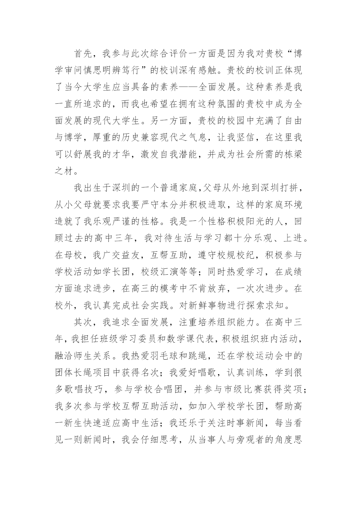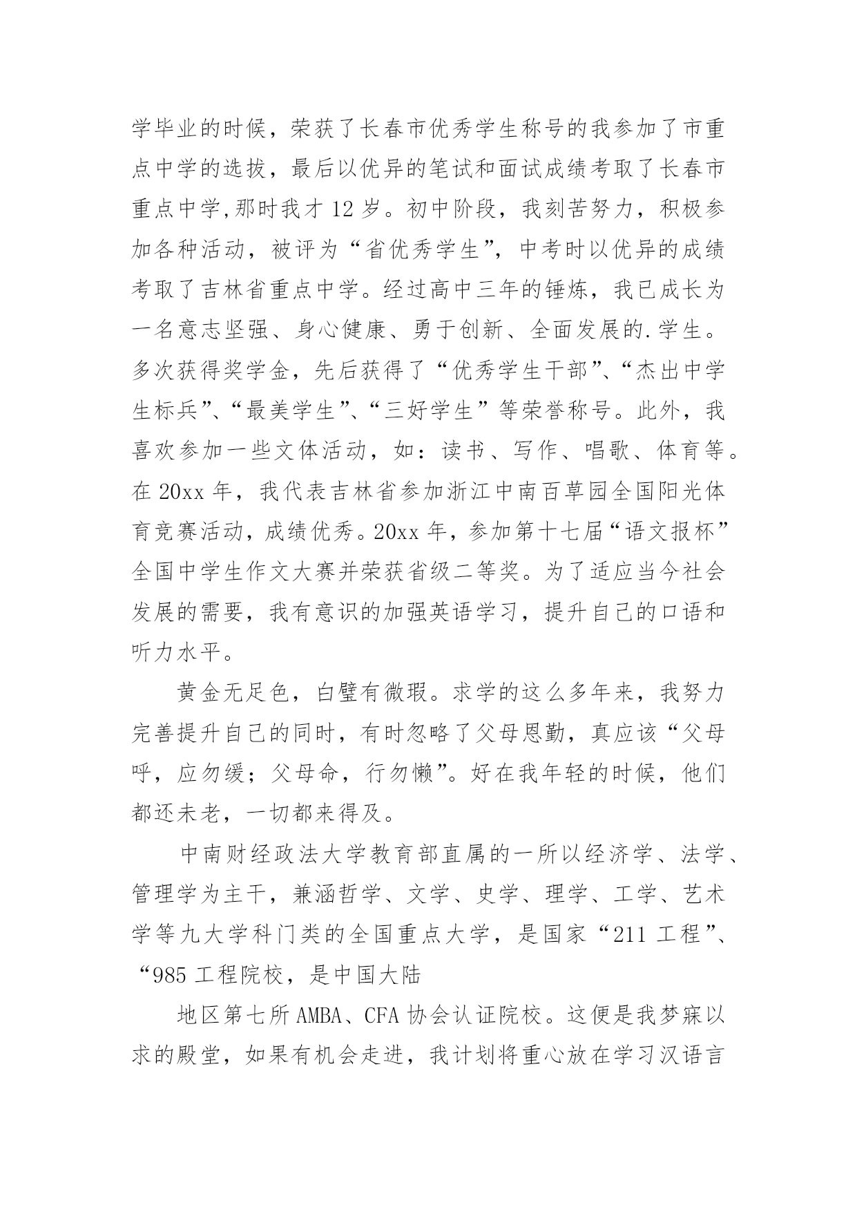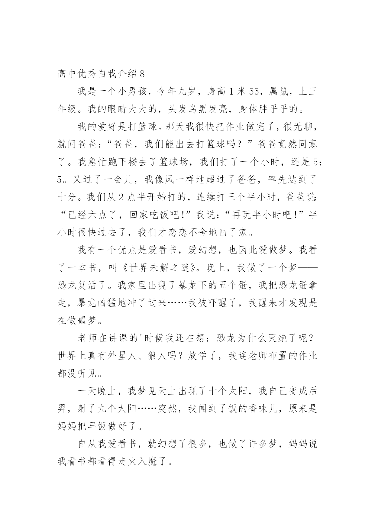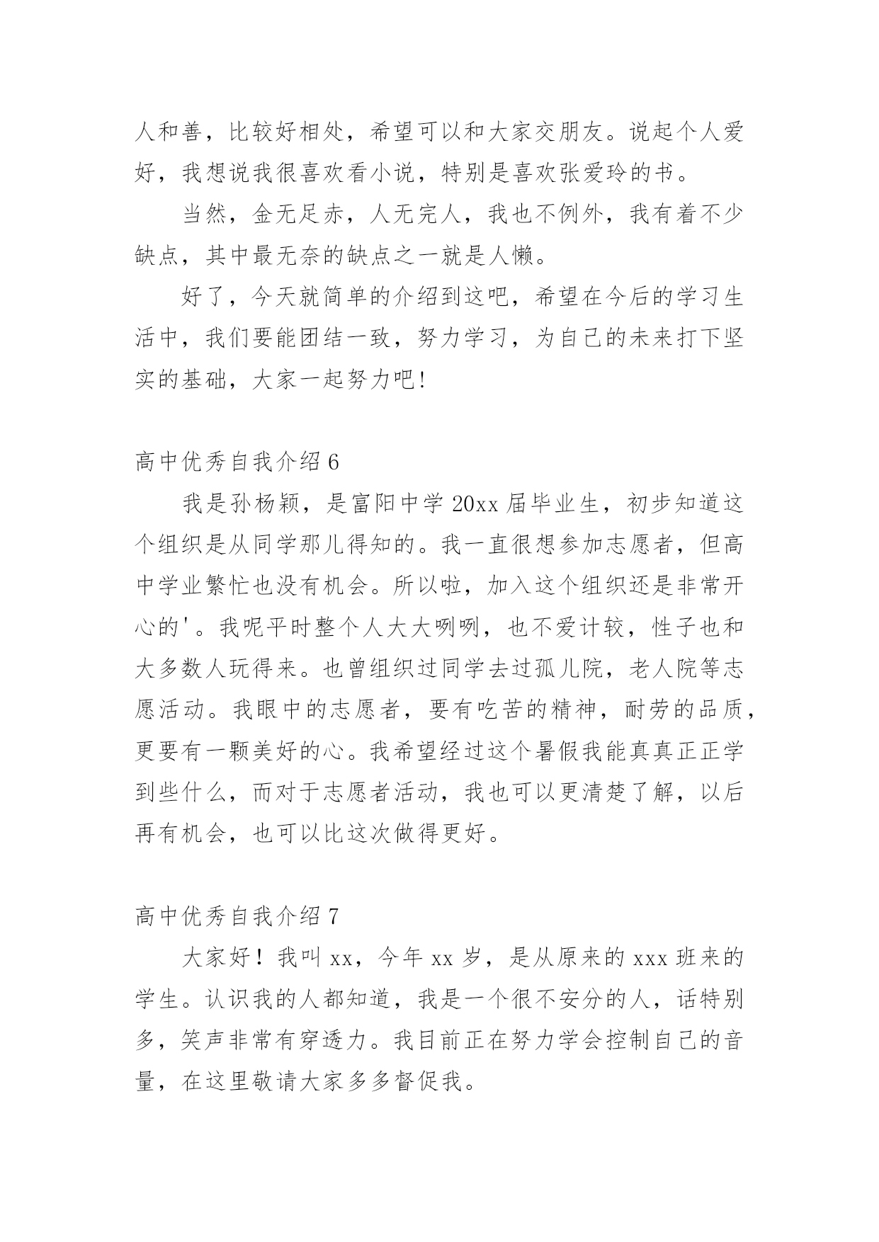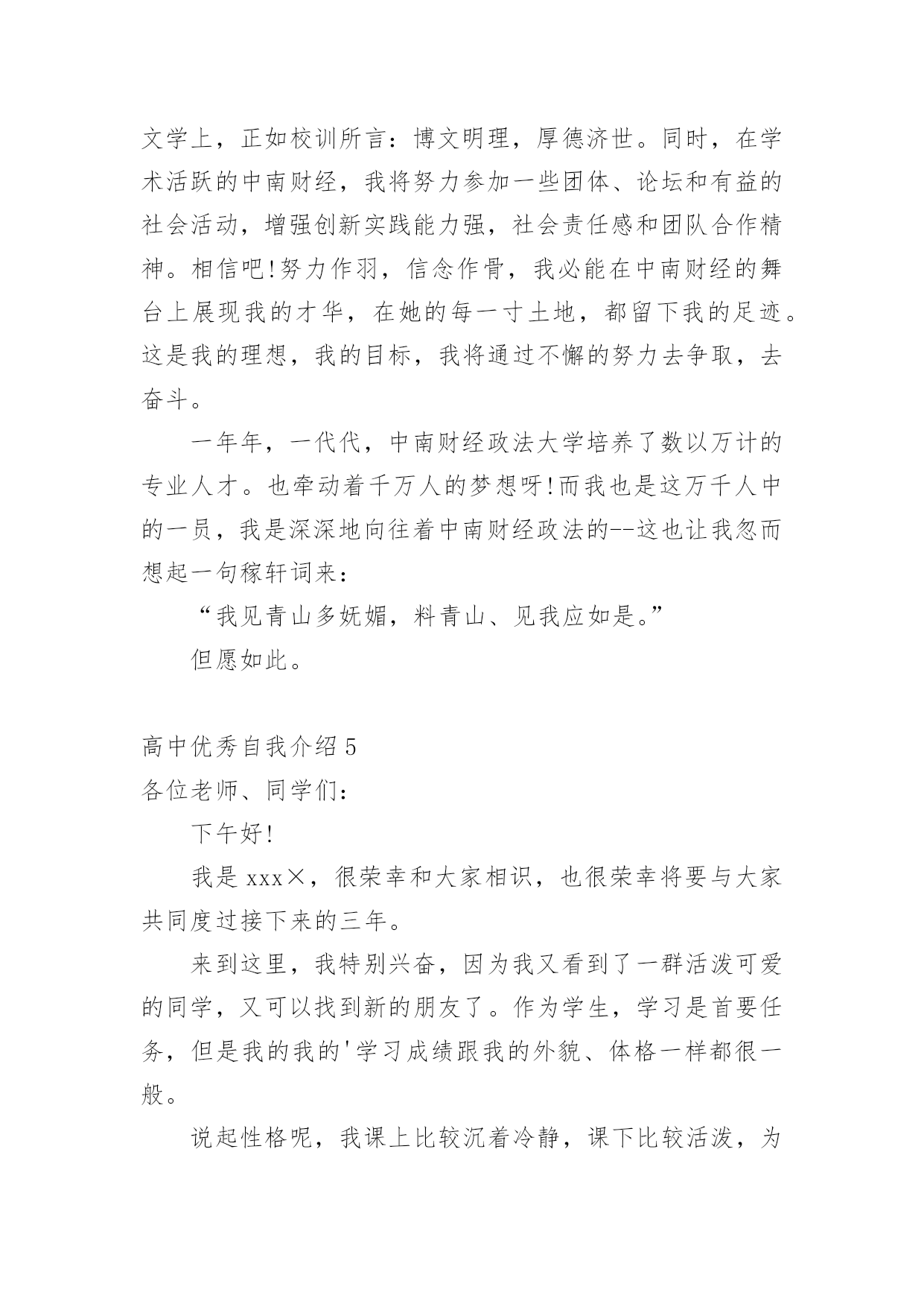 高中优秀自我介绍来到一个新的地方后,我们不得不需要向他人介绍自己,自我介绍有助于自我宣传、自我展示。如何编写一段个性的自我介绍?下面是小编收集整理的高中优秀自我介绍,希望能够帮助到大家。高中优秀自我介绍1我是姜靖宇,是富阳中学20xx届高三毕业生。我为(zhang)人(de)比(hen)较(han)善(suan)良(er)而(qie)且(hai)热(hen)心(hei)。我喜欢交朋友,喜欢帮助别人。我爱好摄影,虽然一点都不懂。我喜欢钢琴,即使只会听曲不会弹。这次志愿活动,虽然没能和学长学姐一起去青海支教,但自己在这边的工作也同样有意义。这次活动,带给我的.不仅仅是一个充实的暑假,而且也让我学到了不少珍贵的东西。真心希望学长学姐能够把爱带给青海的小盆友,让他们拥有此生最难以忘怀的回忆。高中优秀自我介绍2您好,我是XXX,是来自深圳市中学的高三毕业生。很高兴有机会在此进行自我介绍。非常感谢您们能在百忙之中阅览我的个人陈述。首先,我参与此次综合评价一方面是因为我对贵校“博学审问慎思明辨笃行”的校训深有感触。贵校的校训正体现了当今大学生应当具备的素养——全面发展。这种素养是我一直所追求的,而我也希望在拥有这种氛围的贵校中成为全面发展的现代大学生。另一方面,贵校的校园中充满了自由与博学,厚重的历史兼容现代之气息,让我坚信,在这里我可以舒展我的才华,激发自我潜能,并成为社会所需的栋梁之材。我出生于深圳的一个普通家庭,父母从外地到深圳打拼,从小父母就要求我要严守本分并积极进取,这样的家庭环境造就了我乐观严谨的性格。我是一个性格积极阳光的人,回顾过去的高中三年,我对待生活与学习都十分乐观、上进。在母校,我广交益友,互帮互助,遵守校规校纪,积极参与学校活动如学长团,校级汇演等等;同时热爱学习,在成绩方面追求进步,在高三的模考中不肯放弃,一次次进步。在校外,我认真完成社会实践。对新鲜事物进行探索求知。其次,我追求全面发展,注重培养组织能力。在高中三年,我担任班级学习委员和数学课代表,积极组织班内活动,融洽师生关系。我热爱羽毛球和跳绳,还在学校运动会中的团体长绳项目中获得名次;我爱好唱歌,认真训练,学到很多歌唱技巧,参与学校合唱团,并参与市级比赛获得奖项;我多次参与学校互帮互助活动,如加入学校学长团,帮助高一新生快速适应高中生活;我还乐于关注时事新闻,每当看见一则新闻时,我会仔细思考,从当事人与旁观者的角度思考,并发表自己的评论。我是个学习能力比较强的人,在这些校内和校外的活动中,我得到了锻炼,并学到了许多技能。失败时,我也会伤心消沉,但我会快速从这种状态中抽离出来然后进行深刻反思与分析,努力寻找错误并不断尝试,在失败中学习,在失败中成长。我热爱成功,但我不会因为成功而骄傲自满,我会享受完成功的.喜悦后平静,抱着归零的心态,面对下一次的挑战。在未来的人生当中,我希望能够在贵校学习,遇见更多挑战以磨砺身心,并成为我心目中“博学审问慎思明辨笃行”的现代学生。成为能够明辨是非的现代公民,成为三思而后行的多方面人才。今后我会努力成为一名符合中山大学要求的学生,即使我这次综合评价没有成功,我还会在之后的实践中努力拼搏,争取成为一名优秀的现代大学生。谢谢老师,感谢您在百忙之中阅完我的自我陈述。深圳市学生XXX20xx.6.18高中优秀自我介绍3大家好!我的但是你想明白的,好吧,那我就告诉你。它是李雪莹。怎样样,是不是很酷呢?当然我的性别就不用我说了,大家就应就能猜到。那么,告诉大家一个秘密:别看我是个小女生,但有时候做起事来就像一个大大咧咧的小男孩,班上好多同学都叫我假男孩,为此,我真的很苦恼。好啦,还是向大家介绍一下我吧,想必你们都等急了吧!优点:活泼开朗,用心参加活动,从开学的那一天就个性听老师的话。与同学友好相处,爱帮忙他人,热爱劳动,是老师的.好助手,同学们的好榜样,家长通知书上总是写着团结群众,热爱劳动等词语。爱看书,爱写作,爱画画,还有一个伟大的理想,那就是当一名赫赫有名的高级舞蹈老师。我认为,我的理想能够实现还有呢就是背书背得个性快,通常一两首诗,我在五分钟之内就能背完,而且英语学得个性好。缺点:我的缺点大大的多,总的来说,缺点大于优点,但是总结起来,大的就是几点,例如:粗心,脑细胞总是直直的,上课喜欢左顾右盼,学习不认真,学习需要用鞭子抽打,也就是不主动呗。有时候好奇心过强,就会酿成大祸,考试时总是不细心,粗心大意。唉!真是受不了。愿望:期望能够改掉缺点,用心学习,实现愿望,加油!高中优秀自我介绍4尊敬的各位老师:您好!我是来自吉林省xx中学文科实验班的xx。真心希望通过贵校的自主招生来实现我在中南财经政法大学学习的梦想。其实,今天是我第二次经历求学的面试。第一次是在小学毕业的时候,荣获了长春市优秀学生称号的我参加了市重点中学的选拔,最后以