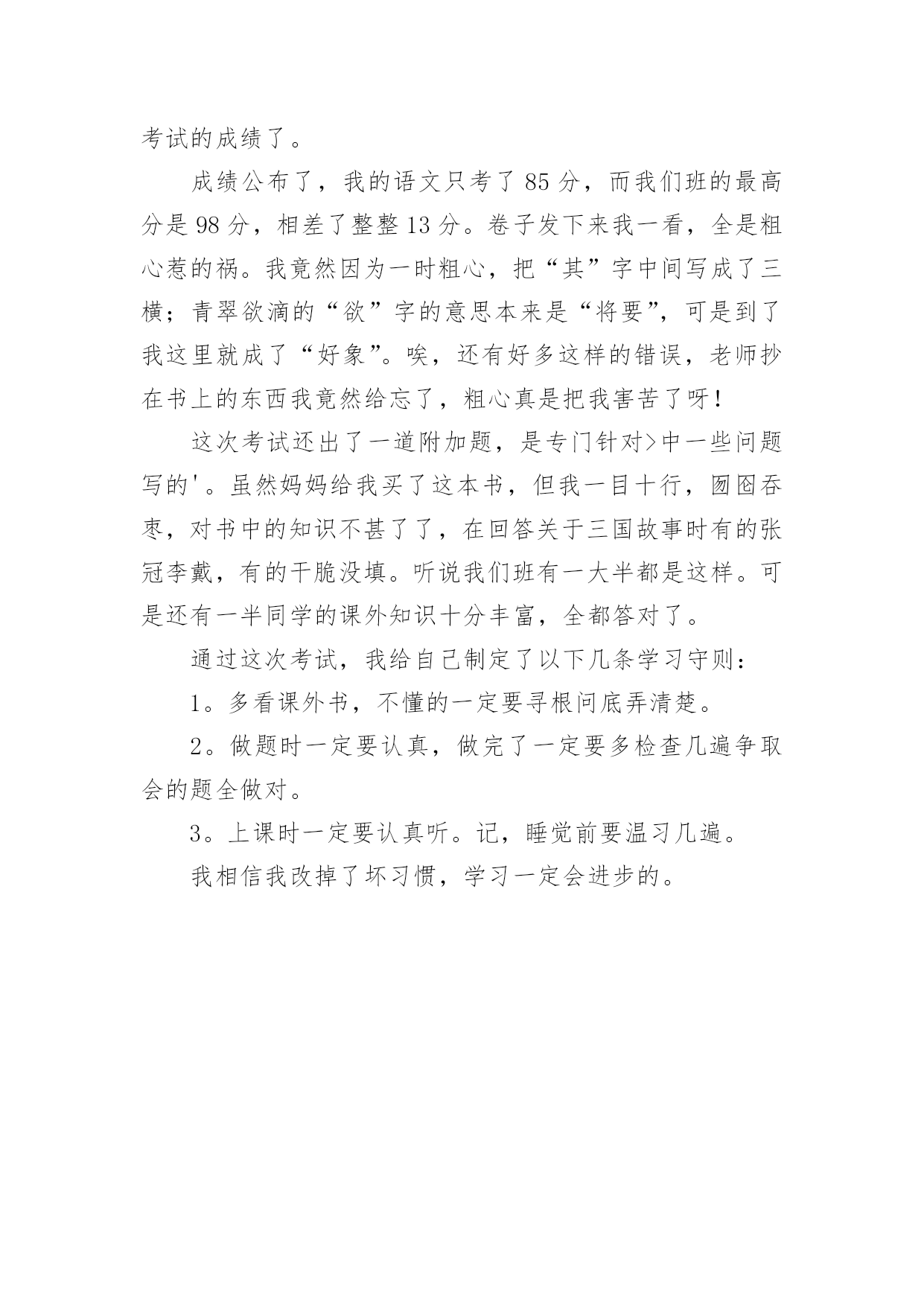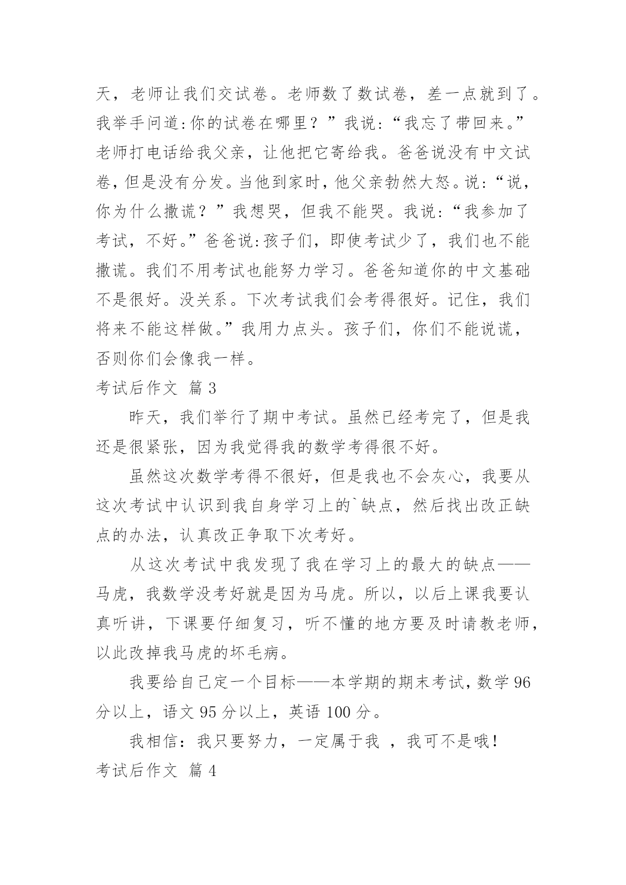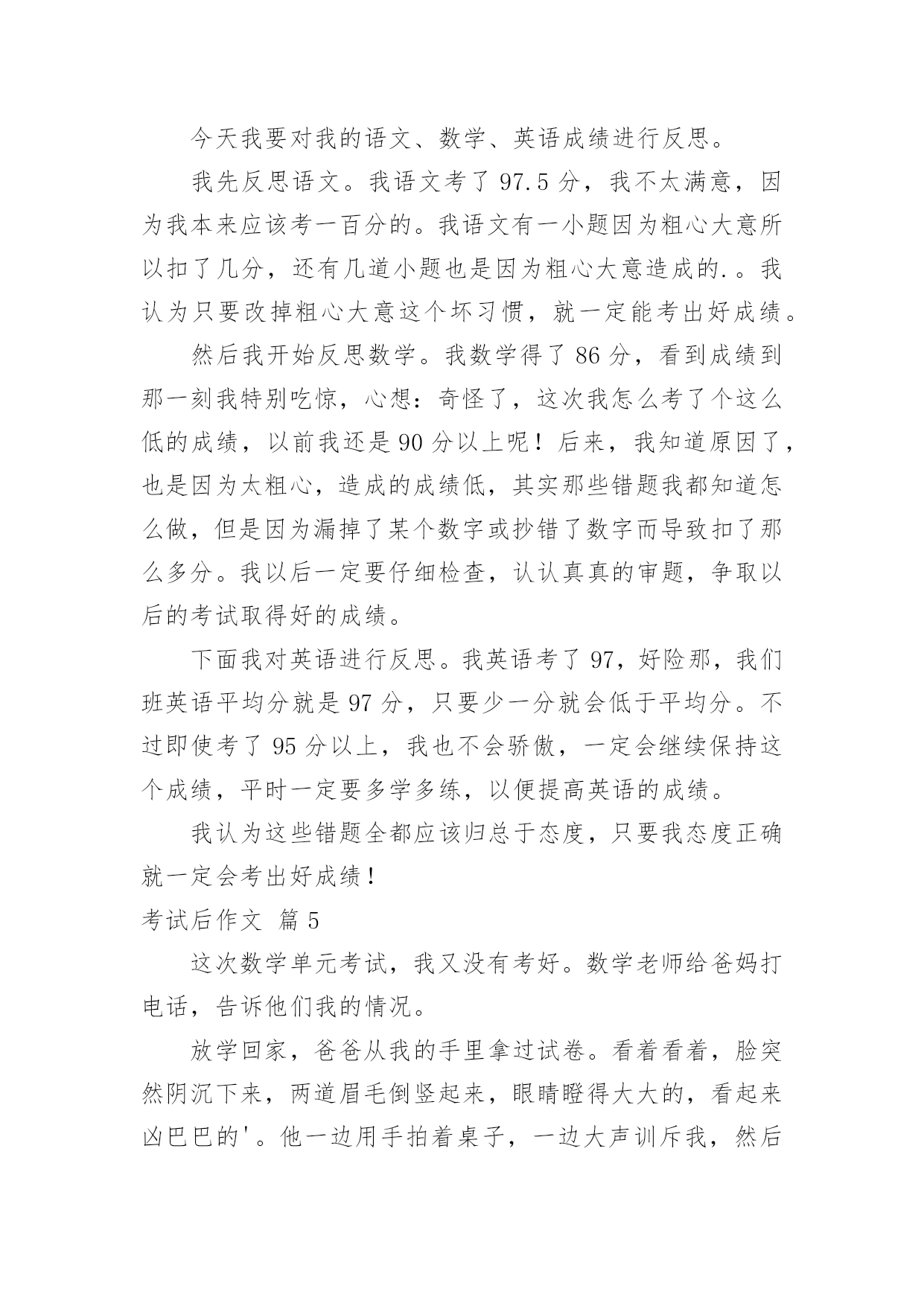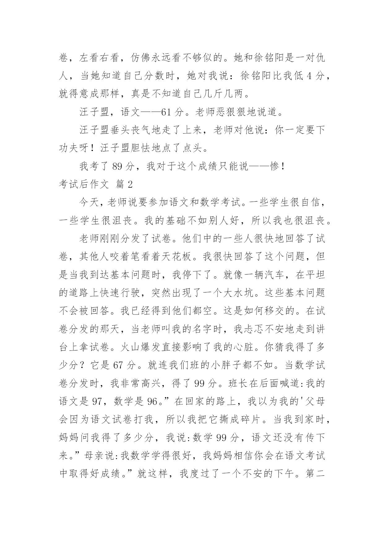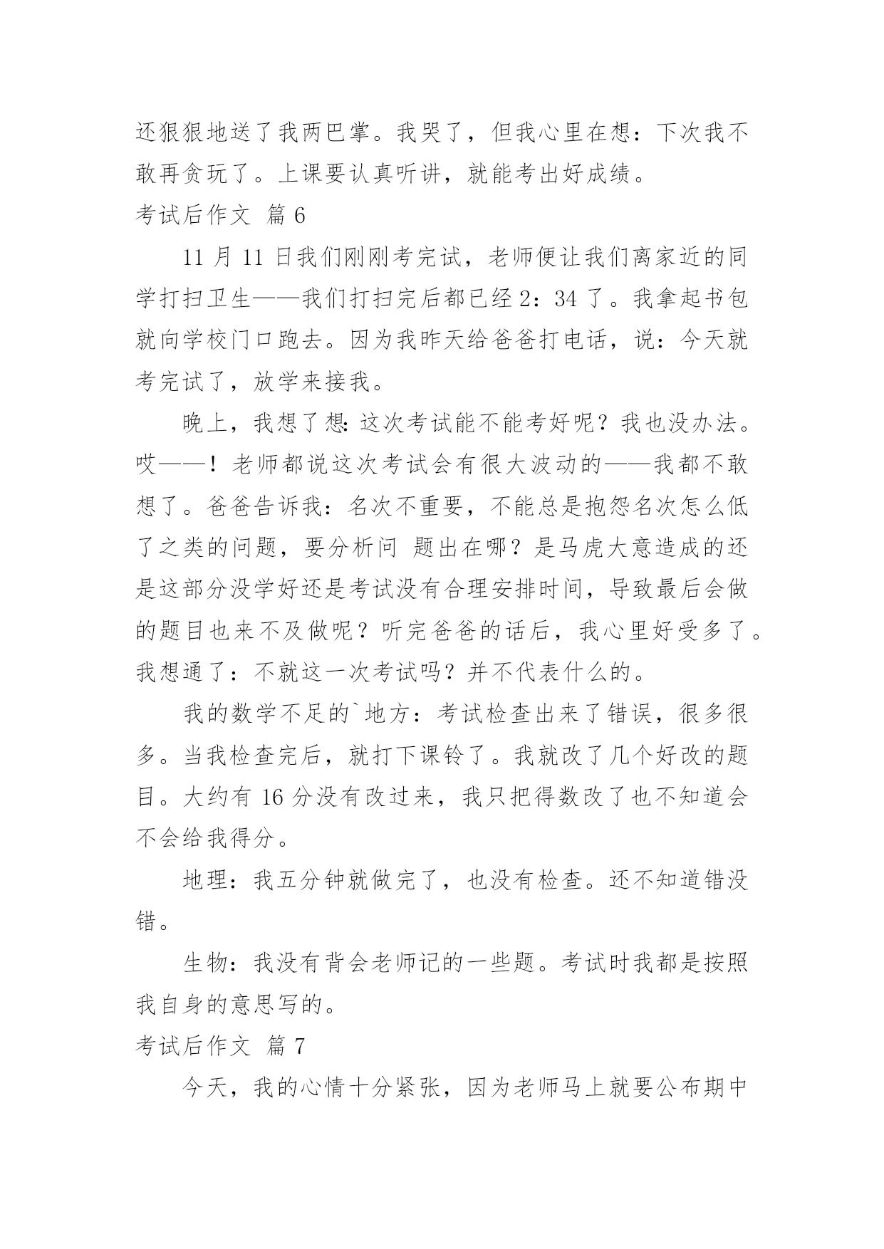 考试后作文考试后作文7篇(经典)无论是在学校还是在社会中,大家都跟作文打过交道吧,作文根据写作时限的不同可以分为限时作文和非限时作文。一篇什么样的作文才能称之为优秀作文呢?下面是小编精心整理的考试后作文7篇,欢迎大家借鉴与参考,希望对大家有所帮助。考试后作文篇1期中考试之后,我们黑暗的日子又开始了。这是为什么呢?因为考试分数就要下来了。徐铭阳,语文94分!老师兴高采烈地报道。只见徐铭阳得意洋洋地走上了讲台,高傲地抬着头,翘着她的下巴,对老师说了声谢谢!又在同学们热烈的掌声之中,踏着轻盈的步子,走上了位置。她到位置上向其他同学炫耀道:你们看看我考了94分!还是语文呦!我想:考了94分就沾沾自喜,难道没有人考得比她高?李若愚一定考得比她高,看她那得瑟那样!李若愚全校最高分——98分!老师扬着欢快的笑容报道。老师的话音刚落,下面就惊讶地叫了起来。李若愚的成绩一直很好,她是一个谦虚的`女孩子,一般对自己考得好已经习以为常,但是这次考得真是十分好,所以她开心地笑了出来,蹦着跳着走上了讲台。她拿到了试卷,左看右看,仿佛永远看不够似的。她和徐铭阳是一对仇人,当她知道自己分数时,她对我说:徐铭阳比我低4分,就得意成那样,真是不知道自己几斤几两。汪子盟,语文——61分。老师恶狠狠地说道。汪子盟垂头丧气地走了上来,老师对他说:你一定要下功夫呀!汪子盟胆怯地点了点头。我考了89分,我对于这个成绩只能说——惨!考试后作文篇2今天,老师说要参加语文和数学考试。一些学生很自信,一些学生很沮丧。我的基础不如别人好,所以我也很沮丧。老师刚刚分发了试卷。他们中的一些人很快地回答了试卷,其他人咬着笔看着天花板。我很快回答了这个问题,但是当我到达基本问题时,我停下了。就像一辆汽车,在平坦的道路上快速行驶,突然出现了一个大水坑。这些基本问题不会被回答。我已经得到他们都空。这是如何移交的。在试卷分发的那天,当老师叫我的名字时,我忐忑不安地走到讲台上拿试卷。火山爆发直接影响了我的心脏。你猜我得了多少分?它是67分。就连我们班的小胖子都不如。当数学试卷分发时,我非常高兴,得了99分。班长在后面喊道:我的语文是97,数学是96。”在回家的路上,我以为我的'父母会因为语文试卷打我,所以我把它撕成碎片。当我到家时,妈妈问我得了多少分,我说:数学99分,语文还没有传下来。”母亲说:我数学学得很好,我妈妈相信你会在语文考试中取得好成绩。”就这样,我度过了一个不安的下午。第二天,老师让我们交试卷。老师数了数试卷,差一点就到了。我举手问道:你的试卷在哪里?”我说:“我忘了带回来。”老师打电话给我父亲,让他把它寄给我。爸爸说没有中文试卷,但是没有分发。当他到家时,他父亲勃然大怒。说:“说,你为什么撒谎?”我想哭,但我不能哭。我说:“我参加了考试,不好。”爸爸说:孩子们,即使考试少了,我们也不能撒谎。我们不用考试也能努力学习。爸爸知道你的中文基础不是很好。没关系。下次考试我们会考得很好。记住,我们将来不能这样做。”我用力点头。孩子们,你们不能说谎,否则你们会像我一样。考试后作文篇3昨天,我们举行了期中考试。虽然已经考完了,但是我还是很紧张,因为我觉得我的数学考得很不好。虽然这次数学考得不很好,但是我也不会灰心,我要从这次考试中认识到我自身学习上的`缺点,然后找出改正缺点的办法,认真改正争取下次考好。从这次考试中我发现了我在学习上的最大的缺点——马虎,我数学没考好就是因为马虎。所以,以后上课我要认真听讲,下课要仔细复习,听不懂的地方要及时请教老师,以此改掉我马虎的坏毛病。我要给自己定一个目标——本学期的期末考试,数学96分以上,语文95分以上,英语100分。我相信:我只要努力,一定属于我,我可不是哦!考试后作文篇4今天我要对我的语文、数学、英语成绩进行反思。我先反思语文。我语文考了97.5分,我不太满意,因为我本来应该考一百分的。我语文有一小题因为粗心大意所以扣了几分,还有几道小题也是因为粗心大意造成的.。我认为只要改掉粗心大意这个坏习惯,就一定能考出好成绩。然后我开始反思数学。我数学得了86分,看到成绩到那一刻我特别吃惊,心想:奇怪了,这次我怎么考了个这么低的成绩,以前我还是90分以上呢!后来,我知道原因了,也是因为太粗心,造成的成绩低,其实那些错题我都知道怎么做,但是因为漏掉了某个数字或抄错了数字而导致扣了那么多分。我以后一定要仔细检查,认认真真的审题,争取以后的考试取得好的成绩。下面我对英语进行反思。我英语考了97,好险那,我们班英语平均分就是97分,只要少一分就会低于平均分。不过即使考了95分以上,我也不会骄傲,一定会继续保持这个成绩,平时一定要多学多练,以便提高英语的成绩。我认为这些错题全都应该归总于态度,只要我态度正确就一定会考出好成绩!考试后作文篇5这次数学单元考试,我又没