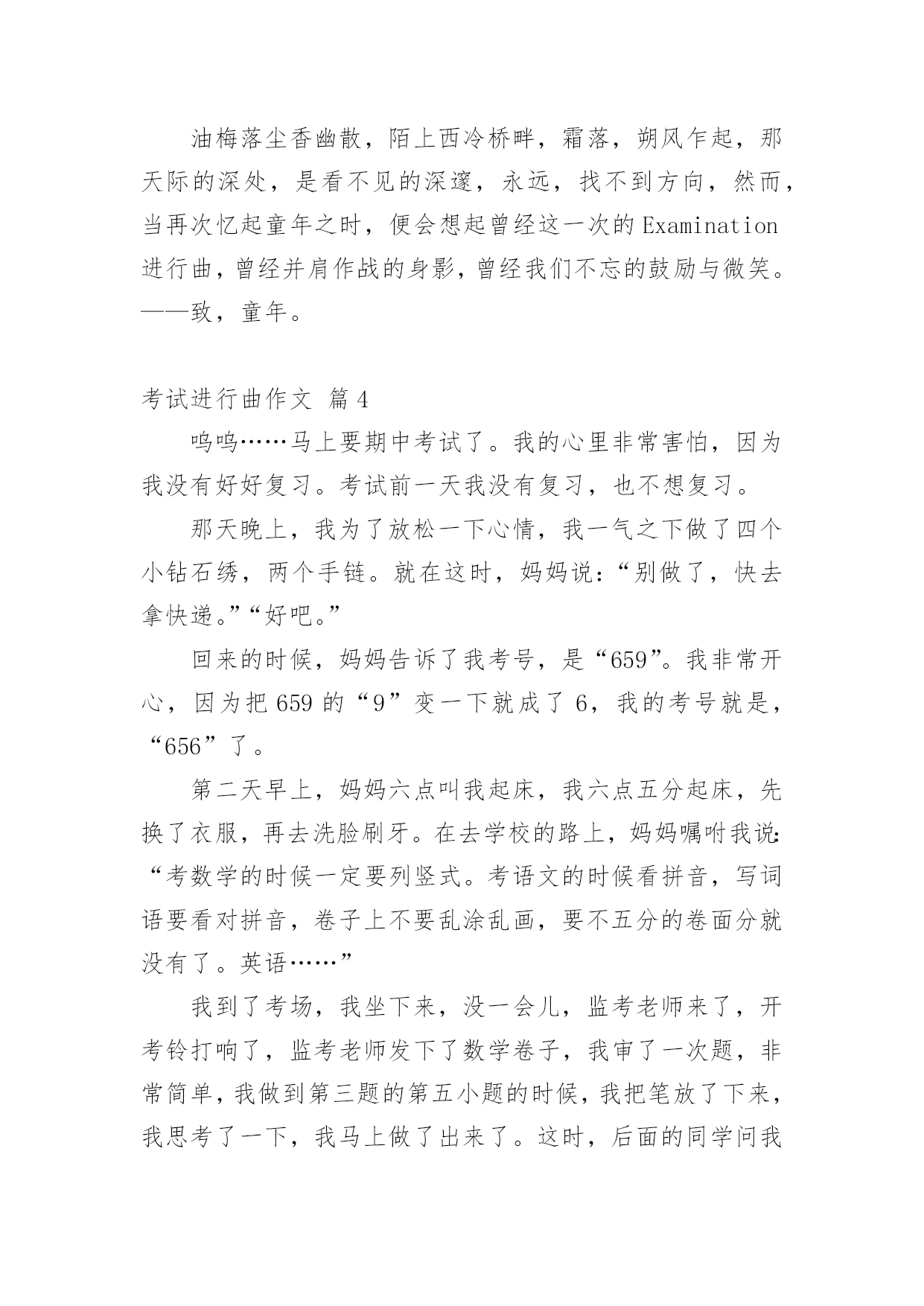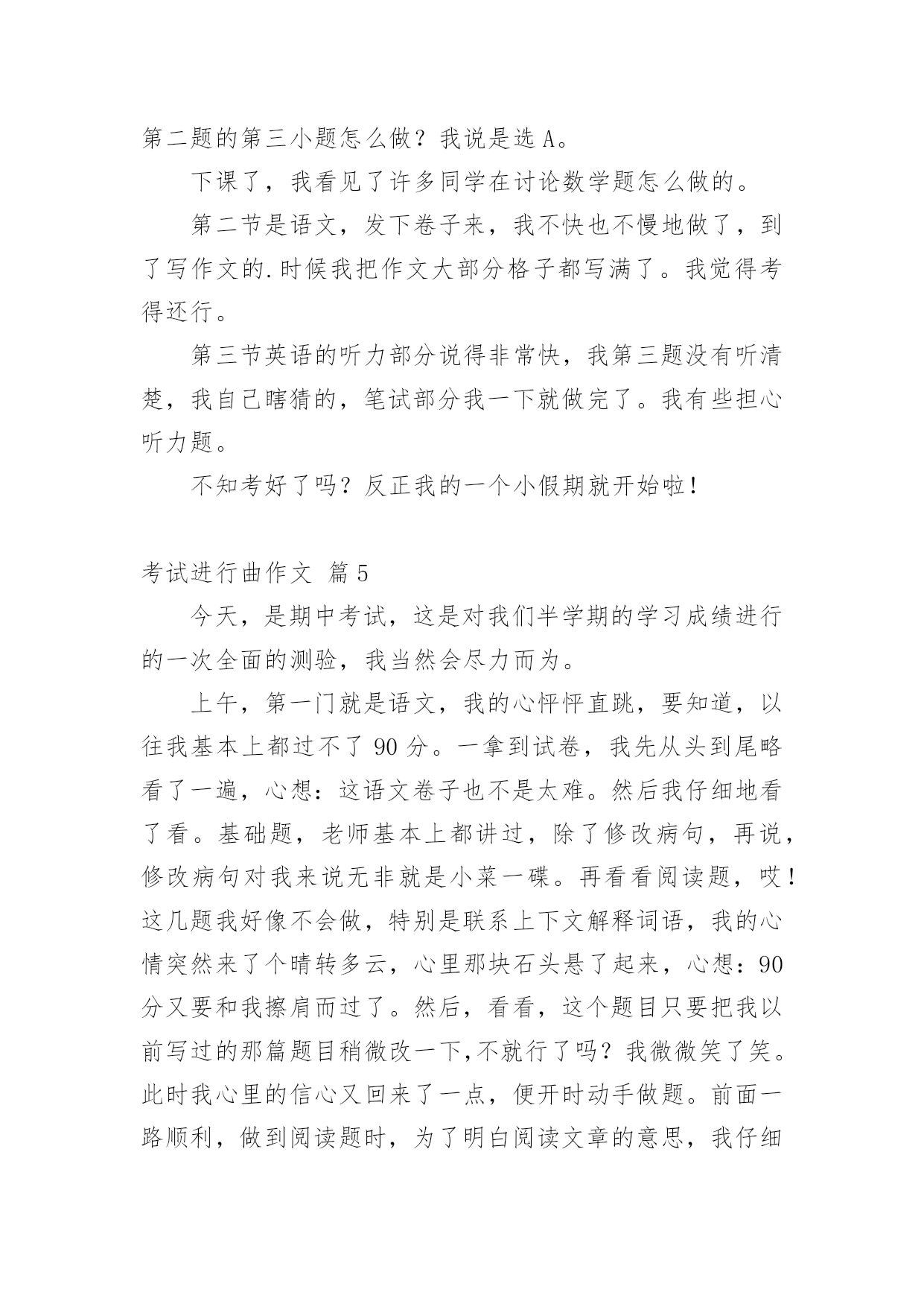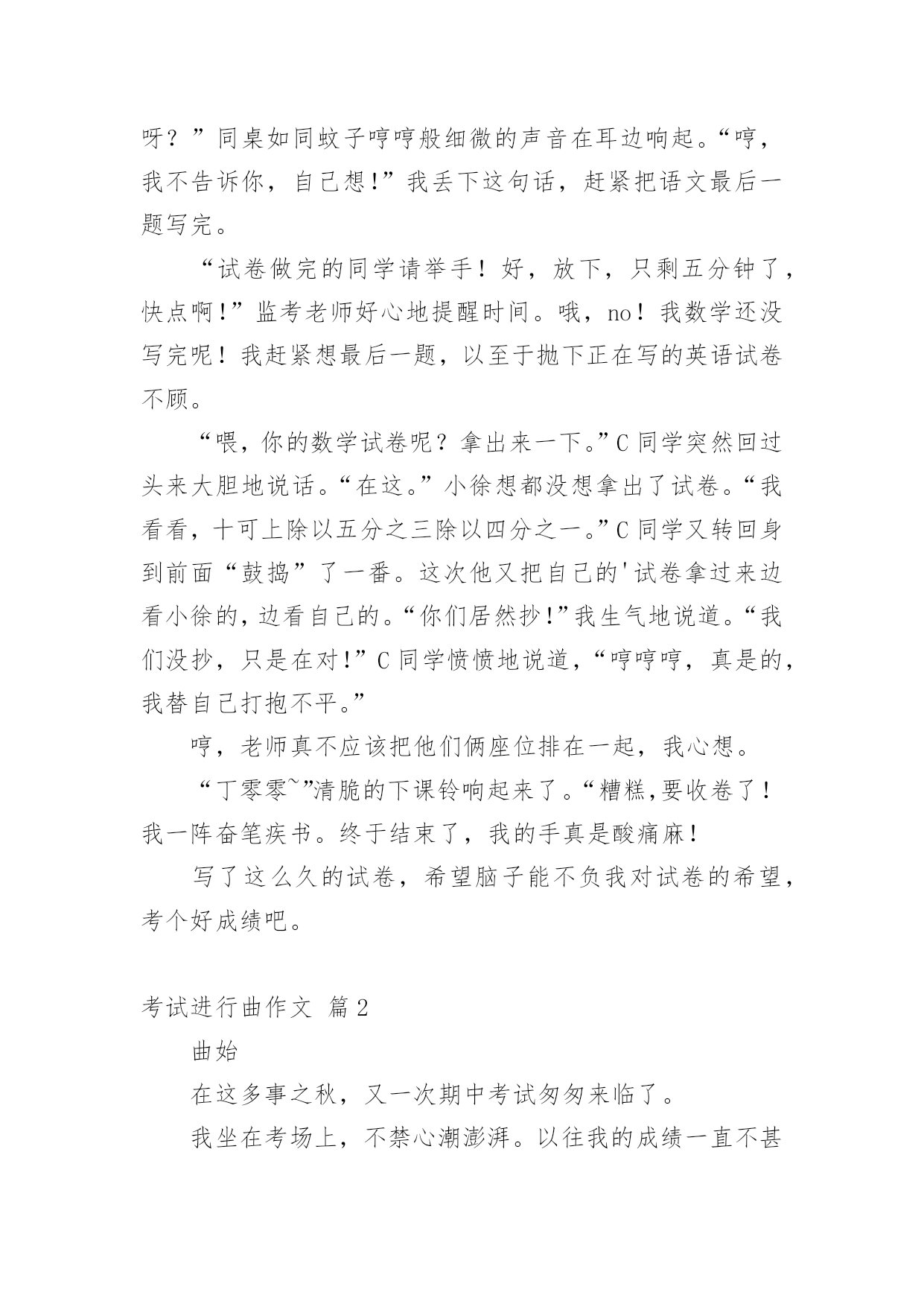 考试进行曲作文考试进行曲作文5篇在日常学习、工作和生活中,大家总少不了接触作文吧,借助作文可以宣泄心中的情感,调节自己的心情。为了让您在写作文时更加简单方便,以下是小编帮大家整理的考试进行曲作文5篇,欢迎阅读与收藏。考试进行曲作文篇1今天是周四,也就是说今天下午有80%的可能要考试,我悬着心来到了教室。上午最后一堂电脑课下课后,左老师突然来了,发完听写本后,又说道:“今天下午模拟考试,这次英语也要考。”什么?!英语也考?!这对于我这样的英语学渣来说,无疑是天大的打击。没办法,我只好苦着脸乖乖认命。下午。教室。两张试卷如期飘到了课桌上。“下面开始考试。”监考老师威严的声音响起。我拿着笔,紧张地做起题来。“喂,什么样的詹天佑啊?”我小声地问同桌。“等我写到那题再说。"哼,我才不等你呢。”没办法,我只好做阅读理解了。那个,我先不写作文,把数学写好再说。我环顾了一下四周,看见了正在奋笔疾书的汪晨睿,抓耳挠腮的于世江,思来想去的桂安琪……看时间不多了,我也收回目光抓紧做下去。“喂,数学最后一题怎么写呀?”同桌如同蚊子哼哼般细微的声音在耳边响起。“哼,我不告诉你,自己想!”我丢下这句话,赶紧把语文最后一题写完。“试卷做完的同学请举手!好,放下,只剩五分钟了,快点啊!”监考老师好心地提醒时间。哦,no!我数学还没写完呢!我赶紧想最后一题,以至于抛下正在写的英语试卷不顾。“喂,你的数学试卷呢?拿出来一下。”C同学突然回过头来大胆地说话。“在这。”小徐想都没想拿出了试卷。“我看看,十可上除以五分之三除以四分之一。”C同学又转回身到前面“鼓捣”了一番。这次他又把自己的'试卷拿过来边看小徐的,边看自己的。“你们居然抄!”我生气地说道。“我们没抄,只是在对!”C同学愤愤地说道,“哼哼哼,真是的,我替自己打抱不平。”哼,老师真不应该把他们俩座位排在一起,我心想。“丁零零~”清脆的下课铃响起来了。“糟糕,要收卷了!我一阵奋笔疾书。终于结束了,我的手真是酸痛麻!写了这么久的试卷,希望脑子能不负我对试卷的希望,考个好成绩吧。考试进行曲作文篇2曲始在这多事之秋,又一次期中考试匆匆来临了。我坐在考场上,不禁心潮澎湃。以往我的成绩一直不甚理想,而八年级又是初中承上启下的瓶颈,此次考试堪称八年级的第一道险关,其重要性不言而喻。遑论对状元的奖品――自行车那无穷的诱惑力。我突发奇想,到底是何人发明了考试,从此桎梏一般使吾辈饱受束缚,时时牵动着我们脆弱不堪的心弦……“开始考试!”监考老师一声铿锵有力的命令硬把我无边的思绪拉回现实。做好迎战姿势,正如一句话所言:拿起武器,准备去迎战吧!高潮试卷、答题卡雪花般飞舞到我们手中。既来之,则安之。我欲用阿Q的精神胜利法稳住自己,无奈卷子上密密麻麻的.题目,活像一双双哂笑的眼睛,教人心头发憷。我忙争分夺秒地握笔鏖战。岑寂的教室响起了一片“沙沙”声。绞尽了脑汁,费尽了九牛二虎之力方才游出题海。我长舒了一口气后,恍然发现,一直紧紧攥着的试卷已被手心的汗水浸湿了。曲毕秋风冷冷地敲打着我单薄的衣服,发出“呜呜”的怪叫。走在放学回家的路上,脑子里除了试卷,还是试卷。一天的考试早已结束,孰料我竟无一丝释去重担的轻松,却陷入度日如年的等待之中。惊喜,懊悔,郁结,困惑……汇成了复杂深邃的心海,恰如这肃杀的深秋。默默翻开课本温习功课,得为翌日的考试做准备。望着那缓缓落下的夕阳,我想,明天希望的朝阳终会升起。耳畔又响起了那句话――拿起武器,准备去迎战吧。考试进行曲作文篇3轻纱如烟,年复一年。或许,雪还在下,分不清是真是假,或许,雨还在飘,分不清是哭是笑,又或许,只有在历经过时光的匆匆后,当风吹走脸庞上的青涩时,我们才能明白,天真的梦该醒了。就让它随风散在空中,驻足于曾经日记上泛黄的一页中,放上一片枫叶,描上曾经雨后的天空中,那一抹,我们一同描绘的一丝彩虹。尽管青春迷蒙,但至少,我们曾经梦过,曾经一起拥有过,曾经拼搏过,这样,就够了。兵临城下抱佛脚明天,是期末考试。一个学期的努力全部集中在明天,胜,则长风破浪,金榜题名,钱财滚滚,败,则月落乌啼,名落孙山,两手空空,成败在此一举,昔日里嘻嘻哈哈的好友全变成了竞争对手,无一人不大书小书满书桌,正是因为这样,谁也不愿意输给谁。平日学习成绩优良的同学全部变成了大佛,一边心不在焉的复习,一边望着十里信徒前来登门拜访,烧香加油。而玩物丧志的同学们却若无其事,平时该玩就玩,丝毫不惧怕即将大驾光临的期末先生,还悠哉悠哉的冒出一句:我愿乘风而去,随万物生息,浩然与津溟同科!还有某君请来考神的真容,随身携带着。场面浩然与天地共存,千奇百怪不足为奇。剑指复习为安然今天,是期末考试。诸位高人自创祈祷方法,双手合十,表情虔诚,面色严肃,三叩九拜,祭天祭地,一拜天地,二拜老师,三拜考神,四入考场。本为司空见惯的期末考试,却在这个