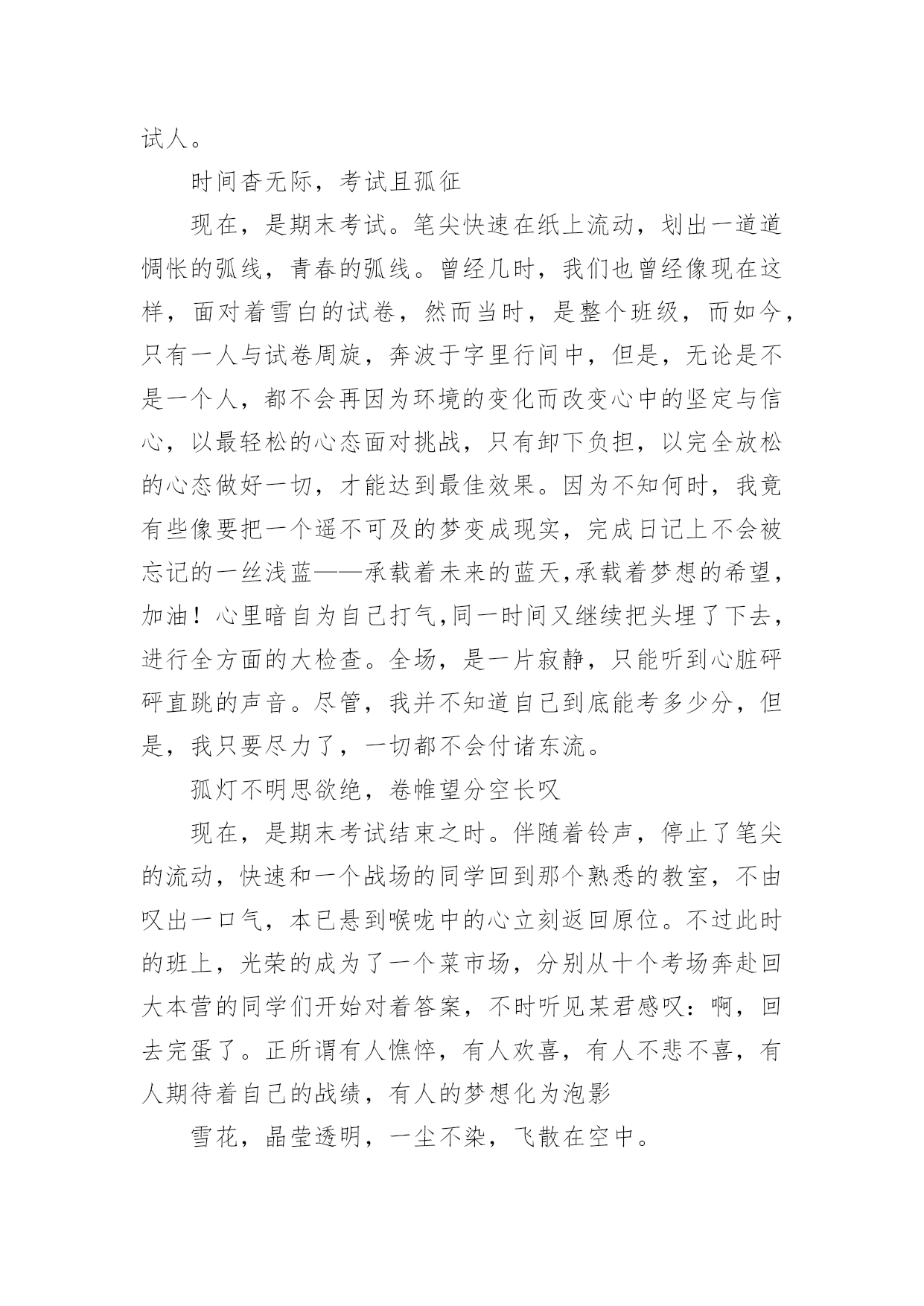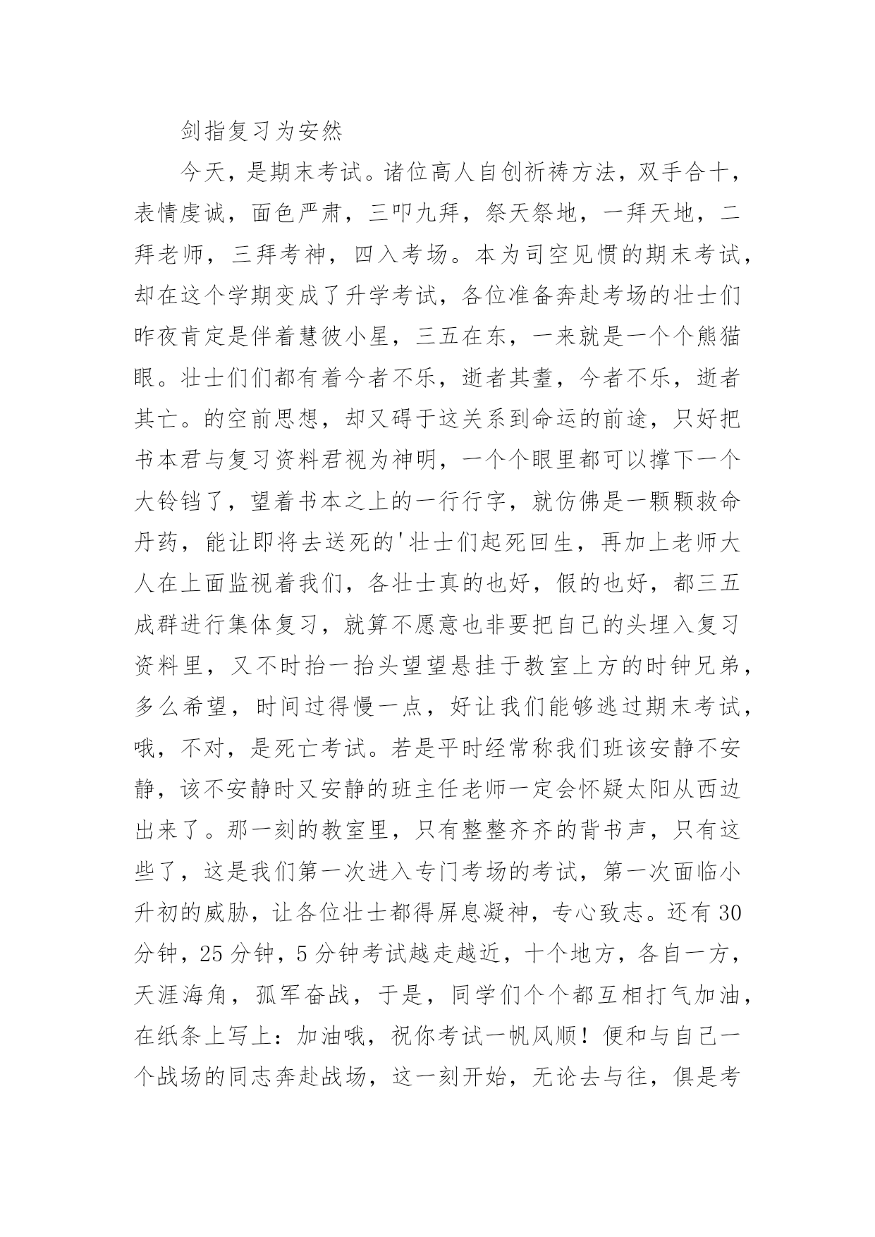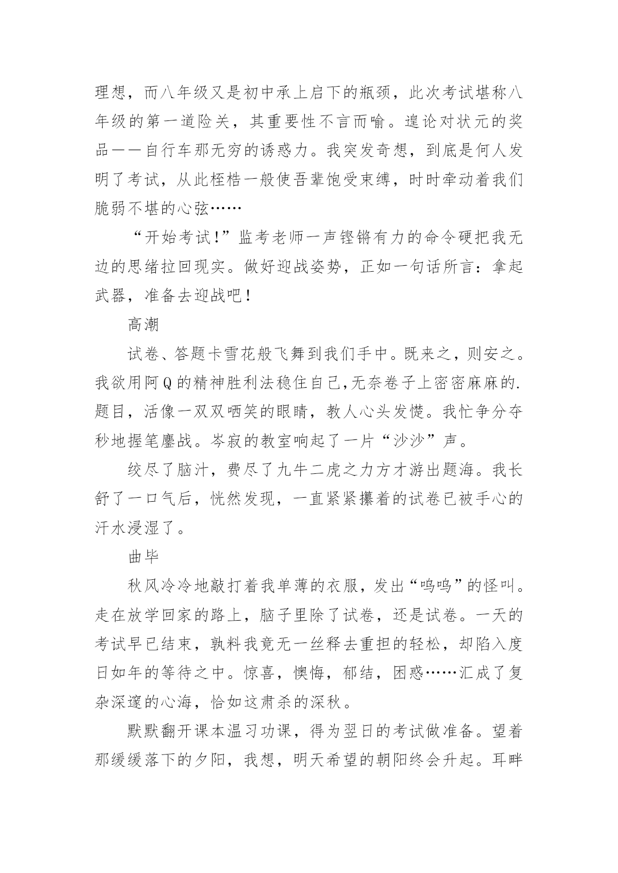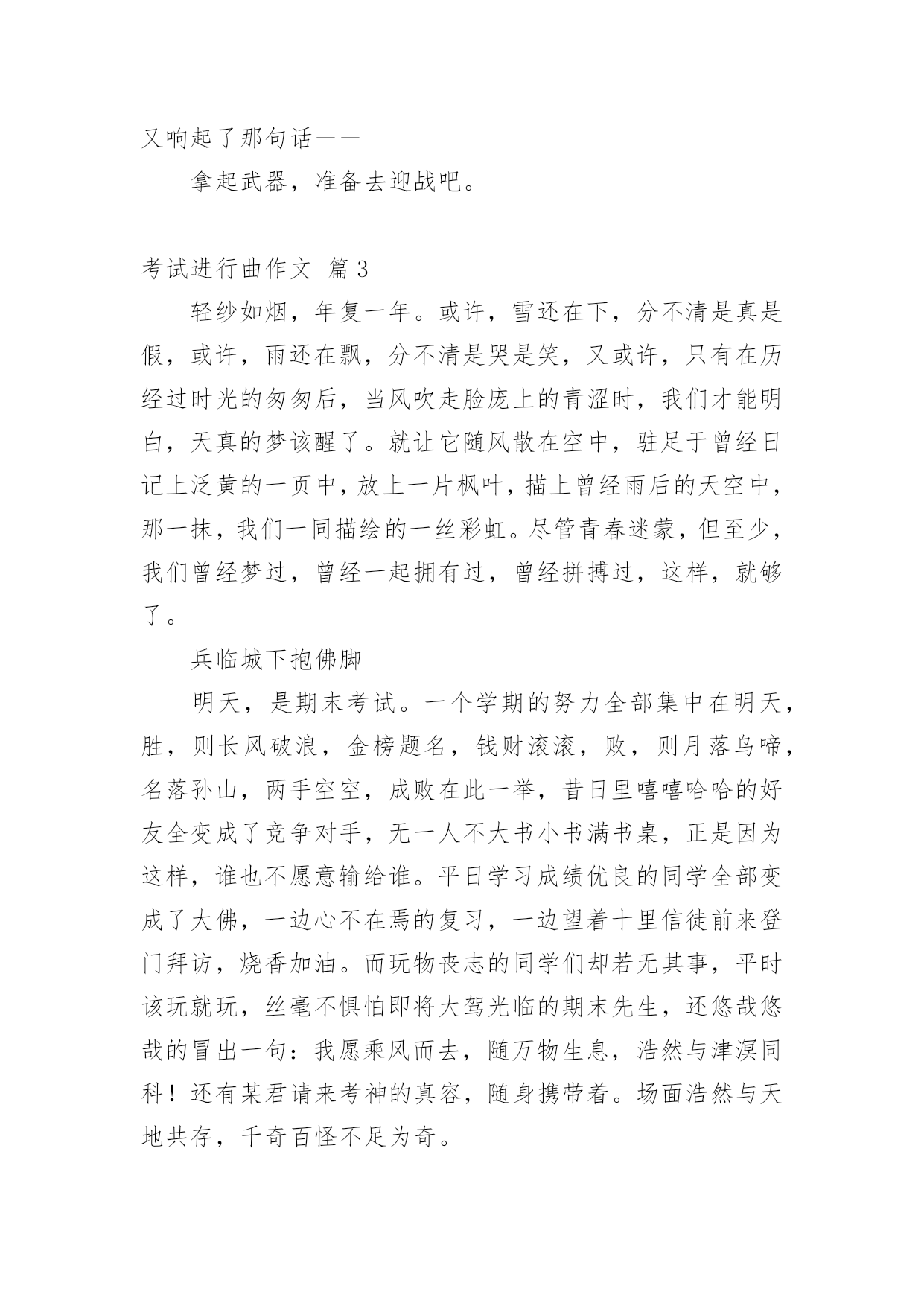考试进行曲作文考试进行曲作文5篇在日常学习、工作和生活中,大家总少不了接触作文吧,借助作文可以宣泄心中的情感,调节自己的心情。为了让您在写作文时更加简单方便,以下是小编帮大家整理的考试进行曲作文5篇,欢迎阅读与收藏。考试进行曲作文篇1今天是周四,也就是说今天下午有80%的可能要考试,我悬着心来到了教室。上午最后一堂电脑课下课后,左老师突然来了,发完听写本后,又说道:“今天下午模拟考试,这次英语也要考。”什么?!英语也考?!这对于我这样的英语学渣来说,无疑是天大的打击。没办法,我只好苦着脸乖乖认命。下午。教室。两张试卷如期飘到了课桌上。“下面开始考试。”监考老师威严的声音响起。我拿着笔,紧张地做起题来。“喂,什么样的詹天佑啊?”我小声地问同桌。“等我写到那题再说。"哼,我才不等你呢。”没办法,我只好做阅读理解了。那个,我先不写作文,把数学写好再说。我环顾了一下四周,看见了正在奋笔疾书的汪晨睿,抓耳挠腮的于世江,思来想去的桂安琪……看时间不多了,我也收回目光抓紧做下去。“喂,数学最后一题怎么写呀?”同桌如同蚊子哼哼般细微的声音在耳边响起。“哼,我不告诉你,自己想!”我丢下这句话,赶紧把语文最后一题写完。“试卷做完的同学请举手!好,放下,只剩五分钟了,快点啊!”监考老师好心地提醒时间。哦,no!我数学还没写完呢!我赶紧想最后一题,以至于抛下正在写的英语试卷不顾。“喂,你的数学试卷呢?拿出来一下。”C同学突然回过头来大胆地说话。“在这。”小徐想都没想拿出了试卷。“我看看,十可上除以五分之三除以四分之一。”C同学又转回身到前面“鼓捣”了一番。这次他又把自己的'试卷拿过来边看小徐的,边看自己的。“你们居然抄!”我生气地说道。“我们没抄,只是在对!”C同学愤愤地说道,“哼哼哼,真是的,我替自己打抱不平。”哼,老师真不应该把他们俩座位排在一起,我心想。“丁零零~”清脆的下课铃响起来了。“糟糕,要收卷了!我一阵奋笔疾书。终于结束了,我的手真是酸痛麻!写了这么久的试卷,希望脑子能不负我对试卷的希望,考个好成绩吧。考试进行曲作文篇2曲始在这多事之秋,又一次期中考试匆匆来临了。我坐在考场上,不禁心潮澎湃。以往我的成绩一直不甚理想,而八年级又是初中承上启下的瓶颈,此次考试堪称八年级的第一道险关,其重要性不言而喻。遑论对状元的奖品――自行车那无穷的诱惑力。我突发奇想,到底是何人发明了考试,从此桎梏一般使吾辈饱受束缚,时时牵动着我们脆弱不堪的心弦……“开始考试!”监考老师一声铿锵有力的命令硬把我无边的思绪拉回现实。做好迎战姿势,正如一句话所言:拿起武器,准备去迎战吧!高潮试卷、答题卡雪花般飞舞到我们手中。既来之,则安之。我欲用阿Q的精神胜利法稳住自己,无奈卷子上密密麻麻的.题目,活像一双双哂笑的眼睛,教人心头发憷。我忙争分夺秒地握笔鏖战。岑寂的教室响起了一片“沙沙”声。绞尽了脑汁,费尽了九牛二虎之力方才游出题海。我长舒了一口气后,恍然发现,一直紧紧攥着的试卷已被手心的汗水浸湿了。曲毕秋风冷冷地敲打着我单薄的衣服,发出“呜呜”的怪叫。走在放学回家的路上,脑子里除了试卷,还是试卷。一天的考试早已结束,孰料我竟无一丝释去重担的轻松,却陷入度日如年的等待之中。惊喜,懊悔,郁结,困惑……汇成了复杂深邃的心海,恰如这肃杀的深秋。默默翻开课本温习功课,得为翌日的考试做准备。望着那缓缓落下的夕阳,我想,明天希望的朝阳终会升起。耳畔又响起了那句话――拿起武器,准备去迎战吧。考试进行曲作文篇3轻纱如烟,年复一年。或许,雪还在下,分不清是真是假,或许,雨还在飘,分不清是哭是笑,又或许,只有在历经过时光的匆匆后,当风吹走脸庞上的青涩时,我们才能明白,天真的梦该醒了。就让它随风散在空中,驻足于曾经日记上泛黄的一页中,放上一片枫叶,描上曾经雨后的天空中,那一抹,我们一同描绘的一丝彩虹。尽管青春迷蒙,但至少,我们曾经梦过,曾经一起拥有过,曾经拼搏过,这样,就够了。兵临城下抱佛脚明天,是期末考试。一个学期的努力全部集中在明天,胜,则长风破浪,金榜题名,钱财滚滚,败,则月落乌啼,名落孙山,两手空空,成败在此一举,昔日里嘻嘻哈哈的好友全变成了竞争对手,无一人不大书小书满书桌,正是因为这样,谁也不愿意输给谁。平日学习成绩优良的同学全部变成了大佛,一边心不在焉的复习,一边望着十里信徒前来登门拜访,烧香加油。而玩物丧志的同学们却若无其事,平时该玩就玩,丝毫不惧怕即将大驾光临的期末先生,还悠哉悠哉的冒出一句:我愿乘风而去,随万物生息,浩然与津溟同科!还有某君请来考神的真容,随身携带着。场面浩然与天地共存,千奇百怪不足为奇。剑指复习为安然今天,是期末考试。诸位高人自创祈祷方法,双手合十,表情虔诚,面色严肃,三叩九拜,祭天祭地,一拜天地,二拜老师,三拜考神,四入考场。本为司空见惯的期末考试,却在这个
