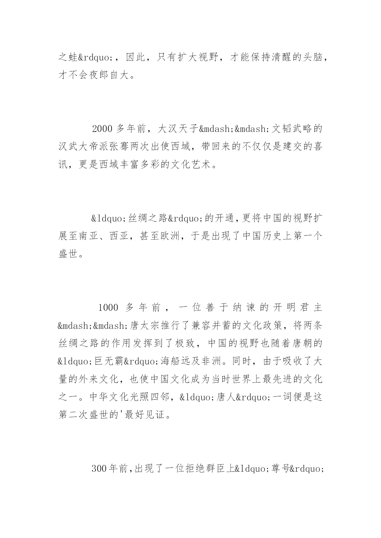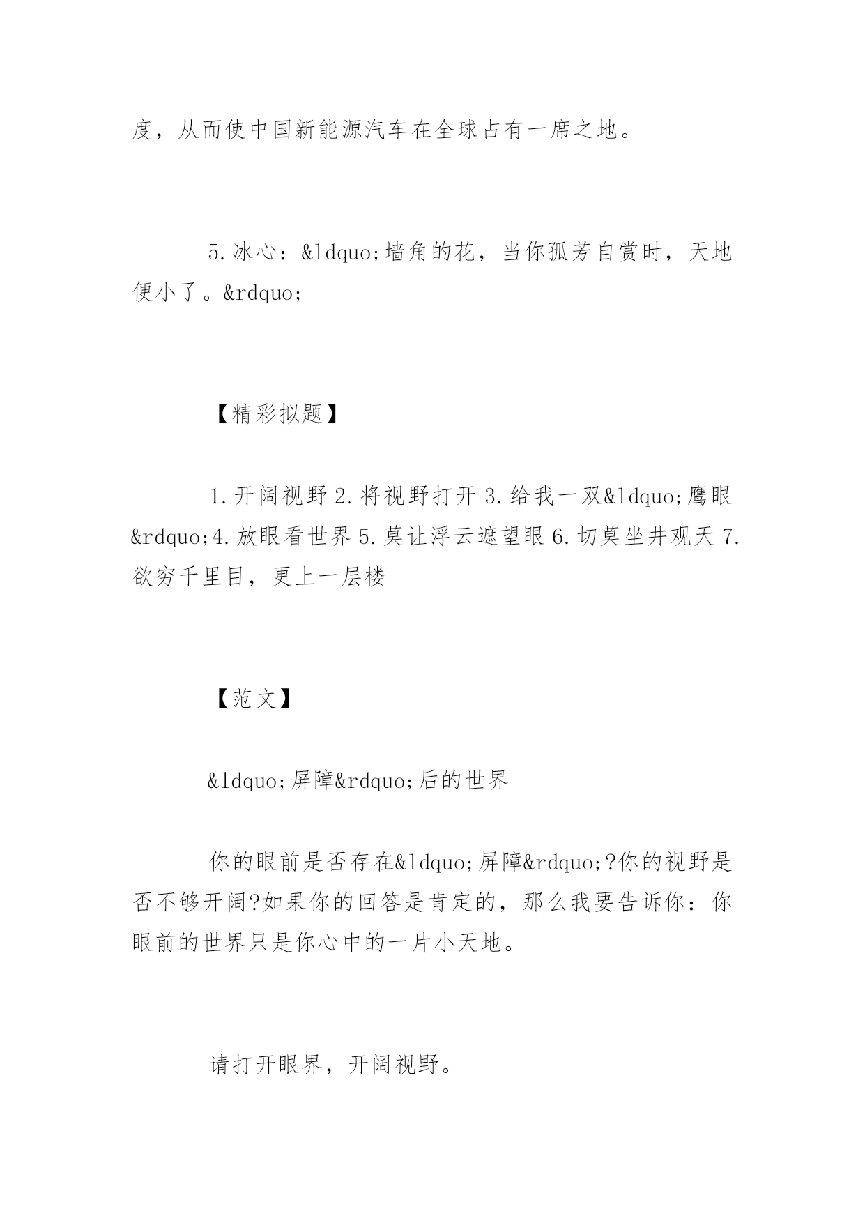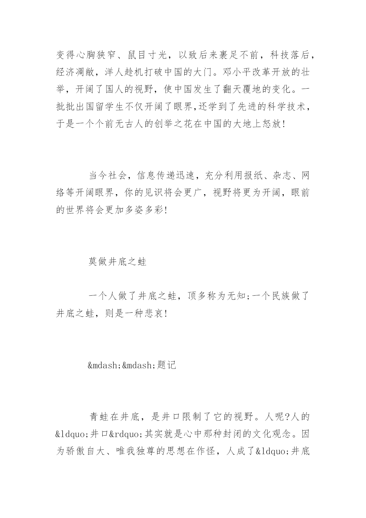 高考作文题预测:莫做井底之蛙2017高考作文题预测:莫做井底之蛙只有眼界打开,你才能除去眼前的“屏障”,看到屏障后美丽的世界。欢迎大家阅读!更多相关信息请关注CNFLA的相关栏目!【题目】阅读下面文字,根据要求作文。作家冯骥才说:“各国博物馆都收藏中国的文物,惟有中国博物馆不收藏外国文物,中国人在博物馆里看来看去全是自己。造成这种现象的是一种传统的文化封闭现念:不看别人的,便认为自己最好。”有人由此联想到:打开的窗口越大,放进来的阳光就越多,进入视野的`内容就越丰富,对自己、对世界的认识就越全面。你是否有过类似的感受或体验?请以“视野”为话题写一篇文章。立意自定,文体自选;题目自拟,不少于800字。【写作素材】1.苏轼集儒、释、道于一身,他审视自己的视野远远大于与他一起游玩的吹洞箫之客,当客“哀吾生之须臾,羡长江之无穷”的时候,他却认为“自其不变者而观之,则物与我皆无尽也”。他的达观,他的'洒脱皆源于他审视生命的宽阔视野。2.清政府闭关锁国,思想守旧,视野狭窄,落后挨打;党中央放眼寰宇,改革开放,国力增强。3.钱钟书博览群书,学贯中西,学术视野开阔,才写成令人惊叹的《管锥编》。4.致公党中央副主席万钢之所以被任命为科学技术部部长,就是因为他有在德国奥迪公司工作10年的经历,这使他视野开阔,有能力把中国科技管理水平提高到新的高度,从而使中国新能源汽车在全球占有一席之地。5.冰心:“墙角的花,当你孤芳自赏时,天地便小了。”【精彩拟题】1.开阔视野2.将视野打开3.给我一双“鹰眼”4.放眼看世界5.莫让浮云遮望眼6.切莫坐井观天7.欲穷千里目,更上一层楼【范文】“屏障”后的世界你的眼前是否存在“屏障”?你的视野是否不够开阔?如果你的回答是肯定的,那么我要告诉你:你眼前的世界只是你心中的一片小天地。请打开眼界,开阔视野。古人云:操千曲而后晓声,观千剑而后识器。只有打开眼界,视野开阔了,才会阅历多多,见识多多,收获多多。司马迁读万卷书,行万里路,著成“史家之绝唱,无韵之离骚”的《史记》;徐霞客游遍神州大地,写出丰富多彩的《徐霞客游记》;李时珍走遍三山五岳,遍尝百草,写成流芳百世的《本草纲目》。视野开阔了,你会站得更高,看得更远。你会领略到“不畏浮云遮望眼,只缘身在最高层”的快意,你会体悟到“欲穷千里目,更上一层楼”的真谛,你会感受到“会当凌绝顶,一览众山小”的豪迈。只有眼界打开,你才能除去眼前的“屏障”,看到屏障后美丽的世界。视野开阔了,见识与心胸也会变得开阔,你的`世界将绚丽多彩。清朝政府实行闭关锁国政策,关闭了国人放眼望世界的窗户,于是国人生活狭小的圈子里,过着自给自足的生活,变得心胸狭窄、鼠目寸光,以致后来裹足不前,科技落后,经济凋敝,洋人趁机打破中国的大门。邓小平改革开放的壮举,开阔了国人的视野,使中国发生了翻天覆地的变化。一批批出国留学生不仅开阔了眼界,还学到了先进的科学技术,于是一个个前无古人的创举之花在中国的大地上怒放!当今社会,信息传递迅速,充分利用报纸、杂志、网络等开阔眼界,你的见识将会更广,视野将更为开阔,眼前的世界将会更加多姿多彩!莫做井底之蛙一个人做了井底之蛙,顶多称为无知;一个民族做了井底之蛙,则是一种悲哀!——题记青蛙在井底,是井口限制了它的视野。人呢?人的“井口”其实就是心中那种封闭的文化观念。因为骄傲自大、唯我独尊的思想在作怪,人成了“井底之蛙”,因此,只有扩大视野,才能保持清醒的头脑,才不会夜郎自大。2000多年前,大汉天子——文韬武略的汉武大帝派张骞两次出使西域,带回来的不仅仅是建交的喜讯,更是西域丰富多彩的文化艺术。“丝绸之路”的开通,更将中国的视野扩展至南亚、西亚,甚至欧洲,于是出现了中国历史上第一个盛世。1000多年前,一位善于纳谏的开明君主——唐太宗推行了兼容并蓄的文化政策,将两条丝绸之路的作用发挥到了极致,中国的视野也随着唐朝的“巨无霸”海船远及非洲。同时,由于吸收了大量的外来文化,也使中国文化成为当时世界上最先进的文化之一。中华文化光照四邻,“唐人”一词便是这第二次盛世的'最好见证。300年前,出现了一位拒绝