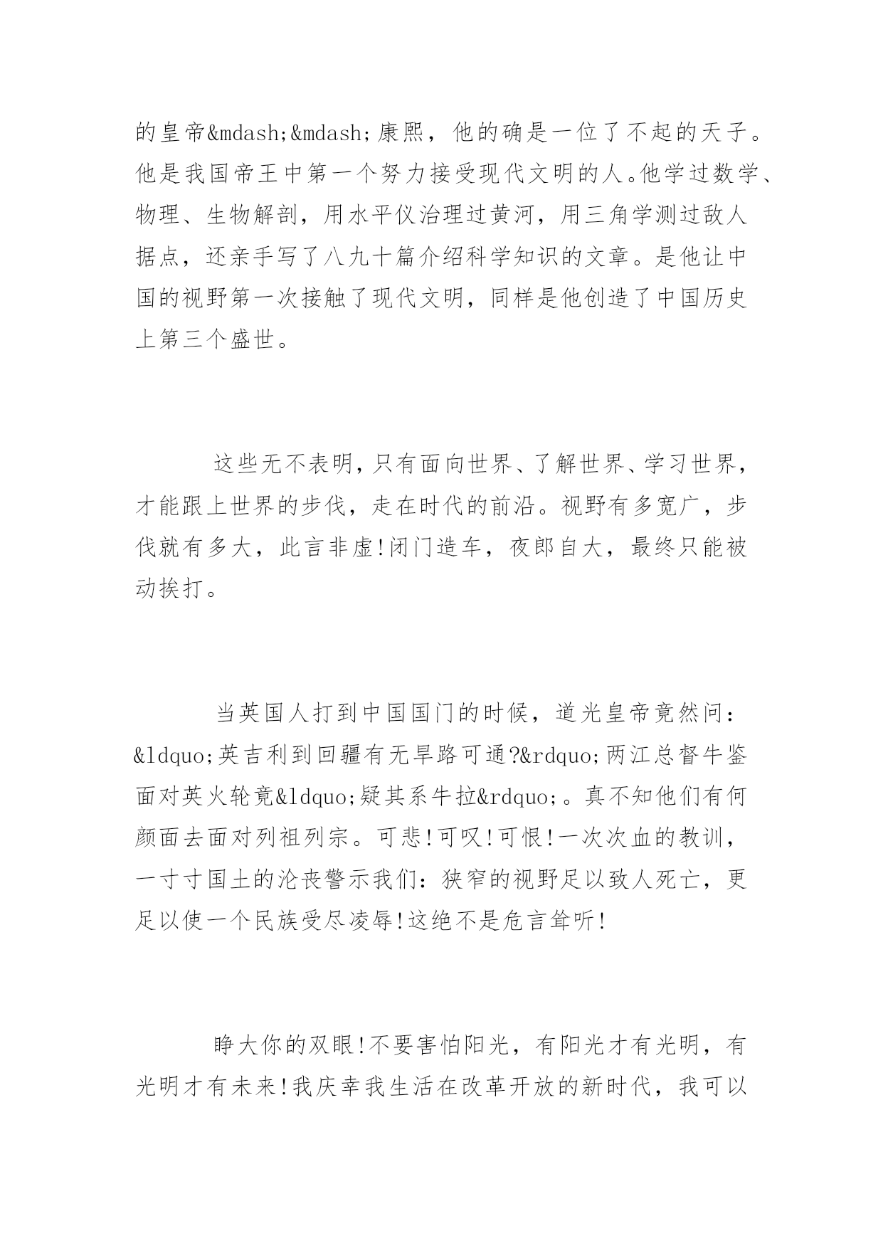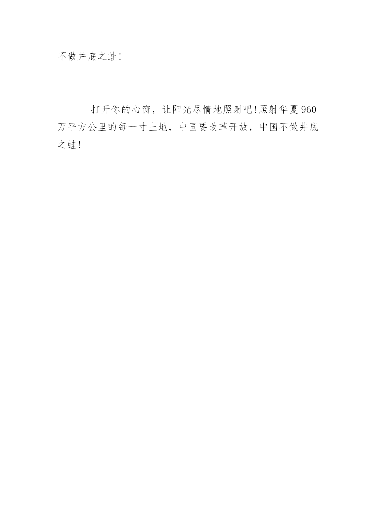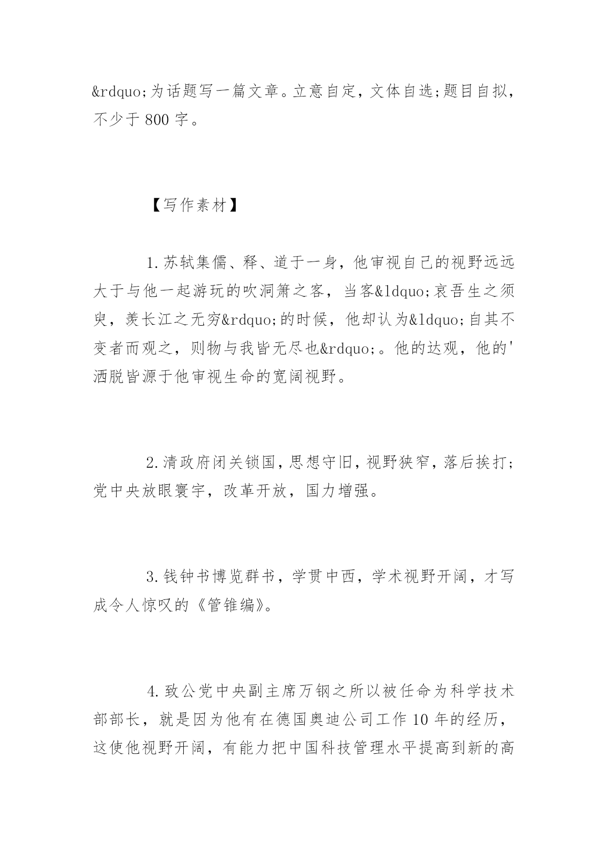 高考作文题预测:莫做井底之蛙2017高考作文题预测:莫做井底之蛙只有眼界打开,你才能除去眼前的“屏障”,看到屏障后美丽的世界。欢迎大家阅读!更多相关信息请关注CNFLA的相关栏目!【题目】阅读下面文字,根据要求作文。作家冯骥才说:“各国博物馆都收藏中国的文物,惟有中国博物馆不收藏外国文物,中国人在博物馆里看来看去全是自己。造成这种现象的是一种传统的文化封闭现念:不看别人的,便认为自己最好。”有人由此联想到:打开的窗口越大,放进来的阳光就越多,进入视野的`内容就越丰富,对自己、对世界的认识就越全面。你是否有过类似的感受或体验?请以“视野”为话题写一篇文章。立意自定,文体自选;题目自拟,不少于800字。【写作素材】1.苏轼集儒、释、道于一身,他审视自己的视野远远大于与他一起游玩的吹洞箫之客,当客“哀吾生之须臾,羡长江之无穷”的时候,他却认为“自其不变者而观之,则物与我皆无尽也”。他的达观,他的'洒脱皆源于他审视生命的宽阔视野。2.清政府闭关锁国,思想守旧,视野狭窄,落后挨打;党中央放眼寰宇,改革开放,国力增强。3.钱钟书博览群书,学贯中西,学术视野开阔,才写成令人惊叹的《管锥编》。4.致公党中央副主席万钢之所以被任命为科学技术部部长,就是因为他有在德国奥迪公司工作10年的经历,这使他视野开阔,有能力把中国科技管理水平提高到新的高度,从而使中国新能源汽车在全球占有一席之地。5.冰心:“墙角的花,当你孤芳自赏时,天地便小了。”【精彩拟题】1.开阔视野2.将视野打开3.给我一双“鹰眼”4.放眼看世界5.莫让浮云遮望眼6.切莫坐井观天7.欲穷千里目,更上一层楼【范文】“屏障”后的世界你的眼前是否存在“屏障”?你的视野是否不够开阔?如果你的回答是肯定的,那么我要告诉你:你眼前的世界只是你心中的一片小天地。请打开眼界,开阔视野。古人云:操千曲而后晓声,观千剑而后识器。只有打开眼界,视野开阔了,才会阅历多多,见识多多,收获多多。司马迁读万卷书,行万里路,著成“史家之绝唱,无韵之离骚”的《史记》;徐霞客游遍神州大地,写出丰富多彩的《徐霞客游记》;李时珍走遍三山五岳,遍尝百草,写成流芳百世的《本草纲目》。视野开阔了,你会站得更高,看得更远。你会领略到“不畏浮云遮望眼,只缘身在最高层”的快意,你会体悟到“欲穷千里目,更上一层楼”的真谛,你会感受到“会当凌绝顶,一览众山小”的豪迈。只有眼界打开,你才能除去眼前的“屏障”,看到屏障后美丽的世界。视野开阔了,见识与心胸也会变得开阔,你的`世界将绚丽多彩。清朝政府实行闭关锁国政策,关闭了国人放眼望世界的窗户,于是国人生活狭小的圈子里,过着自给自足的生活,变得心胸狭窄、鼠目寸光,以致后来裹足不前,科技落后,经济凋敝,洋人趁机打破中国的大门。邓小平改革开放的壮举,开阔了国人的视野,使中国发生了翻天覆地的变化。一批批出国留学生不仅开阔了眼界,还学到了先进的科学技术,于是一个个前无古人的创举之花在中国的大地上怒放!当今社会,信息传递迅速,充分利用报纸、杂志、网络等开阔眼界,你的见识将会更广,视野将更为开阔,眼前的世界将会更加多姿多彩!莫做井底之蛙一个人做了井底之蛙,顶多称为无知;一个民族做了井底之蛙,则是一种悲哀!——题记青蛙在井底,是井口限制了它的视野。人呢?人的“井口”其实就是心中那种封闭的文化观念。因为骄傲自大、唯我独尊的思想在作怪,人成了“井底之蛙”,因此,只有扩大视野,才能保持清醒的头脑,才不会夜郎自大。2000多年前,大汉天子——文韬武略的汉武大帝派张骞两次出使西域,带回来的不仅仅是建交的喜讯,更是西域丰富多彩的文化艺术。“丝绸之路”的开通,更将中国的视野扩展至南亚、西亚,甚至欧洲,于是出现了中国历史上第一个盛世。1000多年前,一位善于纳谏的开明君主——唐太宗推行了兼容并蓄的文化政策,将两条丝绸之路的作用发挥到了极致,中国的视野也随着唐朝的“巨无霸”海船远及非洲。同时,由于吸收了大量的外来文化,也使中国文化成为当时世界上最先进的文化之一。中华文化光照四邻,“唐人”一词便是这第二次盛世的'最好见证。300年前,出现了一位拒绝
