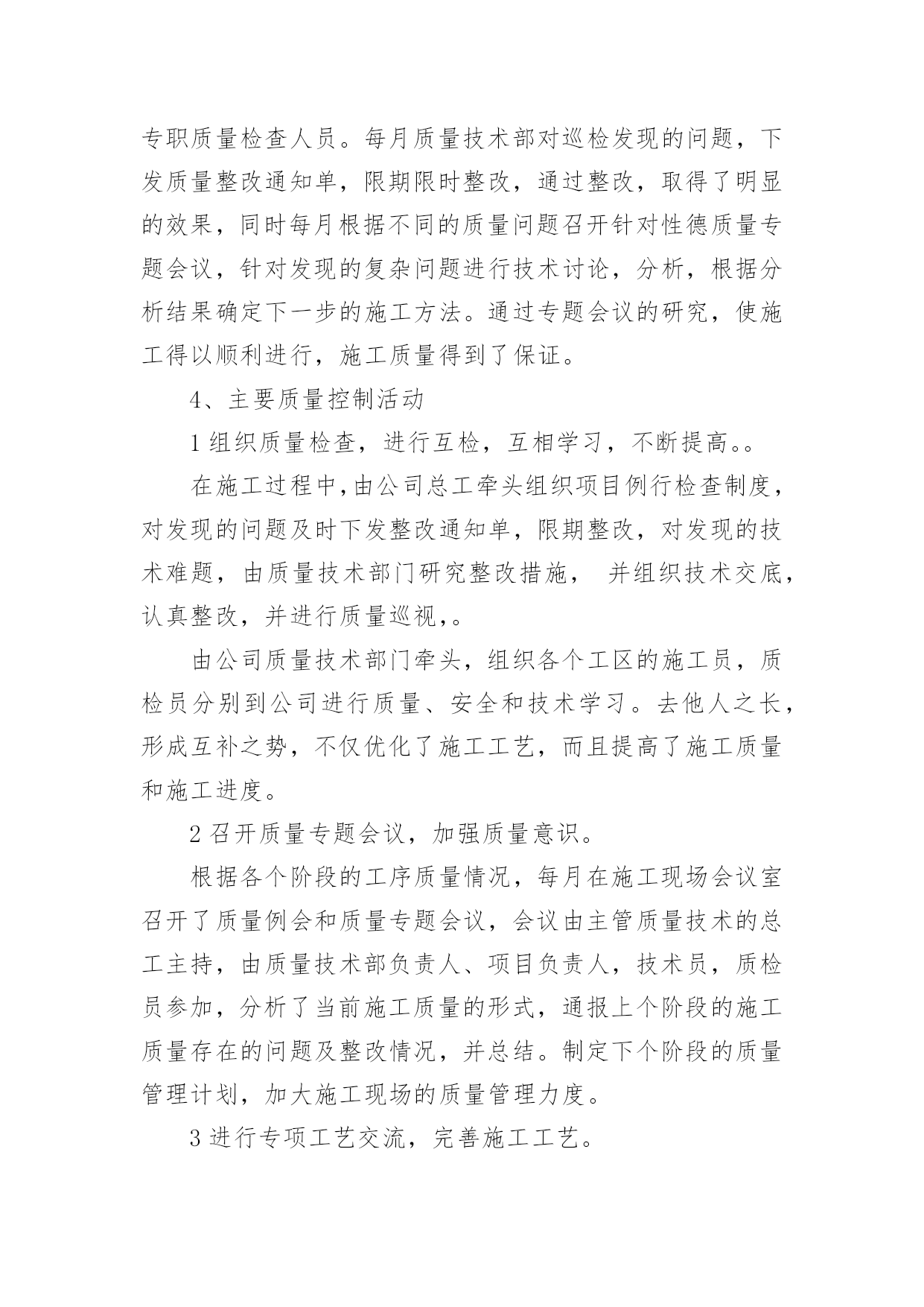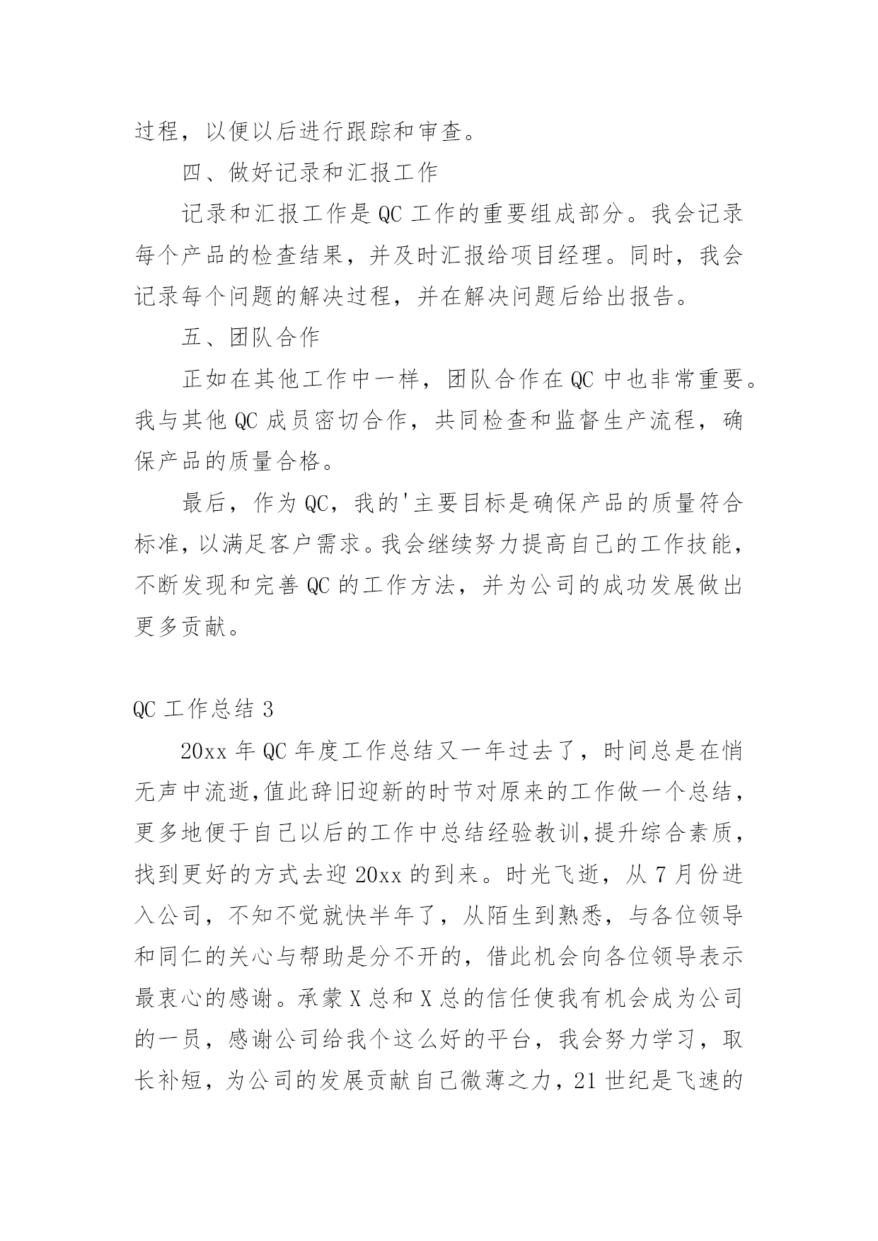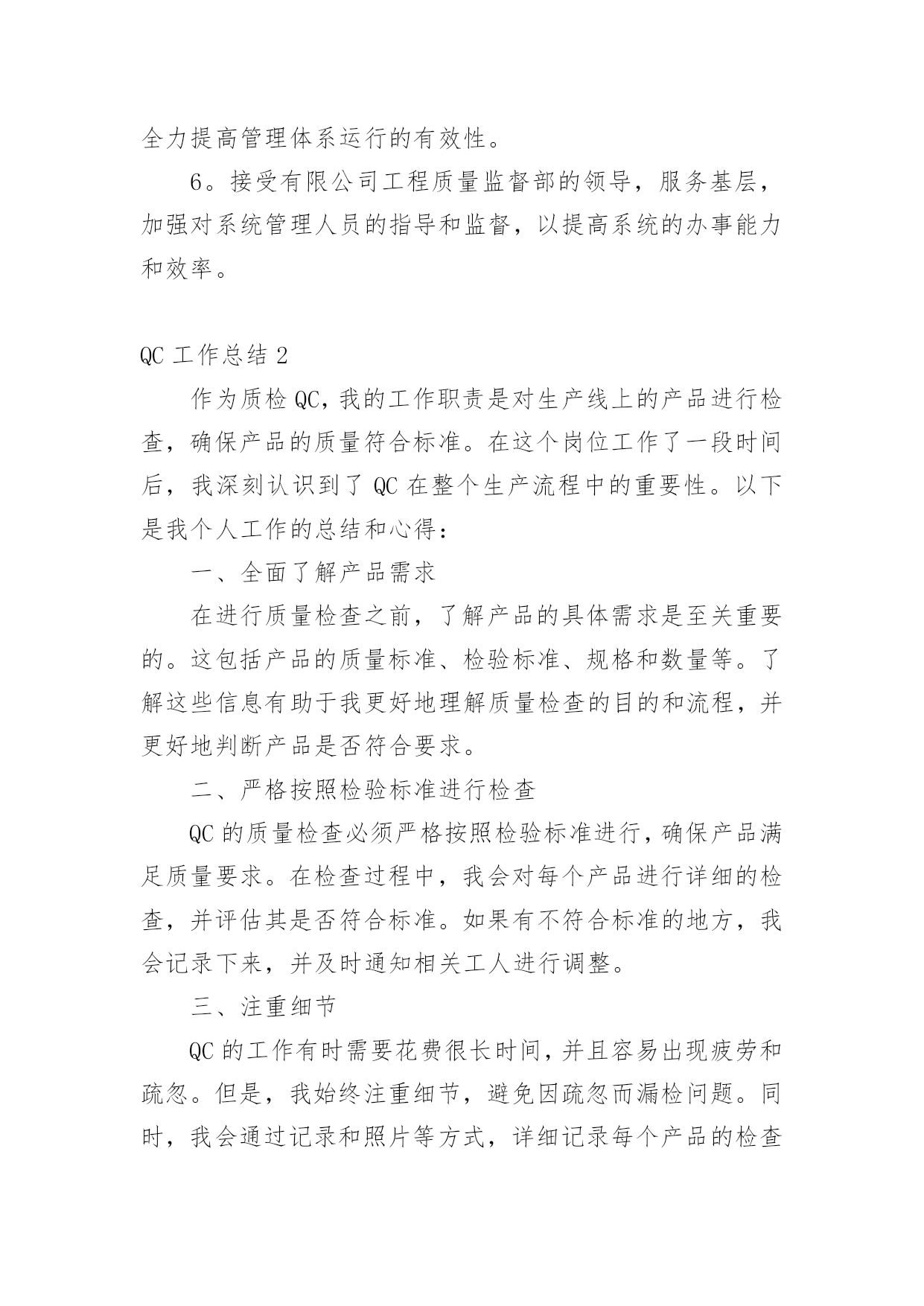 QC工作总结QC工作总结【合集】总结是对取得的成绩、存在的问题及得到的经验和教训等方面情况进行评价与描述的一种书面材料,它是增长才干的一种好办法,因此十分有必须要写一份总结哦。如何把总结做到重点突出呢?以下是小编帮大家整理的QC工作总结,希望对大家有所帮助。QC工作总结1回顾20xx年过去的半年里,在公司领导的正确领导和无微不至的关怀下;在各基层单位的大力支持下;在监理单位、业主、设计单位以及各部门的协同努力下;并在有限公司系统的指导下;工程技术质量部门在工程技术质量监督、群众性qc小组活动、质量创优、新开工项目策划等方面作了一定的工作,也取得了一定的成绩,并克服了一切不利因素,保证了各个项目工程建设的顺利进行。我们质量技术管理部门始终围绕公司的质量管理工作目标,认真贯彻落实上级工作会议精神,已落实公司的工作部署为中西,建立健全质量管理体系,落实质量管理职责,不断持续改进质量体系,将各个部门的相关质量制度和措施纳入到质量体系文件和岗位规范中,促进质量管理,并进一步加强现场质量管理,加大服务力度,已关键工序、新工艺和技术为重点,强化质量日常监督检查,查隐患,补漏洞,切实为”质量效益型“管理目标保驾护航。由于制度不断完善,责任明确到人,公司全体职工的质量意识都有很大的提高,实现了年度产品交验合格率100%,单元工程优良率95%,业主满意度92%,杜绝了施工质量事故的发生,确保持续改进措施的有效落实,实现了年度质量管理目标。但仍然存在不足之处,我们将通过不断总结和数据分析,找出工作中存在的不足以便在今后的工作中继续完善和改进。一年来,我们主要做了以下工作:一、建立质量保证体系,健全质量管理组织机构体系自公司组建成立以来,我质量技术管理部门迅速建立质量,技术管理组织机构,并建立了以总工领导负责,质量技术部监督检查,各个项目部实施的质量保证体系。二、进行制度建设,完善质量管理制度。为保证质量管理工作有章可循,根据公司各个项目的特点和《公司管理手册》制定了各项质量管理制度和岗位职责。1、责任到岗,制度到人,责任到工序公司以总工为核心的质量保证体系,明确部门,各个项目的质量工作职责与责任人,同时,在关键工序和新工艺施工时重点控制,设置专人负责过程质量控制。2、质量与进度奖挂钩结合各个项目工程实际情况及工程特点,在工程质量管理上,实行质量与进度奖挂钩,即在每个月进行生产进度评比时,把质量指标作为一项重要条件,如果质量指标完不成,进度指标完成的再好也不能得奖,这样以来调动了工区的质量主观能动性。使质量管理由被动变为自觉,提高了工程的施工质量。1质量管理规章制度的制定与落实情况。a、由公司牵头,质量技术部在施工现场进行各个施工工序重要环节的交底,使施工人员了解施工项目的概括,内容,施工目的,重点,难点,明确各个施工过程,质量标准,安全措施,环保措施,节约措施和工期要求等,做到心中有数,使施工技术管理水平大幅提高,保证了施工质量。b、推行质量责任制,强化“三检“制度。实行质量责任制,项目经理与各个项目负责人及劳务队伍签订质量责任书,明确质量责任,严格实行初检、项目复检,质量技术部门终检的“三检“制度,上一道工序不合格,下一道工序不开工,经过”三检“制度合格后,申请监理验收,c、实行交接班制度,严格质量值班每班做好施工记录,质量记录,并对下一道工序进行签字交接,对施工过程中出现的问题进行特别说明,并查找分析问题出现的原因,解决问题,不能使存在的问题过夜,为加强现场技术指导与质量控制,要求现场值班人员,质检员严格控制施工质量。3、质量保证体系运行情况项目工程的质检、技术、实验、测量、物资、调度、等各自认真履行自己的质量责任,质量保证体系运行正常。由于各项目的建设任务不一样,所以根据实际情况定出合理的专职质量检查人员。每月质量技术部对巡检发现的问题,下发质量整改通知单,限期限时整改,通过整改,取得了明显的效果,同时每月根据不同的质量问题召开针对性德质量专题会议,针对发现的复杂问题进行技术讨论,分析,根据分析结果确定下一步的施工方法。通过专题会议的研究,使施工得以顺利进行,施工质量得到了保证。4、主要质量控制活动1组织质量检查,进行互检,互相学习,不断提高。。在施工过程中,由公司总工牵头组织项目例行检查制度,对发现的问题及时下发整改通知单,限期整改,对发现的技术难题,由质量技术部门研究整改措施,并组织技术交底,认真整改,并进行质量巡视,。由公司质量技术部门牵头,组织各个工区的施工员,质检员分别到公司进行质量、安全和技术学习。去他人之长,形成互补之势,不仅优化了施工工艺,而且提高了施工质量和施工进度。2召开质量专题会议,加强质量意识。根据各个阶段的工序质量情况,每月在施工现场会议室召开了质量例会和质量专题会议,会议由主管质量技术的总工主持,由质量技术部负