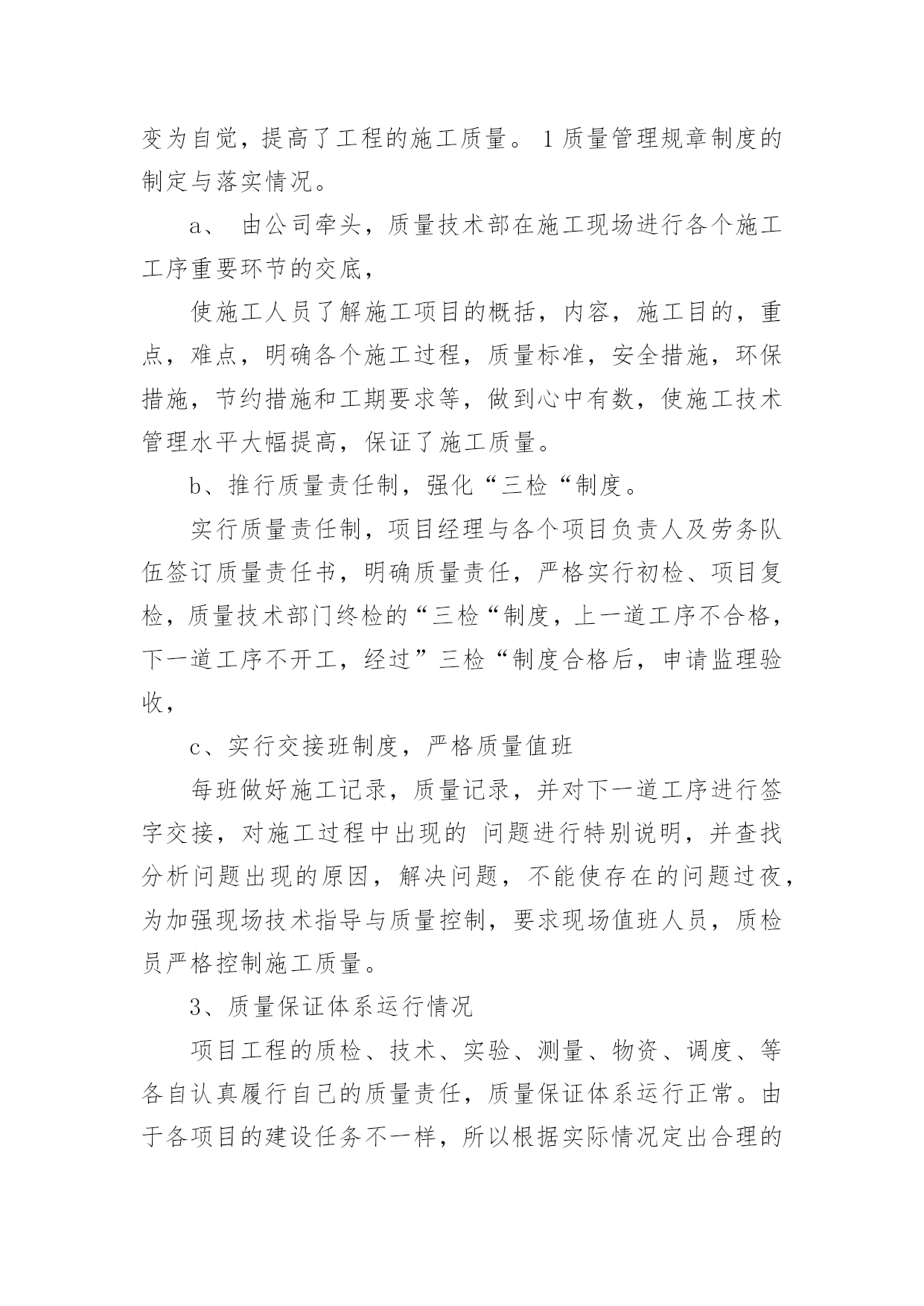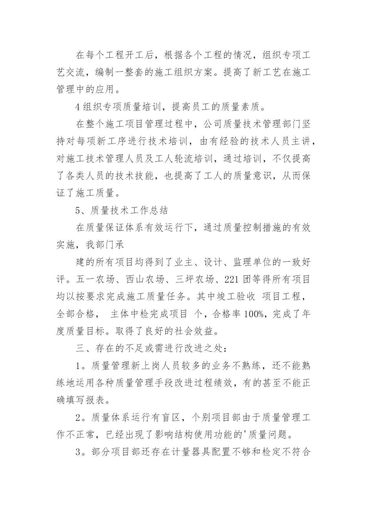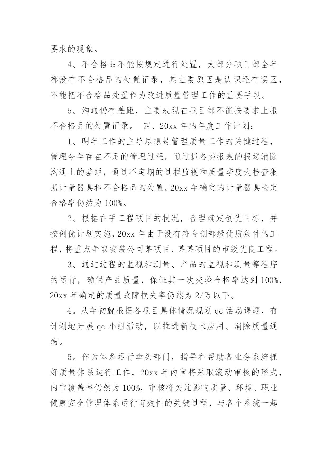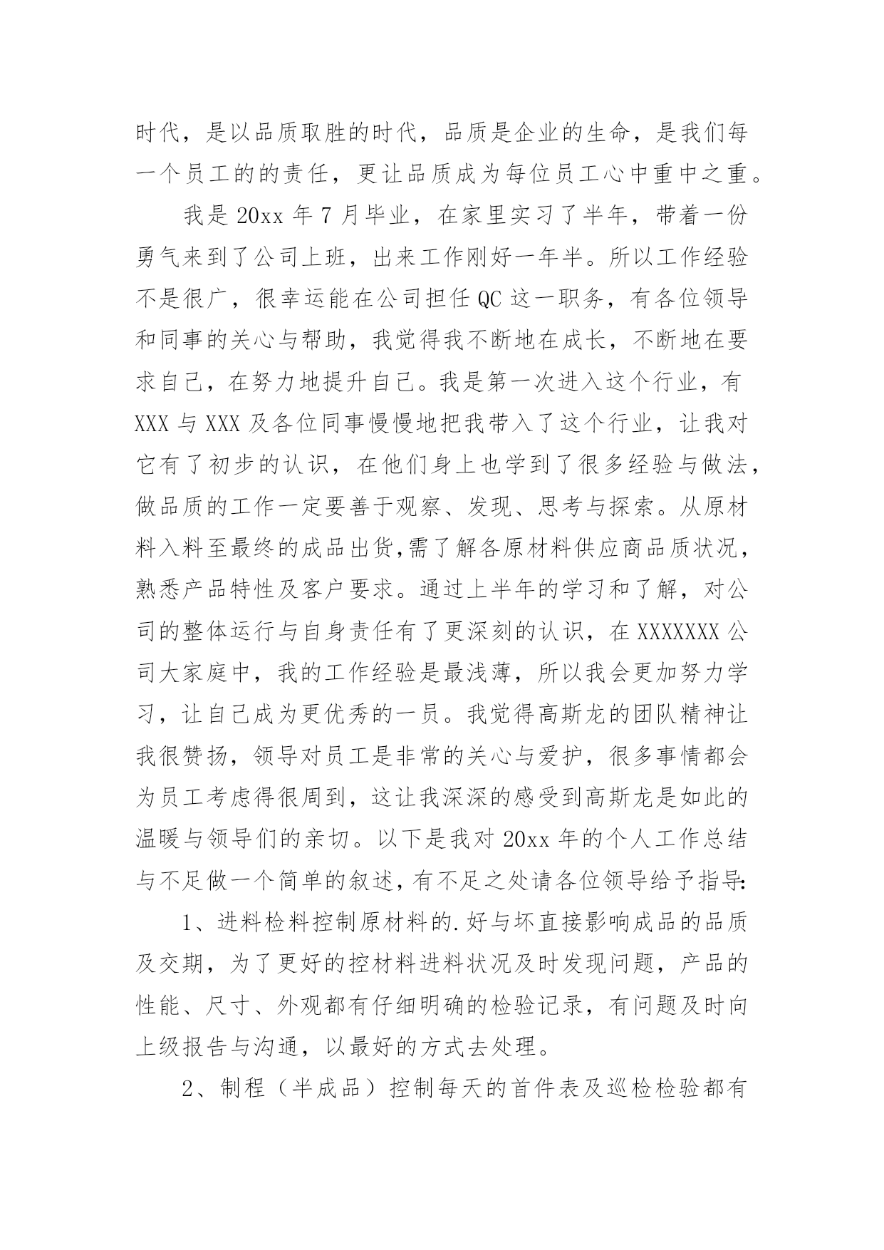 QC工作总结QC工作总结【合集】总结是对取得的成绩、存在的问题及得到的经验和教训等方面情况进行评价与描述的一种书面材料,它是增长才干的一种好办法,因此十分有必须要写一份总结哦。如何把总结做到重点突出呢?以下是小编帮大家整理的QC工作总结,希望对大家有所帮助。QC工作总结1回顾20xx年过去的半年里,在公司领导的正确领导和无微不至的关怀下;在各基层单位的大力支持下;在监理单位、业主、设计单位以及各部门的协同努力下;并在有限公司系统的指导下;工程技术质量部门在工程技术质量监督、群众性qc小组活动、质量创优、新开工项目策划等方面作了一定的工作,也取得了一定的成绩,并克服了一切不利因素,保证了各个项目工程建设的顺利进行。我们质量技术管理部门始终围绕公司的质量管理工作目标,认真贯彻落实上级工作会议精神,已落实公司的工作部署为中西,建立健全质量管理体系,落实质量管理职责,不断持续改进质量体系,将各个部门的相关质量制度和措施纳入到质量体系文件和岗位规范中,促进质量管理,并进一步加强现场质量管理,加大服务力度,已关键工序、新工艺和技术为重点,强化质量日常监督检查,查隐患,补漏洞,切实为”质量效益型“管理目标保驾护航。由于制度不断完善,责任明确到人,公司全体职工的质量意识都有很大的提高,实现了年度产品交验合格率100%,单元工程优良率95%,业主满意度92%,杜绝了施工质量事故的发生,确保持续改进措施的有效落实,实现了年度质量管理目标。但仍然存在不足之处,我们将通过不断总结和数据分析,找出工作中存在的不足以便在今后的工作中继续完善和改进。一年来,我们主要做了以下工作:一、建立质量保证体系,健全质量管理组织机构体系自公司组建成立以来,我质量技术管理部门迅速建立质量,技术管理组织机构,并建立了以总工领导负责,质量技术部监督检查,各个项目部实施的质量保证体系。二、进行制度建设,完善质量管理制度。为保证质量管理工作有章可循,根据公司各个项目的特点和《公司管理手册》制定了各项质量管理制度和岗位职责。1、责任到岗,制度到人,责任到工序公司以总工为核心的质量保证体系,明确部门,各个项目的质量工作职责与责任人,同时,在关键工序和新工艺施工时重点控制,设置专人负责过程质量控制。2、质量与进度奖挂钩结合各个项目工程实际情况及工程特点,在工程质量管理上,实行质量与进度奖挂钩,即在每个月进行生产进度评比时,把质量指标作为一项重要条件,如果质量指标完不成,进度指标完成的再好也不能得奖,这样以来调动了工区的质量主观能动性。使质量管理由被动变为自觉,提高了工程的施工质量。1质量管理规章制度的制定与落实情况。a、由公司牵头,质量技术部在施工现场进行各个施工工序重要环节的交底,使施工人员了解施工项目的概括,内容,施工目的,重点,难点,明确各个施工过程,质量标准,安全措施,环保措施,节约措施和工期要求等,做到心中有数,使施工技术管理水平大幅提高,保证了施工质量。b、推行质量责任制,强化“三检“制度。实行质量责任制,项目经理与各个项目负责人及劳务队伍签订质量责任书,明确质量责任,严格实行初检、项目复检,质量技术部门终检的“三检“制度,上一道工序不合格,下一道工序不开工,经过”三检“制度合格后,申请监理验收,c、实行交接班制度,严格质量值班每班做好施工记录,质量记录,并对下一道工序进行签字交接,对施工过程中出现的问题进行特别说明,并查找分析问题出现的原因,解决问题,不能使存在的问题过夜,为加强现场技术指导与质量控制,要求现场值班人员,质检员严格控制施工质量。3、质量保证体系运行情况项目工程的质检、技术、实验、测量、物资、调度、等各自认真履行自己的质量责任,质量保证体系运行正常。由于各项目的建设任务不一样,所以根据实际情况定出合理的专职质量检查人员。每月质量技术部对巡检发现的问题,下发质量整改通知单,限期限时整改,通过整改,取得了明显的效果,同时每月根据不同的质量问题召开针对性德质量专题会议,针对发现的复杂问题进行技术讨论,分析,根据分析结果确定下一步的施工方法。通过专题会议的研究,使施工得以顺利进行,施工质量得到了保证。4、主要质量控制活动1组织质量检查,进行互检,互相学习,不断提高。。在施工过程中,由公司总工牵头组织项目例行检查制度,对发现的问题及时下发整改通知单,限期整改,对发现的技术难题,由质量技术部门研究整改措施,并组织技术交底,认真整改,并进行质量巡视,。由公司质量技术部门牵头,组织各个工区的施工员,质检员分别到公司进行质量、安全和技术学习。去他人之长,形成互补之势,不仅优化了施工工艺,而且提高了施工质量和施工进度。2召开质量专题会议,加强质量意识。根据各个阶段的工序质量情况,每月在施工现场会议室召开了质量例会和质量专题会议,会议由主管质量技术的总工主持,由质量技术部负