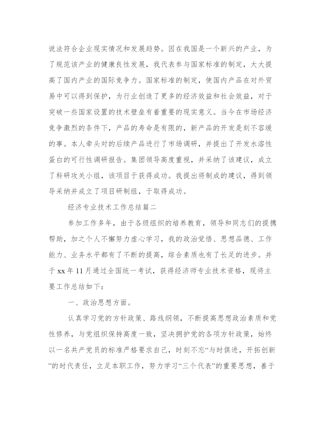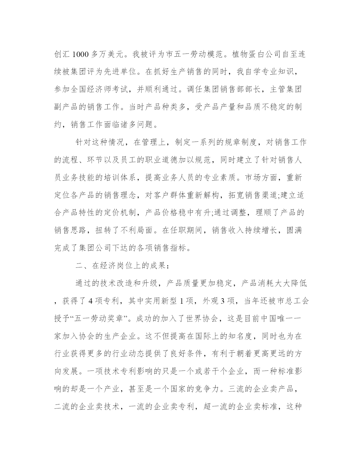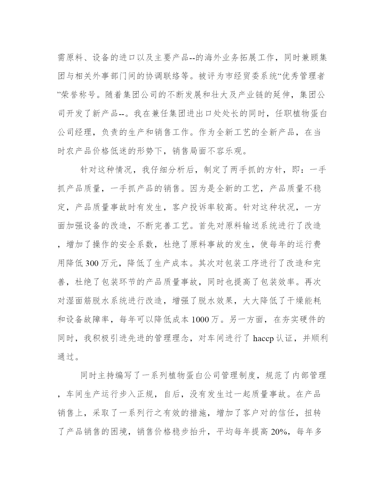 最新经济专业技术工作总结(优质13篇)8.总结应该注重事实的记录,充分反映实际情况,不偏离事实真相。总结要写出自己的真实感受和思考,避免敷衍和机械地堆砌文字。看看这些总结范文,我们可以发现写作的不同风格和技巧。经济专业技术工作总结篇一男,现年x岁,xx人,大专学历,_党员,经济师,现任股份公司常务副总经理。我于年进入工作至今,一直从事经济工作,曾任经营办公室副主任,植物蛋白公司经理兼集团进出口处处长,销售部部长,股份公司常务副总等职务。在思想政治上,我始终严格要求自己,不断加强新时期各种政治理论的学习,不断提高自己的政治修养和觉悟,处处以一个_员的标准严格要求自己。在工作上,本人本着求真务实,科学发展的理念,不断加强专业知识的学习,理论联系实际,创新管理方法,重视新技术新产品的开发应用,扎实推进各项工作,使自己的工作能力、业务水平和综合能力有了不断的提高,工作上取得了较为明显的成效,多次受到集团公司的表彰。现将自己的工作总结如下:一、从事经济工作的基本情况:我于1982年参加工作以来,一直从事经济工作。1992年任集团公司经营办副主任,协助经营厂长协调各经营部门间以及经营与生产部门的联动工作。被任命为集团进出口处处长,主要负责集团公司所需原料、设备的进口以及主要产品--的海外业务拓展工作,同时兼顾集团与相关外事部门间的协调联络等。被评为市经贸委系统“优秀管理者”荣誉称号。随着集团公司的不断发展和壮大及产业链的延伸,集团公司开发了新产品--。我在兼任集团进出口处处长的同时,任职植物蛋白公司经理,负责的生产和销售工作。作为全新工艺的全新产品,在当时农产品价格低迷的形势下,销售局面不容乐观。针对这种情况,我仔细分析后,制定了两手抓的方针,即:一手抓产品质量,一手抓产品的销售。因为是全新的工艺,产品质量不稳定,产品质量事故时有发生,客户投诉率较高。针对这种状况,一方面加强设备的改造,不断完善工艺。首先对原料输送系统进行了改造,增加了操作的安全系数,杜绝了原料事故的发生,使每年的运行费用降低300万元,降低了生产成本。其次对包装工序进行了改造和完善,杜绝了包装环节的产品质量事故,同时也提高了包装效率。再次对湿面筋脱水系统进行改造,增强了脱水效果,大大降低了干燥能耗和设备故障率,每年可以降低成本1000万。另一方面,在夯实硬件的同时,我积极引进先进的管理理念,对车间进行了haccp认证,并顺利通过。同时主持编写了一系列植物蛋白公司管理制度,规范了内部管理,车间生产运行步入正规,自后,没有发生过一起质量事故。在产品销售上,采取了一系列行之有效的措施,增加了客户对的信任,扭转了产品销售的困境,销售价格稳步抬升,平均每年提高20%,每年多创汇1000多万美元。我被评为市五一劳动模范。植物蛋白公司自至连续被集团评为先进单位。在抓好生产销售的同时,我自学专业知识,参加全国经济师考试,并顺利通过。调任集团销售部部长,主管集团副产品的销售工作。当时产品种类多,受产品产量和品质不稳定的制约,销售工作面临诸多问题。针对这种情况,在管理上,制定一系列的规章制度,对销售工作的流程、环节以及员工的职业道德加以规范,同时建立了针对销售人员业务技能的培训体系,提高业务人员的专业素质。市场方面,重新定位各产品的销售理念,对客户群体重新解构,拓宽销售渠道;建立适合产品特性的定价机制,产品价格稳中有升;通过调整,理顺了产品的销售思路,扭转了不利局面。在任职期间,销售收入持续增长,圆满完成了集团公司下达的各项销售指标。二、在经济岗位上的成果:通过的技术改造和升级,产品质量更加稳定,产品消耗大大降低,获得了4项专利,其中实用新型1项,外观3项,当年还被市总工会授予“五一劳动奖章”。成功的加入了世界协会,这是目前中国唯一一家加入协会的生产企业。这不但提高在国际上的知名度,同时也为在行业获得更多的行业动态提供了良好条件,有利于朝着更高更远的方向发展。一项技术专利影响的只是一个或若干个企业,而一种标准影响的却是一个产业,甚至是一个国家的竞争力。三流的企业卖产品,二流的企业卖技术,一流的企业卖专利,超一流的企业卖标准,这种说法符合企业现实情况和发展趋势。因在我国是一个新兴的产业,为了规范该产业的健康良性发展,我代表参与国家标准的制定,大大提高了国内产业的国际竞争力。国家标准的制定,使国内产品在对外贸易中可以得到保护,为行业创造了更多的经济效益和社会效益,对于突破一些国家设置的技术壁垒有着重要的现实意义。当今在市场经济竞争激烈的条件下,产品的寿命是有限的,新产品的开发是刻不容缓的事。本人牵头对的后续产品进行了市场调研,并提出了开发水溶性蛋白的可行性调研报告。集团领导高度重视,并采纳了该建议,成立了科研攻关小组,该项目于获得成功。我提出将制成的建议,得到领导采纳并成