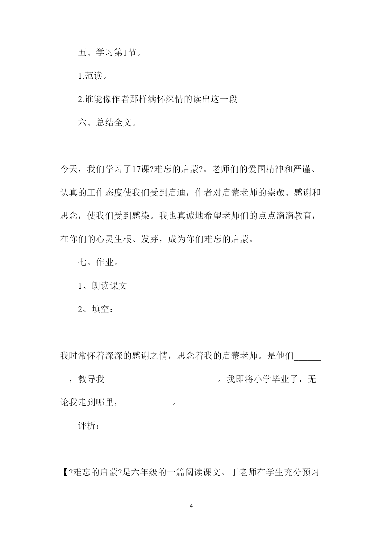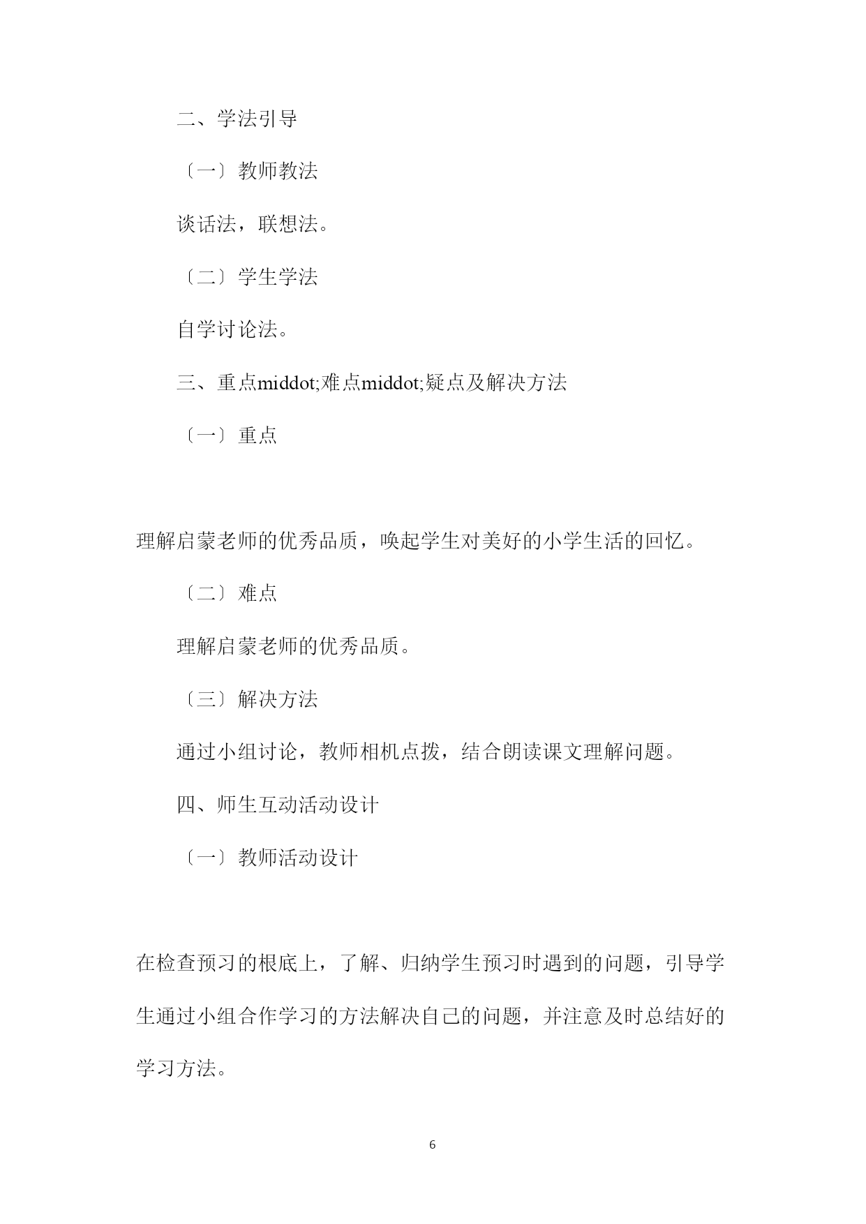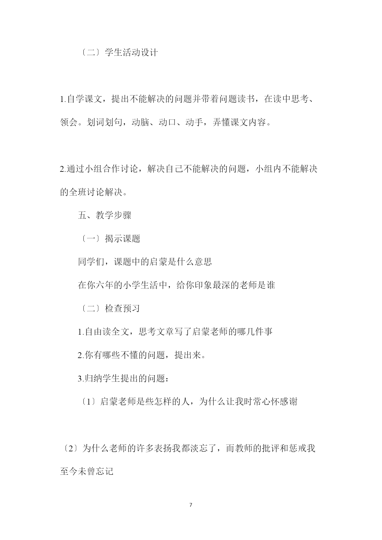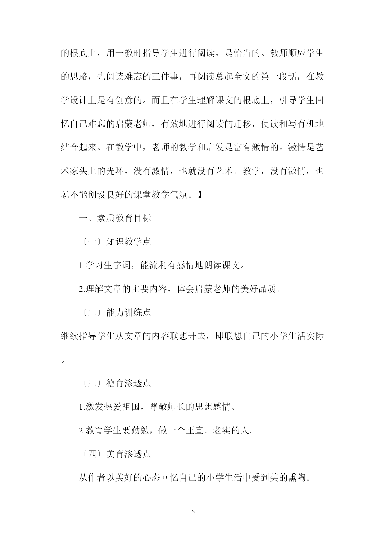 PAGEPAGE10?难忘的启蒙?教学设计资料教学目标:1、能正确、流利、有感情地朗读课文。2、理解课文内容,感悟老师们的爱国精神和严谨、认真的工作态度,体会作者对启蒙老师崇敬、感谢和思念的思想感情。教学过程:一、检查导入。同学们,有一位北京大学的教授,叫沙健孙。他写了一篇文章,思念他的启蒙老师。这篇文章,就是我们今天要学习的17课?难忘的启蒙?。大家已经预习,谁来说说题目中启蒙的意思。老师的启蒙,为什么使作者难忘呢他在文中写下了哪几件令他难忘的事情呢学生交流后,归纳板书:抗日讲演、老师对我的两次批评、抵抗日语课。二、学习2~5小节。1、同学们,边读边想是很重要的阅读方法和良好的学习习惯。下面,请你们用心去读读2~5节,想一想,这是老师对学生什么的启蒙作者现在回想这件事时,心情怎么样2、指名朗读。想一想,我们应该用怎样的感情来朗读3、日本侵略者残忍地虐杀中国人民。就在这个时候,老师在学校组织抗日讲演比赛,以此来激发学生的爱国热情。老师们强烈的爱国情感和革命的勇气,怎么不令学生敬佩呢三、学习6~7节。1、批评,是老师经常用的教育方式,即使是好同学也不例外。作者在上小学时,有两个强项,可就在这两个强项上,作者也受到过老师的批评。那到底是怎么回事呢2、学生默读课文。3、指名根据插图简单介绍老师对我的两次批评。4、同学们都了解了事情的前因后果,可有一点你们还不知道,作者在受到批评后,还对老师说了一些话。想一想,他会对老师说些什么5、虽然事隔多年,但这样的批评还是刻骨铭心。同学们,你在六年的小学生活中也有类似的情景吗四、学习第8节。1、在学生的眼里,老师是和蔼可亲的,但是又是严厉的。作者的老师也是这样。但是,老师对作者的一门课的学习态度特别宽容,为什么2、学生参考资料,联系课文讨论。3、出示填空:严是因为----------------------;宽是因为----------------------------。4、老师教育我的事还有很多很多,不仅鼓励我在知识的海洋里遨游,而且教育我应该做一个正直的人,给我精神力量!五、学习第1节。1.范读。2.谁能像作者那样满怀深情的读出这一段六、总结全文。今天,我们学习了17课?难忘的启蒙?。老师们的爱国精神和严谨、认真的工作态度使我们受到启迪,作者对启蒙老师的崇敬、感谢和思念,使我们受到感染。我也真诚地希望老师们的点点滴滴教育,在你们的心灵生根、发芽,成为你们难忘的启蒙。七。作业。1、朗读课文2、填空:我时常怀着深深的感谢之情,思念着我的启蒙老师。是他们________,教导我_________________________。我即将小学毕业了,无论我走到哪里,___________。评析:【?难忘的启蒙?是六年级的一篇阅读课文。丁老师在学生充分预习的根底上,用一教时指导学生进行阅读,是恰当的。教师顺应学生的思路,先阅读难忘的三件事,再阅读总起全文的第一段话,在教学设计上是有创意的。而且在学生理解课文的根底上,引导学生回忆自己难忘的启蒙老师,有效地进行阅读的迁移,使读和写有机地结合起来。在教学中,老师的教学和启发是富有激情的。激情是艺术家头上的光环,没有激情,也就没有艺术。教学,没有激情,也就不能创设良好的课堂教学气氛。】一、素质教育目标〔一〕知识教学点1.学习生字词,能流利有感情地朗读课文。2.理解文章的主要内容,体会启蒙老师的美好品质。〔二〕能力训练点继续指导学生从文章的内容联想开去,即联想自己的小学生活实际。〔三〕德育渗透点1.激发热爱祖国,尊敬师长的思想感情。2.教育学生要勤勉,做一个正直、老实的人。〔四〕美育渗透点从作者以美好的心态回忆自己的小学生活中受到美的熏陶。二、学法引导〔一〕教师教法谈话法,联想法。〔二〕学生学法自学讨论法。三、重点middot;难点middot;疑点及解决方法〔一〕重点理解启蒙老师的优秀品质,唤起学生对美好的小学生活的回忆。〔二〕难点理解启蒙老师的优秀品质。〔三〕解决方法通过小组讨论,教师相机点拨,结合朗读课文理解问题。四、师生互动活动设计〔一〕教师活动设计在检查预习的根底上,了解、归纳学生预习时遇到的问题,引导学生通过小组合作学习的方法解决自己的问题,并注意及时总结好的学习方法。〔二〕学生活动设计1.自学课文,提出不能解决的问题并带着问题读书,在读中思考、领会。划词划句,动脑、动口、动手,弄懂课文内容。2.通过小组合作讨论,解决自己不能解决的问题,小组内不能解决的全班讨论解决。五、教学步骤〔一〕揭示课题同学们,课题中的启蒙是什么意思在你六年的小学生活中,给你印象最深的老师是谁〔二〕检查预