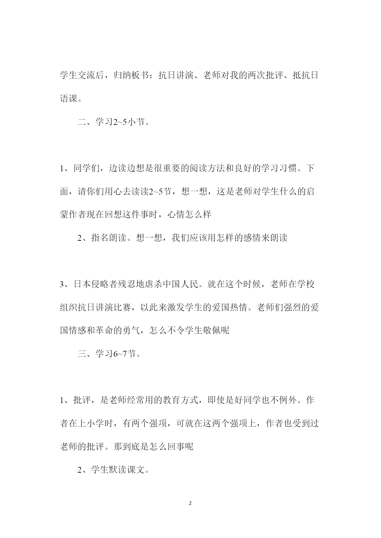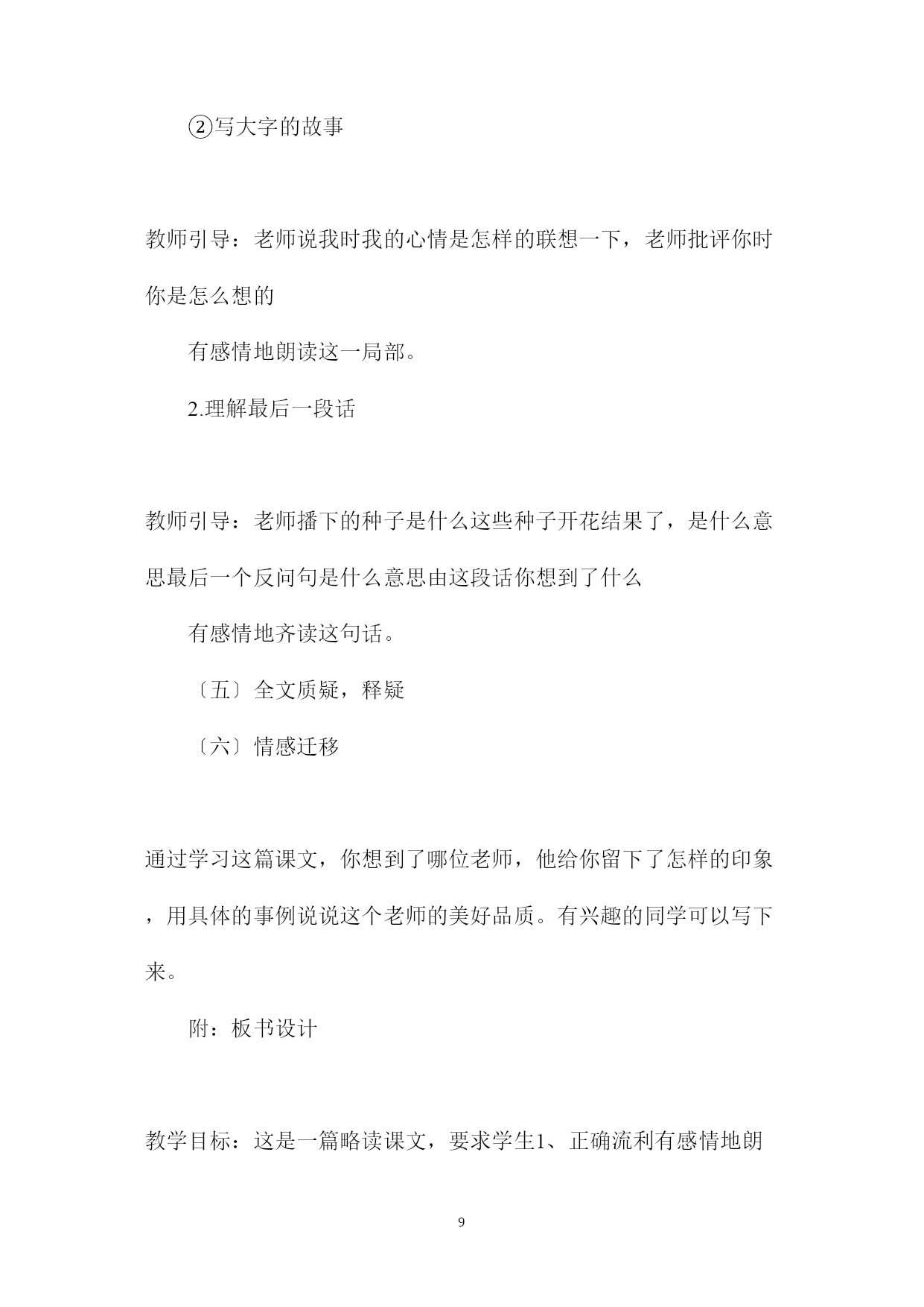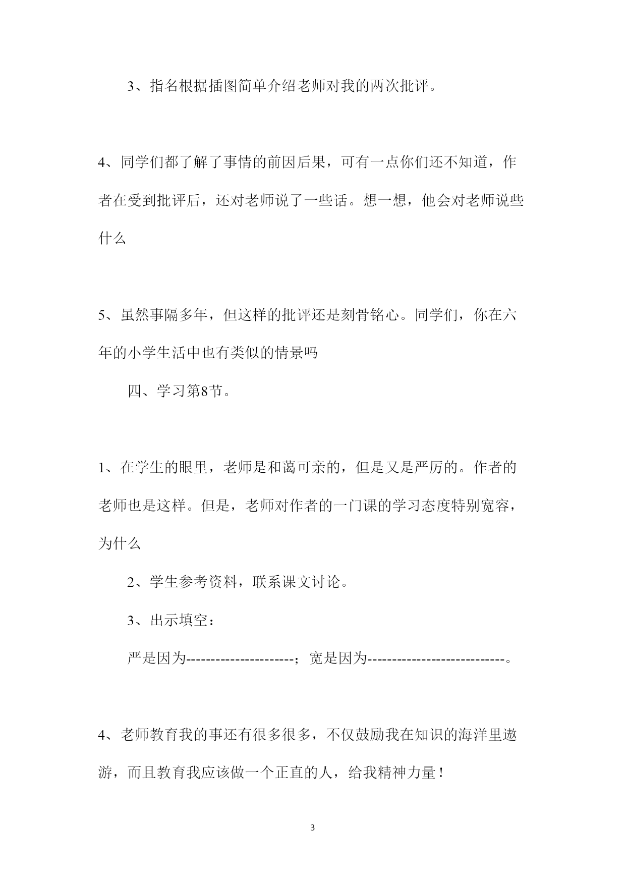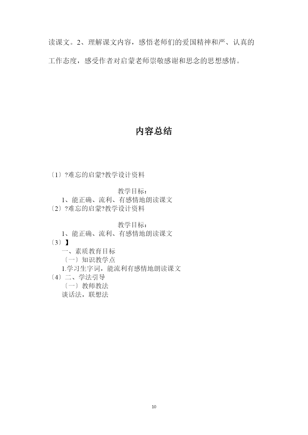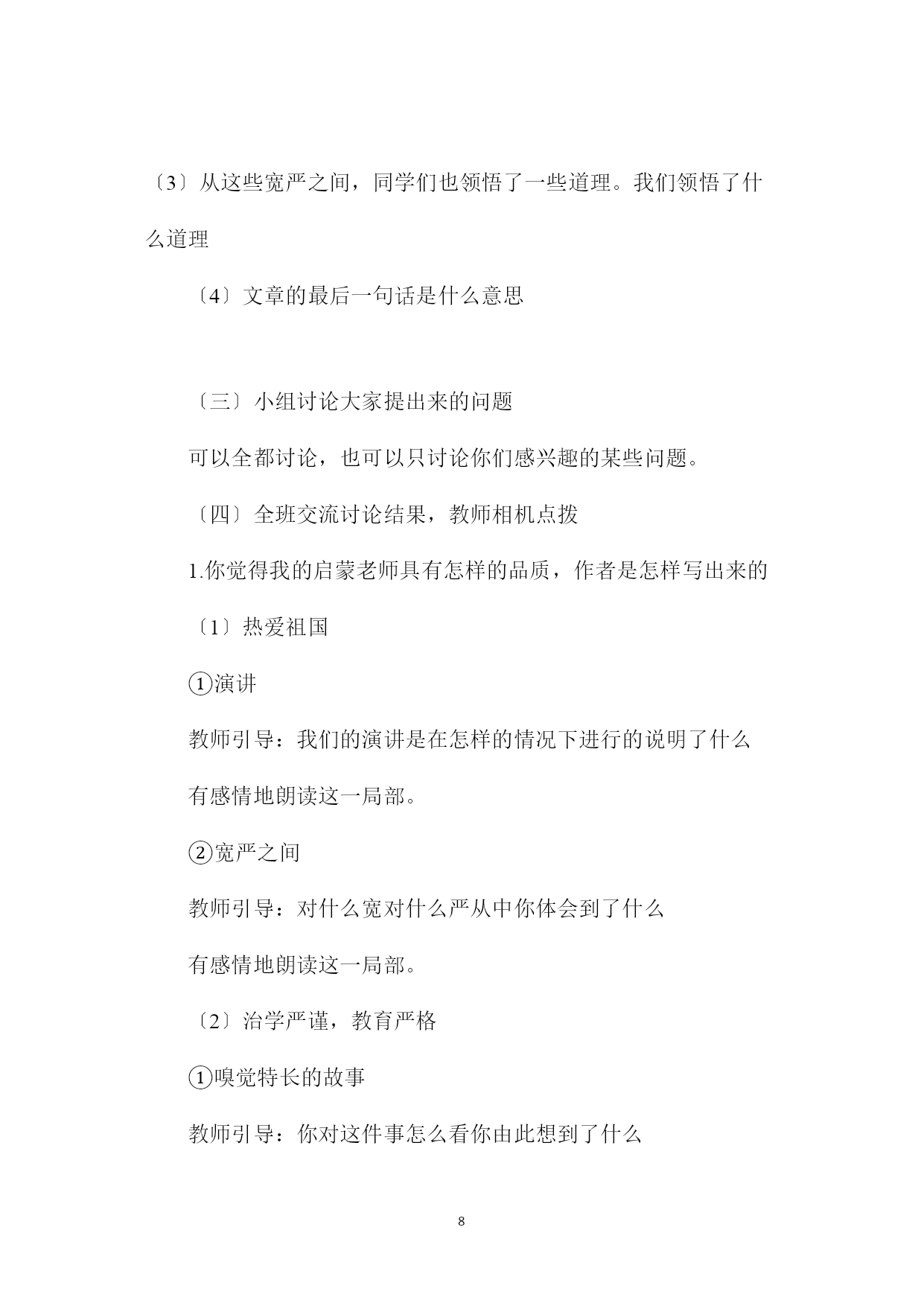 PAGEPAGE10?难忘的启蒙?教学设计资料教学目标:1、能正确、流利、有感情地朗读课文。2、理解课文内容,感悟老师们的爱国精神和严谨、认真的工作态度,体会作者对启蒙老师崇敬、感谢和思念的思想感情。教学过程:一、检查导入。同学们,有一位北京大学的教授,叫沙健孙。他写了一篇文章,思念他的启蒙老师。这篇文章,就是我们今天要学习的17课?难忘的启蒙?。大家已经预习,谁来说说题目中启蒙的意思。老师的启蒙,为什么使作者难忘呢他在文中写下了哪几件令他难忘的事情呢学生交流后,归纳板书:抗日讲演、老师对我的两次批评、抵抗日语课。二、学习2~5小节。1、同学们,边读边想是很重要的阅读方法和良好的学习习惯。下面,请你们用心去读读2~5节,想一想,这是老师对学生什么的启蒙作者现在回想这件事时,心情怎么样2、指名朗读。想一想,我们应该用怎样的感情来朗读3、日本侵略者残忍地虐杀中国人民。就在这个时候,老师在学校组织抗日讲演比赛,以此来激发学生的爱国热情。老师们强烈的爱国情感和革命的勇气,怎么不令学生敬佩呢三、学习6~7节。1、批评,是老师经常用的教育方式,即使是好同学也不例外。作者在上小学时,有两个强项,可就在这两个强项上,作者也受到过老师的批评。那到底是怎么回事呢2、学生默读课文。3、指名根据插图简单介绍老师对我的两次批评。4、同学们都了解了事情的前因后果,可有一点你们还不知道,作者在受到批评后,还对老师说了一些话。想一想,他会对老师说些什么5、虽然事隔多年,但这样的批评还是刻骨铭心。同学们,你在六年的小学生活中也有类似的情景吗四、学习第8节。1、在学生的眼里,老师是和蔼可亲的,但是又是严厉的。作者的老师也是这样。但是,老师对作者的一门课的学习态度特别宽容,为什么2、学生参考资料,联系课文讨论。3、出示填空:严是因为----------------------;宽是因为----------------------------。4、老师教育我的事还有很多很多,不仅鼓励我在知识的海洋里遨游,而且教育我应该做一个正直的人,给我精神力量!五、学习第1节。1.范读。2.谁能像作者那样满怀深情的读出这一段六、总结全文。今天,我们学习了17课?难忘的启蒙?。老师们的爱国精神和严谨、认真的工作态度使我们受到启迪,作者对启蒙老师的崇敬、感谢和思念,使我们受到感染。我也真诚地希望老师们的点点滴滴教育,在你们的心灵生根、发芽,成为你们难忘的启蒙。七。作业。1、朗读课文2、填空:我时常怀着深深的感谢之情,思念着我的启蒙老师。是他们________,教导我_________________________。我即将小学毕业了,无论我走到哪里,___________。评析:【?难忘的启蒙?是六年级的一篇阅读课文。丁老师在学生充分预习的根底上,用一教时指导学生进行阅读,是恰当的。教师顺应学生的思路,先阅读难忘的三件事,再阅读总起全文的第一段话,在教学设计上是有创意的。而且在学生理解课文的根底上,引导学生回忆自己难忘的启蒙老师,有效地进行阅读的迁移,使读和写有机地结合起来。在教学中,老师的教学和启发是富有激情的。激情是艺术家头上的光环,没有激情,也就没有艺术。教学,没有激情,也就不能创设良好的课堂教学气氛。】一、素质教育目标〔一〕知识教学点1.学习生字词,能流利有感情地朗读课文。2.理解文章的主要内容,体会启蒙老师的美好品质。〔二〕能力训练点继续指导学生从文章的内容联想开去,即联想自己的小学生活实际。〔三〕德育渗透点1.激发热爱祖国,尊敬师长的思想感情。2.教育学生要勤勉,做一个正直、老实的人。〔四〕美育渗透点从作者以美好的心态回忆自己的小学生活中受到美的熏陶。二、学法引导〔一〕教师教法谈话法,联想法。〔二〕学生学法自学讨论法。三、重点middot;难点middot;疑点及解决方法〔一〕重点理解启蒙老师的优秀品质,唤起学生对美好的小学生活的回忆。〔二〕难点理解启蒙老师的优秀品质。〔三〕解决方法通过小组讨论,教师相机点拨,结合朗读课文理解问题。四、师生互动活动设计〔一〕教师活动设计在检查预习的根底上,了解、归纳学生预习时遇到的问题,引导学生通过小组合作学习的方法解决自己的问题,并注意及时总结好的学习方法。〔二〕学生活动设计1.自学课文,提出不能解决的问题并带着问题读书,在读中思考、领会。划词划句,动脑、动口、动手,弄懂课文内容。2.通过小组合作讨论,解决自己不能解决的问题,小组内不能解决的全班讨论解决。五、教学步骤〔一〕揭示课题同学们,课题中的启蒙是什么意思在你六年的小学生活中,给你印象最深的老师是谁〔二〕检查预