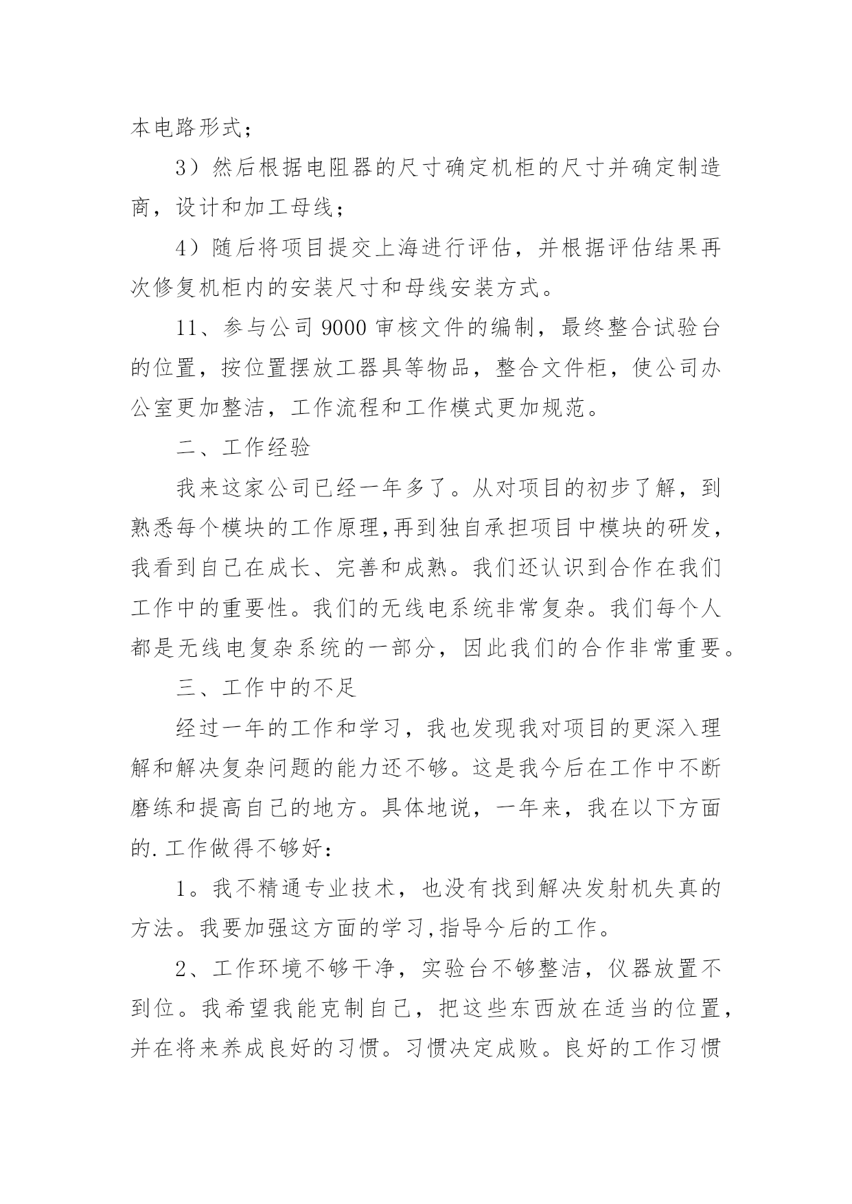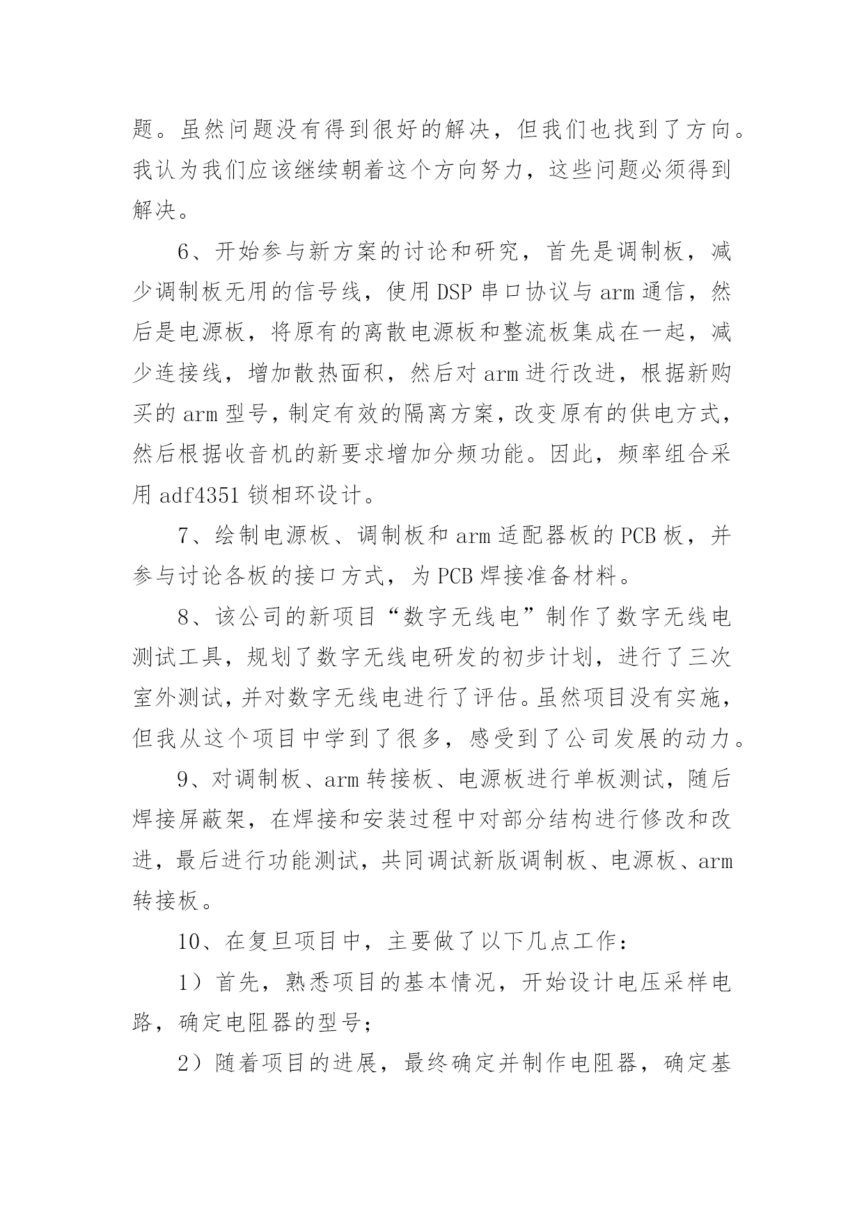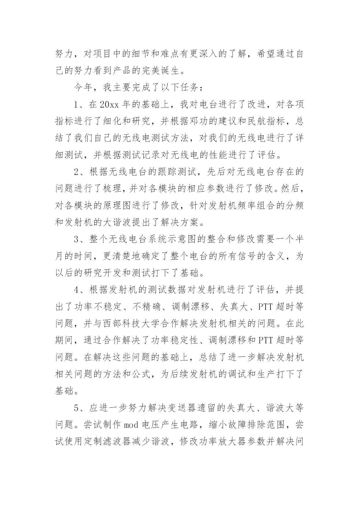 卫生专业技术人员工作总结卫生专业技术人员工作总结范文(通用6篇)不经意间,工作已经告一段落,回顾这段时间的工作,一定有许多的艰难困苦,这时候,最关键的工作总结怎么能落下!你所见过的工作总结应该是什么样的?以下是小编为大家收集的卫生专业技术人员工作总结范文(通用6篇),仅供参考,欢迎大家阅读。卫生专业技术人员工作总结120xx年即将结束。回顾过去一年的工作,总结这一年的得失,我感慨万千。一年来,我热爱自己的工作,严格要求自己,端正工作岗位,始终坚持“谦虚”、“谨慎”、“自律”的态度。在领导的关心培养和同事的帮助支持下,我们始终努力学习,开拓进取,自强不息,认真完成任务,履行岗位职责。作为一名硬件工程师,但在我心中,陕西德荣是我的家,领导是我的父母,同事是我的兄弟姐妹,德荣的事业是我自己的事业。我希望通过不懈的努力,完善公司的项目,使我们陕西德荣的产品尽快推向市场。我理解我作为陕西德隆的硬件工程师的责任和义务。回顾过去一年,我从以下几个方面总结了自己的工作:一、年度工作情景在过去的一年中,我逐渐从熟悉公司的项目成长为能够承担公司项目的一些模块,并在这些方面为公司做出了应有的贡献,就我个人而言,我的能力也相应提高了。但是,公司的项目比较复杂,还有很多东西需要学习,所以我会继续努力,对项目中的细节和难点有更深入的了解,希望通过自己的努力看到产品的完美诞生。今年,我主要完成了以下任务:1、在20xx年的基础上,我对电台进行了改进,对各项指标进行了细化和研究,并根据邓功的建议和民航指标,总结了我们自己的无线电测试方法,对我们的无线电进行了详细测试,并根据测试记录对无线电的性能进行了评估。2、根据无线电台的跟踪测试,先后对无线电台存在的问题进行了梳理,并对各模块的相应参数进行了修改。然后,对各模块的原理图进行了修改,针对发射机频率组合的分频和发射机的大谐波提出了解决方案。3、整个无线电台系统示意图的整合和修改需要一个半月的时间,更清楚地确定了整个电台的所有信号的含义,为以后的研究开发和测试打下了基础。4、根据发射机的测试数据对发射机进行了评估,并提出了功率不稳定、不精确、调制漂移、失真大、PTT超时等问题,并与西部科技大学合作解决发射机相关的问题。在此期间,通过合作解决了功率稳定性、调制漂移和PTT超时等问题。在解决这些问题的基础上,总结了进一步解决发射机相关问题的方法和公式,为后续发射机的调试和生产打下了基础。5、应进一步努力解决变送器遗留的失真大、谐波大等问题。尝试制作mod电压产生电路,缩小故障排除范围,尝试使用定制滤波器减少谐波,修改功率放大器参数并解决问题。虽然问题没有得到很好的解决,但我们也找到了方向。我认为我们应该继续朝着这个方向努力,这些问题必须得到解决。6、开始参与新方案的讨论和研究,首先是调制板,减少调制板无用的信号线,使用DSP串口协议与arm通信,然后是电源板,将原有的离散电源板和整流板集成在一起,减少连接线,增加散热面积,然后对arm进行改进,根据新购买的arm型号,制定有效的隔离方案,改变原有的供电方式,然后根据收音机的新要求增加分频功能。因此,频率组合采用adf4351锁相环设计。7、绘制电源板、调制板和arm适配器板的PCB板,并参与讨论各板的接口方式,为PCB焊接准备材料。8、该公司的新项目“数字无线电”制作了数字无线电测试工具,规划了数字无线电研发的初步计划,进行了三次室外测试,并对数字无线电进行了评估。虽然项目没有实施,但我从这个项目中学到了很多,感受到了公司发展的动力。9、对调制板、arm转接板、电源板进行单板测试,随后焊接屏蔽架,在焊接和安装过程中对部分结构进行修改和改进,最后进行功能测试,共同调试新版调制板、电源板、arm转接板。10、在复旦项目中,主要做了以下几点工作:1)首先,熟悉项目的基本情况,开始设计电压采样电路,确定电阻器的型号;2)随着项目的进展,最终确定并制作电阻器,确定基本电路形式;3)然后根据电阻器的尺寸确定机柜的尺寸并确定制造商,设计和加工母线;4)随后将项目提交上海进行评估,并根据评估结果再次修复机柜内的安装尺寸和母线安装方式。11、参与公司9000审核文件的编制,最终整合试验台的位置,按位置摆放工器具等物品,整合文件柜,使公司办公室更加整洁,工作流程和工作模式更加规范。二、工作经验我来这家公司已经一年多了。从对项目的初步了解,到熟悉每个模块的工作原理,再到独自承担项目中模块的研发,我看到自己在成长、完善和成熟。我们还认识到合作在我们工作中的重要性。我们的无线电系统非常复杂。我们每个人都是无线电复杂系统的一部分,因此我们的合作非常重要。三、工作中的不足经过一年的工作和学习,我也发现我对项目的更深入理解和解决复杂问题的能力还不够。这是我今后在工作中不断磨练和提高自己的地方。
