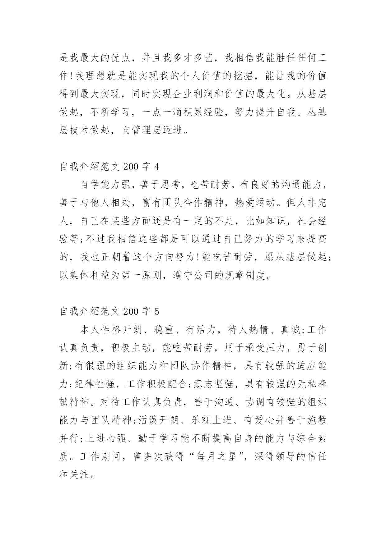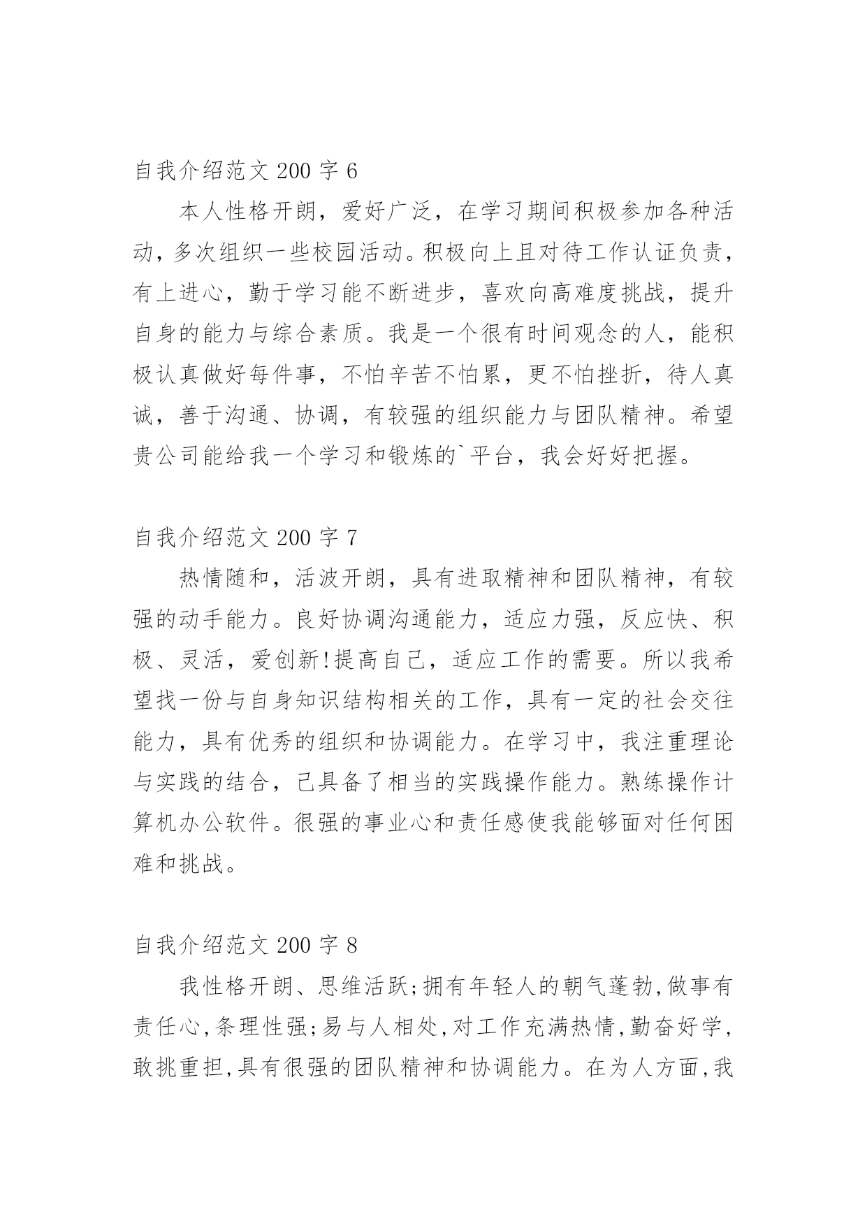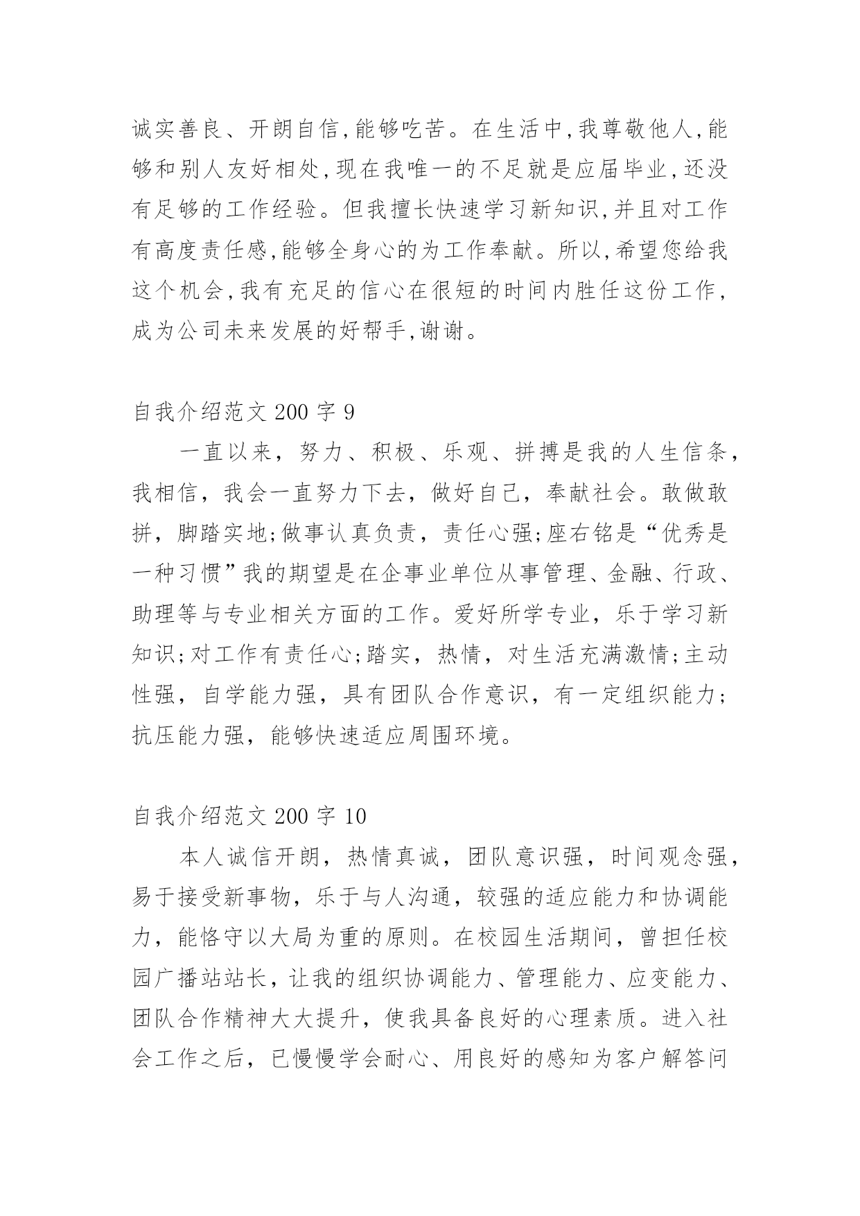 自我介绍自我介绍范文200字自我介绍范文200字1学习期间表现优秀,完成了机械设计,机械制造技术基础Ⅰ,理论力学,材料力学,结构力学,金属结构,液压与气压传动,机械工程控制基础,画法几何与机械制图等专业学科的学习;通过了英语四级,计算机C语言二级,全国计算机辅助技术应用工程师考试并获得相关证书。同时,本人工作认真负责,能吃苦耐劳,严格要求自己,上进心强,乐于挑战,对新的事物有较强的接受能力;有团队精神和敬业精神,性格随和开朗、待人诚恳、具有良好的人际关系。自我介绍范文200字2物流管理专业,拥有高级物流员资格证。为人乐观开朗,积极向上,勤奋努力,有团队合作精神,有责任心有耐心够细心。作为初学者,我具备出色的学习能力并且乐于学习、敢于创新,不断追求卓越;作为参与者,我具备诚实可信的品格、富有团队合作精神。希望通过工作自己可以得到一定的锻炼,丰富自身。自我介绍范文200字3本人有着较强的沟通表达能力,对工作有上进心、认真负责、待人真诚、处人随和!换位思考有自己独特的想法这是我最大的优点,并且我多才多艺,我相信我能胜任任何工作!我理想就是能实现我的个人价值的挖掘,能让我的价值得到最大实现,同时实现企业利润和价值的最大化。从基层做起,不断学习,一点一滴积累经验,努力提升自我。丛基层技术做起,向管理层迈进。自我介绍范文200字4自学能力强,善于思考,吃苦耐劳,有良好的沟通能力,善于与他人相处,富有团队合作精神,热爱运动。但人非完人,自己在某些方面还是有一定的不足,比如知识,社会经验等;不过我相信这些都是可以通过自己努力的学习来提高的,我也正朝着这个方向努力!能吃苦耐劳,愿从基层做起;以集体利益为第一原则,遵守公司的规章制度。自我介绍范文200字5本人性格开朗、稳重、有活力,待人热情、真诚;工作认真负责,积极主动,能吃苦耐劳,用于承受压力,勇于创新;有很强的组织能力和团队协作精神,具有较强的适应能力;纪律性强,工作积极配合;意志坚强,具有较强的无私奉献精神。对待工作认真负责,善于沟通、协调有较强的组织能力与团队精神;活泼开朗、乐观上进、有爱心并善于施教并行;上进心强、勤于学习能不断提高自身的能力与综合素质。工作期间,曾多次获得“每月之星”,深得领导的信任和关注。自我介绍范文200字6本人性格开朗,爱好广泛,在学习期间积极参加各种活动,多次组织一些校园活动。积极向上且对待工作认证负责,有上进心,勤于学习能不断进步,喜欢向高难度挑战,提升自身的能力与综合素质。我是一个很有时间观念的人,能积极认真做好每件事,不怕辛苦不怕累,更不怕挫折,待人真诚,善于沟通、协调,有较强的组织能力与团队精神。希望贵公司能给我一个学习和锻炼的`平台,我会好好把握。自我介绍范文200字7热情随和,活波开朗,具有进取精神和团队精神,有较强的动手能力。良好协调沟通能力,适应力强,反应快、积极、灵活,爱创新!提高自己,适应工作的需要。所以我希望找一份与自身知识结构相关的工作,具有一定的社会交往能力,具有优秀的组织和协调能力。在学习中,我注重理论与实践的结合,己具备了相当的实践操作能力。熟练操作计算机办公软件。很强的事业心和责任感使我能够面对任何困难和挑战。自我介绍范文200字8我性格开朗、思维活跃;拥有年轻人的朝气蓬勃,做事有责任心,条理性强;易与人相处,对工作充满热情,勤奋好学,敢挑重担,具有很强的团队精神和协调能力。在为人方面,我诚实善良、开朗自信,能够吃苦。在生活中,我尊敬他人,能够和别人友好相处,现在我唯一的不足就是应届毕业,还没有足够的工作经验。但我擅长快速学习新知识,并且对工作有高度责任感,能够全身心的为工作奉献。所以,希望您给我这个机会,我有充足的信心在很短的时间内胜任这份工作,成为公司未来发展的好帮手,谢谢。自我介绍范文200字9一直以来,努力、积极、乐观、拼搏是我的人生信条,我相信,我会一直努力下去,做好自己,奉献社会。敢做敢拼,脚踏实地;做事认真负责,责任心强;座右铭是“优秀是一种习惯”我的期望是在企事业单位从事管理、金融、行政、助理等与专业相关方面的工作。爱好所学专业,乐于学习新知识;对工作有责任心;踏实,热情,对生活充满激情;主动性强,自学能力强,具有团队合作意识,有一定组织能力;抗压能力强,能够快速适应周围环境。自我介绍范文200字10本人诚信开朗,热情真诚,团队意识强,时间观念强,易于接受新事物,乐于与人沟通,较强的适应能力和协调能力,能恪守以大局为重的原则。在校园生活期间,曾担任校园广播站站长,让我的组织协调能力、管理能力、应变能力、团队合作精神大大提升,使我具备良好的心理素质。进入社会工作之后,已慢慢学会耐心、用良好的感知为客户解答问题,已磨练出较强的忍耐力和意志力。