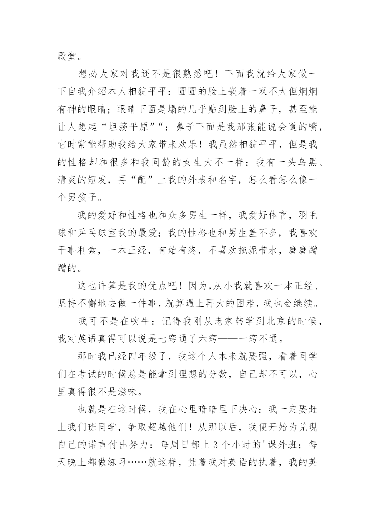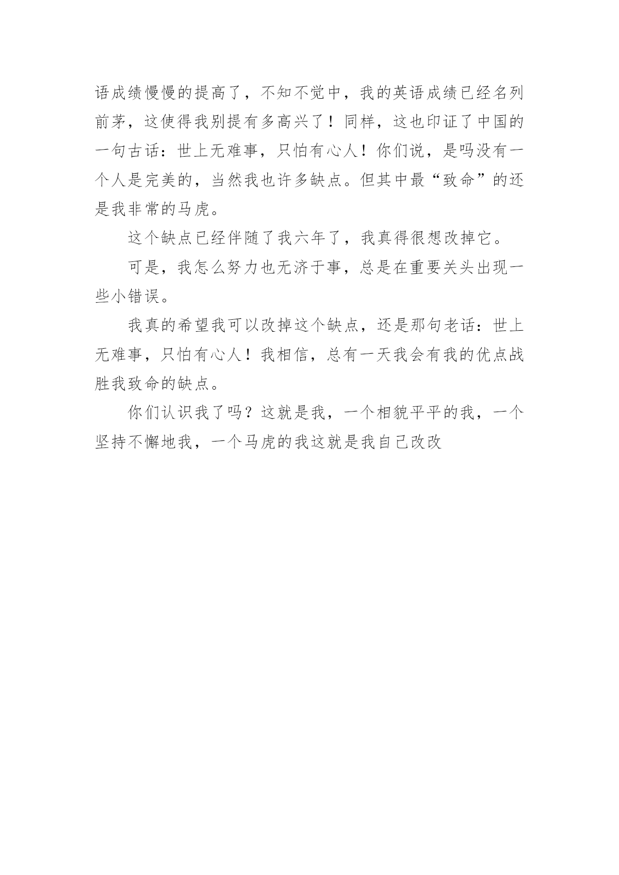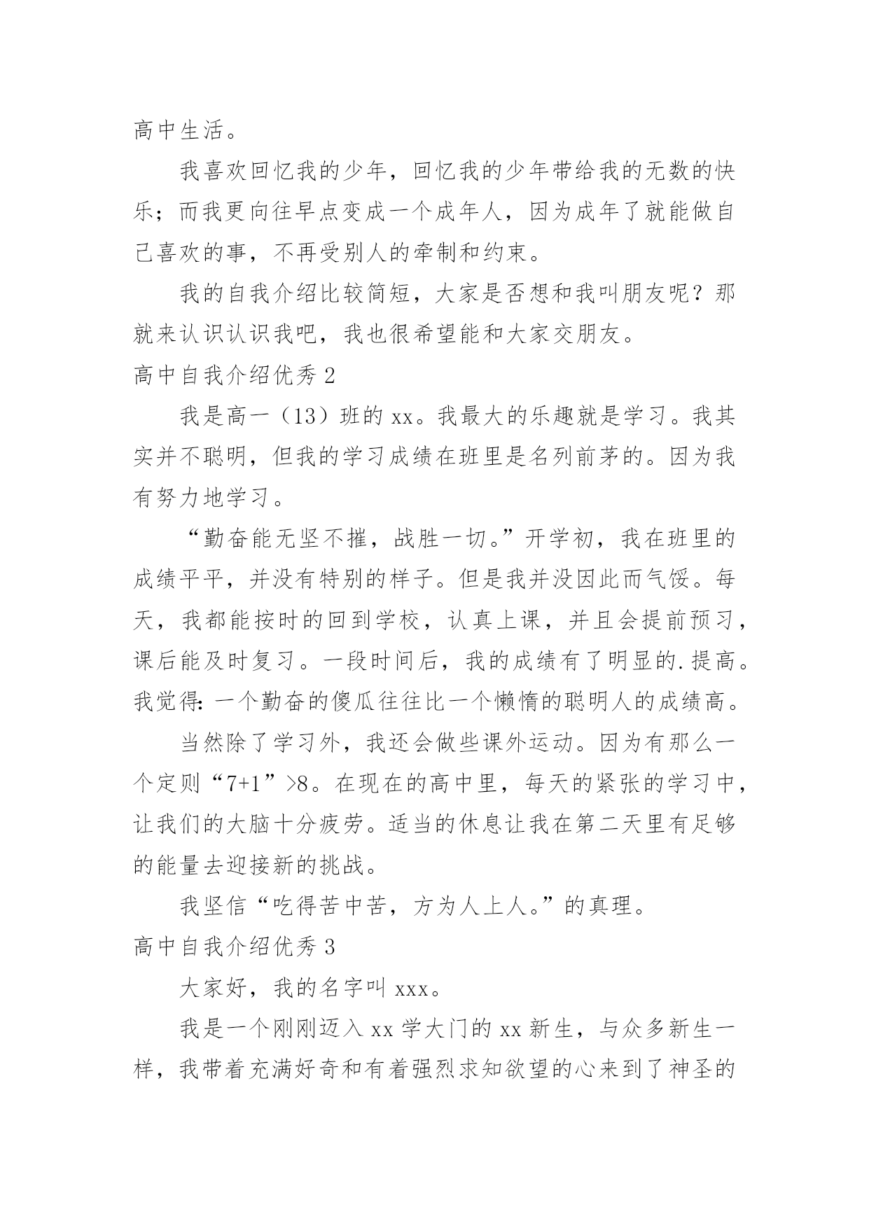 高中自我介绍优秀高中自我介绍优秀范例(3篇)来到一个完全陌生的环境,我们有必要进行适当的自我介绍,用自我介绍往往可以让他人有一定的了解。那么自我介绍应该包括什么内容呢?下面是小编帮大家整理的高中自我介绍优秀,希望对大家有所帮助。高中自我介绍优秀1大家好,高中将要和大家一起学习。我感到很兴奋。大家听完我简单的自我介绍,一定会喜欢跟我交朋友的。我叫邵健,我是个18岁的男孩。为什么叫男孩呢,因为我的心还是很弱小的,没有经过岁月的磨练。我也快是个要成年的男人了,因为我有男人所有的东西,呵呵。要向大家自我介绍,其实我也很为难。因为我自己都不是很了解自己。在别人严重我可能永远是快乐的,乐观的。可是我的.内心深处却经常为一些事伤心,焦虑,烦恼,甚至死心!我认为正式因为有痛苦才会有快乐,人生好比两杯酒,一杯苦酒,一杯甜酒。只是看你先喝哪一杯。人生可以分为七个阶段吧,幼年、童年少年、青年、成年、中年、老年。我们处于青年,是塑造我们人生价值关和目标的时候,我们以后将要成为一个怎样的人,主要的决定因素都会在接下来的高中三年中发生,所以我很期待以后的高中生活。我喜欢回忆我的少年,回忆我的少年带给我的无数的快乐;而我更向往早点变成一个成年人,因为成年了就能做自己喜欢的事,不再受别人的牵制和约束。我的自我介绍比较简短,大家是否想和我叫朋友呢?那就来认识认识我吧,我也很希望能和大家交朋友。高中自我介绍优秀2我是高一(13)班的xx。我最大的乐趣就是学习。我其实并不聪明,但我的学习成绩在班里是名列前茅的。因为我有努力地学习。“勤奋能无坚不摧,战胜一切。”开学初,我在班里的成绩平平,并没有特别的样子。但是我并没因此而气馁。每天,我都能按时的回到学校,认真上课,并且会提前预习,课后能及时复习。一段时间后,我的成绩有了明显的.提高。我觉得:一个勤奋的傻瓜往往比一个懒惰的聪明人的成绩高。当然除了学习外,我还会做些课外运动。因为有那么一个定则“7+1”>8。在现在的高中里,每天的紧张的学习中,让我们的大脑十分疲劳。适当的休息让我在第二天里有足够的能量去迎接新的挑战。我坚信“吃得苦中苦,方为人上人。”的真理。高中自我介绍优秀3大家好,我的名字叫xxx。我是一个刚刚迈入xx学大门的xx新生,与众多新生一样,我带着充满好奇和有着强烈求知欲望的心来到了神圣的殿堂。想必大家对我还不是很熟悉吧!下面我就给大家做一下自我介绍本人相貌平平:圆圆的脸上嵌着一双不大但炯炯有神的眼睛;眼睛下面是塌的几乎贴到脸上的鼻子,甚至能让人想起“坦荡平原”“;鼻子下面是我那张能说会道的嘴,它时常能帮助我给大家带来欢乐!我虽然相貌平平,但是我的性格却和很多和我同龄的女生大不一样:我有一头乌黑、清爽的短发,再“配”上我的外表和名字,怎么看怎么像一个男孩子。我的爱好和性格也和众多男生一样,我爱好体育,羽毛球和乒乓球室我的最爱;我的性格也和男生差不多,我喜欢干事利索,一本正经,有始有终,不喜欢拖泥带水,磨磨蹭蹭的。这也许算是我的优点吧!因为,从小我就喜欢一本正经、坚持不懈地去做一件事,就算遇上再大的困难,我也会继续。我可不是在吹牛:记得我刚从老家转学到北京的时候,我对英语真得可以说是七窍通了六窍——一窍不通。那时我已经四年级了,我这个人本来就要强,看着同学们在考试的时候总是能拿到理想的分数,自己却不可以,心里真得很不是滋味。也就是在这时候,我在心里暗暗里下决心:我一定要赶上我们班同学,争取超越他们!从那以后,我便开始为兑现自己的诺言付出努力:每周日都上3个小时的'课外班;每天晚上都做练习……就这样,凭着我对英语的执着,我的英语成绩慢慢的提高了,不知不觉中,我的英语成绩已经名列前茅,这使得我别提有多高兴了!同样,这也印证了中国的一句古话:世上无难事,只怕有心人!你们说,是吗没有一个人是完美的,当然我也许多缺点。但其中最“致命”的还是我非常的马虎。这个缺点已经伴随了我六年了,我真得很想改掉它。可是,我怎么努力也无济于事,总是在重要关头出现一些小错误。我真的希望我可以改掉这个缺点,还是那句老话:世上无难事,只怕有心人!我相信,总有一天我会有我的优点战胜我致命的缺点。你们认识我了吗?这就是我,一个相貌平平的我,一个坚持不懈地我,一个马虎的我这就是我自己改改