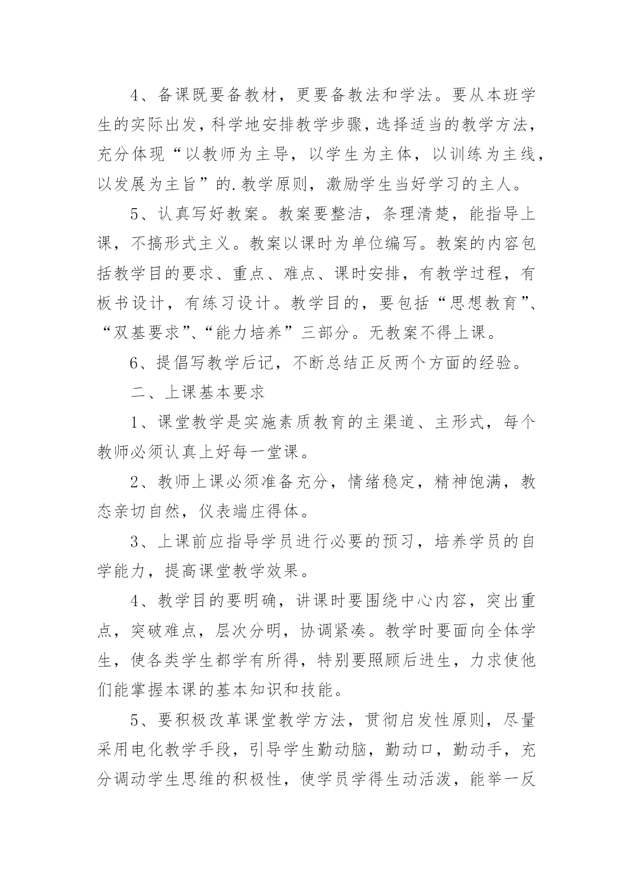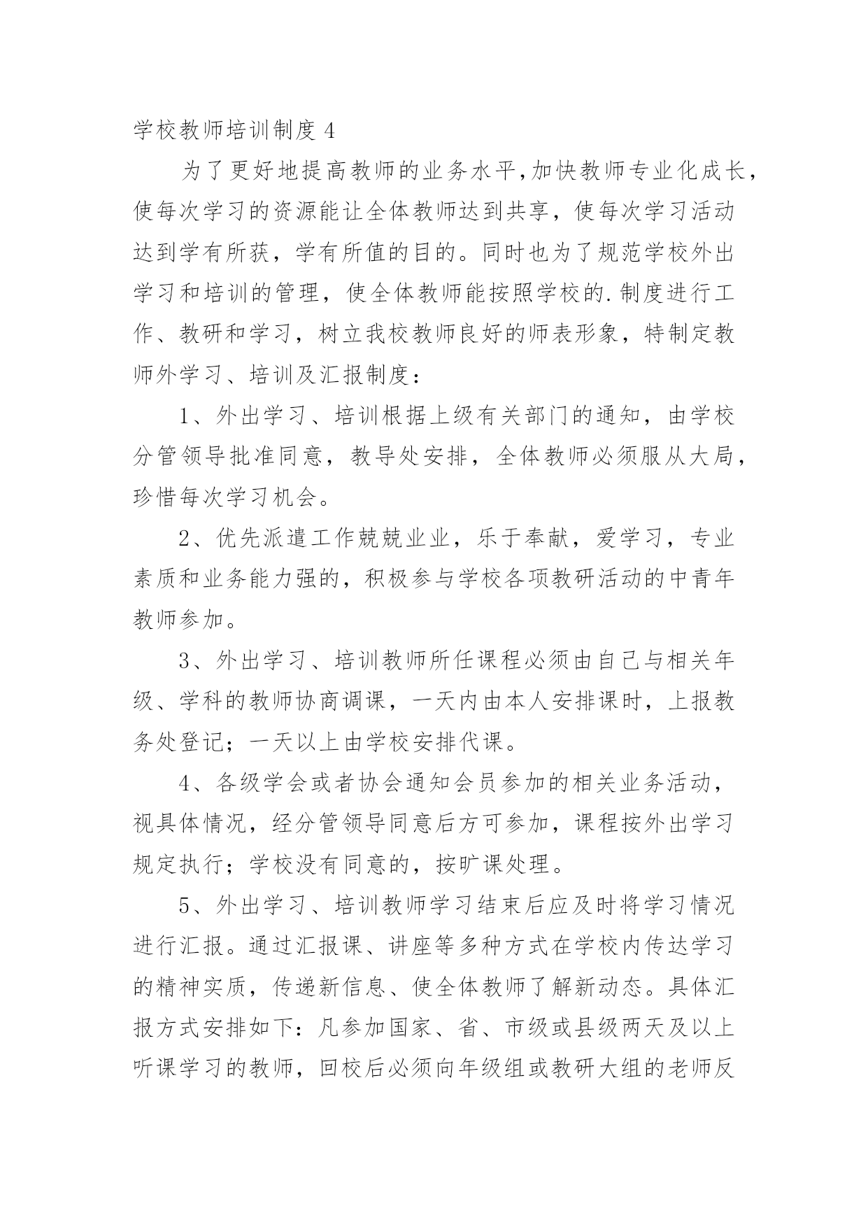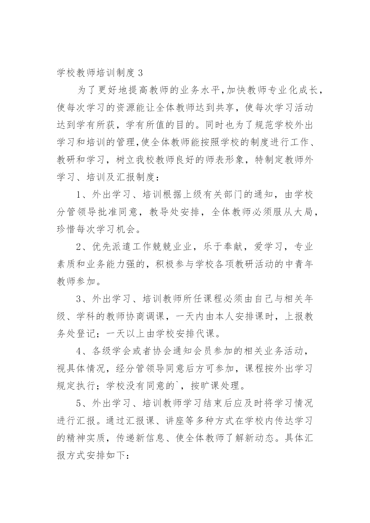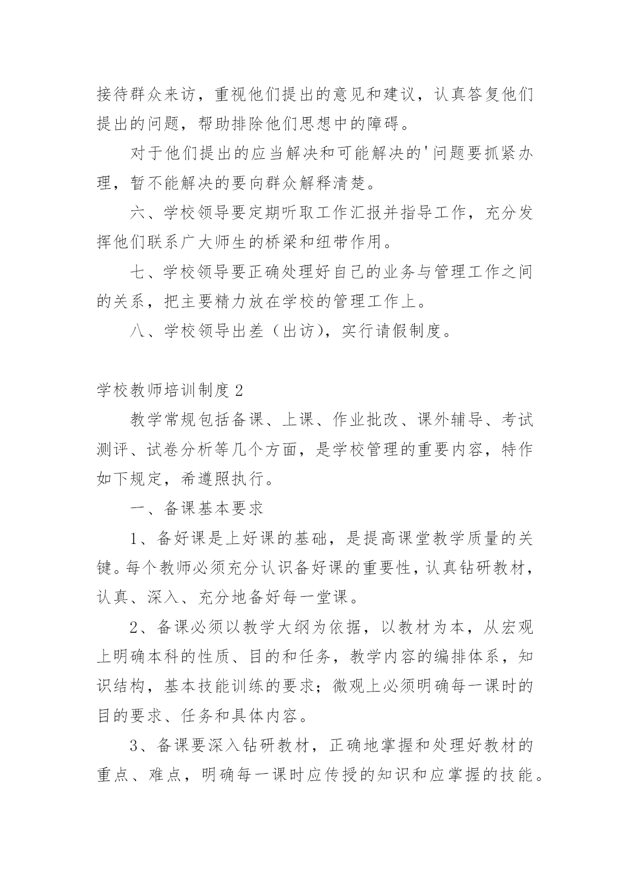 学校教师培训制度在生活中,越来越多地方需要用到制度,制度是指一定的规格或法令礼俗。制度到底怎么拟定才合适呢?下面是小编整理的学校教师培训制度,欢迎大家分享。学校教师培训制度1为了提高学校管理工作的效率,科学合理地安排好日常教育教学工作,特制定以下工作制度。一、学校领导在执行集体决定或日常工作中,要认真履行各自的职责,工作不越权、不推倭,敢于负责,团结协作,廉洁奉公。二、坚持调查研究制度。学校领导要不断改进工作作风,摆脱繁琐事务,注意深入基层,加强调查研究,了解情况,指导工作。在对某项工作作出重大决策前,必须深入调查研究,充分听取职能部门、教师及群众意见,做到决策的民主化。三、提倡少说空话,多办实事的作风,密切联系群众。学校领导每学期至少到基层校集体办公一次,现场帮助解决实际问题。四、坚持听课制度。要全面了解和掌握学校的教育教学情况和师生员工的思想动态,为进一步改进学校工作提供依据。五、学校领导必须坚持每周星期二上午校长接待日制度,接待群众来访,重视他们提出的意见和建议,认真答复他们提出的问题,帮助排除他们思想中的障碍。对于他们提出的应当解决和可能解决的'问题要抓紧办理,暂不能解决的要向群众解释清楚。六、学校领导要定期听取工作汇报并指导工作,充分发挥他们联系广大师生的桥梁和纽带作用。七、学校领导要正确处理好自己的业务与管理工作之间的关系,把主要精力放在学校的管理工作上。八、学校领导出差(出访),实行请假制度。学校教师培训制度2教学常规包括备课、上课、作业批改、课外辅导、考试测评、试卷分析等几个方面,是学校管理的重要内容,特作如下规定,希遵照执行。一、备课基本要求1、备好课是上好课的基础,是提高课堂教学质量的关键。每个教师必须充分认识备好课的重要性,认真钻研教材,认真、深入、充分地备好每一堂课。2、备课必须以教学大纲为依据,以教材为本,从宏观上明确本科的性质、目的和任务,教学内容的编排体系,知识结构,基本技能训练的要求;微观上必须明确每一课时的目的要求、任务和具体内容。3、备课要深入钻研教材,正确地掌握和处理好教材的重点、难点,明确每一课时应传授的知识和应掌握的技能。4、备课既要备教材,更要备教法和学法。要从本班学生的实际出发,科学地安排教学步骤,选择适当的教学方法,充分体现“以教师为主导,以学生为主体,以训练为主线,以发展为主旨”的.教学原则,激励学生当好学习的主人。5、认真写好教案。教案要整洁,条理清楚,能指导上课,不搞形式主义。教案以课时为单位编写。教案的内容包括教学目的要求、重点、难点、课时安排,有教学过程,有板书设计,有练习设计。教学目的,要包括“思想教育”、“双基要求”、“能力培养”三部分。无教案不得上课。6、提倡写教学后记,不断总结正反两个方面的经验。二、上课基本要求1、课堂教学是实施素质教育的主渠道、主形式,每个教师必须认真上好每一堂课。2、教师上课必须准备充分,情绪稳定,精神饱满,教态亲切自然,仪表端庄得体。3、上课前应指导学员进行必要的预习,培养学员的自学能力,提高课堂教学效果。4、教学目的要明确,讲课时要围绕中心内容,突出重点,突破难点,层次分明,协调紧凑。教学时要面向全体学生,使各类学生都学有所得,特别要照顾后进生,力求使他们能掌握本课的基本知识和技能。5、要积极改革课堂教学方法,贯彻启发性原则,尽量采用电化教学手段,引导学生勤动脑,勤动口,勤动手,充分调动学生思维的积极性,使学员学得生动活泼,能举一反三,灵活运用。6、坚持用普通话教学。讲课声音清晰,响亮,表达意思明白,语言生动有趣,板书讲究艺术,要求正确,清楚、端正,富于启发性。7、严格上课纪律,做到上课时不迟到,不会客,不接电话,不抽烟,不坐教,不拖堂。8、结合本校课程实际,灵活调整短期插班学生课程,合理安排上课时间。三、作业布置与批改要求1、课内外作业的设计要遵循“精、活”的原则,既加强“双基”的训练,又要注重能力的培养。要注意作业的层次性与发展性,发展学生思维,提高实效。2、作业要求严格,对作业要统一规范。要求学生做到按质按量按时完成作业。注意培养和训练学员养成细心审题,书写工整,格式规范的良好习惯,要注明作业时间。还要培养学生改错订正作业的好习惯。3、作业批改要认真、及时,要注明批阅日期。字体端正明了,作业错误要更正,批语要多鼓励学生,指导学生自行改正。在电脑上批改的,可在作业后面写上批改结果。4、要做好批改记录,要重视作业的及时讲评,要对学生的作业了解全面,掌握典型,分析综合。5、建立优秀学员表扬奖励制度,培训结束,要对表现较好的同学给予表扬奖励,以激励学生的学习积极性,培养学生严谨的治学态度。学校教师培训制度3为了更好地提高教师的业务水平,加快教师专业化成长,使每次学习的资源能让全体教师达到共享,使每次学习活动达到学有所获,学有所值的目的