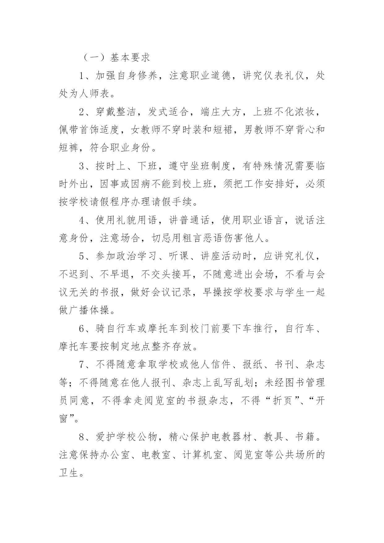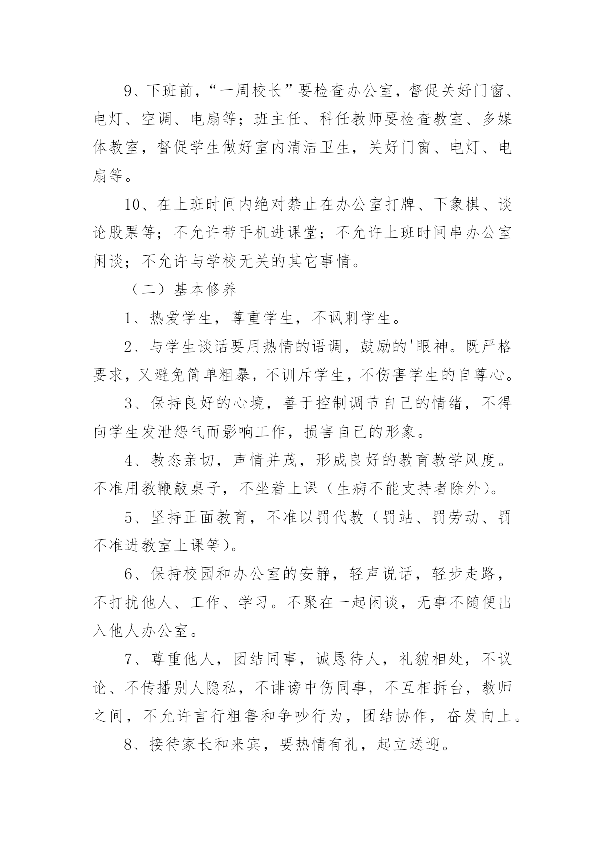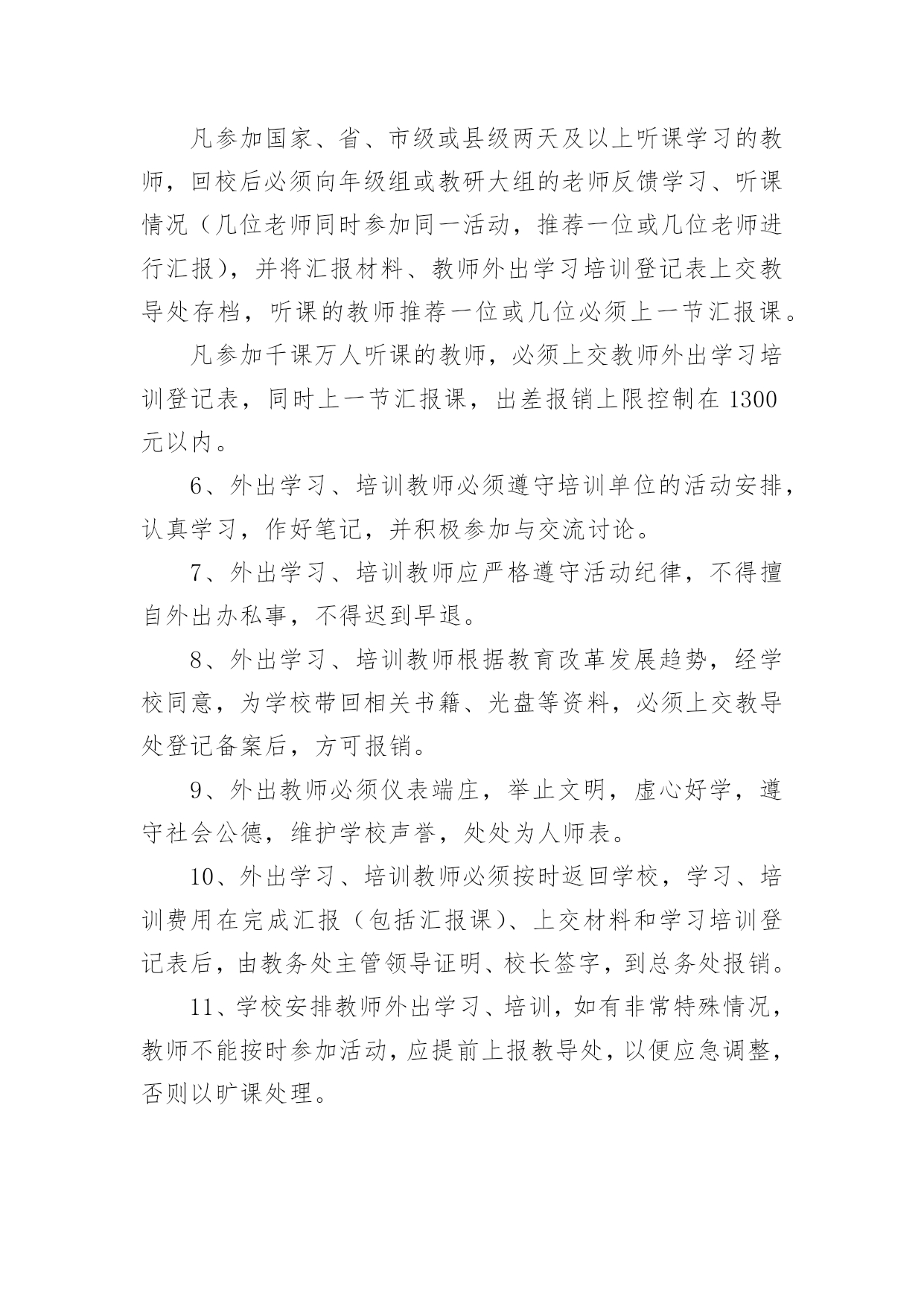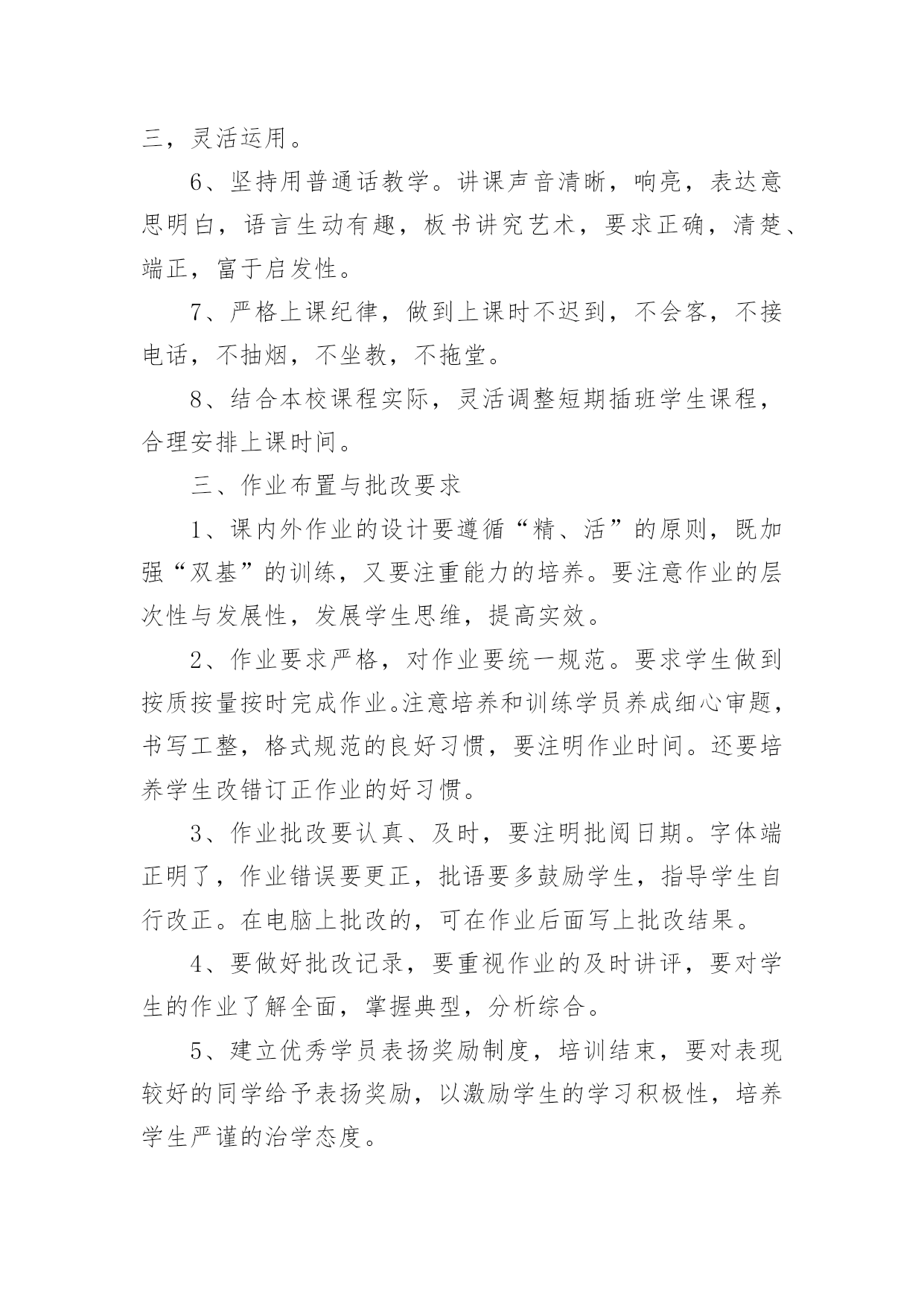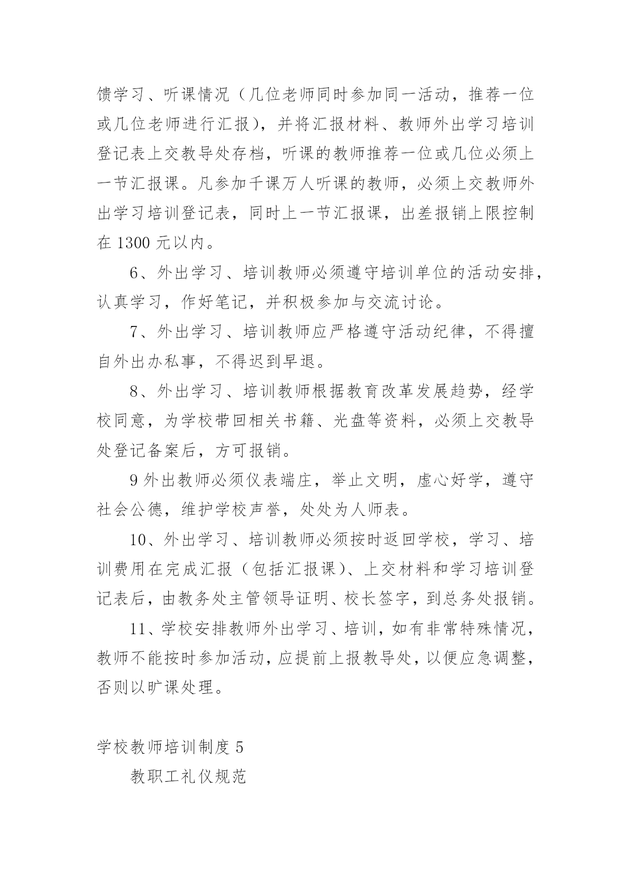 学校教师培训制度在生活中,越来越多地方需要用到制度,制度是指一定的规格或法令礼俗。制度到底怎么拟定才合适呢?下面是小编整理的学校教师培训制度,欢迎大家分享。学校教师培训制度1为了提高学校管理工作的效率,科学合理地安排好日常教育教学工作,特制定以下工作制度。一、学校领导在执行集体决定或日常工作中,要认真履行各自的职责,工作不越权、不推倭,敢于负责,团结协作,廉洁奉公。二、坚持调查研究制度。学校领导要不断改进工作作风,摆脱繁琐事务,注意深入基层,加强调查研究,了解情况,指导工作。在对某项工作作出重大决策前,必须深入调查研究,充分听取职能部门、教师及群众意见,做到决策的民主化。三、提倡少说空话,多办实事的作风,密切联系群众。学校领导每学期至少到基层校集体办公一次,现场帮助解决实际问题。四、坚持听课制度。要全面了解和掌握学校的教育教学情况和师生员工的思想动态,为进一步改进学校工作提供依据。五、学校领导必须坚持每周星期二上午校长接待日制度,接待群众来访,重视他们提出的意见和建议,认真答复他们提出的问题,帮助排除他们思想中的障碍。对于他们提出的应当解决和可能解决的'问题要抓紧办理,暂不能解决的要向群众解释清楚。六、学校领导要定期听取工作汇报并指导工作,充分发挥他们联系广大师生的桥梁和纽带作用。七、学校领导要正确处理好自己的业务与管理工作之间的关系,把主要精力放在学校的管理工作上。八、学校领导出差(出访),实行请假制度。学校教师培训制度2教学常规包括备课、上课、作业批改、课外辅导、考试测评、试卷分析等几个方面,是学校管理的重要内容,特作如下规定,希遵照执行。一、备课基本要求1、备好课是上好课的基础,是提高课堂教学质量的关键。每个教师必须充分认识备好课的重要性,认真钻研教材,认真、深入、充分地备好每一堂课。2、备课必须以教学大纲为依据,以教材为本,从宏观上明确本科的性质、目的和任务,教学内容的编排体系,知识结构,基本技能训练的要求;微观上必须明确每一课时的目的要求、任务和具体内容。3、备课要深入钻研教材,正确地掌握和处理好教材的重点、难点,明确每一课时应传授的知识和应掌握的技能。4、备课既要备教材,更要备教法和学法。要从本班学生的实际出发,科学地安排教学步骤,选择适当的教学方法,充分体现“以教师为主导,以学生为主体,以训练为主线,以发展为主旨”的.教学原则,激励学生当好学习的主人。5、认真写好教案。教案要整洁,条理清楚,能指导上课,不搞形式主义。教案以课时为单位编写。教案的内容包括教学目的要求、重点、难点、课时安排,有教学过程,有板书设计,有练习设计。教学目的,要包括“思想教育”、“双基要求”、“能力培养”三部分。无教案不得上课。6、提倡写教学后记,不断总结正反两个方面的经验。二、上课基本要求1、课堂教学是实施素质教育的主渠道、主形式,每个教师必须认真上好每一堂课。2、教师上课必须准备充分,情绪稳定,精神饱满,教态亲切自然,仪表端庄得体。3、上课前应指导学员进行必要的预习,培养学员的自学能力,提高课堂教学效果。4、教学目的要明确,讲课时要围绕中心内容,突出重点,突破难点,层次分明,协调紧凑。教学时要面向全体学生,使各类学生都学有所得,特别要照顾后进生,力求使他们能掌握本课的基本知识和技能。5、要积极改革课堂教学方法,贯彻启发性原则,尽量采用电化教学手段,引导学生勤动脑,勤动口,勤动手,充分调动学生思维的积极性,使学员学得生动活泼,能举一反三,灵活运用。6、坚持用普通话教学。讲课声音清晰,响亮,表达意思明白,语言生动有趣,板书讲究艺术,要求正确,清楚、端正,富于启发性。7、严格上课纪律,做到上课时不迟到,不会客,不接电话,不抽烟,不坐教,不拖堂。8、结合本校课程实际,灵活调整短期插班学生课程,合理安排上课时间。三、作业布置与批改要求1、课内外作业的设计要遵循“精、活”的原则,既加强“双基”的训练,又要注重能力的培养。要注意作业的层次性与发展性,发展学生思维,提高实效。2、作业要求严格,对作业要统一规范。要求学生做到按质按量按时完成作业。注意培养和训练学员养成细心审题,书写工整,格式规范的良好习惯,要注明作业时间。还要培养学生改错订正作业的好习惯。3、作业批改要认真、及时,要注明批阅日期。字体端正明了,作业错误要更正,批语要多鼓励学生,指导学生自行改正。在电脑上批改的,可在作业后面写上批改结果。4、要做好批改记录,要重视作业的及时讲评,要对学生的作业了解全面,掌握典型,分析综合。5、建立优秀学员表扬奖励制度,培训结束,要对表现较好的同学给予表扬奖励,以激励学生的学习积极性,培养学生严谨的治学态度。学校教师培训制度3为了更好地提高教师的业务水平,加快教师专业化成长,使每次学习的资源能让全体教师达到共享,使每次学习活动达到学有所获,学有所值的目的