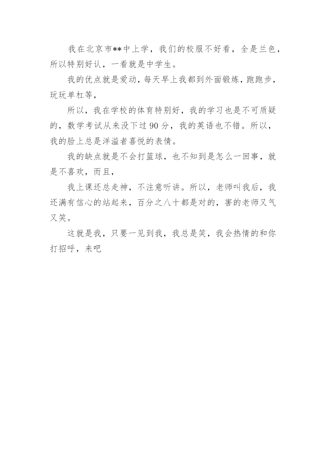 最新简短的自我介绍最新简短的自我介绍最新简短的自我介绍1昀昀是我在妈妈肚子里时的小名哦,我的大名叫曹铁瀛,妈妈怀我的时候和单位里的阿姨们玩牌经常是百战百胜,阿姨们说是因为我的缘故,干脆就叫“天赢”好了,爸妈取其谐音,就变成了“铁瀛”。我的性格有点内向、腼腆、不喜欢“显山露水”。我最喜欢体育项目了,最“痴迷”的就是体育频道:乒乓球、羽毛球、台球、足球、篮球、跳水~~,当然我也喜欢打牌(这可是遗传)。我的个子很高,被称为“帅哥”,因此彼得女孩子的欢心哦,等我长大了,我要娶七个“老婆”,其中三个为:外婆、爸爸和妈妈。我的目标是考上北大。最新简短的自我介绍2我是来自山东的xxx,大家所看到的我的内在就像我的外表一样,敦厚和实在是我对自己最好的概括。我不飘,不浮,不躁,不懒。我内心充实,物质享乐和精神刺激都不是我的.嗜好。我待人诚实,从没有花言巧语,但真诚和厚道使我总能赢得朋友的信赖。我专业扎实,看书是我最大的享受,钻研电脑让我感觉其乐无穷。我做事踏实,再小的事情我也要一丝不苟地完成。我会修电脑,能管网络,网络经营和网上销售也没问题。重要的是,我有一种执著钻研的精神,一种不弄明白绝不罢休的颈头。我叫春雨,春天的雨润物细无声,我希望我能默默无闻地、悄无声息地给我的团队装一点点绿色。给我一个机会,我会给您一个惊喜最新简短的自我介绍3大家好,我叫***,今年**岁了。我是一个活泼开朗的小女孩,我性格随和,下课后总能听到我愉快的笑声。我下课后有时会帮成绩不好的同学讲一下题,我还会帮助别人做我应该做的事。我觉得帮助别人自己也会觉得高兴的!我是一个班干部,在班上我管的纪律井井有条。我的组织能力很强,有时侯我会带着同学们开展一些有益的活动。我还把本班的少先队员的工作做得有声有色呢!我的特长是弹琴、跳舞、书法。我从小就学弹琴,现在弹得还是算好的哟!我还学过跳舞,我学了*年了。我还在重庆的艺校去考了舞蹈*级的证书。我的书法是最棒的,我在班上写的字是最好的呢!这就是我!一个大方开朗的小女孩!在今后的生活中,我会努力和大家成为好朋友,谢谢!最新简短的自我介绍4我个子中等,1,66,再班里排第十个,长脸短鼻子,手大脚也大,一双眼睛不大也不小,眼珠子特别有神,一张大嘴巴特别能说,只要一说起来,说上一个小时也没问题,个子不高不矮,身体不胖不瘦。总的来说还是比较帅的。我在北京市**中上学,我们的校服不好看,全是兰色,所以特别好认,一看就是中学生。我的优点就是爱动,每天早上我都到外面锻炼,跑跑步,玩玩单杠等,所以,我在学校的体育特别好,我的学习也是不可质疑的,数学考试从来没下过90分,我的英语也不错。所以,我的脸上总是洋溢者喜悦的表情。我的缺点就是不会打篮球,也不知到是怎么一回事,就是不喜欢,而且,我上课还总走神,不注意听讲。所以,老师叫我后,我还满有信心的站起来,百分之八十都是对的,害的老师又气又笑。这就是我,只要一见到我,我总是笑,我会热情的和你打招呼,来吧