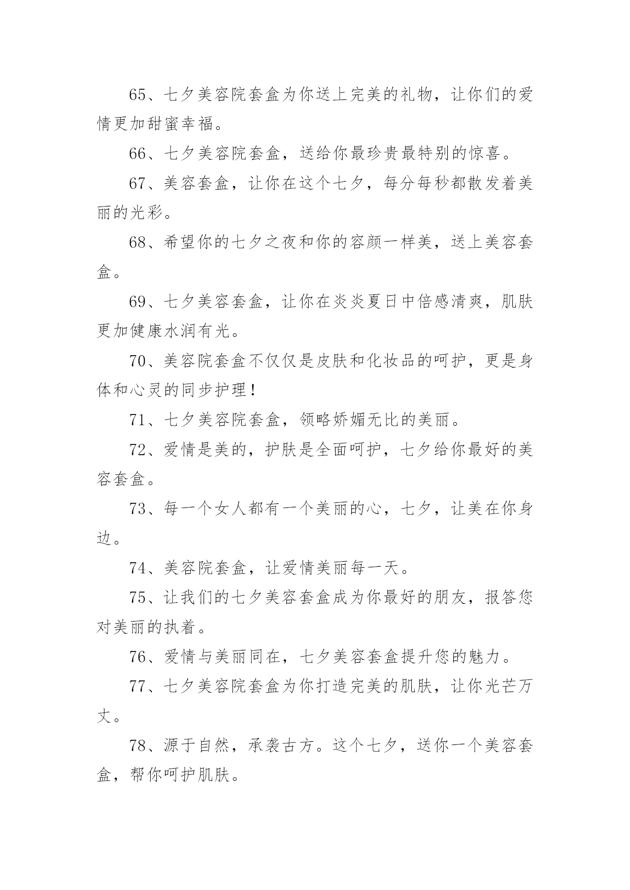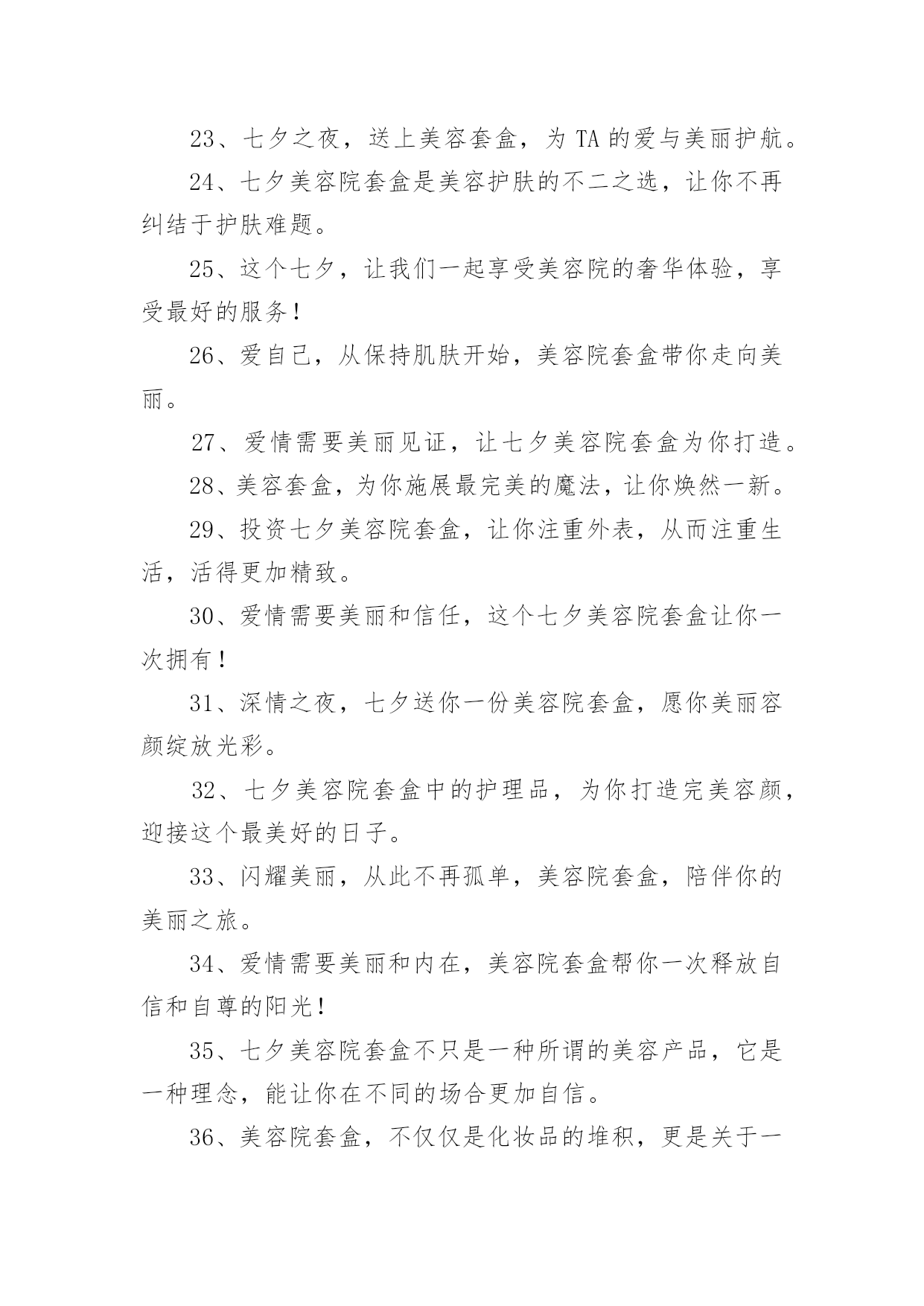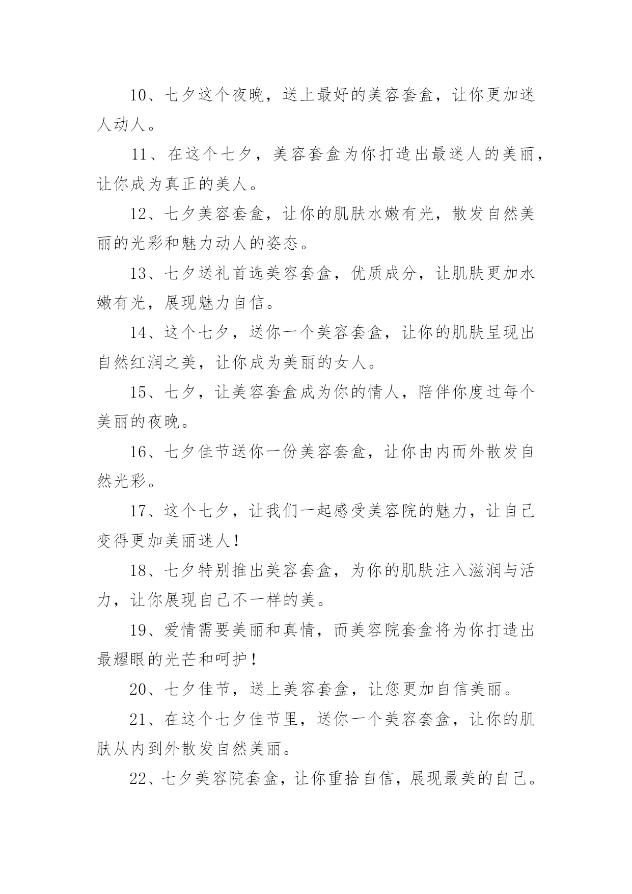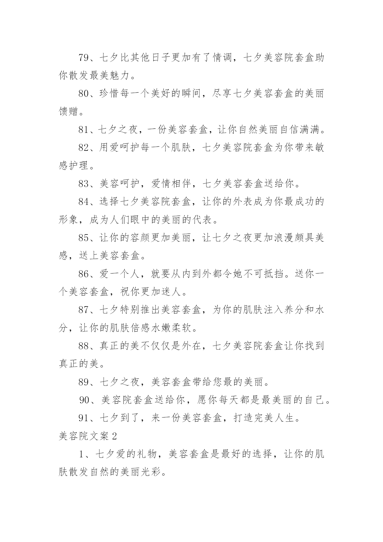 美容院文案【优】美容院文案随着社交网络的普遍使用,大家一定都接触过一些使用较为普遍的文案吧,借助文案可以达到宣传文化的目的。什么样的文案才让人眼前一亮呢?以下是小编精心整理的美容院文案,欢迎阅读与收藏。美容院文案11、为那一份美好的爱情,献上七夕美容套盒。2、美容院套盒,送给你这个七夕节,愿你美丽华丽每一天。3、七夕美容院套盒是你与Ta爱情的见证,为你们见证最美好的时刻。4、七夕美容套盒,让你的肌肤焕发生机和光彩,展现不一样的动人魅力。5、总之,七夕美容院套盒,就是你的美丽及时雨!6、美容院套盒,七夕节送给你,为你带来美丽动人的幸福。7、七夕浪漫约会,为你送上美容护肤套盒。8、七夕美容院套盒让你在这个特别的日子更加美丽动人。9、美丽和爱情,是生命的必备元素。10、七夕这个夜晚,送上最好的美容套盒,让你更加迷人动人。11、在这个七夕,美容套盒为你打造出最迷人的美丽,让你成为真正的美人。12、七夕美容套盒,让你的肌肤水嫩有光,散发自然美丽的光彩和魅力动人的姿态。13、七夕送礼首选美容套盒,优质成分,让肌肤更加水嫩有光,展现魅力自信。14、这个七夕,送你一个美容套盒,让你的肌肤呈现出自然红润之美,让你成为美丽的女人。15、七夕,让美容套盒成为你的情人,陪伴你度过每个美丽的夜晚。16、七夕佳节送你一份美容套盒,让你由内而外散发自然光彩。17、这个七夕,让我们一起感受美容院的魅力,让自己变得更加美丽迷人!18、七夕特别推出美容套盒,为你的肌肤注入滋润与活力,让你展现自己不一样的美。19、爱情需要美丽和真情,而美容院套盒将为你打造出最耀眼的光芒和呵护!20、七夕佳节,送上美容套盒,让您更加自信美丽。21、在这个七夕佳节里,送你一个美容套盒,让你的肌肤从内到外散发自然美丽。22、七夕美容院套盒,让你重拾自信,展现最美的自己。23、七夕之夜,送上美容套盒,为TA的爱与美丽护航。24、七夕美容院套盒是美容护肤的不二之选,让你不再纠结于护肤难题。25、这个七夕,让我们一起享受美容院的奢华体验,享受最好的服务!26、爱自己,从保持肌肤开始,美容院套盒带你走向美丽。27、爱情需要美丽见证,让七夕美容院套盒为你打造。28、美容套盒,为你施展最完美的魔法,让你焕然一新。29、投资七夕美容院套盒,让你注重外表,从而注重生活,活得更加精致。30、爱情需要美丽和信任,这个七夕美容院套盒让你一次拥有!31、深情之夜,七夕送你一份美容院套盒,愿你美丽容颜绽放光彩。32、七夕美容院套盒中的护理品,为你打造完美容颜,迎接这个最美好的日子。33、闪耀美丽,从此不再孤单,美容院套盒,陪伴你的美丽之旅。34、爱情需要美丽和内在,美容院套盒帮你一次释放自信和自尊的阳光!35、七夕美容院套盒不只是一种所谓的美容产品,它是一种理念,能让你在不同的场合更加自信。36、美容院套盒,不仅仅是化妆品的堆积,更是关于一种全面舒适的感受和陶冶。37、七夕美容套盒,为您的爱情做好准备。38、七夕美容套盒,为你的爱情和生活注入新的活力。39、感谢你一直以来的陪伴,这个七夕,送你一个美容套盒,让你更加美丽动人。40、在这个七夕,让美容套盒为你打造出最惊艳的美丽。41、爱情需要心灵和自信,美容院套盒帮你一次丰富内涵的升华!42、七夕美容院套盒是一个解决你所有美容问题的设置,它能让你在最忙碌的时候,还是能焕然一新。43、让美丽妩媚永驻,这个七夕送你一个美容套盒,为你带来如花美肌。44、七夕之夜,一份浪漫的美容套盒,让你更加甜美可爱。45、让七夕的爱情,绽放出最动人的美丽。46、七夕美容院套盒,给你美容新感觉。47、七夕时节,用美容套盒,熏陶你的肌肤,让你倍感动人。48、纯净的肌肤是迷人的,所以这个七夕,送你一个美容套盒,助你达到纯净水润。49、七夕美容院套盒,为你的外表提供一个全面、完美的解决方案,让你的生活有更多的惊喜。50、七夕护肤送美丽,美容套盒祝快乐。51、对于那些选择了七夕美容院套盒的人,美丽不会是一个梦想,因为他们已经实现了它们。52、美丽如初,无需香膏玉粉,一份美容礼盒,七夕温情奉上。53、迎接七夕节,我们的七夕美容套盒将赋予你无限的惊喜、欢乐和美丽。54、七夕佳节,送上一份美容套盒,让你更加美丽动人。55、给你的爱人一个七夕美容院套盒,给予她强大的自信和迷人的光芒。56、七夕美容院套盒中的护理品,为你和Ta带来更多的`幸福和美好。57、爱情和美丽一样,需要细心呵护,美容院套盒给你最好的保养。58、七夕美容套盒,让你在夏日不再担忧肌肤问题,展现明媚动人的美丽。59、爱情的种子,需要精心的呵护,美容院套盒是当之无愧的选择。60、让你的美丽从本质开始,选择七夕美容院套盒。61、在这个七夕,让美容套盒为你送上最完美的祝福,让你拥有独一无二的美丽。62、成为一个成功者,从七夕美容院套盒开始,