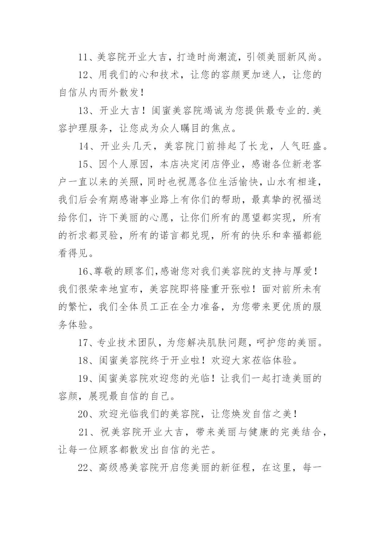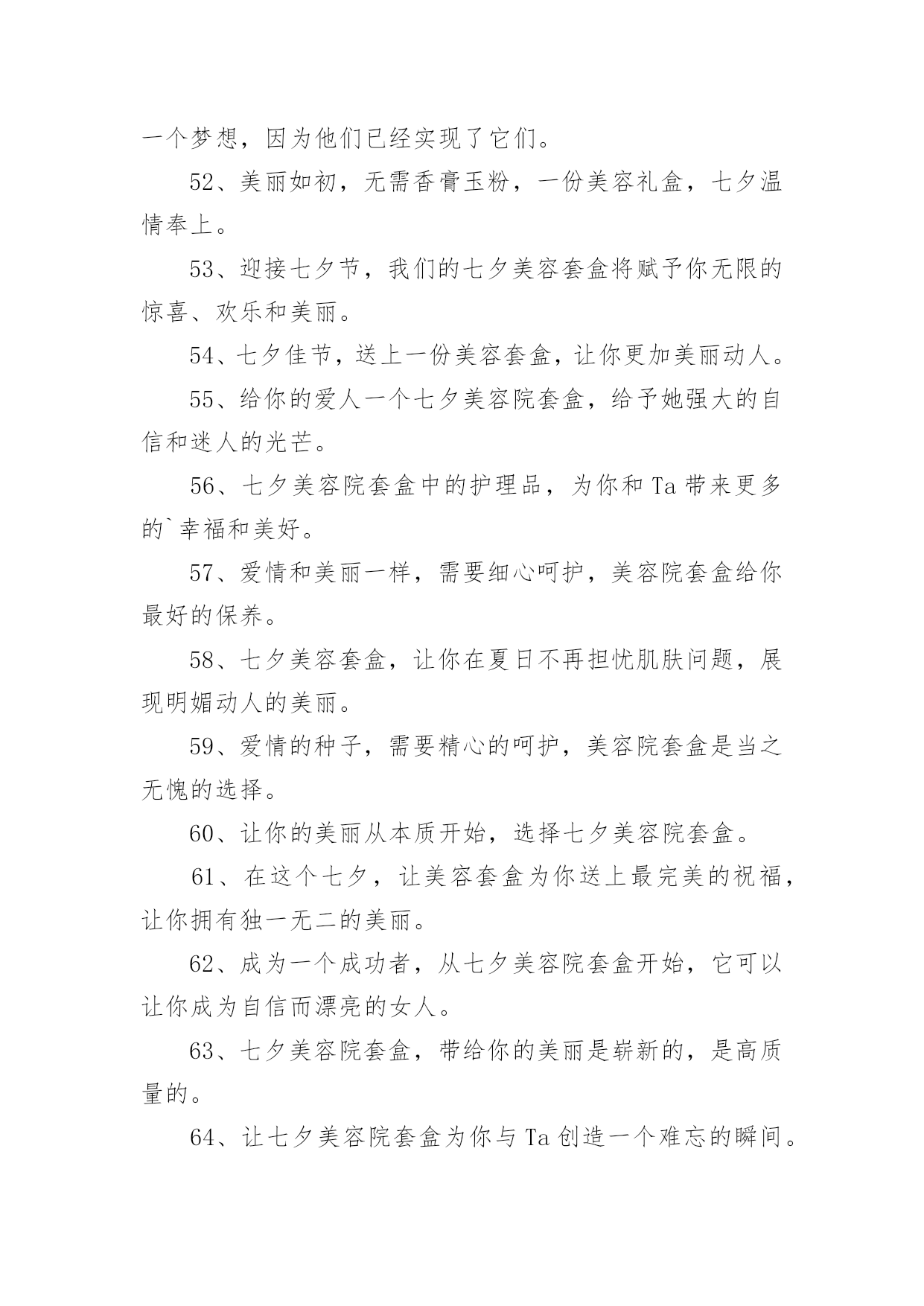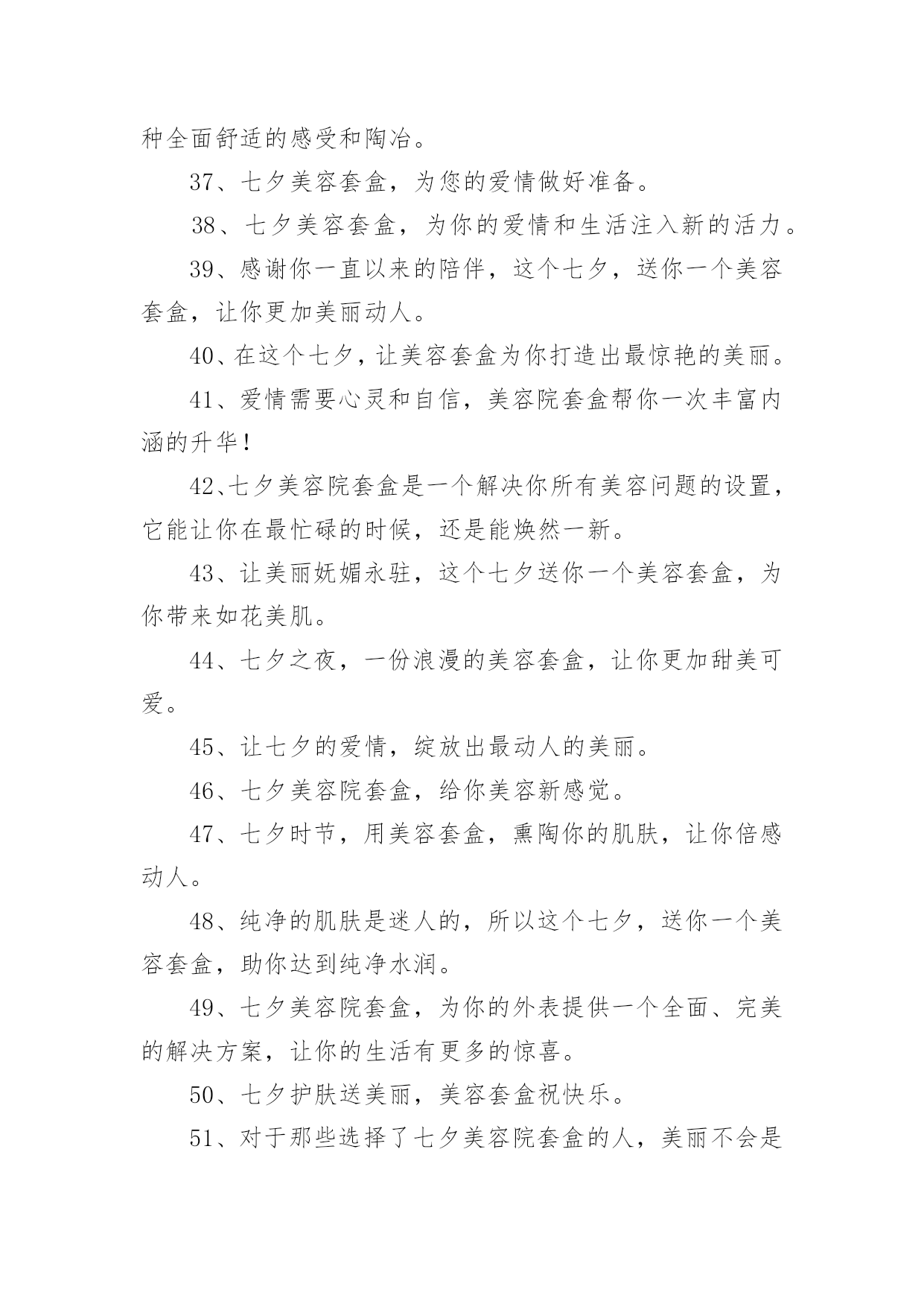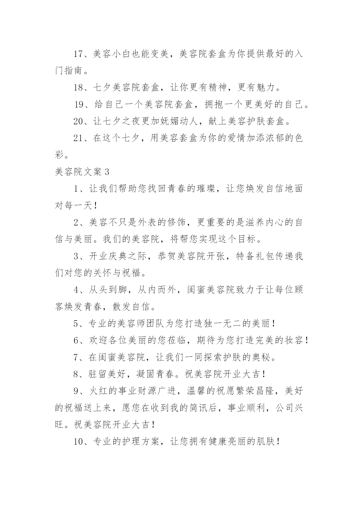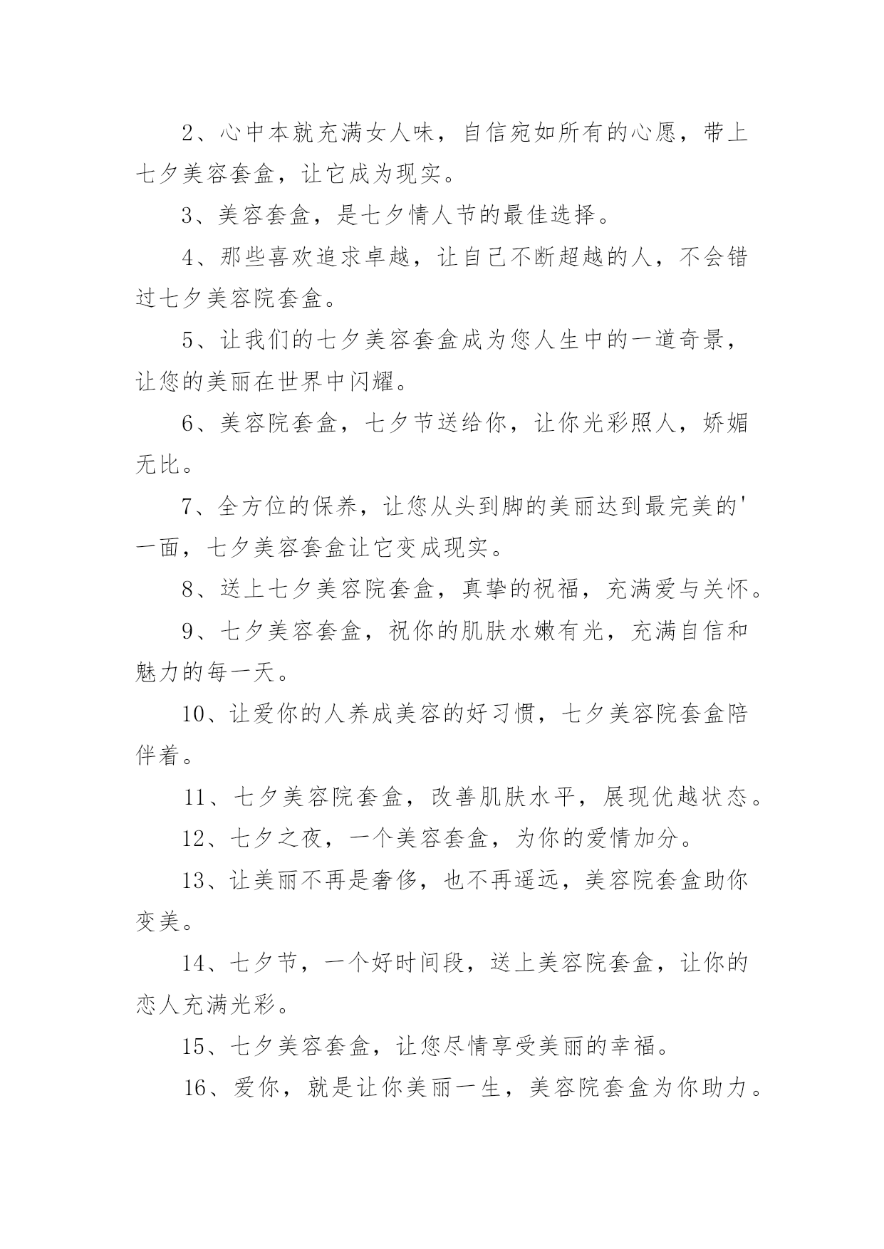 美容院文案【优】美容院文案随着社交网络的普遍使用,大家一定都接触过一些使用较为普遍的文案吧,借助文案可以达到宣传文化的目的。什么样的文案才让人眼前一亮呢?以下是小编精心整理的美容院文案,欢迎阅读与收藏。美容院文案11、为那一份美好的爱情,献上七夕美容套盒。2、美容院套盒,送给你这个七夕节,愿你美丽华丽每一天。3、七夕美容院套盒是你与Ta爱情的见证,为你们见证最美好的时刻。4、七夕美容套盒,让你的肌肤焕发生机和光彩,展现不一样的动人魅力。5、总之,七夕美容院套盒,就是你的美丽及时雨!6、美容院套盒,七夕节送给你,为你带来美丽动人的幸福。7、七夕浪漫约会,为你送上美容护肤套盒。8、七夕美容院套盒让你在这个特别的日子更加美丽动人。9、美丽和爱情,是生命的必备元素。10、七夕这个夜晚,送上最好的美容套盒,让你更加迷人动人。11、在这个七夕,美容套盒为你打造出最迷人的美丽,让你成为真正的美人。12、七夕美容套盒,让你的肌肤水嫩有光,散发自然美丽的光彩和魅力动人的姿态。13、七夕送礼首选美容套盒,优质成分,让肌肤更加水嫩有光,展现魅力自信。14、这个七夕,送你一个美容套盒,让你的肌肤呈现出自然红润之美,让你成为美丽的女人。15、七夕,让美容套盒成为你的情人,陪伴你度过每个美丽的夜晚。16、七夕佳节送你一份美容套盒,让你由内而外散发自然光彩。17、这个七夕,让我们一起感受美容院的魅力,让自己变得更加美丽迷人!18、七夕特别推出美容套盒,为你的肌肤注入滋润与活力,让你展现自己不一样的美。19、爱情需要美丽和真情,而美容院套盒将为你打造出最耀眼的光芒和呵护!20、七夕佳节,送上美容套盒,让您更加自信美丽。21、在这个七夕佳节里,送你一个美容套盒,让你的肌肤从内到外散发自然美丽。22、七夕美容院套盒,让你重拾自信,展现最美的自己。23、七夕之夜,送上美容套盒,为TA的爱与美丽护航。24、七夕美容院套盒是美容护肤的不二之选,让你不再纠结于护肤难题。25、这个七夕,让我们一起享受美容院的奢华体验,享受最好的服务!26、爱自己,从保持肌肤开始,美容院套盒带你走向美丽。27、爱情需要美丽见证,让七夕美容院套盒为你打造。28、美容套盒,为你施展最完美的魔法,让你焕然一新。29、投资七夕美容院套盒,让你注重外表,从而注重生活,活得更加精致。30、爱情需要美丽和信任,这个七夕美容院套盒让你一次拥有!31、深情之夜,七夕送你一份美容院套盒,愿你美丽容颜绽放光彩。32、七夕美容院套盒中的护理品,为你打造完美容颜,迎接这个最美好的日子。33、闪耀美丽,从此不再孤单,美容院套盒,陪伴你的美丽之旅。34、爱情需要美丽和内在,美容院套盒帮你一次释放自信和自尊的阳光!35、七夕美容院套盒不只是一种所谓的美容产品,它是一种理念,能让你在不同的场合更加自信。36、美容院套盒,不仅仅是化妆品的堆积,更是关于一种全面舒适的感受和陶冶。37、七夕美容套盒,为您的爱情做好准备。38、七夕美容套盒,为你的爱情和生活注入新的活力。39、感谢你一直以来的陪伴,这个七夕,送你一个美容套盒,让你更加美丽动人。40、在这个七夕,让美容套盒为你打造出最惊艳的美丽。41、爱情需要心灵和自信,美容院套盒帮你一次丰富内涵的升华!42、七夕美容院套盒是一个解决你所有美容问题的设置,它能让你在最忙碌的时候,还是能焕然一新。43、让美丽妩媚永驻,这个七夕送你一个美容套盒,为你带来如花美肌。44、七夕之夜,一份浪漫的美容套盒,让你更加甜美可爱。45、让七夕的爱情,绽放出最动人的美丽。46、七夕美容院套盒,给你美容新感觉。47、七夕时节,用美容套盒,熏陶你的肌肤,让你倍感动人。48、纯净的肌肤是迷人的,所以这个七夕,送你一个美容套盒,助你达到纯净水润。49、七夕美容院套盒,为你的外表提供一个全面、完美的解决方案,让你的生活有更多的惊喜。50、七夕护肤送美丽,美容套盒祝快乐。51、对于那些选择了七夕美容院套盒的人,美丽不会是一个梦想,因为他们已经实现了它们。52、美丽如初,无需香膏玉粉,一份美容礼盒,七夕温情奉上。53、迎接七夕节,我们的七夕美容套盒将赋予你无限的惊喜、欢乐和美丽。54、七夕佳节,送上一份美容套盒,让你更加美丽动人。55、给你的爱人一个七夕美容院套盒,给予她强大的自信和迷人的光芒。56、七夕美容院套盒中的护理品,为你和Ta带来更多的`幸福和美好。57、爱情和美丽一样,需要细心呵护,美容院套盒给你最好的保养。58、七夕美容套盒,让你在夏日不再担忧肌肤问题,展现明媚动人的美丽。59、爱情的种子,需要精心的呵护,美容院套盒是当之无愧的选择。60、让你的美丽从本质开始,选择七夕美容院套盒。61、在这个七夕,让美容套盒为你送上最完美的祝福,让你拥有独一无二的美丽。62、成为一个成功者,从七夕美容院套盒开始,