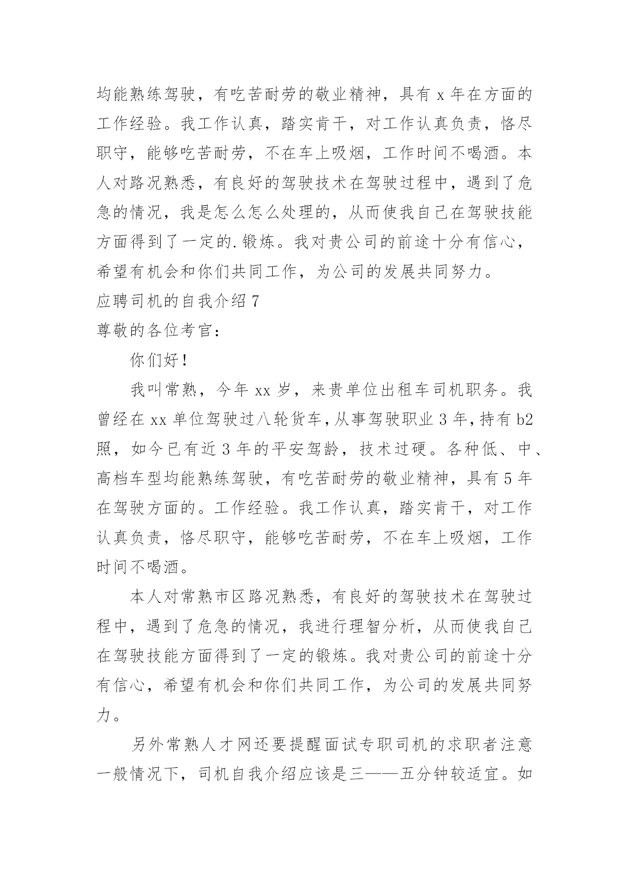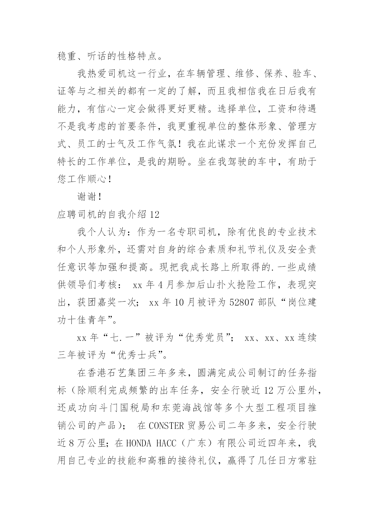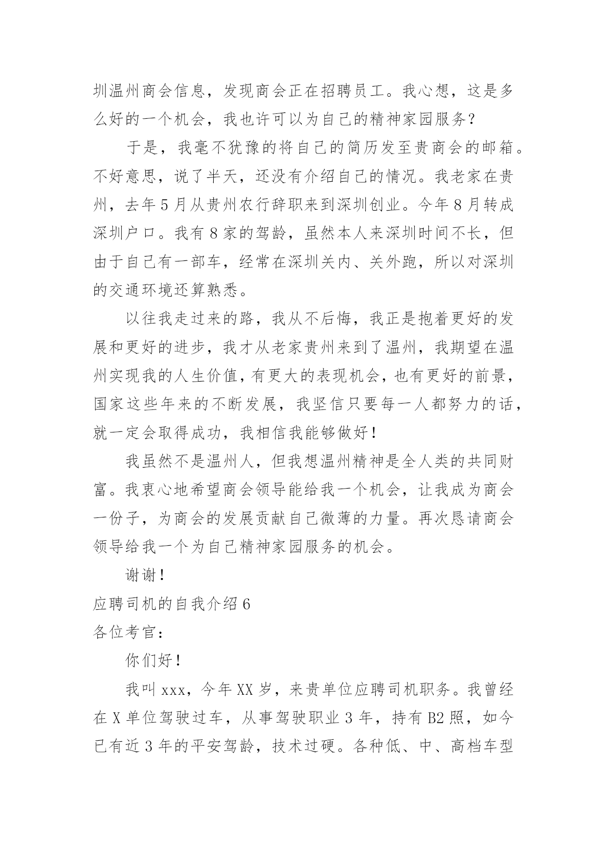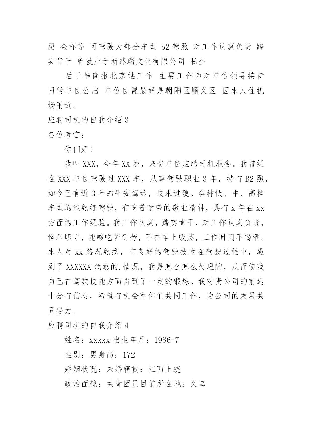 应聘司机的自我介绍应聘司机的自我介绍[优选15篇]当我们在一个新环境中,我们不得不需要向他人介绍自己,自我介绍是一种认识自我的手段。那么自我介绍有什么格式呢?下面是小编整理的应聘司机的自我介绍,希望能够帮助到大家。应聘司机的自我介绍1尊敬的领导:您好!我很荣幸有机会向您呈上我的自荐材料。本人品貌端庄,性格随和,为人诚实正直。在外地从事驾驶职业多年,持有a照,如今已有近10几年的平安驾龄,技术过硬。各种低、中、高档车型均能熟练驾驶,有吃苦耐劳的敬业精神。为了更好的'照顾8旬老母,xx上半年本人回到故里,因受金融风暴的影响,轿车租赁生意不太景气。经过反复考虑欲寻一份开车的工作,具体车型不限,待遇等试用后再定。我真诚地期待着与您共事!感谢您在百忙之中对我的关注,愿贵单位事业蒸蒸日上,屡创佳绩,祝您的事业百尺竿头,更进一步!应聘司机的自我介绍2北京驾龄8年道路熟悉开过多款车型:宝马奥迪迈腾金杯等可驾驶大部分车型b2驾照对工作认真负责踏实肯干曾就业于新然瑞文化有限公司私企后于华商报北京站工作主要工作为对单位领导接待日常单位公出单位位置最好是朝阳区顺义区因本人住机场附近。应聘司机的自我介绍3各位考官:你们好!我叫XXX,今年XX岁,来贵单位应聘司机职务。我曾经在XXX单位驾驶过XXX车,从事驾驶职业3年,持有B2照,如今已有近3年的平安驾龄,技术过硬。各种低、中、高档车型均能熟练驾驶,有吃苦耐劳的敬业精神,具有x年在xx方面的工作经验。我工作认真,踏实肯干,对工作认真负责,恪尽职守,能够吃苦耐劳,不在车上吸菸,工作时间不喝酒。本人对xx路况熟悉,有良好的驾驶技术在驾驶过程中,遇到了XXXXXX危急的.情况,我是怎么怎么处理的,从而使我自己在驾驶技能方面得到了一定的锻炼。我对贵公司的前途十分有信心,希望有机会和你们共同工作,为公司的发展共同努力。应聘司机的自我介绍4姓名:xxxxx出生年月:1986-7性别:男身高:172婚姻状况:未婚籍贯:江西上绕政治面貌:共青团员目前所在地:义乌求职意向期望职位:驾驶员职位类型:全职工作地点:义乌市工资待遇:2500住房要求:面议工作经验工作经验:1年工作经历:时间:-12至-6公司:义乌丽鑫花边有限公司部门:后勤部职位:驾驶员独立完成任务,经常出差外出工作时间:20xx-7至-6公司:义乌副食品市场1021店部门:运输职位:驾驶员专门送货时间:20xx-10至-1公司:义乌聚千味餐饮有限公司部门:后勤部职位:驾驶员每天早上三点买菜教育背景最高学历:高中以下毕业院校:广西边防部队所学专业:毕业时间:-1第一外语:水平:熟练计算机能力:熟练其它能力:所获证书:驾驶C证,退伍证教育培训经历:12月参军已广西边防部队,12月退伍,被评为标兵,20获得优秀士兵奖励应聘司机的自我介绍5尊敬的公司领导:您们好!我叫xxx,没有多少文化,不过自己有着一技之长,那就是我的驾驶技术十分的精湛,在我八年的驾驶时间内,我从来没有出现过事故,可以说自己做到了行万里路,走万里安全路。在不断的驾驶中,我一直在进步,提高自己的驾驶能力,也在不断的提高自己的思想素质。本人申请贵商会网站上招聘的行政司机职位。一次偶然的机会,我在书店看到一本《温州人赚钱哪些最有效》。我信手拿起翻了几页后,被书中温州人不屈不挠的精神所折服。我当即买下一本,回家后专心研读。近5页的书,我不到两天就读完了。每天晚上读到凌晨3点,比我当年高考还用功呀。读罢此书后,我深刻的感受到,温州人不屈不挠的精神值得钦佩,温州人遍布全中国、全世界的商会才是温州人永远立于不败之地的`精神支柱。因此,我立马在网上搜索深圳温州商会信息,发现商会正在招聘员工。我心想,这是多么好的一个机会,我也许可以为自己的精神家园服务?于是,我毫不犹豫的将自己的简历发至贵商会的邮箱。不好意思,说了半天,还没有介绍自己的情况。我老家在贵州,去年5月从贵州农行辞职来到深圳创业。今年8月转成深圳户口。我有8家的驾龄,虽然本人来深圳时间不长,但由于自己有一部车,经常在深圳关内、关外跑,所以对深圳的交通环境还算熟悉。以往我走过来的路,我从不后悔,我正是抱着更好的发展和更好的进步,我才从老家贵州来到了温州,我期望在温州实现我的人生价值,有更大的表现机会,也有更好的前景,国家这些年来的不断发展,我坚信只要每一人都努力的话,就一定会取得成功,我相信我能够做好!我虽然不是温州人,但我想温州精神是全人类的共同财富。我衷心地希望商会领导能给我一个机会,让我成为商会一份子,为商会的发展贡献自己微薄的力量。再次恳请商会领导给我一个为自己精神家园服务的机会。谢谢!应聘司机的自我介绍6各位考官:你们好!我叫xxx,今年XX岁,来贵单位应聘司机职务。我曾经在X单位驾驶过车,从事驾驶职业3年,持有B2照,如今已有近3年的平安驾龄
