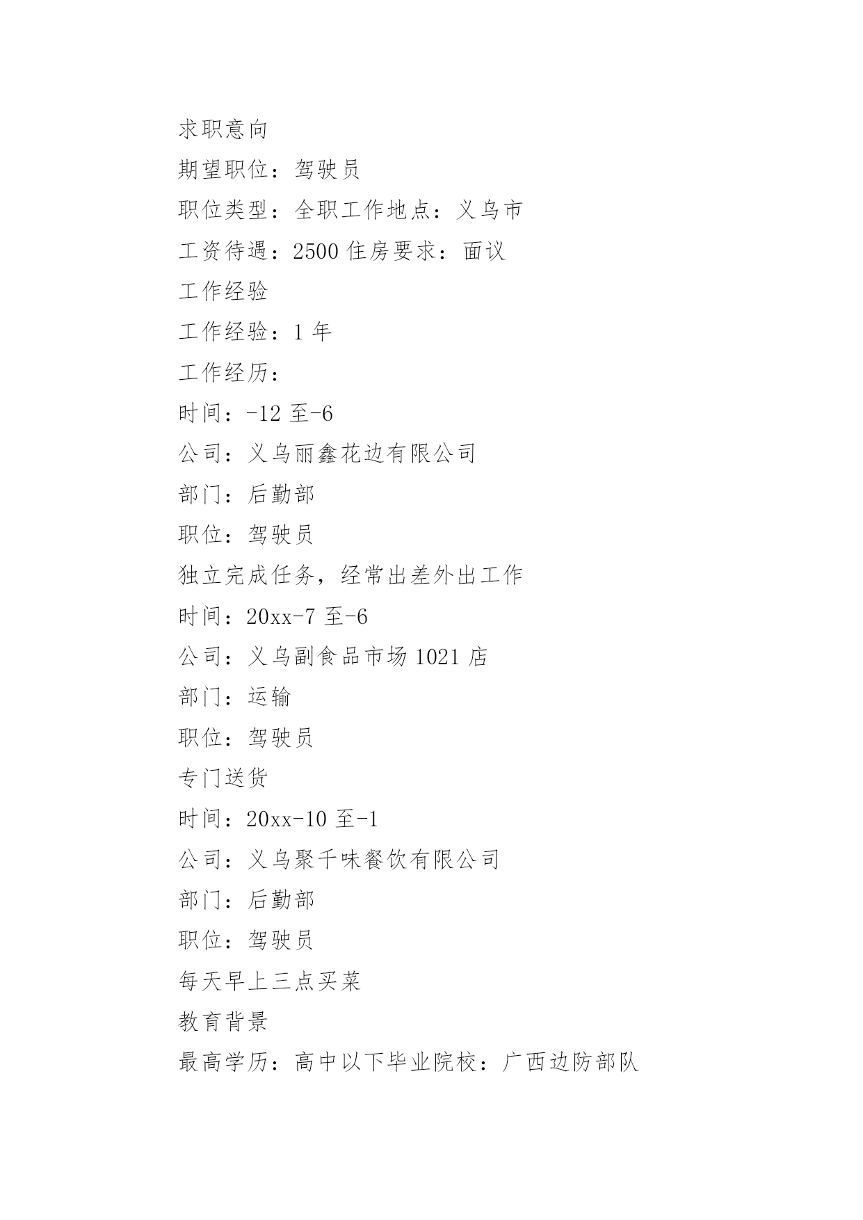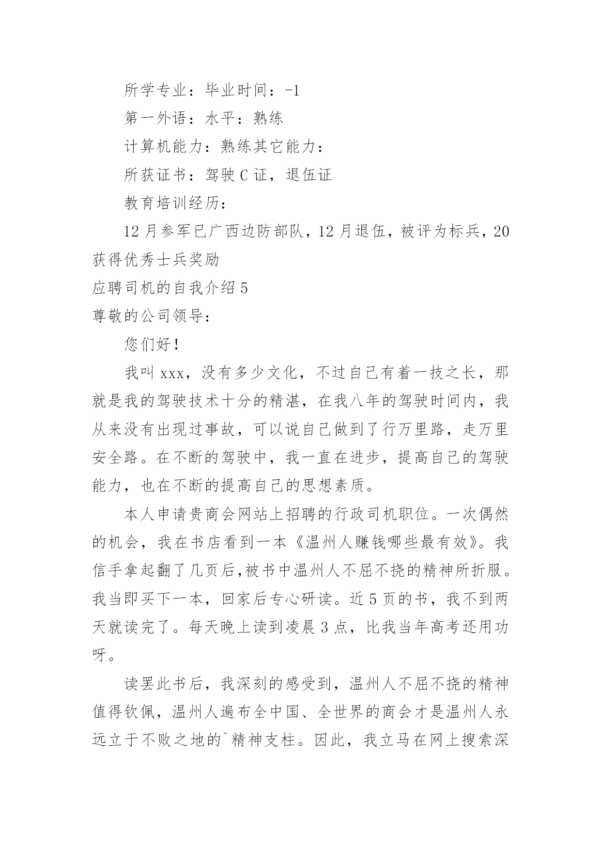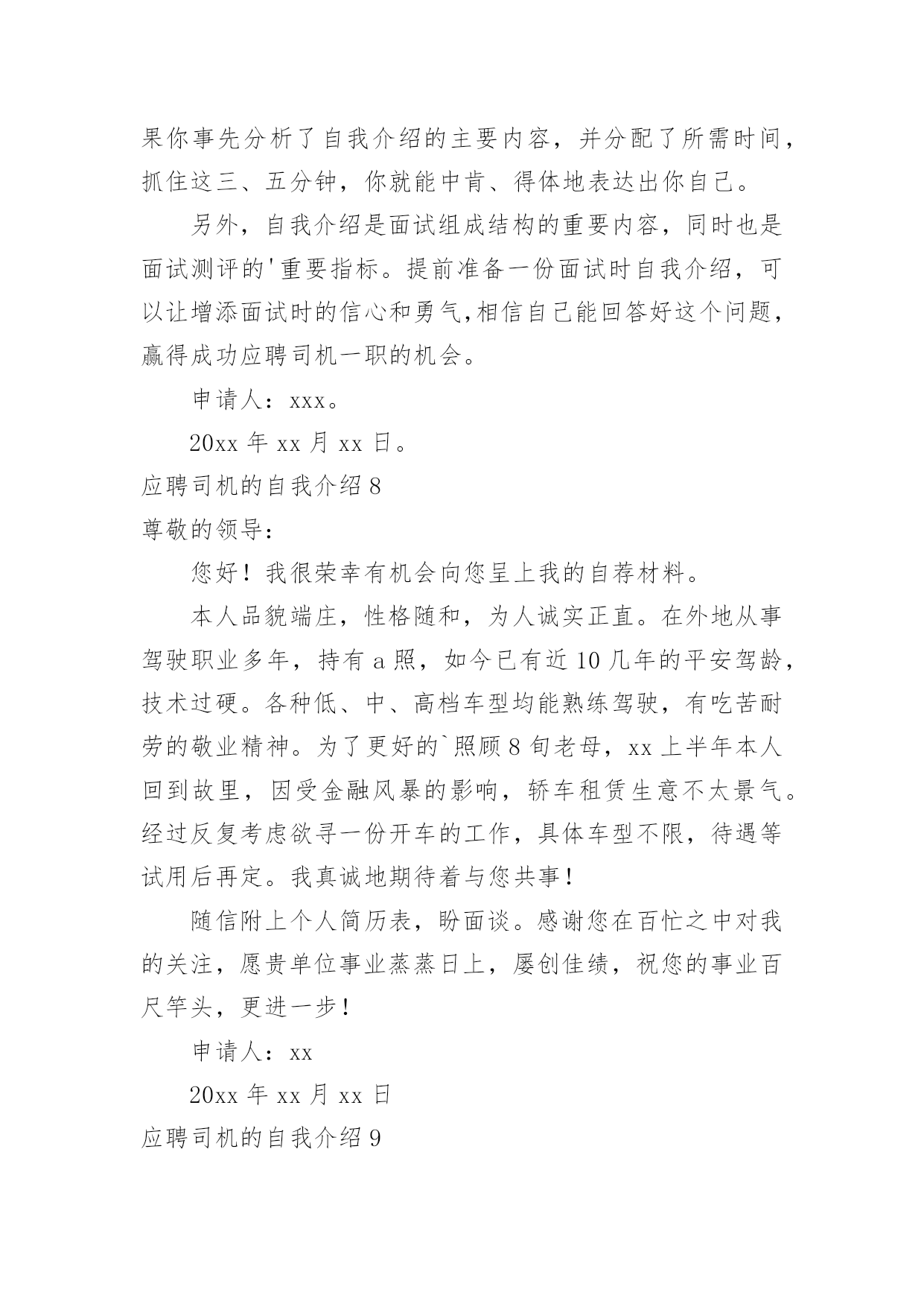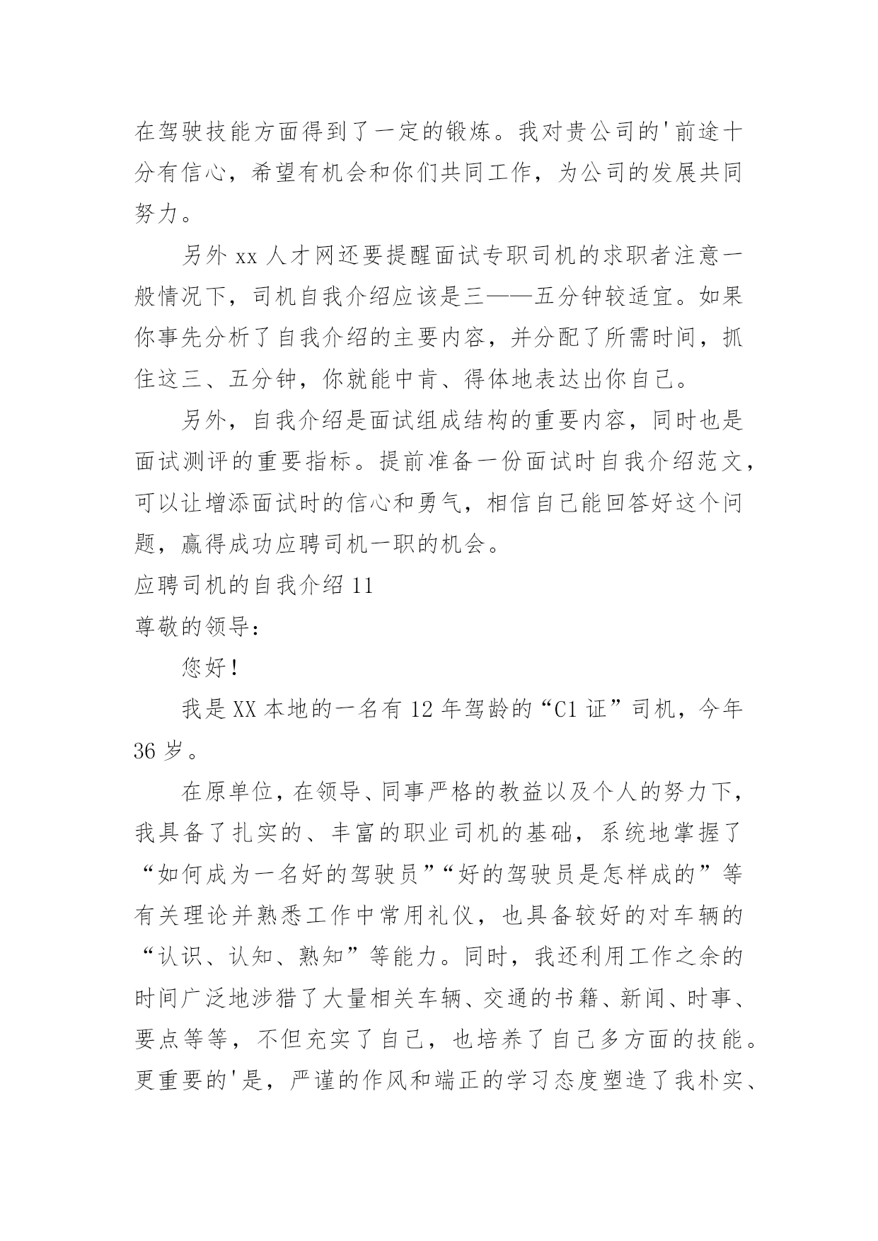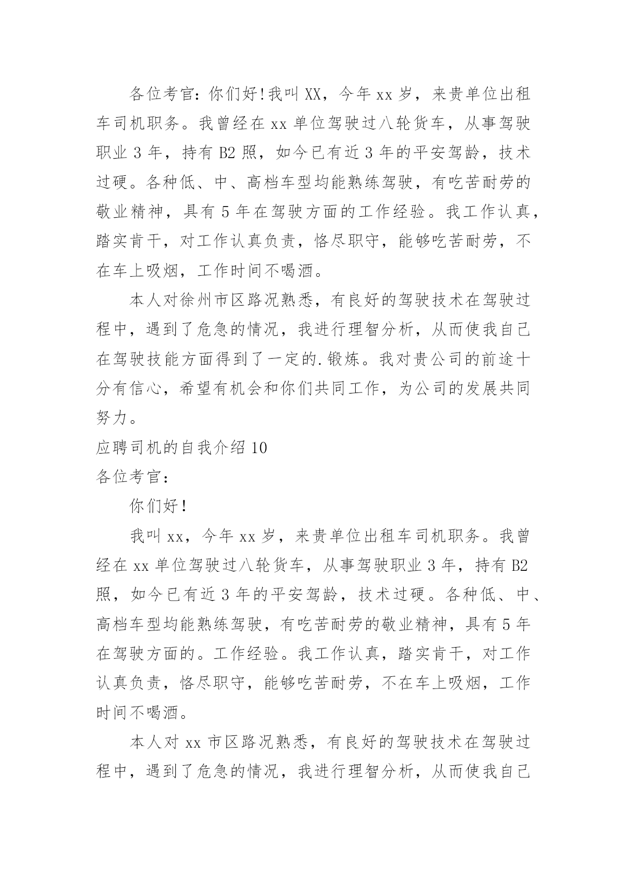 应聘司机的自我介绍应聘司机的自我介绍[优选15篇]当我们在一个新环境中,我们不得不需要向他人介绍自己,自我介绍是一种认识自我的手段。那么自我介绍有什么格式呢?下面是小编整理的应聘司机的自我介绍,希望能够帮助到大家。应聘司机的自我介绍1尊敬的领导:您好!我很荣幸有机会向您呈上我的自荐材料。本人品貌端庄,性格随和,为人诚实正直。在外地从事驾驶职业多年,持有a照,如今已有近10几年的平安驾龄,技术过硬。各种低、中、高档车型均能熟练驾驶,有吃苦耐劳的敬业精神。为了更好的'照顾8旬老母,xx上半年本人回到故里,因受金融风暴的影响,轿车租赁生意不太景气。经过反复考虑欲寻一份开车的工作,具体车型不限,待遇等试用后再定。我真诚地期待着与您共事!感谢您在百忙之中对我的关注,愿贵单位事业蒸蒸日上,屡创佳绩,祝您的事业百尺竿头,更进一步!应聘司机的自我介绍2北京驾龄8年道路熟悉开过多款车型:宝马奥迪迈腾金杯等可驾驶大部分车型b2驾照对工作认真负责踏实肯干曾就业于新然瑞文化有限公司私企后于华商报北京站工作主要工作为对单位领导接待日常单位公出单位位置最好是朝阳区顺义区因本人住机场附近。应聘司机的自我介绍3各位考官:你们好!我叫XXX,今年XX岁,来贵单位应聘司机职务。我曾经在XXX单位驾驶过XXX车,从事驾驶职业3年,持有B2照,如今已有近3年的平安驾龄,技术过硬。各种低、中、高档车型均能熟练驾驶,有吃苦耐劳的敬业精神,具有x年在xx方面的工作经验。我工作认真,踏实肯干,对工作认真负责,恪尽职守,能够吃苦耐劳,不在车上吸菸,工作时间不喝酒。本人对xx路况熟悉,有良好的驾驶技术在驾驶过程中,遇到了XXXXXX危急的.情况,我是怎么怎么处理的,从而使我自己在驾驶技能方面得到了一定的锻炼。我对贵公司的前途十分有信心,希望有机会和你们共同工作,为公司的发展共同努力。应聘司机的自我介绍4姓名:xxxxx出生年月:1986-7性别:男身高:172婚姻状况:未婚籍贯:江西上绕政治面貌:共青团员目前所在地:义乌求职意向期望职位:驾驶员职位类型:全职工作地点:义乌市工资待遇:2500住房要求:面议工作经验工作经验:1年工作经历:时间:-12至-6公司:义乌丽鑫花边有限公司部门:后勤部职位:驾驶员独立完成任务,经常出差外出工作时间:20xx-7至-6公司:义乌副食品市场1021店部门:运输职位:驾驶员专门送货时间:20xx-10至-1公司:义乌聚千味餐饮有限公司部门:后勤部职位:驾驶员每天早上三点买菜教育背景最高学历:高中以下毕业院校:广西边防部队所学专业:毕业时间:-1第一外语:水平:熟练计算机能力:熟练其它能力:所获证书:驾驶C证,退伍证教育培训经历:12月参军已广西边防部队,12月退伍,被评为标兵,20获得优秀士兵奖励应聘司机的自我介绍5尊敬的公司领导:您们好!我叫xxx,没有多少文化,不过自己有着一技之长,那就是我的驾驶技术十分的精湛,在我八年的驾驶时间内,我从来没有出现过事故,可以说自己做到了行万里路,走万里安全路。在不断的驾驶中,我一直在进步,提高自己的驾驶能力,也在不断的提高自己的思想素质。本人申请贵商会网站上招聘的行政司机职位。一次偶然的机会,我在书店看到一本《温州人赚钱哪些最有效》。我信手拿起翻了几页后,被书中温州人不屈不挠的精神所折服。我当即买下一本,回家后专心研读。近5页的书,我不到两天就读完了。每天晚上读到凌晨3点,比我当年高考还用功呀。读罢此书后,我深刻的感受到,温州人不屈不挠的精神值得钦佩,温州人遍布全中国、全世界的商会才是温州人永远立于不败之地的`精神支柱。因此,我立马在网上搜索深圳温州商会信息,发现商会正在招聘员工。我心想,这是多么好的一个机会,我也许可以为自己的精神家园服务?于是,我毫不犹豫的将自己的简历发至贵商会的邮箱。不好意思,说了半天,还没有介绍自己的情况。我老家在贵州,去年5月从贵州农行辞职来到深圳创业。今年8月转成深圳户口。我有8家的驾龄,虽然本人来深圳时间不长,但由于自己有一部车,经常在深圳关内、关外跑,所以对深圳的交通环境还算熟悉。以往我走过来的路,我从不后悔,我正是抱着更好的发展和更好的进步,我才从老家贵州来到了温州,我期望在温州实现我的人生价值,有更大的表现机会,也有更好的前景,国家这些年来的不断发展,我坚信只要每一人都努力的话,就一定会取得成功,我相信我能够做好!我虽然不是温州人,但我想温州精神是全人类的共同财富。我衷心地希望商会领导能给我一个机会,让我成为商会一份子,为商会的发展贡献自己微薄的力量。再次恳请商会领导给我一个为自己精神家园服务的机会。谢谢!应聘司机的自我介绍6各位考官:你们好!我叫xxx,今年XX岁,来贵单位应聘司机职务。我曾经在X单位驾驶过车,从事驾驶职业3年,持有B2照,如今已有近3年的平安驾龄