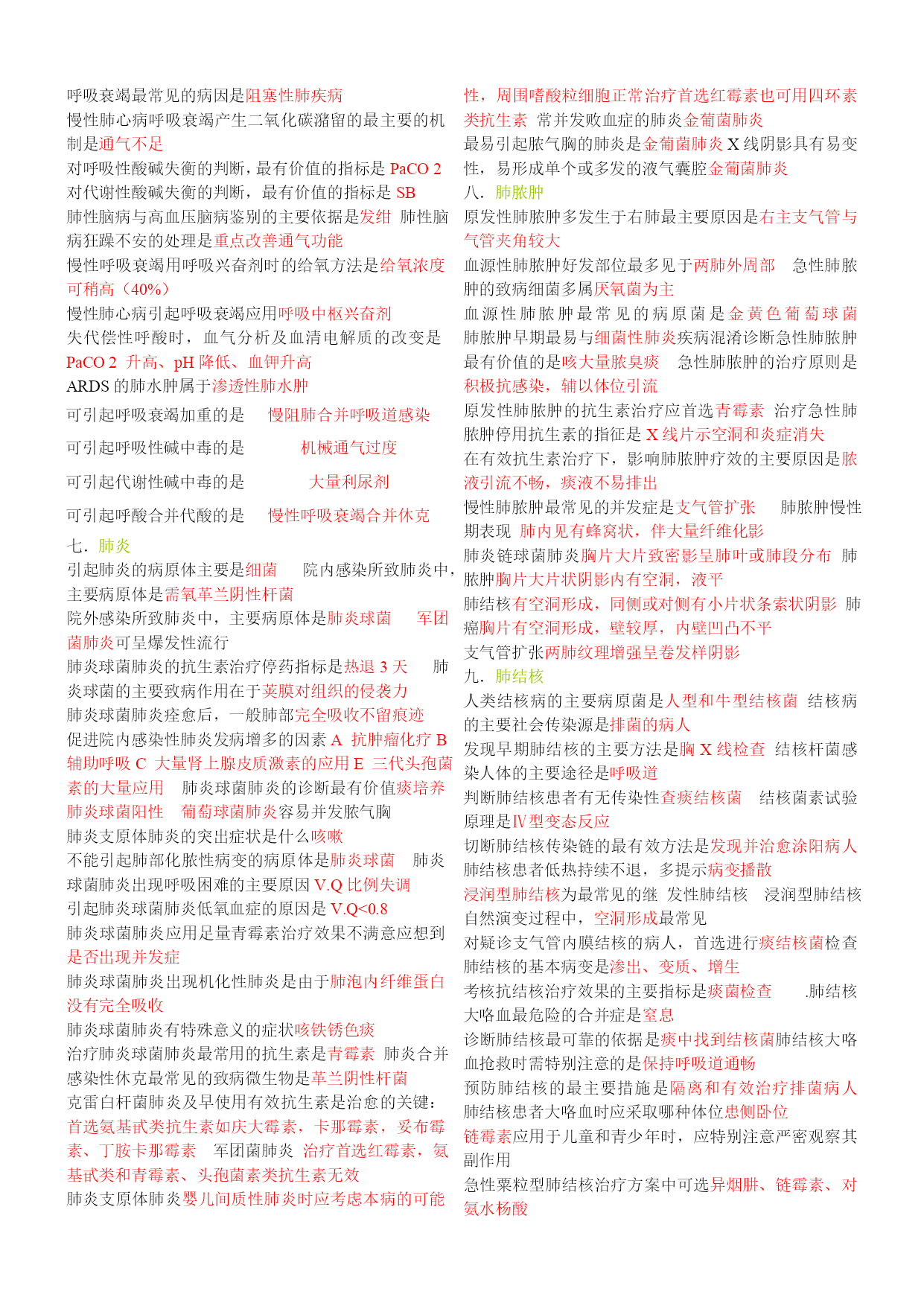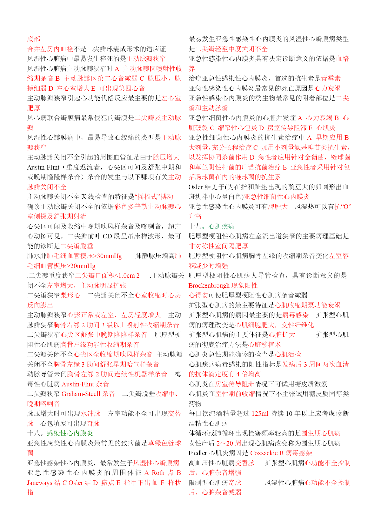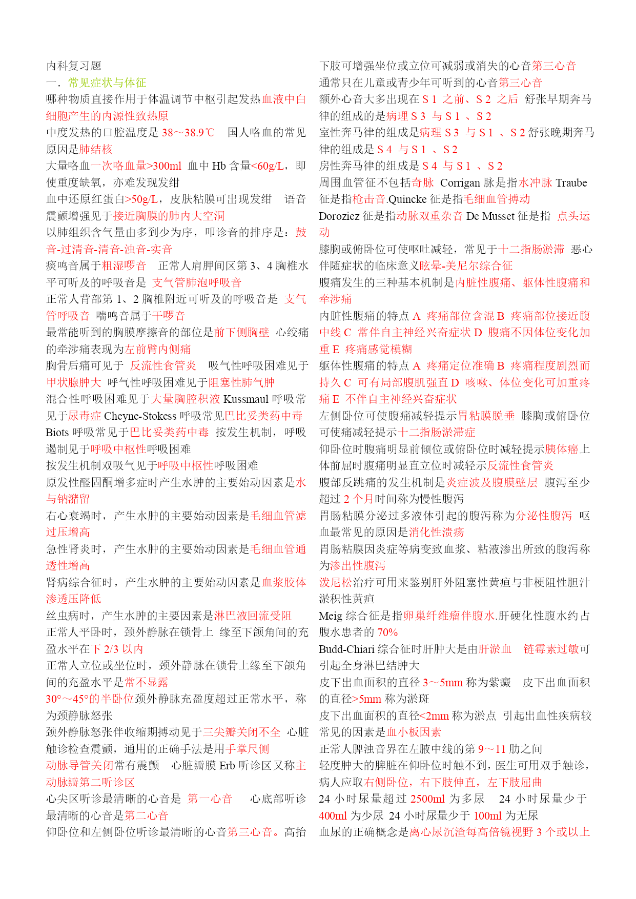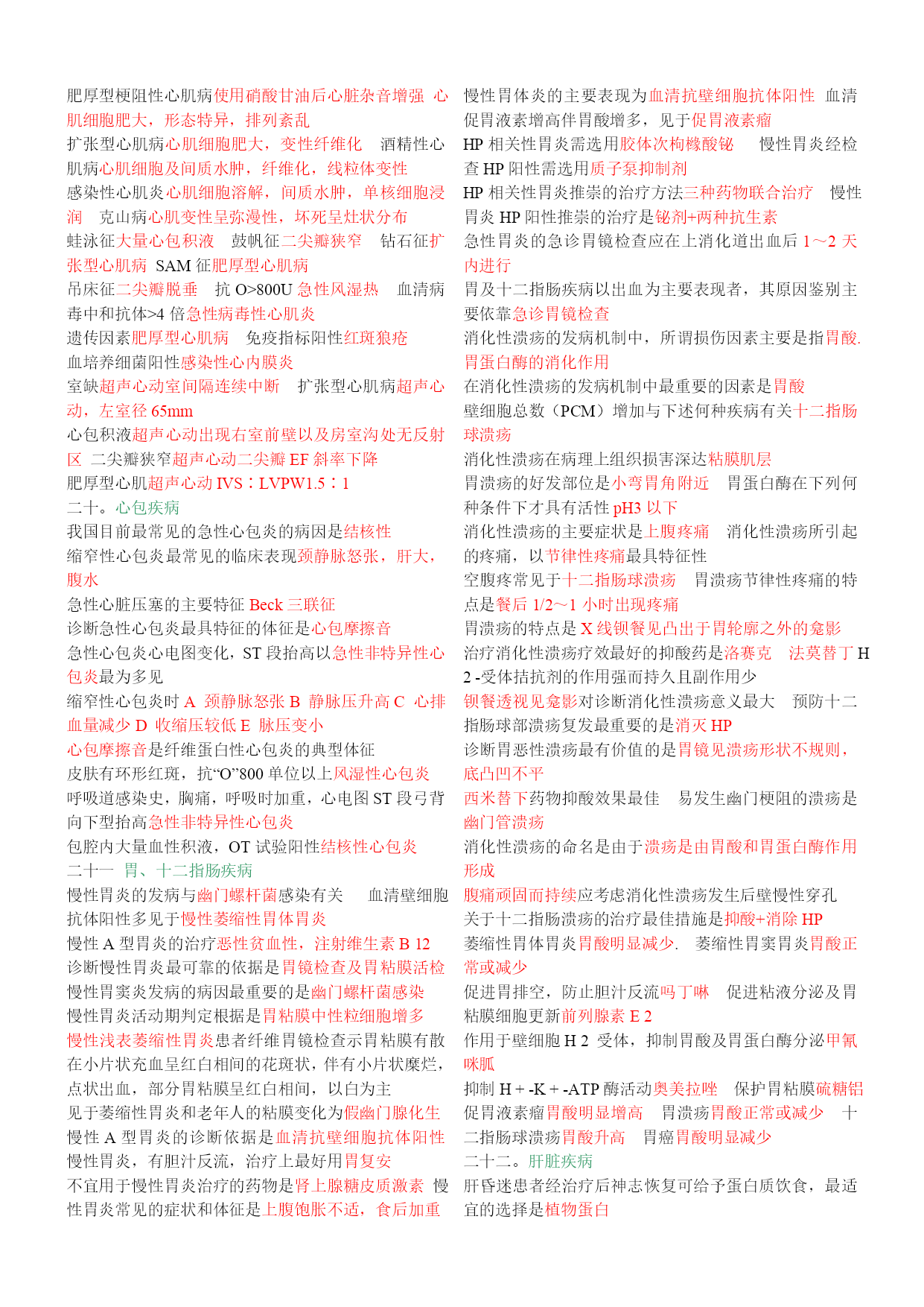 协和执业医师笔记-内科(完整版)实用资料(可以直接使用,可编辑完整版实用资料,欢迎下载)内科复习题一.常见症状与体征哪种物质直接作用于体温调节中枢引起发热血液中白细胞产生的内源性致热原中度发热的口腔温度是38~38.9℃国人咯血的常见原因是肺结核大量咯血一次咯血量>300ml血中Hb含量<60g/L,即使重度缺氧,亦难发现发绀血中还原红蛋白>50g/L,皮肤粘膜可出现发绀语音震颤增强见于接近胸膜的肺内大空洞以肺组织含气量由多到少为序,叩诊音的排序是:鼓音-过清音-清音-浊音-实音痰鸣音属于粗湿啰音正常人肩胛间区第3、4胸椎水平可听及的呼吸音是支气管肺泡呼吸音正常人背部第1、2胸椎附近可听及的呼吸音是支气管呼吸音喘鸣音属于干啰音最常能听到的胸膜摩擦音的部位是前下侧胸壁心绞痛的牵涉痛表现为左前臂内侧痛胸骨后痛可见于反流性食管炎吸气性呼吸困难见于甲状腺肿大呼气性呼吸困难见于阻塞性肺气肿混合性呼吸困难见于大量胸腔积液Kussmaul呼吸常见于尿毒症Cheyne-Stokess呼吸常见巴比妥类药中毒Biots呼吸常见于巴比妥类药中毒按发生机制,呼吸遏制见于呼吸中枢性呼吸困难按发生机制双吸气见于呼吸中枢性呼吸困难原发性醛固酮增多症时产生水肿的主要始动因素是水与钠潴留右心衰竭时,产生水肿的主要始动因素是毛细血管滤过压增高急性肾炎时,产生水肿的主要始动因素是毛细血管通透性增高肾病综合征时,产生水肿的主要始动因素是血浆胶体渗透压降低丝虫病时,产生水肿的主要因素是淋巴液回流受阻正常人平卧时,颈外静脉在锁骨上缘至下颌角间的充盈水平在下2/3以内正常人立位或坐位时,颈外静脉在锁骨上缘至下颌角间的充盈水平是常不显露30°~45°的半卧位颈外静脉充盈度超过正常水平,称为颈静脉怒张颈外静脉怒张伴收缩期搏动见于三尖瓣关闭不全心脏触诊检查震颤,通用的正确手法是用手掌尺侧动脉导管关闭常有震颤心脏瓣膜Erb听诊区又称主动脉瓣第二听诊区心尖区听诊最清晰的心音是第一心音心底部听诊最清晰的心音是第二心音仰卧位和左侧卧位听诊最清晰的心音第三心音。高抬下肢可增强坐位或立位可减弱或消失的心音第三心音通常只在儿童或青少年可听到的心音第三心音额外心音大多出现在S1之前、S2之后舒张早期奔马律的组成的是病理S3与S1、S2室性奔马律的组成是病理S3与S1、S2舒张晚期奔马律的组成是S4与S1、S2房性奔马律的组成是S4与S1、S2周围血管征不包括奇脉Corrigan脉是指水冲脉Traube征是指枪击音.Quincke征是指毛细血管搏动Doroziez征是指动脉双重杂音DeMusset征是指点头运动膝胸或俯卧位可使呕吐减轻,常见于十二指肠淤滞恶心伴随症状的临床意义眩晕-美尼尔综合征腹痛发生的三种基本机制是内脏性腹痛、躯体性腹痛和牵涉痛内脏性腹痛的特点A疼痛部位含混B疼痛部位接近腹中线C常伴自主神经兴奋症状D腹痛不因体位变化加重E疼痛感觉模糊躯体性腹痛的特点A疼痛定位准确B疼痛程度剧烈而持久C可有局部腹肌强直D咳嗽、体位变化可加重疼痛E不伴自主神经兴奋症状左侧卧位可使腹痛减轻提示胃粘膜脱垂膝胸或俯卧位可使痛减轻提示十二指肠淤滞症仰卧位时腹痛明显前倾位或俯卧位时减轻提示胰体癌上体前屈时腹痛明显直立位时减轻示反流性食管炎腹部反跳痛的发生机制是炎症波及腹膜壁层腹泻至少超过2个月时间称为慢性腹泻胃肠粘膜分泌过多液体引起的腹泻称为分泌性腹泻呕血最常见的原因是消化性溃疡胃肠粘膜因炎症等病变致血浆、粘液渗出所致的腹泻称为渗出性腹泻泼尼松治疗可用来鉴别肝外阻塞性黄疸与非梗阻性胆汁淤积性黄疸Meig综合征是指卵巢纤维瘤伴腹水.肝硬化性腹水约占腹水患者的70%Budd-Chiari综合征时肝肿大是由肝淤血链霉素过敏可引起全身淋巴结肿大皮下出血面积的直径3~5mm称为紫癜皮下出血面积的直径>5mm称为淤斑皮下出血面积的直径<2mm称为淤点引起出血性疾病较常见的因素是血小板因素正常人脾浊音界在左腋中线的第9~11肋之间轻度肿大的脾脏在仰卧位时触不到,医生可用双手触诊,病人应取右侧卧位,右下肢伸直,左下肢屈曲24小时尿量超过2500ml为多尿24小时尿量少于400ml为少尿24小时尿量少于100ml为无尿血尿的正确概念是离心尿沉渣每高倍镜视野3个或以上红细胞急性肾盂肾炎发热伴寒战流行性出血热发热伴出血.流行性感冒发热伴口角疱疹绿脓杆菌感染黄绿色或翠绿色痰.化脓菌感染黄色脓性痰肺结核干酪性肺炎微黄奶酪样痰肺棘球蚴病水样痰,内含粉皮样物念珠菌感染痰粘稠牵拉成丝肺炎杆菌肺炎砖红色胶冻样粘痰葡萄球菌肺炎粉红色乳样痰出血性疾病咯血颜色鲜红左心衰竭肺水肿粉红色浆液性泡沫样痰Eisenmenger综合征心性混血发绀