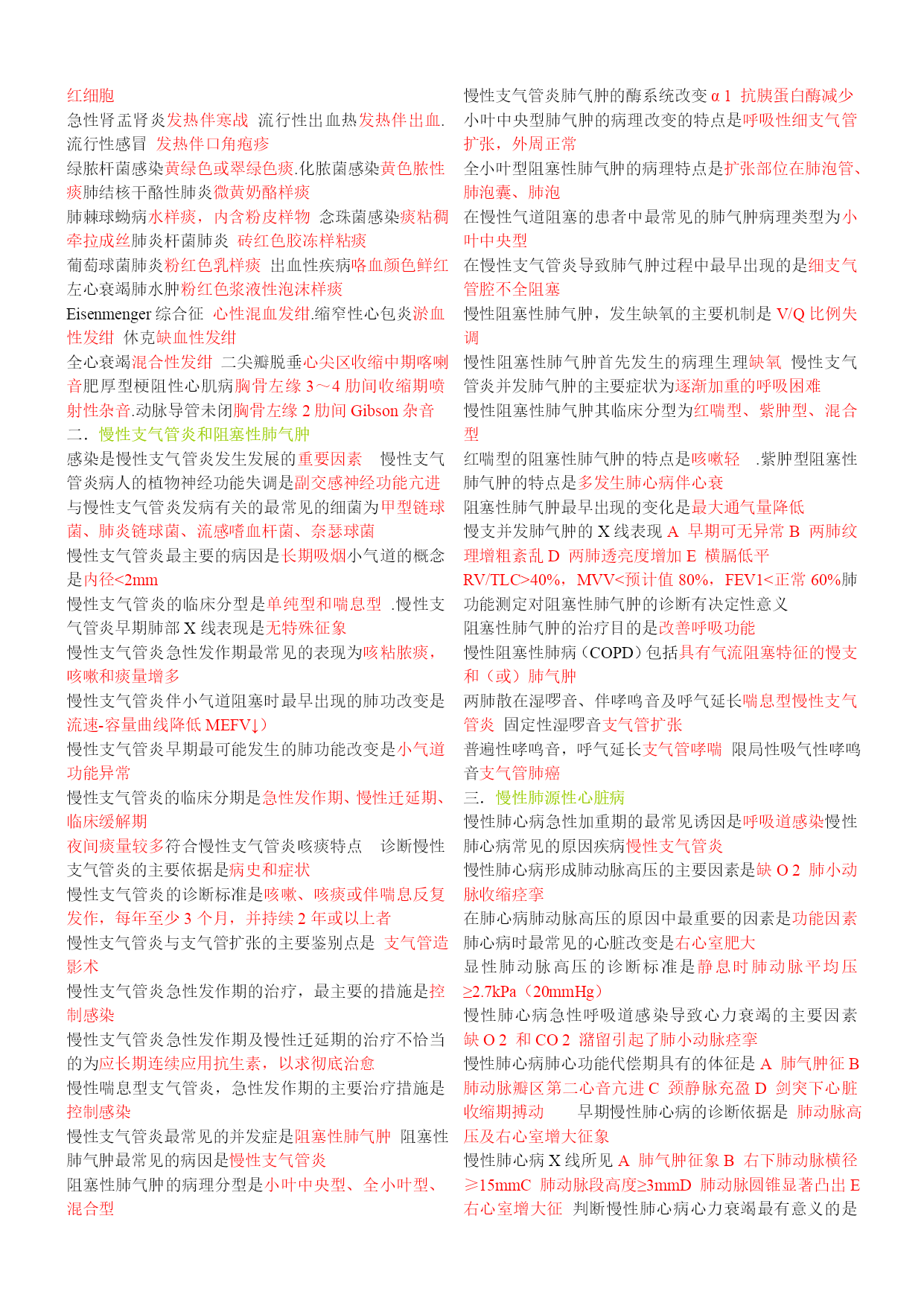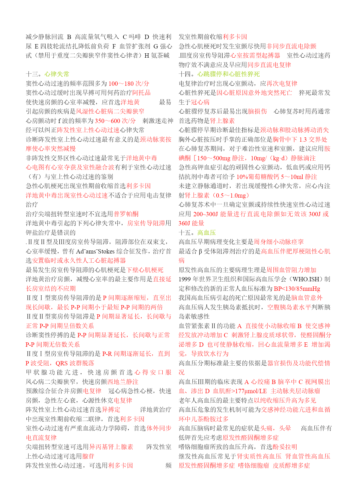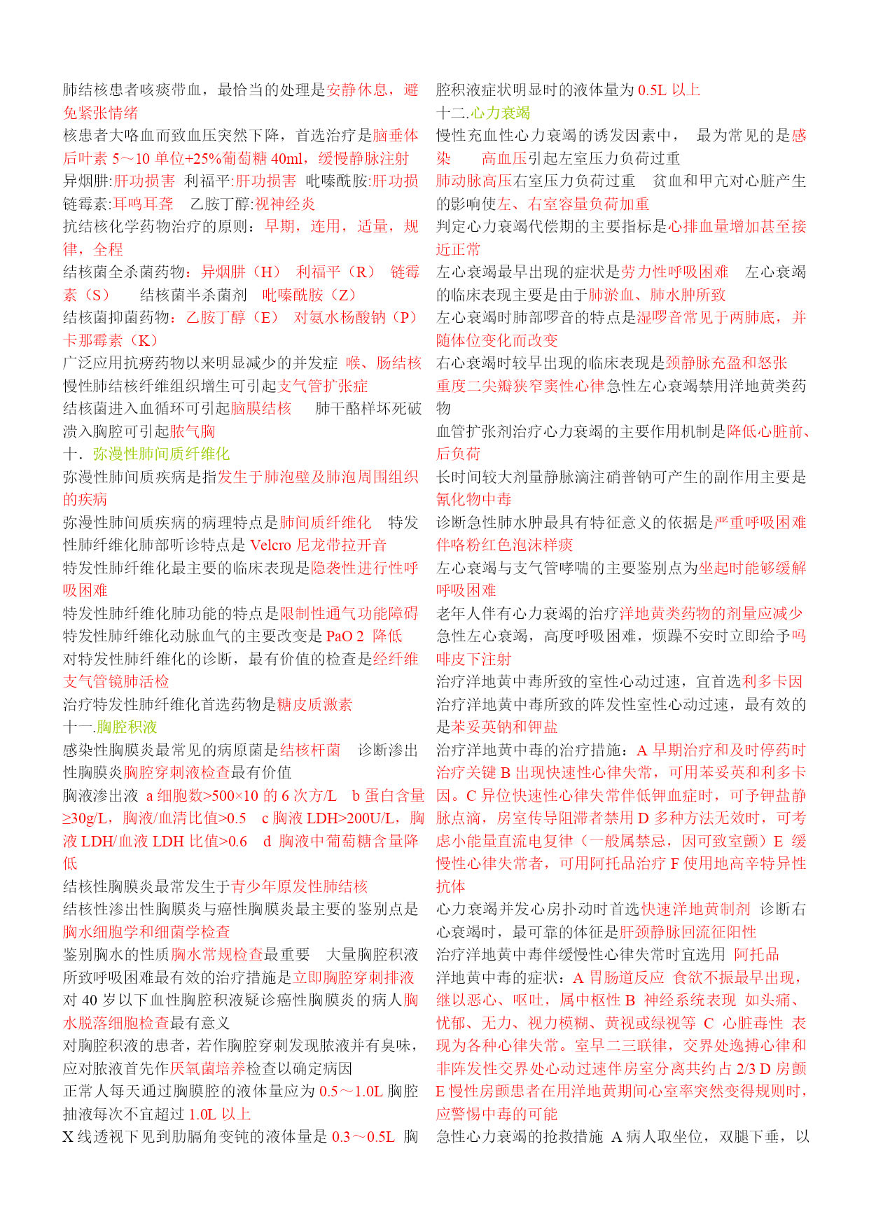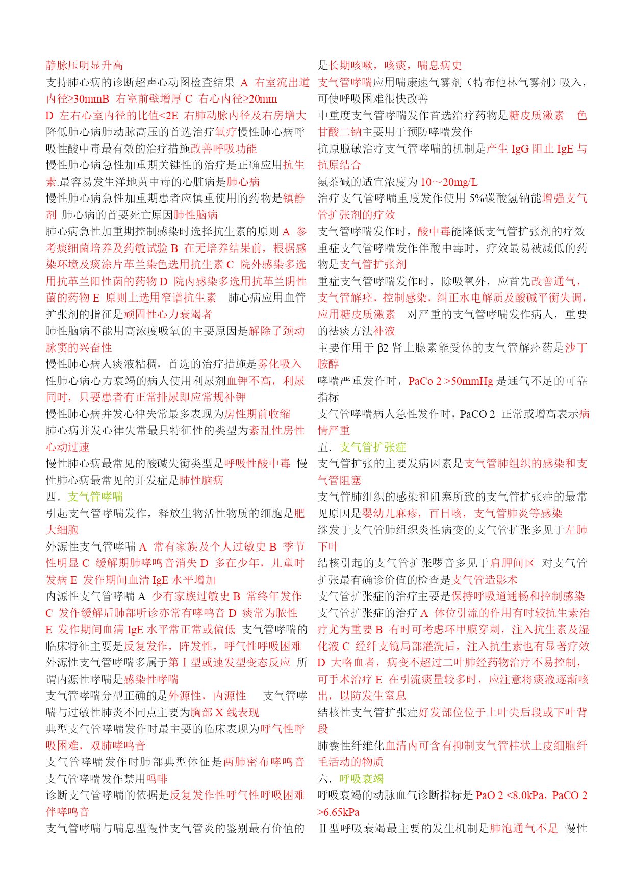 协和执业医师笔记-内科(完整版)实用资料(可以直接使用,可编辑完整版实用资料,欢迎下载)内科复习题一.常见症状与体征哪种物质直接作用于体温调节中枢引起发热血液中白细胞产生的内源性致热原中度发热的口腔温度是38~38.9℃国人咯血的常见原因是肺结核大量咯血一次咯血量>300ml血中Hb含量<60g/L,即使重度缺氧,亦难发现发绀血中还原红蛋白>50g/L,皮肤粘膜可出现发绀语音震颤增强见于接近胸膜的肺内大空洞以肺组织含气量由多到少为序,叩诊音的排序是:鼓音-过清音-清音-浊音-实音痰鸣音属于粗湿啰音正常人肩胛间区第3、4胸椎水平可听及的呼吸音是支气管肺泡呼吸音正常人背部第1、2胸椎附近可听及的呼吸音是支气管呼吸音喘鸣音属于干啰音最常能听到的胸膜摩擦音的部位是前下侧胸壁心绞痛的牵涉痛表现为左前臂内侧痛胸骨后痛可见于反流性食管炎吸气性呼吸困难见于甲状腺肿大呼气性呼吸困难见于阻塞性肺气肿混合性呼吸困难见于大量胸腔积液Kussmaul呼吸常见于尿毒症Cheyne-Stokess呼吸常见巴比妥类药中毒Biots呼吸常见于巴比妥类药中毒按发生机制,呼吸遏制见于呼吸中枢性呼吸困难按发生机制双吸气见于呼吸中枢性呼吸困难原发性醛固酮增多症时产生水肿的主要始动因素是水与钠潴留右心衰竭时,产生水肿的主要始动因素是毛细血管滤过压增高急性肾炎时,产生水肿的主要始动因素是毛细血管通透性增高肾病综合征时,产生水肿的主要始动因素是血浆胶体渗透压降低丝虫病时,产生水肿的主要因素是淋巴液回流受阻正常人平卧时,颈外静脉在锁骨上缘至下颌角间的充盈水平在下2/3以内正常人立位或坐位时,颈外静脉在锁骨上缘至下颌角间的充盈水平是常不显露30°~45°的半卧位颈外静脉充盈度超过正常水平,称为颈静脉怒张颈外静脉怒张伴收缩期搏动见于三尖瓣关闭不全心脏触诊检查震颤,通用的正确手法是用手掌尺侧动脉导管关闭常有震颤心脏瓣膜Erb听诊区又称主动脉瓣第二听诊区心尖区听诊最清晰的心音是第一心音心底部听诊最清晰的心音是第二心音仰卧位和左侧卧位听诊最清晰的心音第三心音。高抬下肢可增强坐位或立位可减弱或消失的心音第三心音通常只在儿童或青少年可听到的心音第三心音额外心音大多出现在S1之前、S2之后舒张早期奔马律的组成的是病理S3与S1、S2室性奔马律的组成是病理S3与S1、S2舒张晚期奔马律的组成是S4与S1、S2房性奔马律的组成是S4与S1、S2周围血管征不包括奇脉Corrigan脉是指水冲脉Traube征是指枪击音.Quincke征是指毛细血管搏动Doroziez征是指动脉双重杂音DeMusset征是指点头运动膝胸或俯卧位可使呕吐减轻,常见于十二指肠淤滞恶心伴随症状的临床意义眩晕-美尼尔综合征腹痛发生的三种基本机制是内脏性腹痛、躯体性腹痛和牵涉痛内脏性腹痛的特点A疼痛部位含混B疼痛部位接近腹中线C常伴自主神经兴奋症状D腹痛不因体位变化加重E疼痛感觉模糊躯体性腹痛的特点A疼痛定位准确B疼痛程度剧烈而持久C可有局部腹肌强直D咳嗽、体位变化可加重疼痛E不伴自主神经兴奋症状左侧卧位可使腹痛减轻提示胃粘膜脱垂膝胸或俯卧位可使痛减轻提示十二指肠淤滞症仰卧位时腹痛明显前倾位或俯卧位时减轻提示胰体癌上体前屈时腹痛明显直立位时减轻示反流性食管炎腹部反跳痛的发生机制是炎症波及腹膜壁层腹泻至少超过2个月时间称为慢性腹泻胃肠粘膜分泌过多液体引起的腹泻称为分泌性腹泻呕血最常见的原因是消化性溃疡胃肠粘膜因炎症等病变致血浆、粘液渗出所致的腹泻称为渗出性腹泻泼尼松治疗可用来鉴别肝外阻塞性黄疸与非梗阻性胆汁淤积性黄疸Meig综合征是指卵巢纤维瘤伴腹水.肝硬化性腹水约占腹水患者的70%Budd-Chiari综合征时肝肿大是由肝淤血链霉素过敏可引起全身淋巴结肿大皮下出血面积的直径3~5mm称为紫癜皮下出血面积的直径>5mm称为淤斑皮下出血面积的直径<2mm称为淤点引起出血性疾病较常见的因素是血小板因素正常人脾浊音界在左腋中线的第9~11肋之间轻度肿大的脾脏在仰卧位时触不到,医生可用双手触诊,病人应取右侧卧位,右下肢伸直,左下肢屈曲24小时尿量超过2500ml为多尿24小时尿量少于400ml为少尿24小时尿量少于100ml为无尿血尿的正确概念是离心尿沉渣每高倍镜视野3个或以上红细胞急性肾盂肾炎发热伴寒战流行性出血热发热伴出血.流行性感冒发热伴口角疱疹绿脓杆菌感染黄绿色或翠绿色痰.化脓菌感染黄色脓性痰肺结核干酪性肺炎微黄奶酪样痰肺棘球蚴病水样痰,内含粉皮样物念珠菌感染痰粘稠牵拉成丝肺炎杆菌肺炎砖红色胶冻样粘痰葡萄球菌肺炎粉红色乳样痰出血性疾病咯血颜色鲜红左心衰竭肺水肿粉红色浆液性泡沫样痰Eisenmenger综合征心性混血发绀