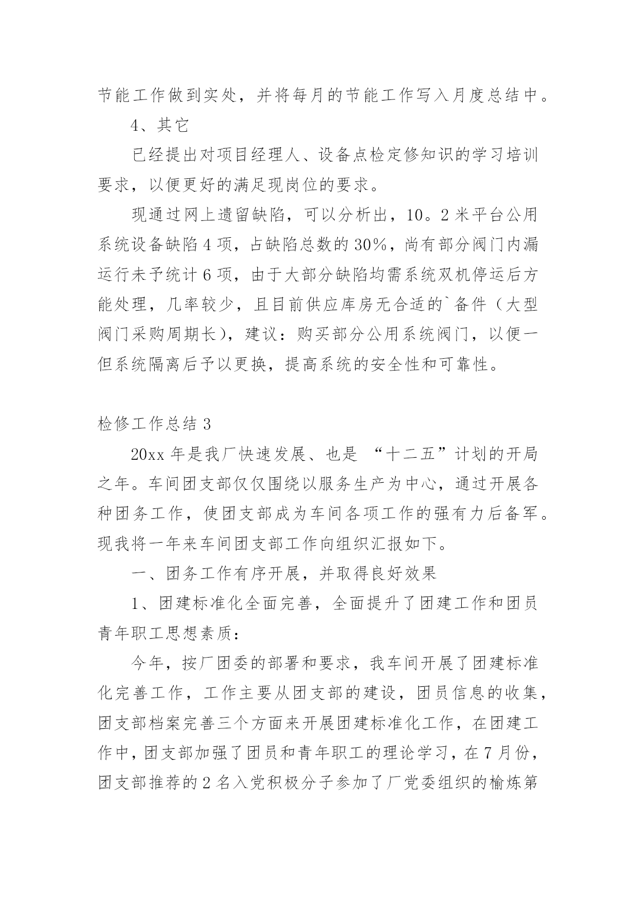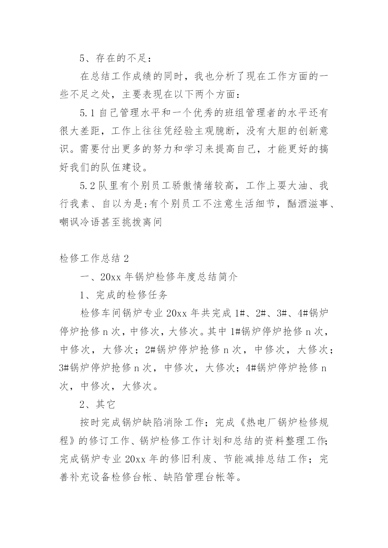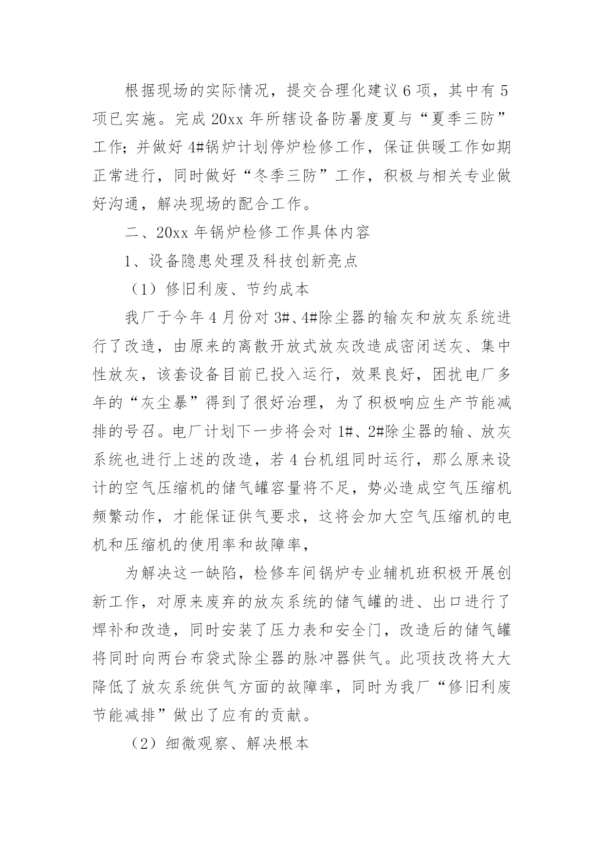 检修工作总结总结是事后对某一时期、某一项目或某些工作进行回顾和分析,从而做出带有规律性的结论,它可以明确下一步的工作方向,少走弯路,少犯错误,提高工作效益,因此我们需要回头归纳,写一份总结了。你所见过的总结应该是什么样的?以下是小编整理的检修工作总结,希望能够帮助到大家。检修工作总结11.安全方面:一年来,我们队里没有出现过任何人为因素引起的异常和未遂,个人失误和差错得到了有效控制。每天早上上班,我都会提前进入现场,从mis系统上查询当日设备缺陷,确认当日主要工作项目。亲自主持召开队里的班前会、班后会,结合“三讲一落实”要求,在班前会上对当天工作任务进行安排和布置,结合工作内容、工作环境和天气因素可能带来的危险因素进行认真分析并制定详实可行的控制措施,责任落实到人,为当日各项工作的顺利完成把好第一道关口。每日工作开工前及工作过程中对现场工作进行全面的检查监督,并对检查监督中发现的问题及时进行纠正和考核,数百日如一日的与员工共艰辛、同努力,确保了队里每日工作安全顺利的开展。每天班后会对当日工作中出现的问题进行总结分析,同时分析当日出现问题员工的思想动态,确保受到处分、考核的员工在思想上不出现抵触情绪。做到了有问题及时解决问题、有危险及时加以控制,从而保证了队里各项工作安全顺利的进行。每周二安全日活动中,我都会把一周工作中出现的不安全、不规范现象进行一个总结,在安全日活动中同广大职工一起进行分析和讨论,并制定更加切合实际的控制措施在下周工作中进行落实。正是通过这样认真进行的“两会一活动”,认真把握工作中的各个安全细节,才使得我们队数年来没有发生过任何人身伤害和设备损坏事故。为公司、工程处、队里安全生产目标的实现做出了应有的贡献!2、工作方面:我们队是曾经拿到省电力公司和省三公司授予“工人先锋号”的先进班组,在这些光荣的荣誉面前,我们没有骄傲、没有停止进步,而是以“工人先锋号”的荣誉为动力,在年一年里,我们相继顺利地完成了中标项目的3机停机小修、7机停机小修、8机的停机小修以及全厂责任范围内的正常检修维护工作,在3机停机小修期间,我们责任范围内的4机、6机几乎同时停机进行检修,我们在人员少、任务重的超大压力下,通过精心组织、克服困难、团结一致,做到了忙而不乱、有条不紊,在完成好招标范围3机小修的同时,圆满完成了4、6机的停机检修任论务,得到了业主和领导们的充分肯定和认可。十月份的1机a级大修,虽然我们没能如愿中标,但是我们没有气馁,在完成好我们正常检修维护任务的同时,加班加点甚至通宵达旦的工作,保质保量的完成了水源地1取水升压泵大修、42开式泵大修及其他外委单位遗留的8机氢冷器泄漏、1机氢冷器泄漏等抢修任务,为公司运行机组的安全运行以及8机组、1机组按期顺利并网做出了积极地贡献!3、理论学习方面:按照年初学。习计划,组织各组分组理论学习的同时,督促各组认真完成年度学习计划,每月月度考试如期完成,为提升员工业务素质奠定了良好的基矗4、其他方面:4.1认真落实公司、工程处、队里的各项管理制度,坚持“以人为本”的管理理念,通过和职工谈心、沟通,了解职工的思想动态、生活状况,及时解决职工思想方面、生活方面的疑惑和困难,大大的提高了职工同志们的团队和大局意识。4.2通过兢兢业业的努力工作,以身作则,与广大职工同甘共苦。使我们队得到了业主高度的评价和肯定。给我们队在电厂检修市场的稳定发展奠定了良好的基矗4.3在几年的工作过程中,得到了公司、工程处各位领导的大力帮助和支持,并在年月日省公司工会举办的“情系三晋绽放活力”职工文体活动节上,取得了班组长论坛三等奖的好成绩。通过参加活动,在增强了一些个人信心的同时也感觉到了个人与同行业优秀班组长们之间的差距,只有不断努力学习,提高自身的管理水平,才能够带领我们这个团队走向更加美好的未来!5、存在的不足:在总结工作成绩的同时,我也分析了现在工作方面的一些不足之处,主要表现在以下两个方面:5.1自己管理水平和一个优秀的班组管理者的水平还有很大差距,工作上往往凭经验主观臆断,没有大胆的创新意识。需要付出更多的努力和学习来提高自己,才能更好的搞好我们的队伍建设。5.2队里有个别员工骄傲情绪较高,工作上耍大油、我行我素、自以为是;有个别员工不注意生活细节,酗酒滋事、嘲讽冷语甚至挑拨离间检修工作总结2一、20xx年锅炉检修年度总结简介1、完成的检修任务检修车间锅炉专业20xx年共完成1#、2#、3#、4#锅炉停炉抢修n次,中修次,大修次。其中1#锅炉停炉抢修n次,中修次,大修次;2#锅炉停炉抢修n次,中修次,大修次;3#锅炉停炉抢修n次,中修次,大修次;4#锅炉停炉抢修n次,中修次,大修次。2、其它按时完成锅炉缺陷消除工作;完成《热电厂锅炉检修规程》的修订工作、锅炉检修工作计划和总结的资料整理工作;完成锅炉专业