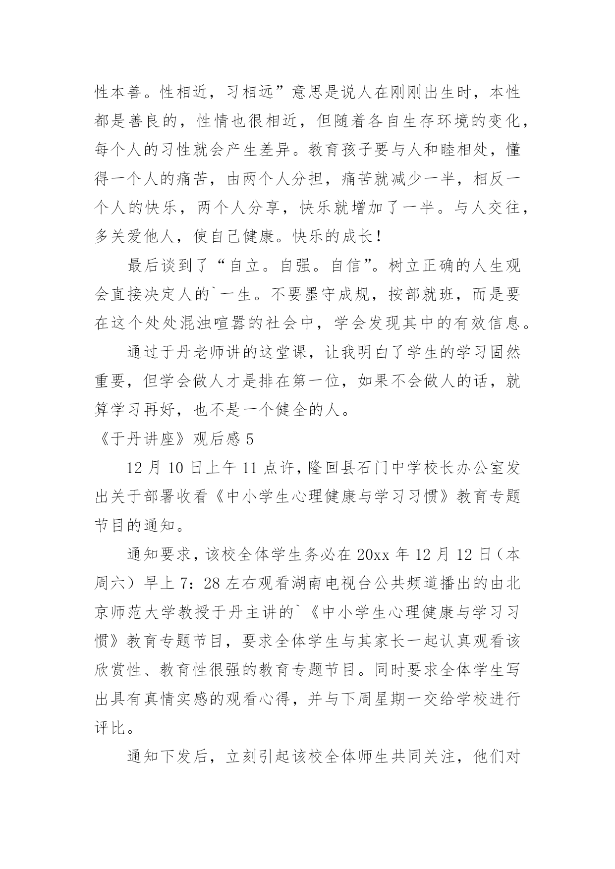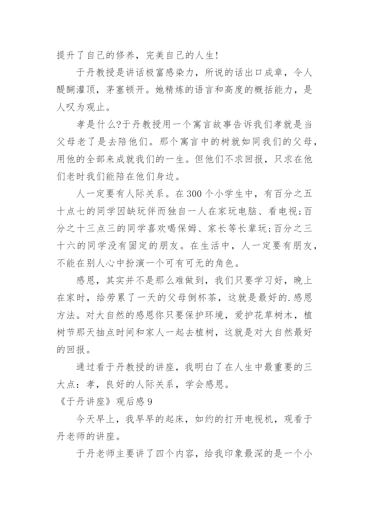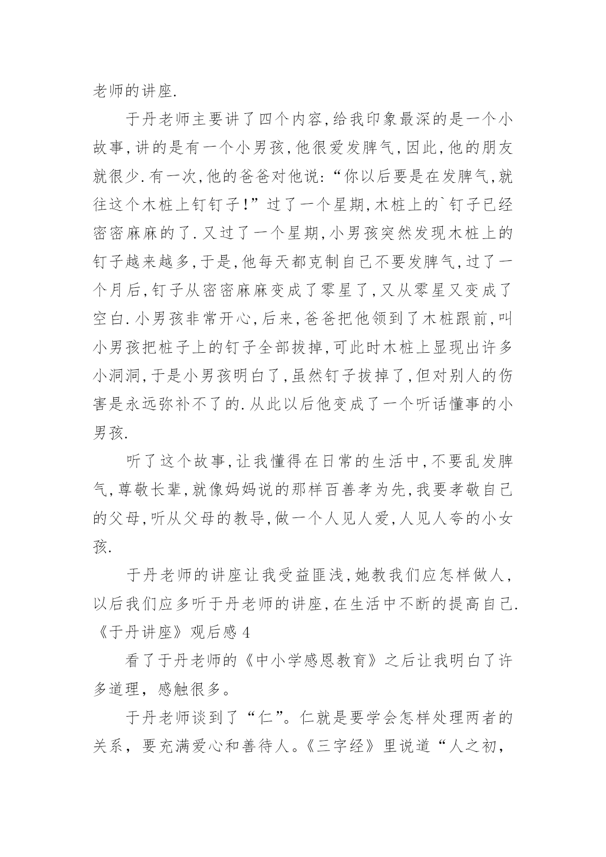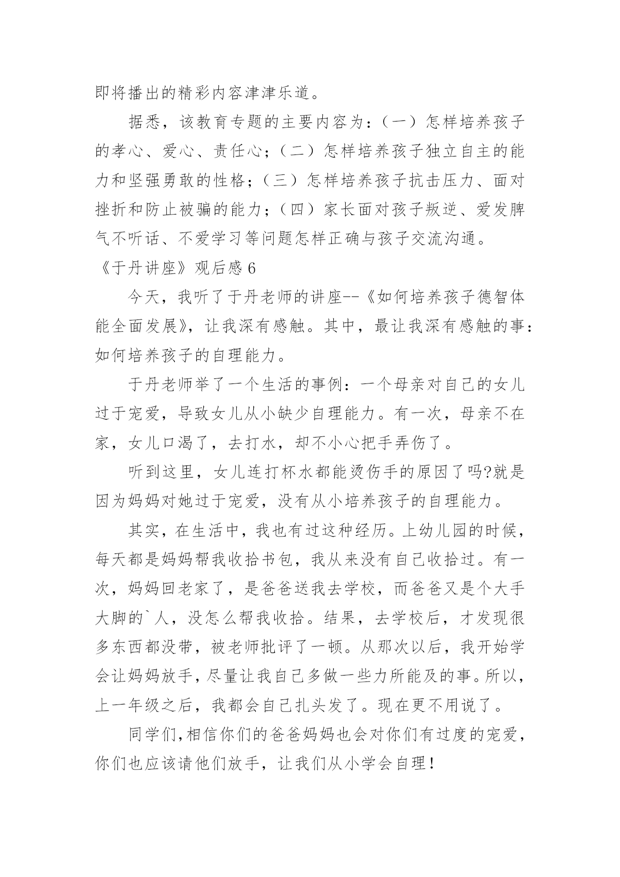 《于丹讲座》观后感《于丹讲座》观后感看完一部作品以后,一定有很多值得分享的心得吧,这时候最关键的观后感不能忘了。观后感你想好怎么写了吗?下面是小编整理的《于丹讲座》观后感,欢迎大家借鉴与参考,希望对大家有所帮助。《于丹讲座》观后感1今天,我看了于丹老师的讲座,让我很受启发。共分四个主题,一是如何培养孩子的孝心。二是如何培养孩子的爱心。三是如何培养孩子的自信心。四让我们懂得感恩。于丹老师的话,让我们明白了许多道理。作为新时代的学生,我们不但要努力学习,跟更让自己成为一个全面发展的人才。父母对儿女的爱是无私的,父母对我们的教育是尽心尽力的,可我们是怎样对待父母的.呢?我们只知道索取,可我们又给父母什么呢?我们有没有给父母干活?有没有给父母洗脚?动物上有小羊跪乳,乌鸦反哺之心,跟何况我们人呢?同学们,从今天起,我们不仅要对父母感恩,还要对身边的同学、老师朋友感恩,特别是我们老师。老师天天为我们上课,还要批改作业,默默无闻,没有一句怨言,在这里我由衷说声“老师你辛苦了”!同学们,让我们都有一颗感恩的心,世界将会变得更加美好!《于丹讲座》观后感2今天我在吉林教育频道收看了于丹老师的《中小学生感恩教育讲座》,受益匪浅。节目的开头讲的是一个小故事。把大树比喻成父母,大树陪着孩子长大,时时刻刻奉献着自己的果实、树枝、树干,让孩子实现了愿望。孩子长大后,大树变老了,孩子知道每天陪着大树。这时于丹老师讲到了“孝”字。百善孝为先,要我们知道感谢父母,尊敬师长。“仁”字是要我们充满爱心,和善待人。“自立、自强、自信”是说孩子的成长学习知识固然重要,但更主要的是经验和悟性。想想自己,有时候爸爸妈妈督促我学习,我总嫌他们啰嗦。有时候他们让我做一些力所能及的'事情,可我总是不情愿。想到这里,我感到很内疚,爸爸妈妈为了我,不知操了多少心,受了多少累。而我却不知道感恩,总惹他们生气、伤心,真是太不应该了。我今后有空闲的时候,给爸爸妈妈送一杯温水、一杯热茶。足以表达女儿的孝心。帮妈妈拿东西、洗几次衣袜,只要从小事做起,从一点一滴做起,让我学会感恩。这堂课让我明白了一个道理:学生最重要的并不是学习,学会做人才是最主要的,否则即使你考试得了100分,也不是一个健全的人。《于丹讲座》观后感3今天早上,我早早的起床,如约的打开电视机,观看于丹老师的讲座.于丹老师主要讲了四个内容,给我印象最深的是一个小故事,讲的是有一个小男孩,他很爱发脾气,因此,他的朋友就很少.有一次,他的爸爸对他说:“你以后要是在发脾气,就往这个木桩上钉钉子!”过了一个星期,木桩上的`钉子已经密密麻麻的了.又过了一个星期,小男孩突然发现木桩上的钉子越来越多,于是,他每天都克制自己不要发脾气,过了一个月后,钉子从密密麻麻变成了零星了,又从零星又变成了空白.小男孩非常开心,后来,爸爸把他领到了木桩跟前,叫小男孩把桩子上的钉子全部拔掉,可此时木桩上显现出许多小洞洞,于是小男孩明白了,虽然钉子拔掉了,但对别人的伤害是永远弥补不了的.从此以后他变成了一个听话懂事的小男孩.听了这个故事,让我懂得在日常的生活中,不要乱发脾气,尊敬长辈,就像妈妈说的那样百善孝为先,我要孝敬自己的父母,听从父母的教导,做一个人见人爱,人见人夸的小女孩.于丹老师的讲座让我受益匪浅,她教我们应怎样做人,以后我们应多听于丹老师的讲座,在生活中不断的提高自己.《于丹讲座》观后感4看了于丹老师的《中小学感恩教育》之后让我明白了许多道理,感触很多。于丹老师谈到了“仁”。仁就是要学会怎样处理两者的关系,要充满爱心和善待人。《三字经》里说道“人之初,性本善。性相近,习相远”意思是说人在刚刚出生时,本性都是善良的,性情也很相近,但随着各自生存环境的变化,每个人的习性就会产生差异。教育孩子要与人和睦相处,懂得一个人的痛苦,由两个人分担,痛苦就减少一半,相反一个人的快乐,两个人分享,快乐就增加了一半。与人交往,多关爱他人,使自己健康。快乐的成长!最后谈到了“自立。自强。自信”。树立正确的人生观会直接决定人的`一生。不要墨守成规,按部就班,而是要在这个处处混浊喧嚣的社会中,学会发现其中的有效信息。通过于丹老师讲的这堂课,让我明白了学生的学习固然重要,但学会做人才是排在第一位,如果不会做人的话,就算学习再好,也不是一个健全的人。《于丹讲座》观后感512月10日上午11点许,隆回县石门中学校长办公室发出关于部署收看《中小学生心理健康与学习习惯》教育专题节目的通知。通知要求,该校全体学生务必在20xx年12月12日(本周六)早上7:28左右观看湖南电视台公共频道播出的由北京师范大学教授于丹主讲的`《中小学生心理健康与学习习惯》教育专题节目,要求全体学生与其家长一起认真观看该欣赏性、教育性很强的教育专题节目。同时要求全体学生写出具有真情实感的观看心得,并与下周星