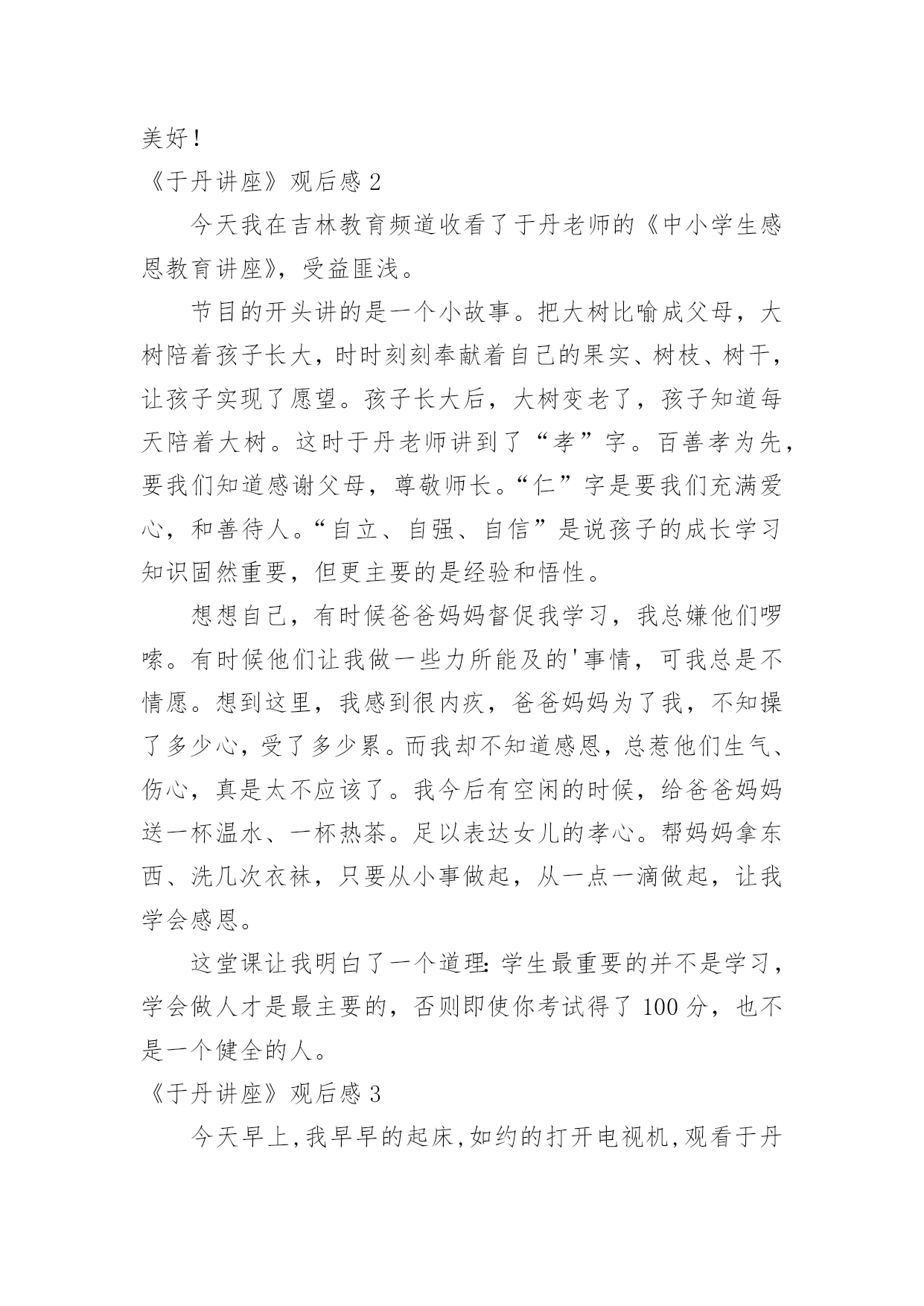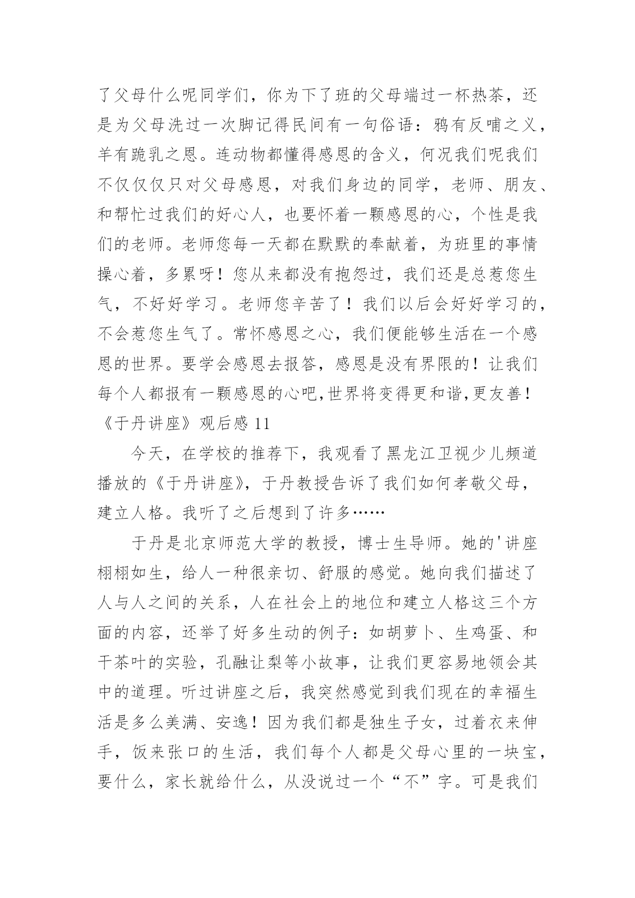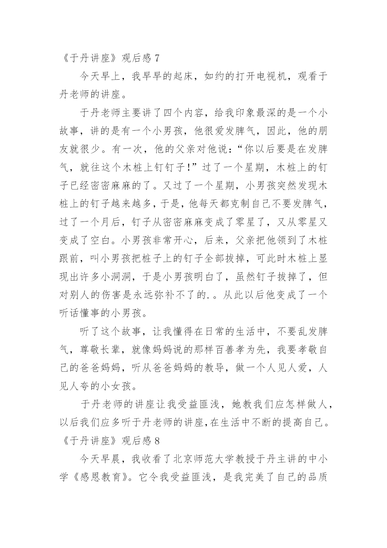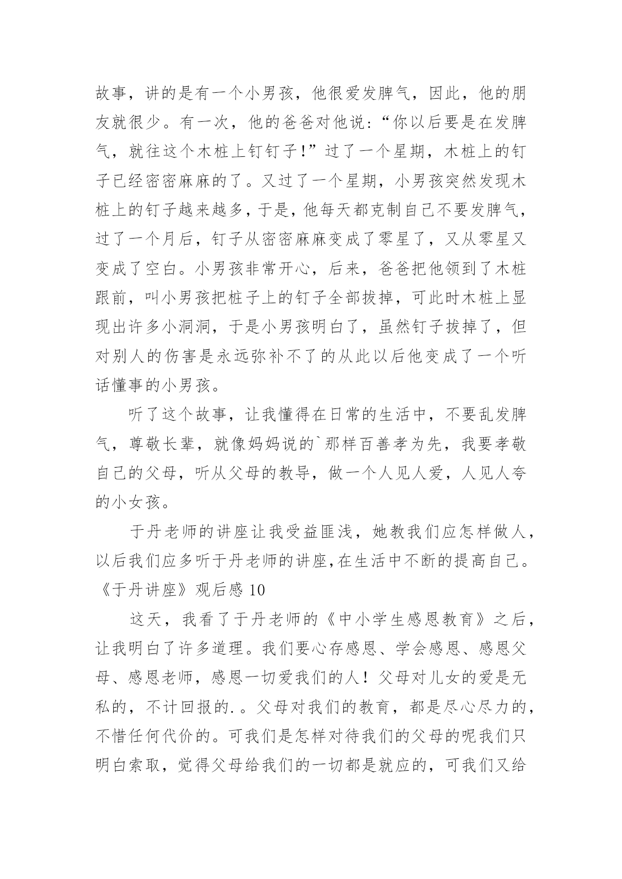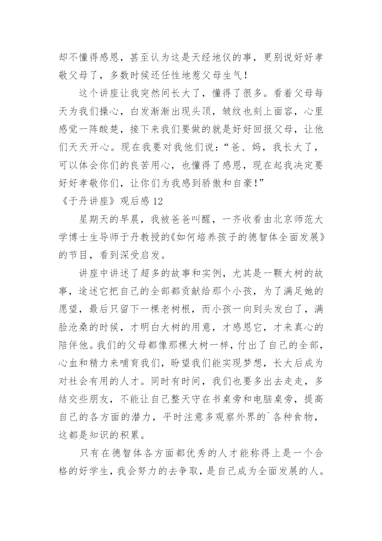 《于丹讲座》观后感《于丹讲座》观后感看完一部作品以后,一定有很多值得分享的心得吧,这时候最关键的观后感不能忘了。观后感你想好怎么写了吗?下面是小编整理的《于丹讲座》观后感,欢迎大家借鉴与参考,希望对大家有所帮助。《于丹讲座》观后感1今天,我看了于丹老师的讲座,让我很受启发。共分四个主题,一是如何培养孩子的孝心。二是如何培养孩子的爱心。三是如何培养孩子的自信心。四让我们懂得感恩。于丹老师的话,让我们明白了许多道理。作为新时代的学生,我们不但要努力学习,跟更让自己成为一个全面发展的人才。父母对儿女的爱是无私的,父母对我们的教育是尽心尽力的,可我们是怎样对待父母的.呢?我们只知道索取,可我们又给父母什么呢?我们有没有给父母干活?有没有给父母洗脚?动物上有小羊跪乳,乌鸦反哺之心,跟何况我们人呢?同学们,从今天起,我们不仅要对父母感恩,还要对身边的同学、老师朋友感恩,特别是我们老师。老师天天为我们上课,还要批改作业,默默无闻,没有一句怨言,在这里我由衷说声“老师你辛苦了”!同学们,让我们都有一颗感恩的心,世界将会变得更加美好!《于丹讲座》观后感2今天我在吉林教育频道收看了于丹老师的《中小学生感恩教育讲座》,受益匪浅。节目的开头讲的是一个小故事。把大树比喻成父母,大树陪着孩子长大,时时刻刻奉献着自己的果实、树枝、树干,让孩子实现了愿望。孩子长大后,大树变老了,孩子知道每天陪着大树。这时于丹老师讲到了“孝”字。百善孝为先,要我们知道感谢父母,尊敬师长。“仁”字是要我们充满爱心,和善待人。“自立、自强、自信”是说孩子的成长学习知识固然重要,但更主要的是经验和悟性。想想自己,有时候爸爸妈妈督促我学习,我总嫌他们啰嗦。有时候他们让我做一些力所能及的'事情,可我总是不情愿。想到这里,我感到很内疚,爸爸妈妈为了我,不知操了多少心,受了多少累。而我却不知道感恩,总惹他们生气、伤心,真是太不应该了。我今后有空闲的时候,给爸爸妈妈送一杯温水、一杯热茶。足以表达女儿的孝心。帮妈妈拿东西、洗几次衣袜,只要从小事做起,从一点一滴做起,让我学会感恩。这堂课让我明白了一个道理:学生最重要的并不是学习,学会做人才是最主要的,否则即使你考试得了100分,也不是一个健全的人。《于丹讲座》观后感3今天早上,我早早的起床,如约的打开电视机,观看于丹老师的讲座.于丹老师主要讲了四个内容,给我印象最深的是一个小故事,讲的是有一个小男孩,他很爱发脾气,因此,他的朋友就很少.有一次,他的爸爸对他说:“你以后要是在发脾气,就往这个木桩上钉钉子!”过了一个星期,木桩上的`钉子已经密密麻麻的了.又过了一个星期,小男孩突然发现木桩上的钉子越来越多,于是,他每天都克制自己不要发脾气,过了一个月后,钉子从密密麻麻变成了零星了,又从零星又变成了空白.小男孩非常开心,后来,爸爸把他领到了木桩跟前,叫小男孩把桩子上的钉子全部拔掉,可此时木桩上显现出许多小洞洞,于是小男孩明白了,虽然钉子拔掉了,但对别人的伤害是永远弥补不了的.从此以后他变成了一个听话懂事的小男孩.听了这个故事,让我懂得在日常的生活中,不要乱发脾气,尊敬长辈,就像妈妈说的那样百善孝为先,我要孝敬自己的父母,听从父母的教导,做一个人见人爱,人见人夸的小女孩.于丹老师的讲座让我受益匪浅,她教我们应怎样做人,以后我们应多听于丹老师的讲座,在生活中不断的提高自己.《于丹讲座》观后感4看了于丹老师的《中小学感恩教育》之后让我明白了许多道理,感触很多。于丹老师谈到了“仁”。仁就是要学会怎样处理两者的关系,要充满爱心和善待人。《三字经》里说道“人之初,性本善。性相近,习相远”意思是说人在刚刚出生时,本性都是善良的,性情也很相近,但随着各自生存环境的变化,每个人的习性就会产生差异。教育孩子要与人和睦相处,懂得一个人的痛苦,由两个人分担,痛苦就减少一半,相反一个人的快乐,两个人分享,快乐就增加了一半。与人交往,多关爱他人,使自己健康。快乐的成长!最后谈到了“自立。自强。自信”。树立正确的人生观会直接决定人的`一生。不要墨守成规,按部就班,而是要在这个处处混浊喧嚣的社会中,学会发现其中的有效信息。通过于丹老师讲的这堂课,让我明白了学生的学习固然重要,但学会做人才是排在第一位,如果不会做人的话,就算学习再好,也不是一个健全的人。《于丹讲座》观后感512月10日上午11点许,隆回县石门中学校长办公室发出关于部署收看《中小学生心理健康与学习习惯》教育专题节目的通知。通知要求,该校全体学生务必在20xx年12月12日(本周六)早上7:28左右观看湖南电视台公共频道播出的由北京师范大学教授于丹主讲的`《中小学生心理健康与学习习惯》教育专题节目,要求全体学生与其家长一起认真观看该欣赏性、教育性很强的教育专题节目。同时要求全体学生写出具有真情实感的观看心得,并与下周星