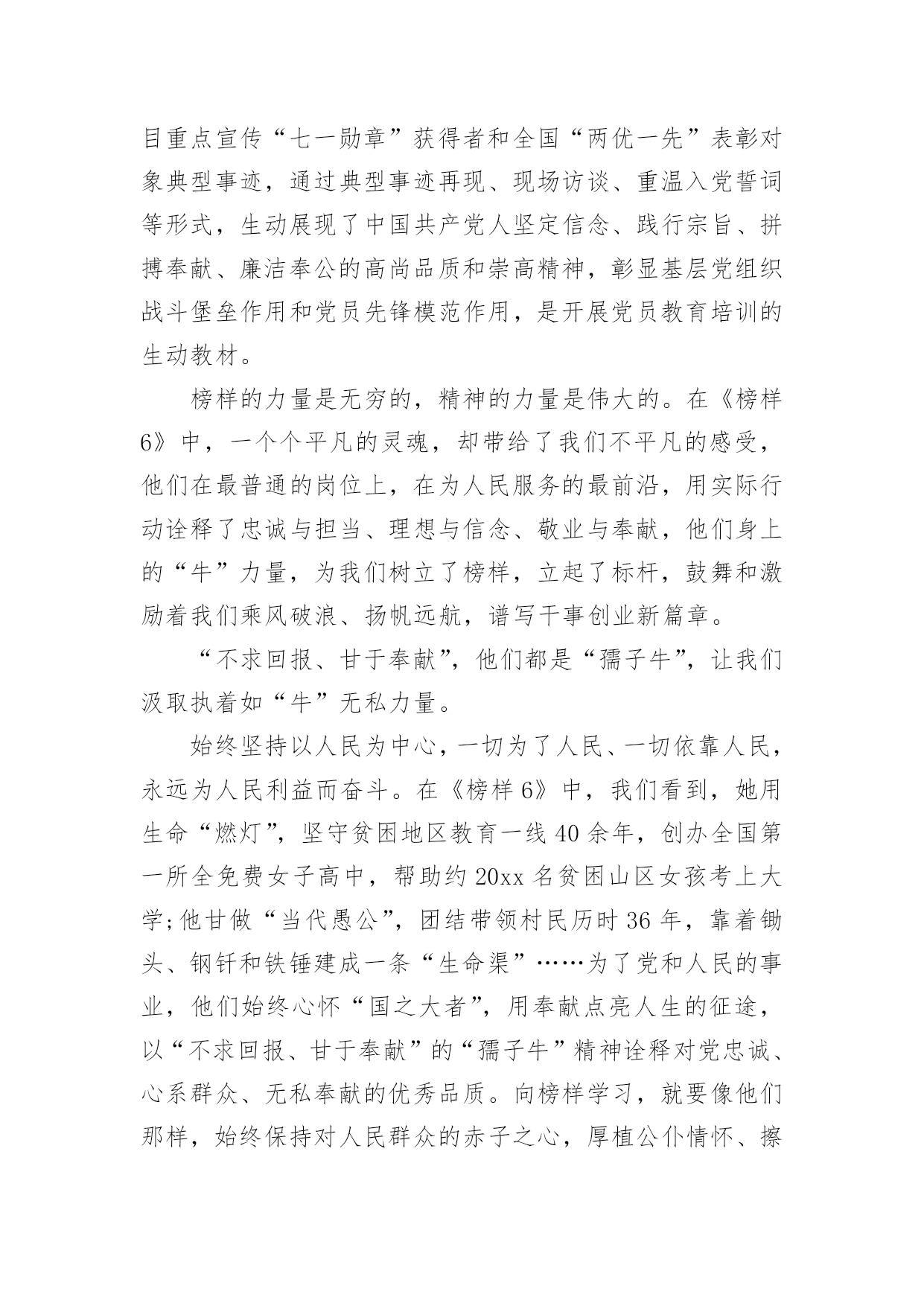 观看榜样观后感在看完一部作品以后,相信你会有不少感想吧,观后感需要表达真实的情感,不能虚假刻意。快来参考观后感是怎么写的吧,下面是小编精心整理的观看榜样观后感,希望能够帮助到大家。观看榜样观后感1作为一名师范生,我时常会思考,怎么才算得上是“桃李满天下”。我想过站在讲台上,台下几十名学生认真思考的样子;想过办公室里,三五结队的毕业生回到学校看望老师的样子;想过在各种岗位上同偶遇的老师侃侃而谈的学生的样子。但我似乎从没想过台下只有八名听不见声音的学生,只能靠手语和肢体语言,去让他们感受发音,感受世界的样子。我在《榜样8》中认识了衡阳市特殊教育学校教师刘玲,而我所不曾幻想过的“桃李满天下”,每天都在她身上上演。1973年,刘玲出生于衡阳市一个普通工人家庭,邻居是一名聋哑人,不识字也不能讲话。她从小就想,如果有学校能让他们从小就识字、学说话,那该多好。后来,她报考了南京特殊教育师范学校。18岁毕业那年,成为衡阳市特殊教育学校听障一年级的班主任。或许是命运弄人,即使十几年一心扑在听障教育上,在刘玲32岁时,还是收到了7个月大的儿子被诊断为先天性神经性耳聋的噩耗。刘玲重新振作起来,前思后想,她决定一边工作,一边自己训练儿子说话。她说:“当时我也没有经验,也不知道会不会有效果,但我是一个妈妈,我一定要努力!”命运还是会眷顾努力的人,在刘玲坚持不懈的训练下,儿子在1岁多时也能正常发音说话了,比正常孩子并没晚多少。似乎她做了去爱别人的天使,也成为了自己儿子的保护神。如今,32年的`辛勤付出,刘玲自创更适合听障学生的教学方法,先后荣获全国“党和人民满意的好老师”称号及“全国三八红旗手”“全国第四批岗位学雷锋标兵”“湖南省优秀共产党员”等荣誉。20xx年“七一”前夕,她被评为全国优秀共产党员,成为全省特教岗位唯一当选的教师。她教的学生中,有30多名考上大学,有的成了舞蹈演员、有的成了设计师、有的成了园艺师,还有2名学生毕业后回到特校当了老师。她做到了真正的“桃李满天下”。在那段并不长的介绍视频里,她不断做着手语的指尖仿佛承载了点点星光,照亮的不只是那一方教室,更是他们的未来,是无数听障人士的人生之路。我突然更深刻地感受到了“师范”的意义——手捧星光,照亮来路。观看榜样观后感2中央组织部和中央广播电视总台联合录制的《榜样6》将于12月8日晚间8点档在中央电视台综合频道首播,节目重点宣传“七一勋章”获得者和全国“两优一先”表彰对象典型事迹,通过典型事迹再现、现场访谈、重温入党誓词等形式,生动展现了中国共产党人坚定信念、践行宗旨、拼搏奉献、廉洁奉公的高尚品质和崇高精神,彰显基层党组织战斗堡垒作用和党员先锋模范作用,是开展党员教育培训的生动教材。榜样的力量是无穷的,精神的力量是伟大的。在《榜样6》中,一个个平凡的灵魂,却带给了我们不平凡的感受,他们在最普通的岗位上,在为人民服务的最前沿,用实际行动诠释了忠诚与担当、理想与信念、敬业与奉献,他们身上的“牛”力量,为我们树立了榜样,立起了标杆,鼓舞和激励着我们乘风破浪、扬帆远航,谱写干事创业新篇章。“不求回报、甘于奉献”,他们都是“孺子牛”,让我们汲取执着如“牛”无私力量。始终坚持以人民为中心,一切为了人民、一切依靠人民,永远为人民利益而奋斗。在《榜样6》中,我们看到,她用生命“燃灯”,坚守贫困地区教育一线40余年,创办全国第一所全免费女子高中,帮助约20xx名贫困山区女孩考上大学;他甘做“当代愚公”,团结带领村民历时36年,靠着锄头、钢钎和铁锤建成一条“生命渠”……为了党和人民的事业,他们始终心怀“国之大者”,用奉献点亮人生的征途,以“不求回报、甘于奉献”的“孺子牛”精神诠释对党忠诚、心系群众、无私奉献的优秀品质。向榜样学习,就要像他们那样,始终保持对人民群众的赤子之心,厚植公仆情怀、擦亮服务底色,在人民最需要的地方,迸发执着如“牛”的无私力量,尽心做好每一项工作,用心服务好广大人民群众,为增进民生福祉不断奋斗。“敢闯敢试、锐意进取”,他们都是“拓荒牛”,让我们汲取奔跑如“牛”奋进力量。逢山开路、遇水架桥、大胆探索,处处展现着埋头奋蹄勇向前的“牛劲”。在《榜样6》中,我们看到,他“为国铸盾”,创新提出了世界首创的技术路径并成功实施,实现了从“0”到“1”的突破;她抓党建责任制,开创网格化党建模式,持续推动党建引领基层治理;他探索“蹄腿理论”,引导牧民“减羊增牛”,带头开展“围栏轮牧”,让牧民脱贫,让草原变绿……无论是突破技术难题的藩篱,还是引领体制机制的创新,他们都撸起袖子加油干,以“敢闯敢试、锐意进取”的“拓荒牛”精神绽放出勇闯改革创新“无人区”的豪情。向榜样学习,就要像他们那样,始终践行与时俱进、锐意进取、勤于探索、勇于实践的改革创新精神,在本职岗位上迸发奔跑如“牛”奋进力量,做勇于挑战、勤于思考的
