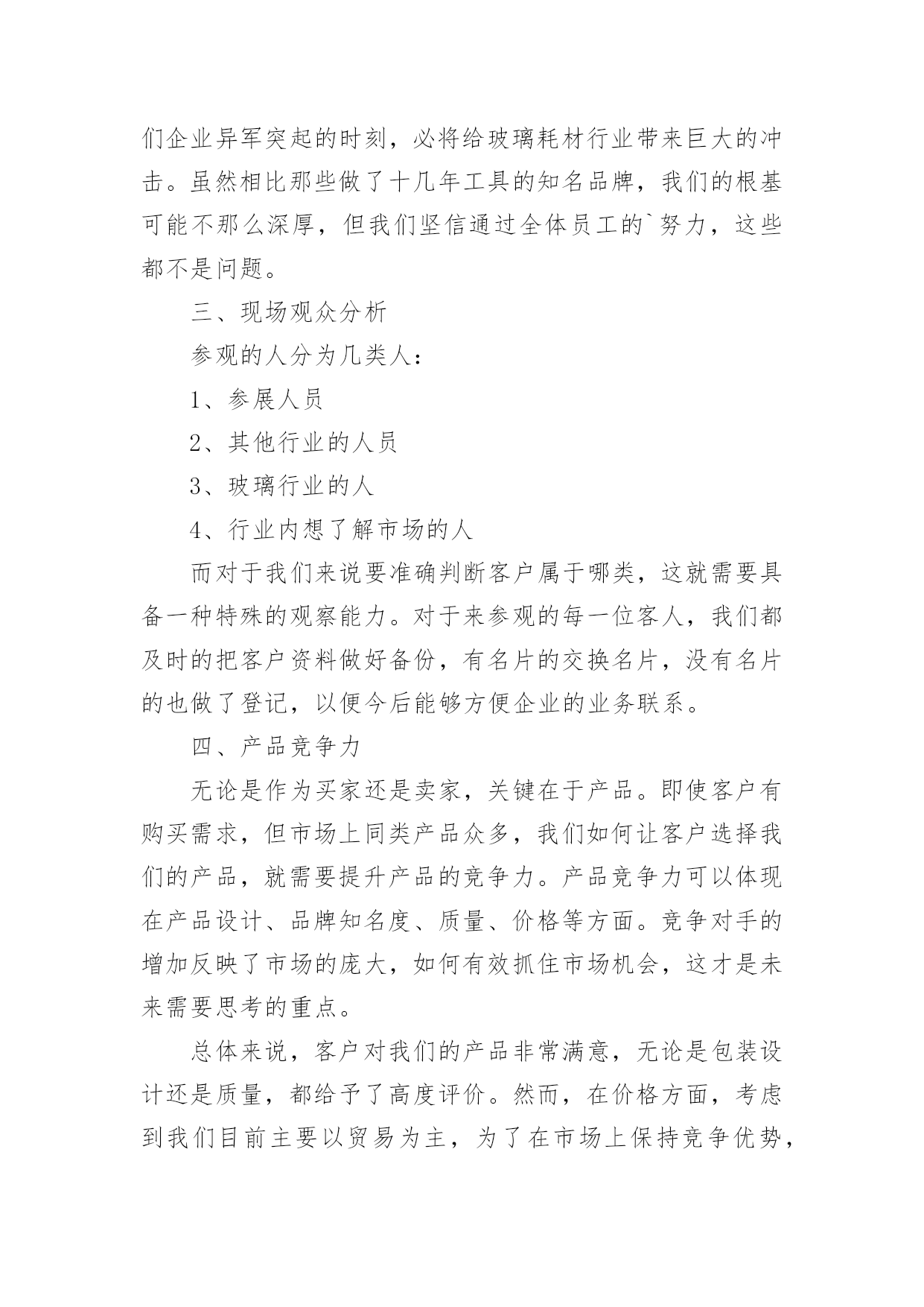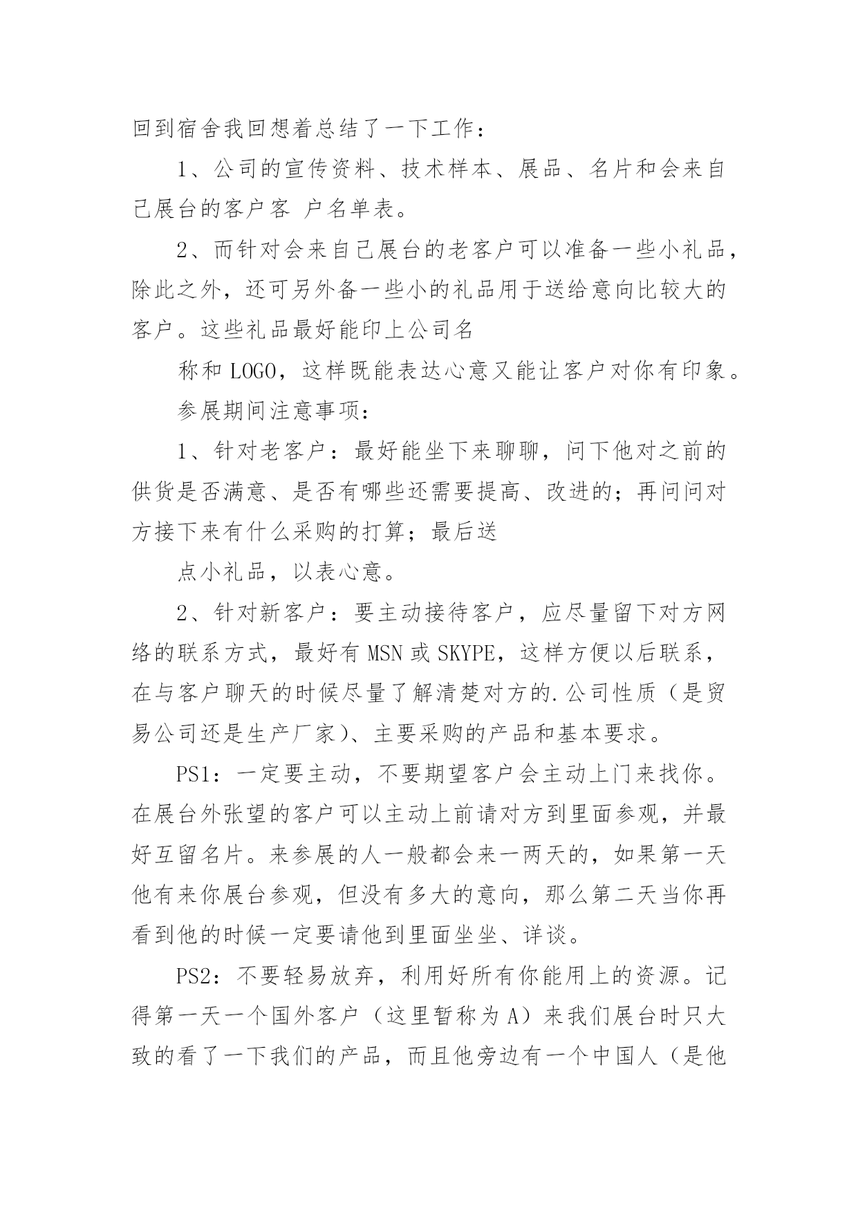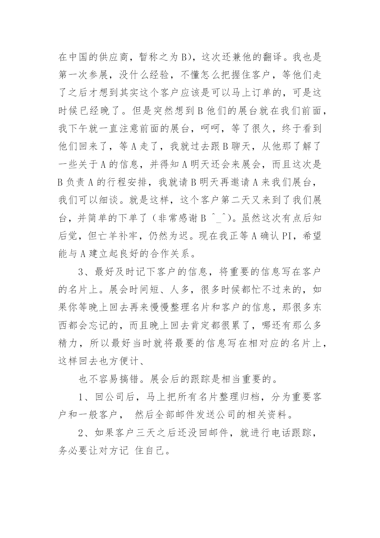 展会工作总结总结是在某一特定时间段对学习和工作生活或其完成情况,包括取得的成绩、存在的问题及得到的经验和教训加以回顾和分析的书面材料,它可以提升我们发现问题的能力,不如立即行动起来写一份总结吧。总结怎么写才能发挥它的作用呢?以下是小编为大家收集的展会工作总结,希望对大家有所帮助。展会工作总结120xx年马上过去,我将借用这次时机给个人过去一年的工作来做个总结,和新的一年规划。首先我特别感谢几位领导对我们工作的支持与帮忙,我想借各位同任热闹的掌声来表示对领导感谢!感谢大家!新旧交替的这一段,是一年的尾声、还是新一年的序曲?是完毕,还是开头?这不重要。重要的是:旧的一年,我经受了那么多,失去过、圆满过;收获过、充实过……而对于新的一年,我的心中仍旧有梦。我举个例子,像我在做业务的时候到一家医院里是很热的夏天我以前每次去都会给他们带一个西瓜什么的水果之类的后来时间长了,他们说小陶你下次来不要这么客气了,但我在观察他们吃西瓜的时候啊就要处处找刀,以前我每次也就只知道吃,反正我拿来了你们弄好了我就吃点,我想我每次都买西瓜为什么不给他们带把刀去了,后来我去就帮他们带去,其实也不是很贵的东西,但他给我带了什么?从今以后我就成了他们那里的常客了,也不用每次买吃的了,自己到还有的吃。一举两得啊,虽然只是小事情但对他们来说却是件大事啊!,第四嘴勤就是想到了看到了,就要说最终就要做,人吗总喜爱听好听的话,你多说几句也没什么,但他心理感觉舒适啊,在这里我又要罗嗦了,比方我们常常到外地去了,就买买当地的特产带回去给重要的客户,那至于怎么说我想我不说大家也都知道了。记的我每次到一家医院的药剂科去我每次都不会空手去的,哪怕一瓶饮料我都要带去的,由于那选购啊很喜爱这些小东西了,我根本上是一个星期去一次,但每次了那个主任在,她都不要,也没有给我什么好听的话。虽然嘴上说不要但最终还是收上了。前几天我又去,想来想去不知道买什么东西了,听一个朋友说宁波有一家买黄岩的橘子很好的,我就跑过去买了两箱过去,那主任也在我就进去了他观察我又拿东西了,他就说你再这样,下次你不要来了,我接过来说主任这是我一点的心愿我到台州去了一趟给你们带了点黄岩的橘子很好的,你带回去赏赏,她当时看了下我就说你不要每次都这么客气了,你的药最近销的还好,你只要有正常的.销量没什么事的。不用常常来,有事我会给你打电话,或者你给我打电话来。这话不管是他说的是真心话但我心理也塌实了好多,我下次就敢大胆的和他沟通了,上次从萧山回去又给她带了两盒萝卜干回去。有时候啊这些谎话啊也是善意的谎话。没方法啊,为工作!在就是手勤,平常没事的时候就多给客户发发信息,有些话用语言表达不出来的,用文字表达会更好些,什么节日啊问候下,信息一毛钱或许也会起到你所意想不到的结果,在圣诞节我给全部的客户都发出了一条信息,虽然只有百分之三十的客户给我回信息,但我已经很满意了。最终了五快了也就是前面的五勤了,想了就要去做,胜利了我们再接再厉,失败了并不行怕,我记得我看了一个胜利人士的一句话;顽强,专心的力气来为自己打气;人的一生不行能是一帆风顺的,所以打从你有自我意识的那一刻开头,你就要有一个明确的熟悉,那就是人的一辈子必定有风有浪,肯定不行能日日是好日,年年是好年,所以当我们在遇到挫折时,不要觉得惊异和懊丧,反而应当试为固然,然后冷静的对待它解决它。虽然在过去的一年里我工作上没有取得很大胜利,,但这就是我总结了出一些技巧,也是我在领导的带着下所学习到的。在新的一年里,我想利用我目前所把握的一点技巧,盼望在各位领导支持下,和各位同任的帮忙下,我给自己指定了一个规划,在完成目前我们主大产品的销量同时来开发出一些新的产品,目前我做的医院有可弗的有可由的我会保持肯定的销量,尽量的再提高点销量,在所属于我所做的医院里没有开发出来的,我会尽量尽快的开发,在就是新品种的开发,详细的规划我会像我的直属上司领导汇报的。盼望在新的一年里领导的支持下让我们更上一层楼,为了个人,为了公司我们一起努力吧,各位奋战在医药一线的同任朋友们,不要为了目前所面临的困难所感到茫然失措,信任自己的努力,制造出一个辉煌的明天,今日小才露尖尖角,明天定是荷花香气飞满塘!一年的工作已经完毕了,在马上迎来的一年中,我们会连续不断的努力的,这是始终无法拒绝的问题,这是始终以来我们在年终时候的总结。每一年都有自己的进步,每一年都会有自己的成长!信任大家在来年中肯定会取得最圆满的胜利!展会工作总结2为进一步提升电力明园的楼盘形象,扩大楼盘知名度,作为本次房展会的冠名单位,阜阳三环明源房地产开发有限公司积极参加了5月13日15日在清河广场举办的阜阳日报、颍州晚报第二届读者购房节暨20xx房地产商品博览会;开发商代表三环公司副董事长赵宪法在会上作了精彩发言。本次博览会共有近40个参展商
