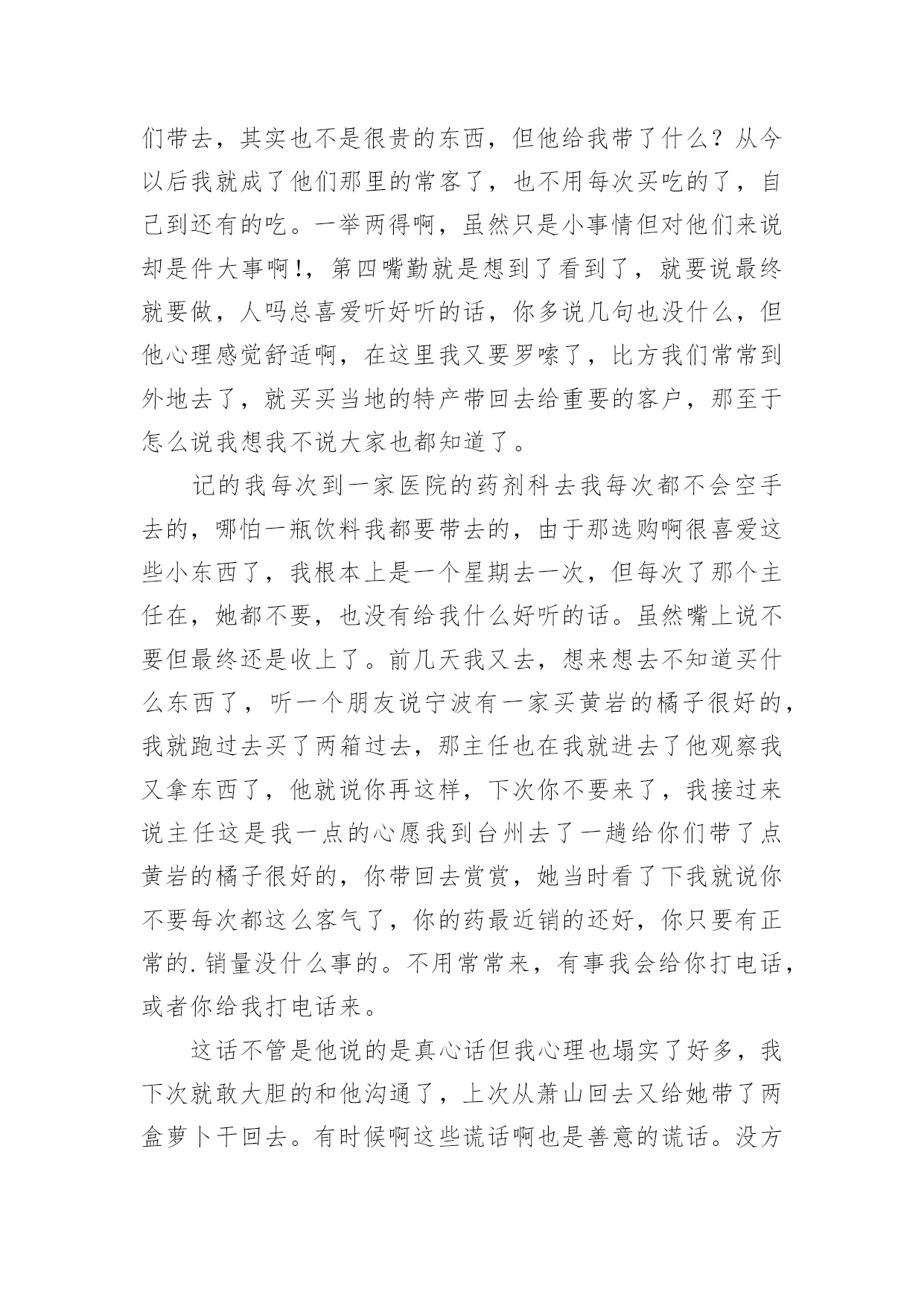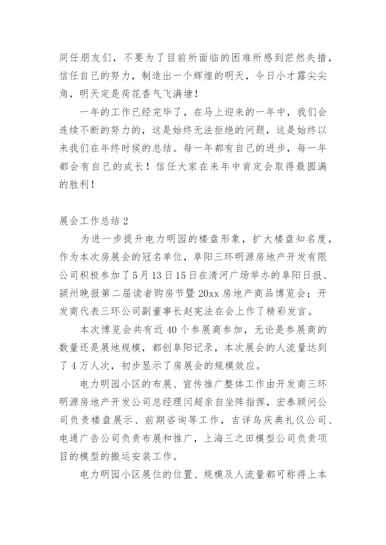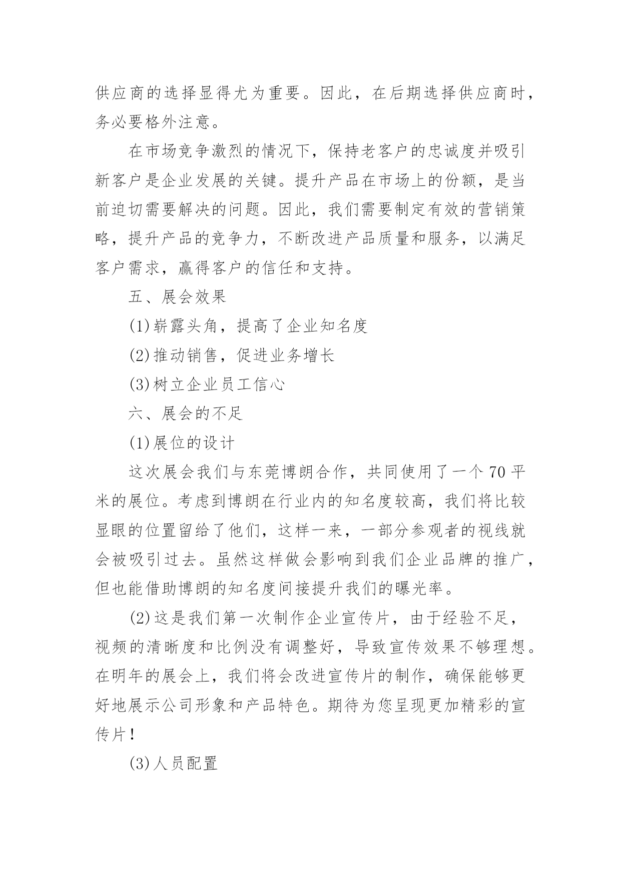 展会工作总结总结是在某一特定时间段对学习和工作生活或其完成情况,包括取得的成绩、存在的问题及得到的经验和教训加以回顾和分析的书面材料,它可以提升我们发现问题的能力,不如立即行动起来写一份总结吧。总结怎么写才能发挥它的作用呢?以下是小编为大家收集的展会工作总结,希望对大家有所帮助。展会工作总结120xx年马上过去,我将借用这次时机给个人过去一年的工作来做个总结,和新的一年规划。首先我特别感谢几位领导对我们工作的支持与帮忙,我想借各位同任热闹的掌声来表示对领导感谢!感谢大家!新旧交替的这一段,是一年的尾声、还是新一年的序曲?是完毕,还是开头?这不重要。重要的是:旧的一年,我经受了那么多,失去过、圆满过;收获过、充实过……而对于新的一年,我的心中仍旧有梦。我举个例子,像我在做业务的时候到一家医院里是很热的夏天我以前每次去都会给他们带一个西瓜什么的水果之类的后来时间长了,他们说小陶你下次来不要这么客气了,但我在观察他们吃西瓜的时候啊就要处处找刀,以前我每次也就只知道吃,反正我拿来了你们弄好了我就吃点,我想我每次都买西瓜为什么不给他们带把刀去了,后来我去就帮他们带去,其实也不是很贵的东西,但他给我带了什么?从今以后我就成了他们那里的常客了,也不用每次买吃的了,自己到还有的吃。一举两得啊,虽然只是小事情但对他们来说却是件大事啊!,第四嘴勤就是想到了看到了,就要说最终就要做,人吗总喜爱听好听的话,你多说几句也没什么,但他心理感觉舒适啊,在这里我又要罗嗦了,比方我们常常到外地去了,就买买当地的特产带回去给重要的客户,那至于怎么说我想我不说大家也都知道了。记的我每次到一家医院的药剂科去我每次都不会空手去的,哪怕一瓶饮料我都要带去的,由于那选购啊很喜爱这些小东西了,我根本上是一个星期去一次,但每次了那个主任在,她都不要,也没有给我什么好听的话。虽然嘴上说不要但最终还是收上了。前几天我又去,想来想去不知道买什么东西了,听一个朋友说宁波有一家买黄岩的橘子很好的,我就跑过去买了两箱过去,那主任也在我就进去了他观察我又拿东西了,他就说你再这样,下次你不要来了,我接过来说主任这是我一点的心愿我到台州去了一趟给你们带了点黄岩的橘子很好的,你带回去赏赏,她当时看了下我就说你不要每次都这么客气了,你的药最近销的还好,你只要有正常的.销量没什么事的。不用常常来,有事我会给你打电话,或者你给我打电话来。这话不管是他说的是真心话但我心理也塌实了好多,我下次就敢大胆的和他沟通了,上次从萧山回去又给她带了两盒萝卜干回去。有时候啊这些谎话啊也是善意的谎话。没方法啊,为工作!在就是手勤,平常没事的时候就多给客户发发信息,有些话用语言表达不出来的,用文字表达会更好些,什么节日啊问候下,信息一毛钱或许也会起到你所意想不到的结果,在圣诞节我给全部的客户都发出了一条信息,虽然只有百分之三十的客户给我回信息,但我已经很满意了。最终了五快了也就是前面的五勤了,想了就要去做,胜利了我们再接再厉,失败了并不行怕,我记得我看了一个胜利人士的一句话;顽强,专心的力气来为自己打气;人的一生不行能是一帆风顺的,所以打从你有自我意识的那一刻开头,你就要有一个明确的熟悉,那就是人的一辈子必定有风有浪,肯定不行能日日是好日,年年是好年,所以当我们在遇到挫折时,不要觉得惊异和懊丧,反而应当试为固然,然后冷静的对待它解决它。虽然在过去的一年里我工作上没有取得很大胜利,,但这就是我总结了出一些技巧,也是我在领导的带着下所学习到的。在新的一年里,我想利用我目前所把握的一点技巧,盼望在各位领导支持下,和各位同任的帮忙下,我给自己指定了一个规划,在完成目前我们主大产品的销量同时来开发出一些新的产品,目前我做的医院有可弗的有可由的我会保持肯定的销量,尽量的再提高点销量,在所属于我所做的医院里没有开发出来的,我会尽量尽快的开发,在就是新品种的开发,详细的规划我会像我的直属上司领导汇报的。盼望在新的一年里领导的支持下让我们更上一层楼,为了个人,为了公司我们一起努力吧,各位奋战在医药一线的同任朋友们,不要为了目前所面临的困难所感到茫然失措,信任自己的努力,制造出一个辉煌的明天,今日小才露尖尖角,明天定是荷花香气飞满塘!一年的工作已经完毕了,在马上迎来的一年中,我们会连续不断的努力的,这是始终无法拒绝的问题,这是始终以来我们在年终时候的总结。每一年都有自己的进步,每一年都会有自己的成长!信任大家在来年中肯定会取得最圆满的胜利!展会工作总结2为进一步提升电力明园的楼盘形象,扩大楼盘知名度,作为本次房展会的冠名单位,阜阳三环明源房地产开发有限公司积极参加了5月13日15日在清河广场举办的阜阳日报、颍州晚报第二届读者购房节暨20xx房地产商品博览会;开发商代表三环公司副董事长赵宪法在会上作了精彩发言。本次博览会共有近40个参展商