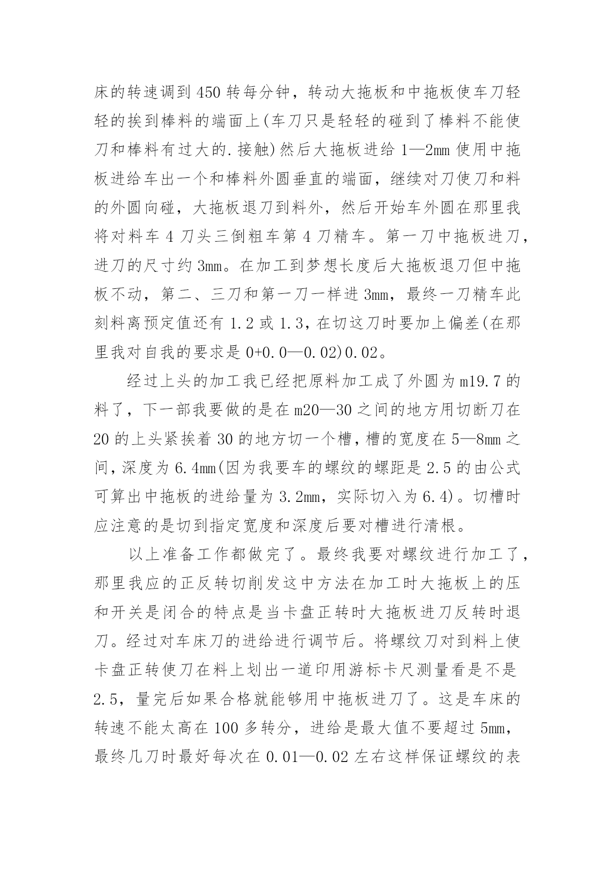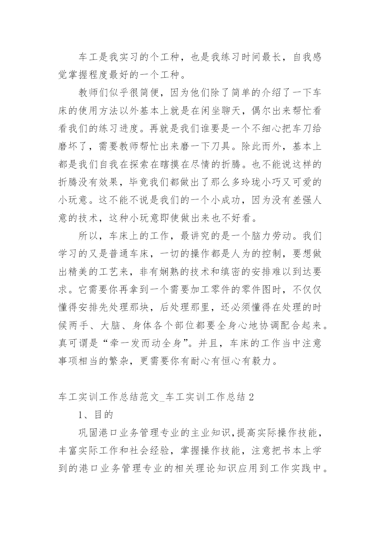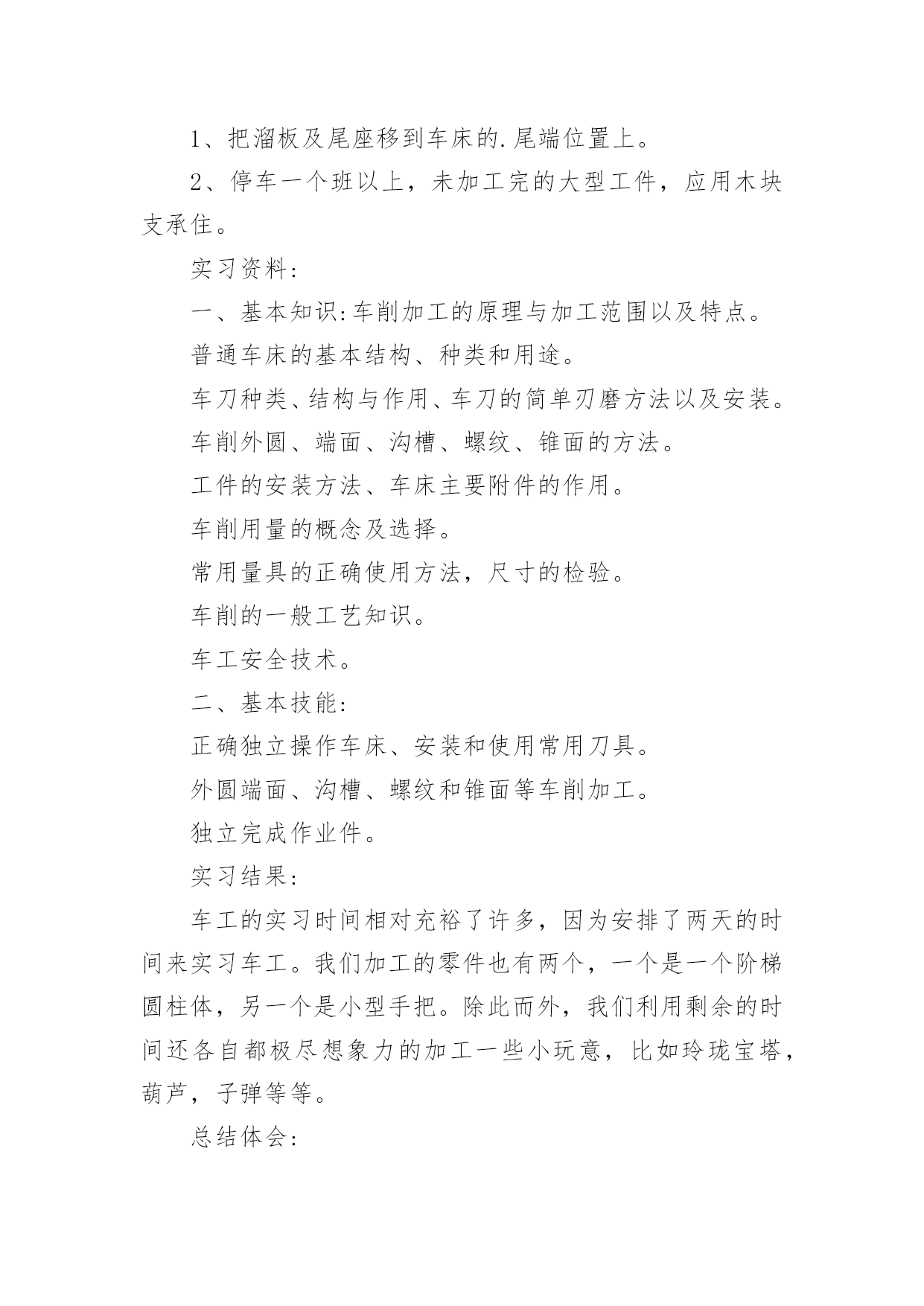 车工实训工作总结_车工实训工作总结车工实训工作总结范文_车工实训工作总结总结是对过去一定时期的工作、学习或思想情况进行回顾、分析,并做出客观评价的书面材料,它可以提升我们发现问题的能力,因此我们要做好归纳,写好总结。那么你真的懂得怎么写总结吗?以下是小编为大家整理的车工实训工作总结范文_车工实训工作总结,欢迎大家分享。车工实训工作总结范文_车工实训工作总结1实习目的:1、简单了解车床的工作原理及其工作方式;2、学会正确的车床使用方法,并能正确使用一种工件加工方式。车工准备知识:一、车工安全知识1、上班穿工作服,女生戴工作帽,并将长挽入帽内。2、工作时必须精力集中,不准擅自离开机床。3、工件和车刀需装夹牢固,以免工件和车刀飞出伤人。4、工件旋转时,不准测量工件。5、工件安装好后,三爪扳手必须随手取下,以免不注意开动车床,以免扳手飞出伤人。6、上班不准串岗,坚持各自工作岗位。二、车工理论知识1、车工:操作车床,在车床上加工机械产品的工人。2、什么是车削:利用工件的旋转运动和刀具的进给运动力,改变工件毛坯尺寸的大小和形状的一种冷加工车削方法。3、车床的型号标准注释及说明cw6140车床特性:万能变通车床组型别代号表示最大加工直径的110表普通车床型4、车床的组成部分:主轴箱、挂轮箱、走入箱、拖板箱、刀架、尾架、拖板三杆、床身、附件。5、车床的维护和保养①润滑油②检查机床是否完好③防砸④打扫卫生⑤关掉电源。12、工作中不准用反车的方法来制动主轴回转。13、加工钢件改为加工铸铁件或其他有色金属件时,应将切屑彻底清除及擦净冷却液。加工铸铁件或其他有色金属件改为加工钢件时,应将切屑清除,彻底擦净导轨面并加油润滑。14、作高速切削时,必须注意:①切削钢件要有断屑装置。②必须使用活顶尘15、大型车床的工件重量转速,必须按使用说明书要求进行。工作后认真做到:1、把溜板及尾座移到车床的.尾端位置上。2、停车一个班以上,未加工完的大型工件,应用木块支承住。实习资料:一、基本知识:车削加工的原理与加工范围以及特点。普通车床的基本结构、种类和用途。车刀种类、结构与作用、车刀的简单刃磨方法以及安装。车削外圆、端面、沟槽、螺纹、锥面的方法。工件的安装方法、车床主要附件的作用。车削用量的概念及选择。常用量具的正确使用方法,尺寸的检验。车削的一般工艺知识。车工安全技术。二、基本技能:正确独立操作车床、安装和使用常用刀具。外圆端面、沟槽、螺纹和锥面等车削加工。独立完成作业件。实习结果:车工的实习时间相对充裕了许多,因为安排了两天的时间来实习车工。我们加工的零件也有两个,一个是一个阶梯圆柱体,另一个是小型手把。除此而外,我们利用剩余的时间还各自都极尽想象力的加工一些小玩意,比如玲珑宝塔,葫芦,子弹等等。总结体会:车工是我实习的个工种,也是我练习时间最长,自我感觉掌握程度最好的一个工种。教师们似乎很简便,因为他们除了简单的介绍了一下车床的使用方法以外基本上就是在闲坐聊天,偶尔出来帮忙看看我们的练习进度。再就是我们谁要是一个不细心把车刀给磨坏了,需要教师帮忙出来磨一下刀具。除此而外,基本上都是我们自我在探索在瞎摸在尽情的折腾。也不能说这样的折腾没有效果,毕竟我们都做出了那么多玲珑小巧又可爱的小玩意。这不能不说是我们的一个小成功,因为没有差强人意的技术,这种小玩意即使做出来也不好看。所以,车床上的工作,最讲究的是一个脑力劳动。我们学习的又是普通车床,一切的操作都是人为的控制,要想做出精美的工艺来,非有娴熟的技术和缜密的安排难以到达要求。它需要你再拿到一个需要加工零件的零件图时,不仅仅懂得安排先处理那块,后处理那里,还必须懂得在处理的时候两手、大脑、身体各个部位都要全身心地协调配合起来。真可谓是“牵一发而动全身”。并且,车床的工作当中注意事项相当的繁杂,更需要你有耐心有恒心有毅力。车工实训工作总结范文_车工实训工作总结21、目的巩固港口业务管理专业的主业知识,提高实际操作技能,丰富实际工作和社会经验,掌握操作技能,注意把书本上学到的港口业务管理专业的相关理论知识应用到工作实践中。用理论加深对实践的感性认识,用实践来验证理论知识的准确性,进取探求日常管理工作的本质与规律。实习是每一个学生必须拥有的一段经历,它使我们在实践中了解社会,让我们学到了很多在课堂上根本就学不到的知识,打开视野,增长见识,为我们以后进一步走向社会打下坚实的基础。2、实习单位及岗位介绍中基船业有限公司是隶属于金海湾旗下的全资子公司,注册资本9.5亿元人民币,是一家以船舶制造为主的大型船舶工业企业。公司成立于20xx年10月9日,坐落于风景秀丽的浙江岱山江南山,具有紧邻国际航线和上海国际航运中心洋山港区、港域开阔、防浪避风条件好、深水岸线等梦想条件和优势。雄厚的资金实力,突出的人力资源,实实在在的一线实