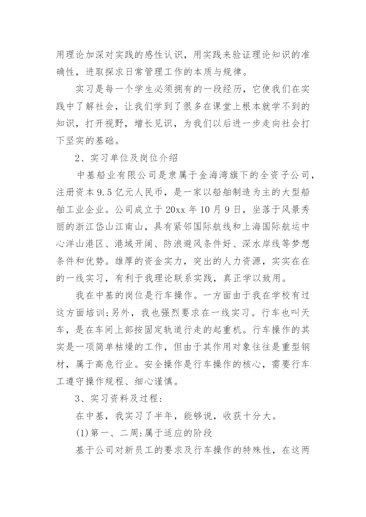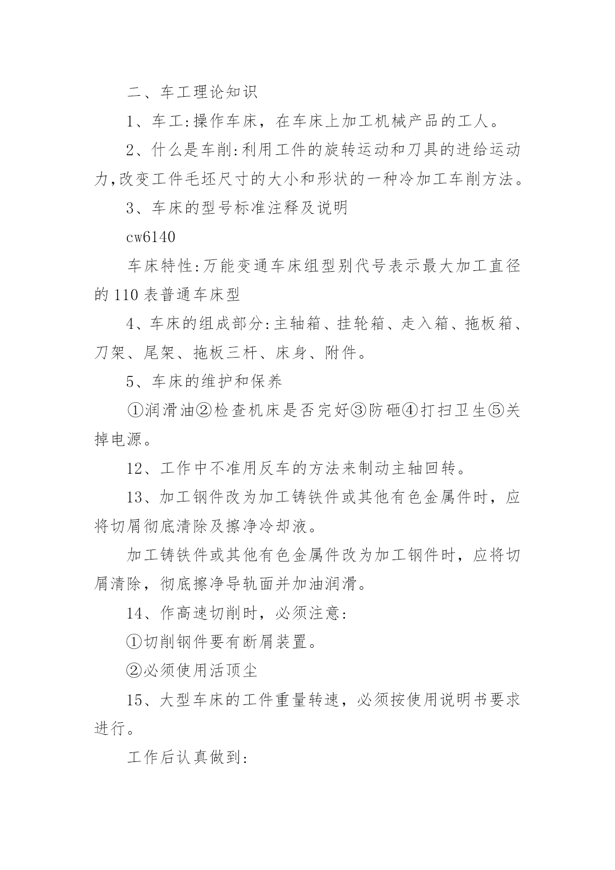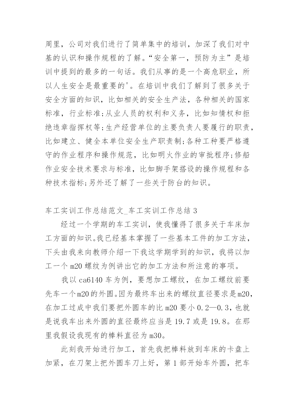 车工实训工作总结_车工实训工作总结车工实训工作总结范文_车工实训工作总结总结是对过去一定时期的工作、学习或思想情况进行回顾、分析,并做出客观评价的书面材料,它可以提升我们发现问题的能力,因此我们要做好归纳,写好总结。那么你真的懂得怎么写总结吗?以下是小编为大家整理的车工实训工作总结范文_车工实训工作总结,欢迎大家分享。车工实训工作总结范文_车工实训工作总结1实习目的:1、简单了解车床的工作原理及其工作方式;2、学会正确的车床使用方法,并能正确使用一种工件加工方式。车工准备知识:一、车工安全知识1、上班穿工作服,女生戴工作帽,并将长挽入帽内。2、工作时必须精力集中,不准擅自离开机床。3、工件和车刀需装夹牢固,以免工件和车刀飞出伤人。4、工件旋转时,不准测量工件。5、工件安装好后,三爪扳手必须随手取下,以免不注意开动车床,以免扳手飞出伤人。6、上班不准串岗,坚持各自工作岗位。二、车工理论知识1、车工:操作车床,在车床上加工机械产品的工人。2、什么是车削:利用工件的旋转运动和刀具的进给运动力,改变工件毛坯尺寸的大小和形状的一种冷加工车削方法。3、车床的型号标准注释及说明cw6140车床特性:万能变通车床组型别代号表示最大加工直径的110表普通车床型4、车床的组成部分:主轴箱、挂轮箱、走入箱、拖板箱、刀架、尾架、拖板三杆、床身、附件。5、车床的维护和保养①润滑油②检查机床是否完好③防砸④打扫卫生⑤关掉电源。12、工作中不准用反车的方法来制动主轴回转。13、加工钢件改为加工铸铁件或其他有色金属件时,应将切屑彻底清除及擦净冷却液。加工铸铁件或其他有色金属件改为加工钢件时,应将切屑清除,彻底擦净导轨面并加油润滑。14、作高速切削时,必须注意:①切削钢件要有断屑装置。②必须使用活顶尘15、大型车床的工件重量转速,必须按使用说明书要求进行。工作后认真做到:1、把溜板及尾座移到车床的.尾端位置上。2、停车一个班以上,未加工完的大型工件,应用木块支承住。实习资料:一、基本知识:车削加工的原理与加工范围以及特点。普通车床的基本结构、种类和用途。车刀种类、结构与作用、车刀的简单刃磨方法以及安装。车削外圆、端面、沟槽、螺纹、锥面的方法。工件的安装方法、车床主要附件的作用。车削用量的概念及选择。常用量具的正确使用方法,尺寸的检验。车削的一般工艺知识。车工安全技术。二、基本技能:正确独立操作车床、安装和使用常用刀具。外圆端面、沟槽、螺纹和锥面等车削加工。独立完成作业件。实习结果:车工的实习时间相对充裕了许多,因为安排了两天的时间来实习车工。我们加工的零件也有两个,一个是一个阶梯圆柱体,另一个是小型手把。除此而外,我们利用剩余的时间还各自都极尽想象力的加工一些小玩意,比如玲珑宝塔,葫芦,子弹等等。总结体会:车工是我实习的个工种,也是我练习时间最长,自我感觉掌握程度最好的一个工种。教师们似乎很简便,因为他们除了简单的介绍了一下车床的使用方法以外基本上就是在闲坐聊天,偶尔出来帮忙看看我们的练习进度。再就是我们谁要是一个不细心把车刀给磨坏了,需要教师帮忙出来磨一下刀具。除此而外,基本上都是我们自我在探索在瞎摸在尽情的折腾。也不能说这样的折腾没有效果,毕竟我们都做出了那么多玲珑小巧又可爱的小玩意。这不能不说是我们的一个小成功,因为没有差强人意的技术,这种小玩意即使做出来也不好看。所以,车床上的工作,最讲究的是一个脑力劳动。我们学习的又是普通车床,一切的操作都是人为的控制,要想做出精美的工艺来,非有娴熟的技术和缜密的安排难以到达要求。它需要你再拿到一个需要加工零件的零件图时,不仅仅懂得安排先处理那块,后处理那里,还必须懂得在处理的时候两手、大脑、身体各个部位都要全身心地协调配合起来。真可谓是“牵一发而动全身”。并且,车床的工作当中注意事项相当的繁杂,更需要你有耐心有恒心有毅力。车工实训工作总结范文_车工实训工作总结21、目的巩固港口业务管理专业的主业知识,提高实际操作技能,丰富实际工作和社会经验,掌握操作技能,注意把书本上学到的港口业务管理专业的相关理论知识应用到工作实践中。用理论加深对实践的感性认识,用实践来验证理论知识的准确性,进取探求日常管理工作的本质与规律。实习是每一个学生必须拥有的一段经历,它使我们在实践中了解社会,让我们学到了很多在课堂上根本就学不到的知识,打开视野,增长见识,为我们以后进一步走向社会打下坚实的基础。2、实习单位及岗位介绍中基船业有限公司是隶属于金海湾旗下的全资子公司,注册资本9.5亿元人民币,是一家以船舶制造为主的大型船舶工业企业。公司成立于20xx年10月9日,坐落于风景秀丽的浙江岱山江南山,具有紧邻国际航线和上海国际航运中心洋山港区、港域开阔、防浪避风条件好、深水岸线等梦想条件和优势。雄厚的资金实力,突出的人力资源,实实在在的一线实