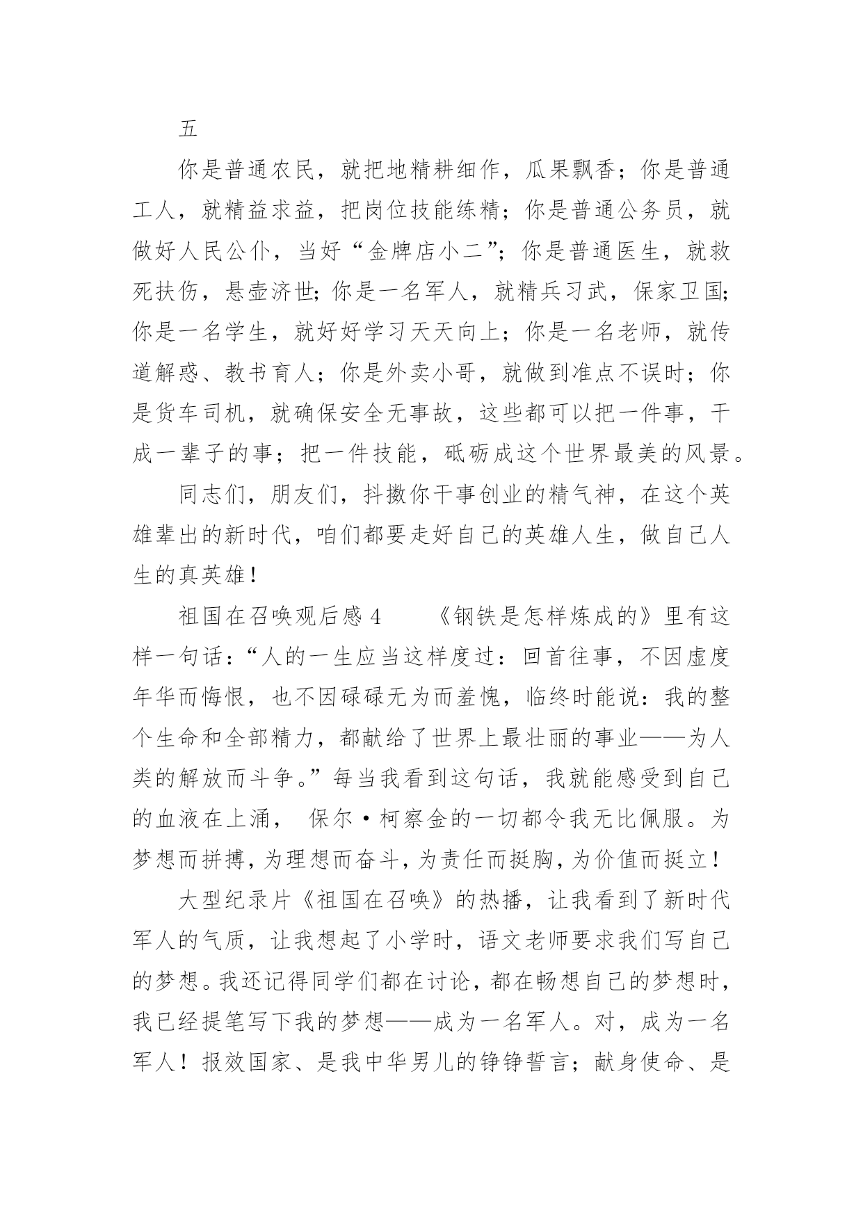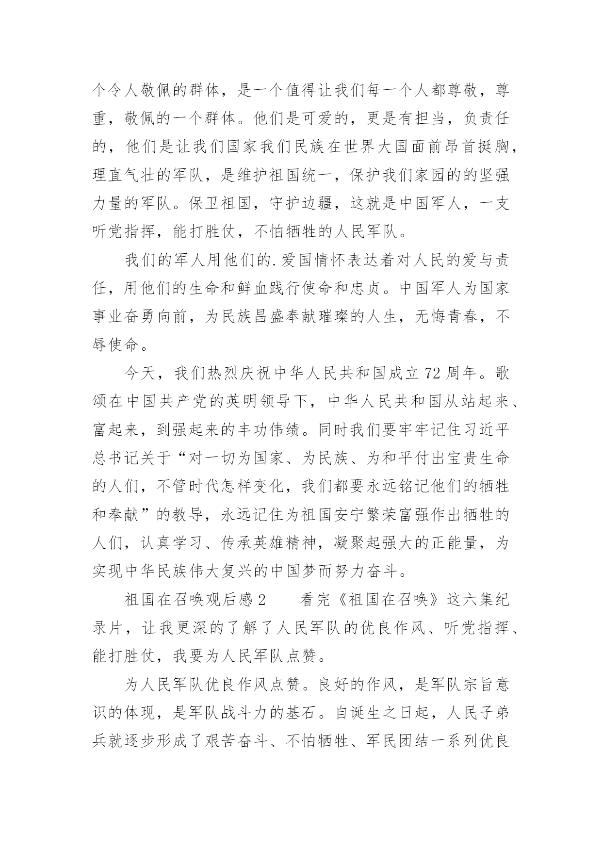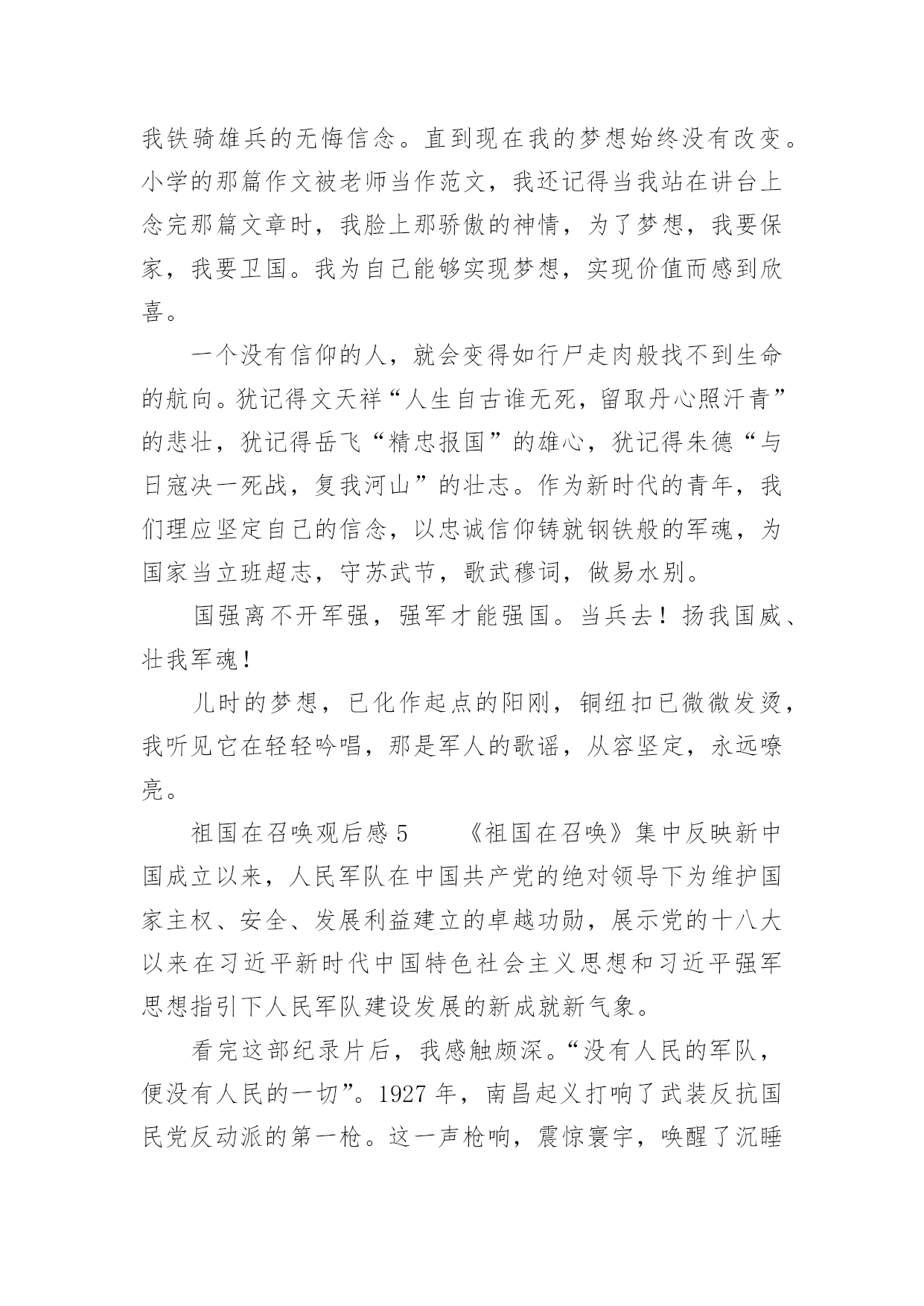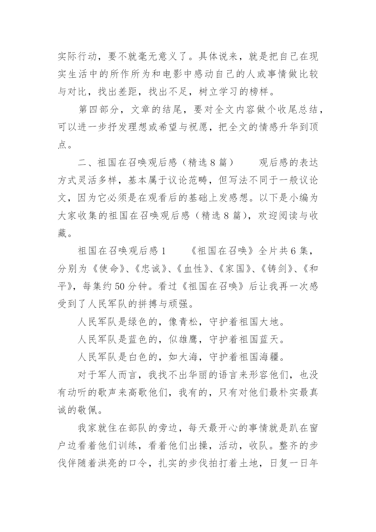 祖国在召唤观后感祖国在召唤观后感一、观后感的格式大体上分为四个部分第一部分,由观而引出感,这开头部分就好比一条醒目的标语或引子一样,先交待清楚看了什么影片,有什么感想。一般来说,这一部分要求简明扼要、开门见山,千万不要绕圈子、卖关子、遮遮掩掩,而是要用肯定的语气概括地说出感受是什么?简单但明确,不含糊,这样就可以了!不必展开来说。第二部分,具体谈感受是什么。我们读书看电影都有一个过程,都需要一段时间,而我们的感受也是在这个过程、这段时间内一点一点产生的,感受由浅到深,感受由心而发、发自内心,因此要自然真实,有感而发,不要无病呻吟,虚假不实,这样才能感人,打动读者。写法上,可采用夹叙夹议的形式,“叙”就是把感人的故事情节或人物形象或词句叙述出来,“议”就是抒发自己的感受,要有层次地把自己的感情一步一步地推向顶点,得到升华。叙述是简述,抓住要点,不能太长,否则就有凑字数的嫌疑,再者,这样也影响文章的结构。第三部分,把感受落实到自己的现实生活中去,联系生活中的事例来谈感受,因为“感”的目的就是要指导我们的实际行动,要不就毫无意义了。具体说来,就是把自己在现实生活中的所作所为和电影中感动自己的人或事情做比较与对比,找出差距,找出不足,树立学习的榜样。第四部分,文章的结尾,要对全文内容做个收尾总结,可以进一步抒发理想或希望与祝愿,把全文的情感升华到顶点。二、祖国在召唤观后感(精选8篇)观后感的表达方式灵活多样,基本属于议论范畴,但写法不同于一般议论文,因为它必须是在观看后的基础上发感想。以下是小编为大家收集的祖国在召唤观后感(精选8篇),欢迎阅读与收藏。祖国在召唤观后感1《祖国在召唤》全片共6集,分别为《使命》、《忠诚》、《血性》、《家国》、《铸剑》、《和平》,每集约50分钟。看过《祖国在召唤》后让我再一次感受到了人民军队的拼搏与顽强。人民军队是绿色的,像青松,守护着祖国大地。人民军队是蓝色的,似雄鹰,守护着祖国蓝天。人民军队是白色的,如大海,守护着祖国海疆。对于军人而言,我找不出华丽的语言来形容他们,也没有动听的歌声来高歌他们,我有的,只有对他们最朴实最真诚的敬佩。我家就住在部队的旁边,每天最开心的事情就是趴在窗户边看着他们训练,看着他们出操,活动,收队。整齐的步伐伴随着洪亮的口令,扎实的步伐拍打着土地,日复一日年复一年……训练的场景深深的印在我的脑海里。耳濡目染下渐渐对军人产生了浓浓的崇拜之心。起初只是觉得这份衣服好看,穿上就十分威严高大,但是随着自己慢慢长大,对军人这个特殊的身份有了更多的了解,知道这身衣服穿上了就是担当,就是责任,从此小家是小,国家是大。虽说现在是和平年代,已经不需要像革命时期那样冲锋陷阵,但是在这个物欲横流的年代,他们身上的质朴显得更加可贵,更值得我们学习。人民军队是无私的,他们默默的守护在我们的身旁,他们是危险,灾难的抵挡力量,知危险,逆人流而行,灾难面前,一往无前,安定之后,默默反身,保家卫国。98抗洪,他们在洪水里筑城人墙,肩上抗出血脚底磨出泡还在坚持抗洪,汶川地震,他们不惧危险,在余震中抢救生命,天津爆炸,他们逆行的背影让我们敬佩又心疼,今年的“利奇马”台风,又让我们看到了他们舍我为人的精神。人民军队充满战斗精神的勇气,诠释中华男儿的英勇,把自己对国家和人民的忠诚放在自己的第一位。很多女孩都喜欢军人,不仅是这身英姿飒爽的军装,更是从骨子里透出来的坚韧与担当。正是因为我们军队的壮大,才使得我们拥有和平安宁,只有军队的强大才能维护我们的幸福生活。军人的坚韧,来自铁一般的军队,出自铁一般的纪律,军队就是一个大熔炉,融掉的是娇嫩和稚气,打造出来的是钢铁一般的人民军队。人民军队,是人民的军队,是人民的子弟兵,他们是一个令人敬佩的群体,是一个值得让我们每一个人都尊敬,尊重,敬佩的一个群体。他们是可爱的,更是有担当,负责任的,他们是让我们国家我们民族在世界大国面前昂首挺胸,理直气壮的军队,是维护祖国统一,保护我们家园的的坚强力量的军队。保卫祖国,守护边疆,这就是中国军人,一支听党指挥,能打胜仗,不怕牺牲的人民军队。我们的军人用他们的.爱国情怀表达着对人民的爱与责任,用他们的生命和鲜血践行使命和忠贞。中国军人为国家事业奋勇向前,为民族昌盛奉献璀璨的人生,无悔青春,不辱使命。今天,我们热烈庆祝中华人民共和国成立72周年。歌颂在中国共产党的英明领导下,中华人民共和国从站起来、富起来,到强起来的丰功伟绩。同时我们要牢牢记住习近平总书记关于“对一切为国家、为民族、为和平付出宝贵生命的人们,不管时代怎样变化,我们都要永远铭记他们的牺牲和奉献”的教导,永远记住为祖国安宁繁荣富强作出牺牲的人们,认真学习、传承英雄精神,凝聚起强大的正能量,为实现中华民族伟大复兴的中国梦而努力奋斗。祖国在召唤观后感2看完《祖国在召唤》这六集纪录片,