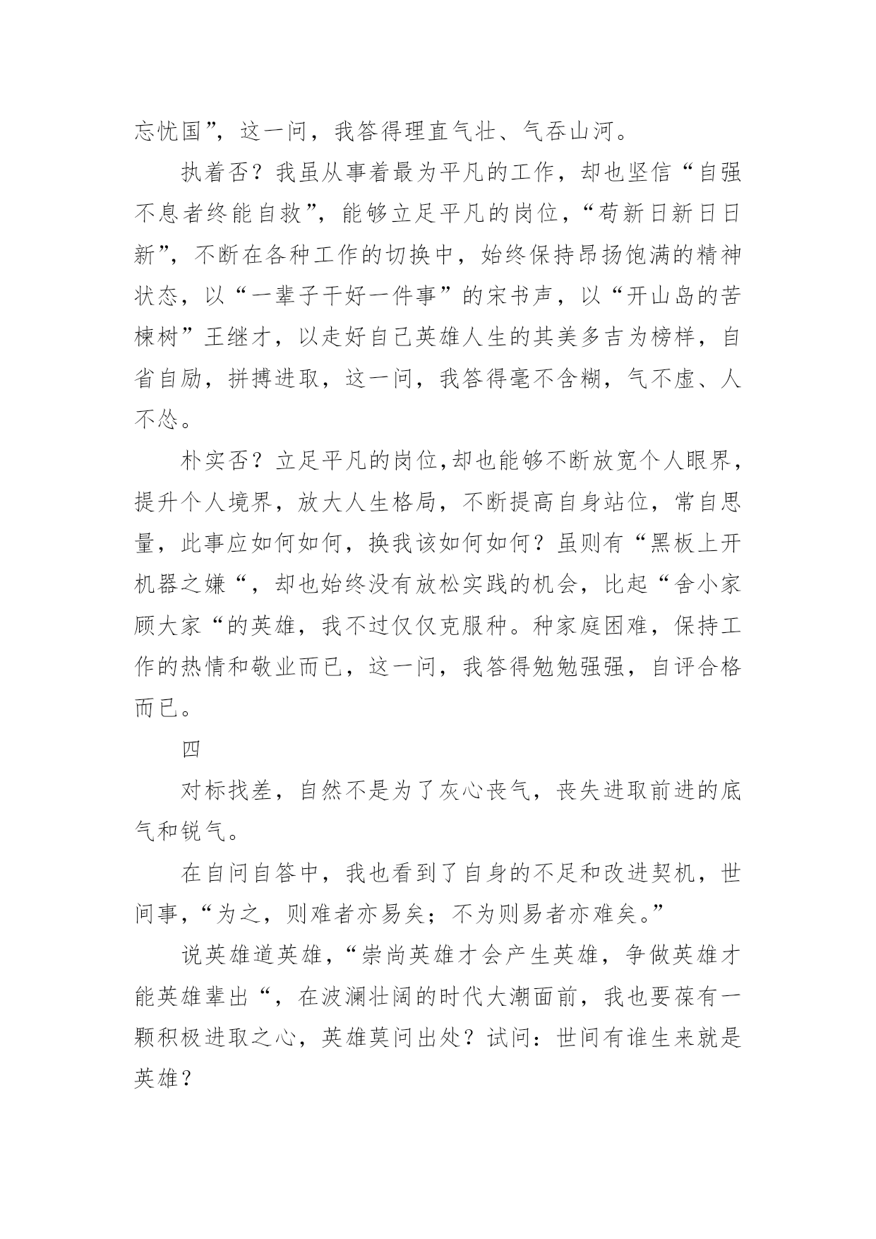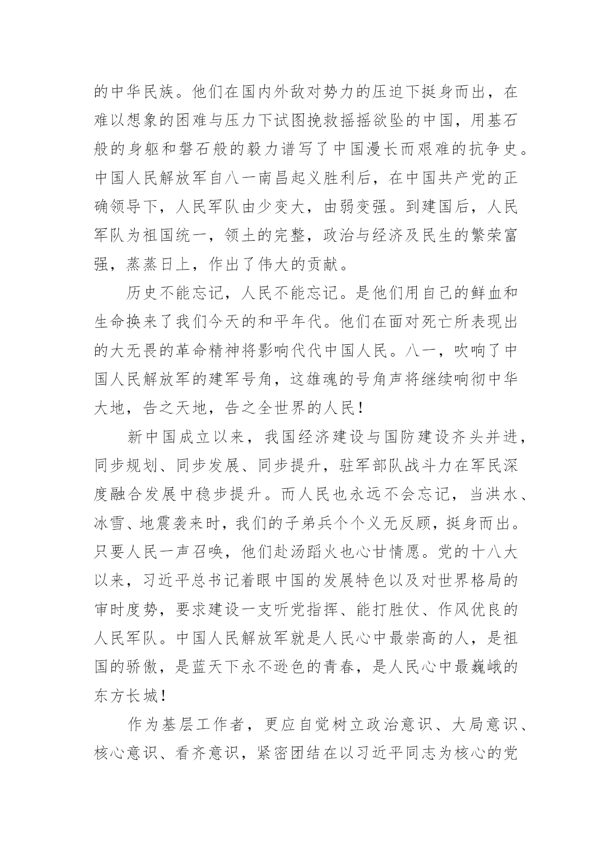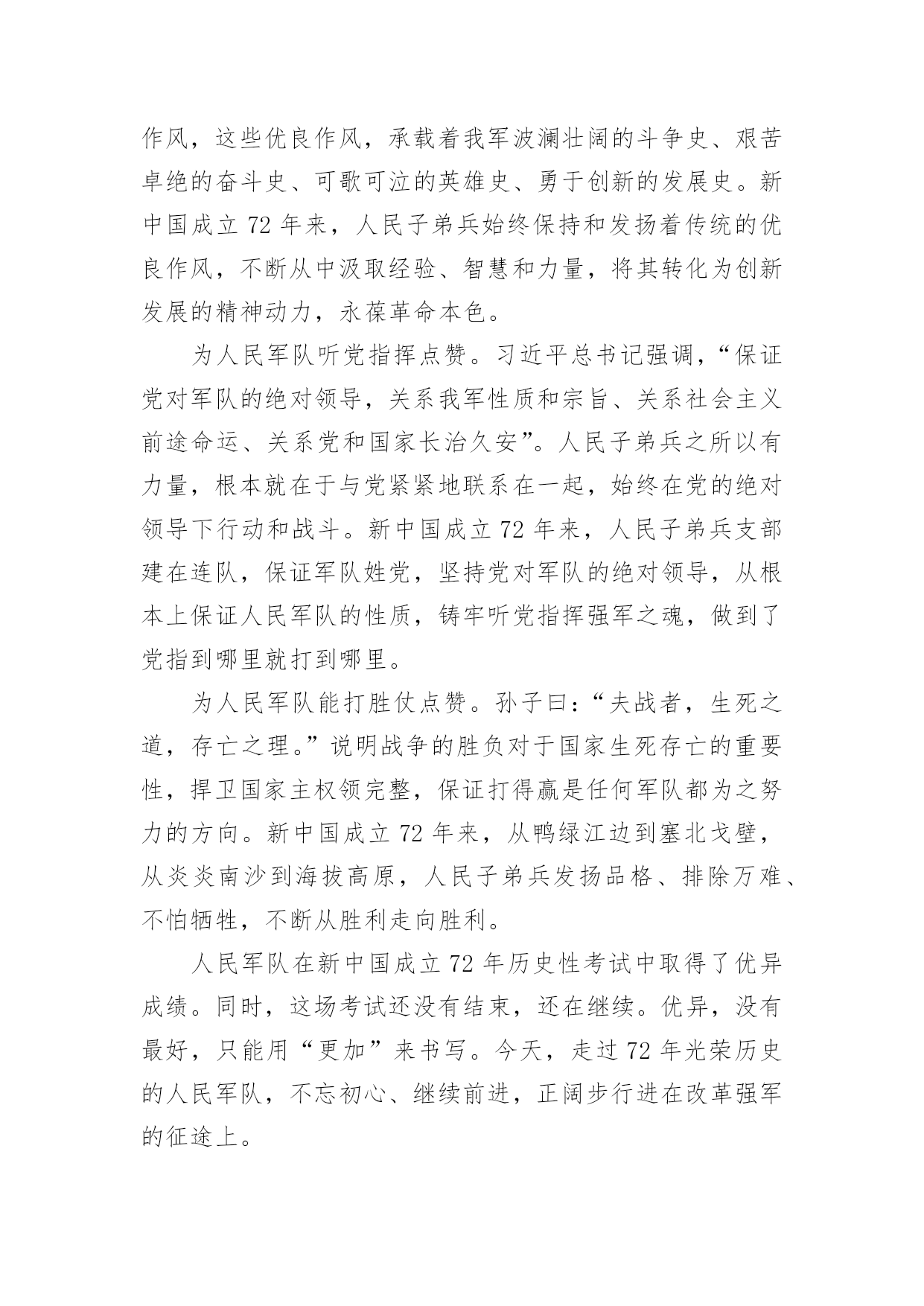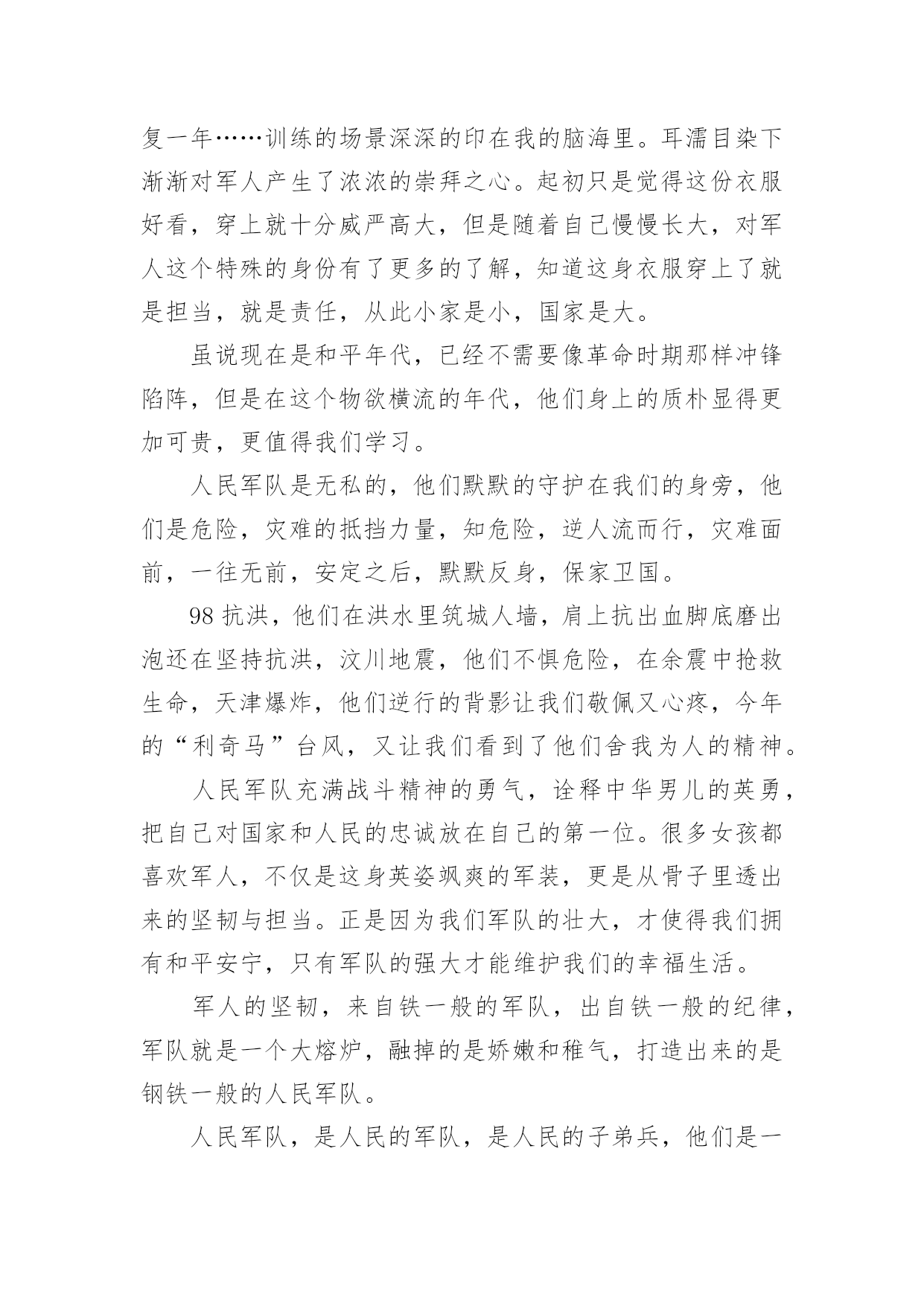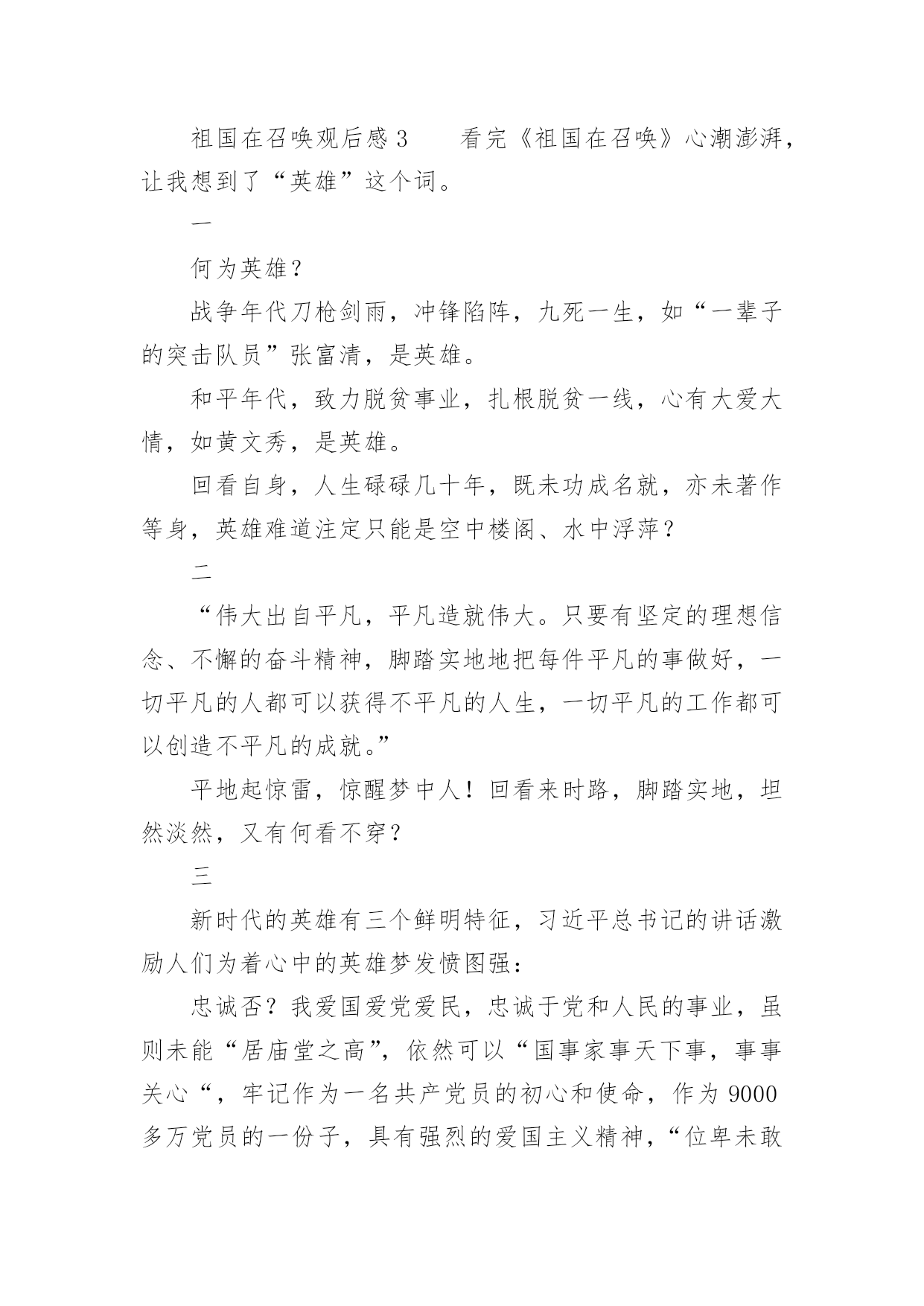 祖国在召唤观后感祖国在召唤观后感一、观后感的格式大体上分为四个部分第一部分,由观而引出感,这开头部分就好比一条醒目的标语或引子一样,先交待清楚看了什么影片,有什么感想。一般来说,这一部分要求简明扼要、开门见山,千万不要绕圈子、卖关子、遮遮掩掩,而是要用肯定的语气概括地说出感受是什么?简单但明确,不含糊,这样就可以了!不必展开来说。第二部分,具体谈感受是什么。我们读书看电影都有一个过程,都需要一段时间,而我们的感受也是在这个过程、这段时间内一点一点产生的,感受由浅到深,感受由心而发、发自内心,因此要自然真实,有感而发,不要无病呻吟,虚假不实,这样才能感人,打动读者。写法上,可采用夹叙夹议的形式,“叙”就是把感人的故事情节或人物形象或词句叙述出来,“议”就是抒发自己的感受,要有层次地把自己的感情一步一步地推向顶点,得到升华。叙述是简述,抓住要点,不能太长,否则就有凑字数的嫌疑,再者,这样也影响文章的结构。第三部分,把感受落实到自己的现实生活中去,联系生活中的事例来谈感受,因为“感”的目的就是要指导我们的实际行动,要不就毫无意义了。具体说来,就是把自己在现实生活中的所作所为和电影中感动自己的人或事情做比较与对比,找出差距,找出不足,树立学习的榜样。第四部分,文章的结尾,要对全文内容做个收尾总结,可以进一步抒发理想或希望与祝愿,把全文的情感升华到顶点。二、祖国在召唤观后感(精选8篇)观后感的表达方式灵活多样,基本属于议论范畴,但写法不同于一般议论文,因为它必须是在观看后的基础上发感想。以下是小编为大家收集的祖国在召唤观后感(精选8篇),欢迎阅读与收藏。祖国在召唤观后感1《祖国在召唤》全片共6集,分别为《使命》、《忠诚》、《血性》、《家国》、《铸剑》、《和平》,每集约50分钟。看过《祖国在召唤》后让我再一次感受到了人民军队的拼搏与顽强。人民军队是绿色的,像青松,守护着祖国大地。人民军队是蓝色的,似雄鹰,守护着祖国蓝天。人民军队是白色的,如大海,守护着祖国海疆。对于军人而言,我找不出华丽的语言来形容他们,也没有动听的歌声来高歌他们,我有的,只有对他们最朴实最真诚的敬佩。我家就住在部队的旁边,每天最开心的事情就是趴在窗户边看着他们训练,看着他们出操,活动,收队。整齐的步伐伴随着洪亮的口令,扎实的步伐拍打着土地,日复一日年复一年……训练的场景深深的印在我的脑海里。耳濡目染下渐渐对军人产生了浓浓的崇拜之心。起初只是觉得这份衣服好看,穿上就十分威严高大,但是随着自己慢慢长大,对军人这个特殊的身份有了更多的了解,知道这身衣服穿上了就是担当,就是责任,从此小家是小,国家是大。虽说现在是和平年代,已经不需要像革命时期那样冲锋陷阵,但是在这个物欲横流的年代,他们身上的质朴显得更加可贵,更值得我们学习。人民军队是无私的,他们默默的守护在我们的身旁,他们是危险,灾难的抵挡力量,知危险,逆人流而行,灾难面前,一往无前,安定之后,默默反身,保家卫国。98抗洪,他们在洪水里筑城人墙,肩上抗出血脚底磨出泡还在坚持抗洪,汶川地震,他们不惧危险,在余震中抢救生命,天津爆炸,他们逆行的背影让我们敬佩又心疼,今年的“利奇马”台风,又让我们看到了他们舍我为人的精神。人民军队充满战斗精神的勇气,诠释中华男儿的英勇,把自己对国家和人民的忠诚放在自己的第一位。很多女孩都喜欢军人,不仅是这身英姿飒爽的军装,更是从骨子里透出来的坚韧与担当。正是因为我们军队的壮大,才使得我们拥有和平安宁,只有军队的强大才能维护我们的幸福生活。军人的坚韧,来自铁一般的军队,出自铁一般的纪律,军队就是一个大熔炉,融掉的是娇嫩和稚气,打造出来的是钢铁一般的人民军队。人民军队,是人民的军队,是人民的子弟兵,他们是一个令人敬佩的群体,是一个值得让我们每一个人都尊敬,尊重,敬佩的一个群体。他们是可爱的,更是有担当,负责任的,他们是让我们国家我们民族在世界大国面前昂首挺胸,理直气壮的军队,是维护祖国统一,保护我们家园的的坚强力量的军队。保卫祖国,守护边疆,这就是中国军人,一支听党指挥,能打胜仗,不怕牺牲的人民军队。我们的军人用他们的.爱国情怀表达着对人民的爱与责任,用他们的生命和鲜血践行使命和忠贞。中国军人为国家事业奋勇向前,为民族昌盛奉献璀璨的人生,无悔青春,不辱使命。今天,我们热烈庆祝中华人民共和国成立72周年。歌颂在中国共产党的英明领导下,中华人民共和国从站起来、富起来,到强起来的丰功伟绩。同时我们要牢牢记住习近平总书记关于“对一切为国家、为民族、为和平付出宝贵生命的人们,不管时代怎样变化,我们都要永远铭记他们的牺牲和奉献”的教导,永远记住为祖国安宁繁荣富强作出牺牲的人们,认真学习、传承英雄精神,凝聚起强大的正能量,为实现中华民族伟大复兴的中国梦而努力奋斗。祖国在召唤观后感2看完《祖国在召唤》这六集纪录片,