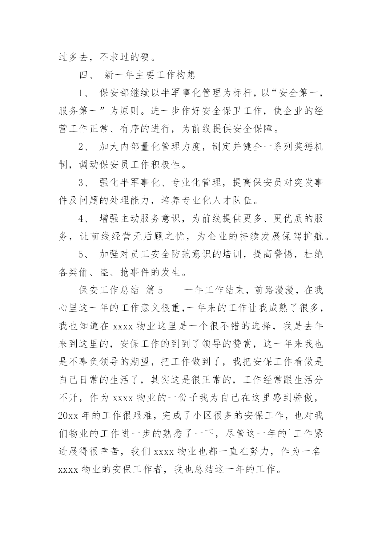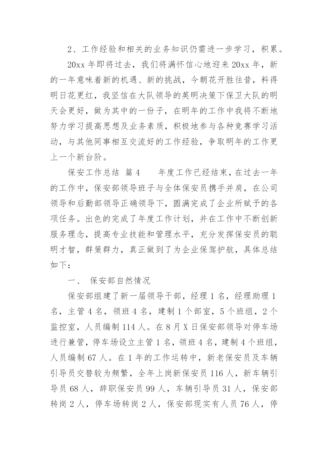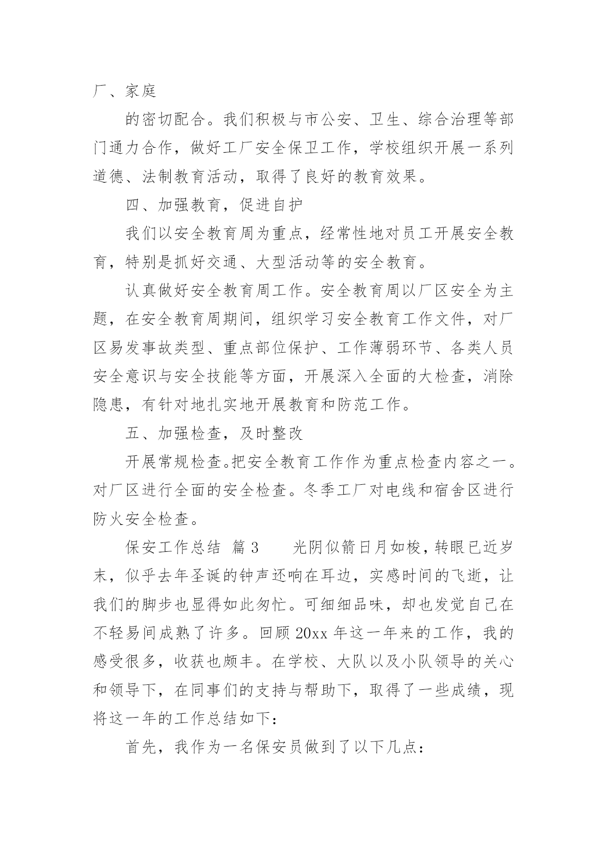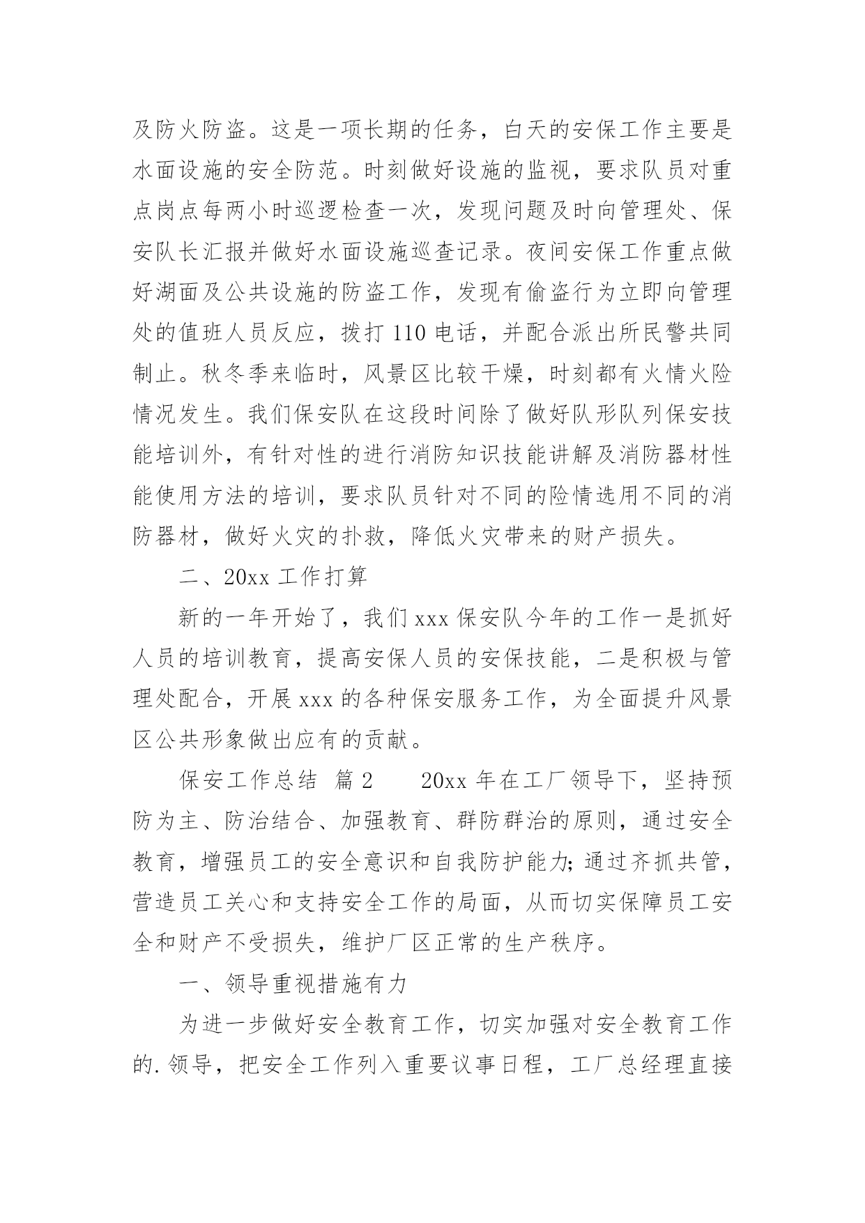 保安工作总结保安工作总结总结是事后对某一阶段的学习或工作情况作加以回顾检查并分析评价的书面材料,它可以有效锻炼我们的语言组织能力,因此我们需要回头归纳,写一份总结了。总结你想好怎么写了吗?下面是小编收集整理的保安工作总结,欢迎阅读,希望大家能够喜欢。保安工作总结篇120xx年过去了,新的一年又来了,为了把新的一年工作做得更好,现在对过去一年工作简要回顾并总结一下。一、20xx年工作回顾1、采用各种方式提高安保人员业务技能,提高质量的安保服务过去的一年是不平凡的一年。我们xxx的安保人员流动频繁,年龄偏大,平均年龄在50岁以上。文化水平、保安人员素质偏低。针对这一状况,在公司领导的大力支持下,我作为安保队长狠抓了安保人员技术业务素质的培训,,每周都进行队列、队形保安人员技能的培训,推行安保文明用语,限度为提供安保服务。2、根据不同的天气季节,采用灵活安排人员,抓住各项工作的重点,做好xxx的`安全防范工作xxx的安保工作重点为水面安全,公共设施安全防范以及防火防盗。这是一项长期的任务,白天的安保工作主要是水面设施的安全防范。时刻做好设施的监视,要求队员对重点岗点每两小时巡逻检查一次,发现问题及时向管理处、保安队长汇报并做好水面设施巡查记录。夜间安保工作重点做好湖面及公共设施的防盗工作,发现有偷盗行为立即向管理处的值班人员反应,拨打110电话,并配合派出所民警共同制止。秋冬季来临时,风景区比较干燥,时刻都有火情火险情况发生。我们保安队在这段时间除了做好队形队列保安技能培训外,有针对性的进行消防知识技能讲解及消防器材性能使用方法的培训,要求队员针对不同的险情选用不同的消防器材,做好火灾的扑救,降低火灾带来的财产损失。二、20xx工作打算新的一年开始了,我们xxx保安队今年的工作一是抓好人员的培训教育,提高安保人员的安保技能,二是积极与管理处配合,开展xxx的各种保安服务工作,为全面提升风景区公共形象做出应有的贡献。保安工作总结篇220xx年在工厂领导下,坚持预防为主、防治结合、加强教育、群防群治的原则,通过安全教育,增强员工的安全意识和自我防护能力;通过齐抓共管,营造员工关心和支持安全工作的局面,从而切实保障员工安全和财产不受损失,维护厂区正常的生产秩序。一、领导重视措施有力为进一步做好安全教育工作,切实加强对安全教育工作的.领导,把安全工作列入重要议事日程,工厂总经理直接抓,分管部门具体抓,办公室、保卫科具体分工负责组织实施。二、制度保证措施到位1、建立安全保卫工作领导责任制和责任追究制。将安全保卫工作列入各有关处室的目标考核内容,并进行严格考核,严格执行责任追究制度,对造成重大安全事故的,要严肃追究有关领导及直接责任人的责任。2、签订责任书。工厂与科室和车间主任层层签订责任书,明确各自的职责。明确了应做的工作和应负的责任。将安全教育工作作为对员工考核的重要内容,实行一票否决制度。贯彻“谁主管,谁负责”的原则,做到职责明确,责任到人。3、不断完善安全保卫工作规章制度。建立安全保卫工作的各项规章制度,并根据安全保卫工作形势的发展,不断完善充实。建立健全定期检查和日常防范相结合的安全管理制度,以及员工管理、门卫值班、巡逻值班、防火防灾、食品卫生管理、防火安全管理、健康体检等规章制度.严禁组织员工从事不符合国家有关规定的危险性工作,对涉及厂区安全保卫的各项工作,都要做到有章可循,违章必究,不留盲点,不出漏洞。4、建立安全意外事故处置预案制度。建立事故处置领导小组,制定了意外事故处置预案制度。三、齐抓共管群防群治安全教育工作是一项社会性的系统工程,需要社会、工厂、家庭的密切配合。我们积极与市公安、卫生、综合治理等部门通力合作,做好工厂安全保卫工作,学校组织开展一系列道德、法制教育活动,取得了良好的教育效果。四、加强教育,促进自护我们以安全教育周为重点,经常性地对员工开展安全教育,特别是抓好交通、大型活动等的安全教育。认真做好安全教育周工作。安全教育周以厂区安全为主题,在安全教育周期间,组织学习安全教育工作文件,对厂区易发事故类型、重点部位保护、工作薄弱环节、各类人员安全意识与安全技能等方面,开展深入全面的大检查,消除隐患,有针对地扎实地开展教育和防范工作。五、加强检查,及时整改开展常规检查。把安全教育工作作为重点检查内容之一。对厂区进行全面的安全检查。冬季工厂对电线和宿舍区进行防火安全检查。保安工作总结篇3光阴似箭日月如梭,转眼已近岁末,似乎去年圣诞的钟声还响在耳边,实感时间的飞逝,让我们的脚步也显得如此匆忙。可细细品味,却也发觉自己在不轻易间成熟了许多。回顾20xx年这一年来的工作,我的感受很多,收获也颇丰。在学校、大队以及小队领导的关心和领导下,在同事们的支持与帮助下,取得了一些成绩,现将这一年的工作总结如下:首先,我作为一名保安